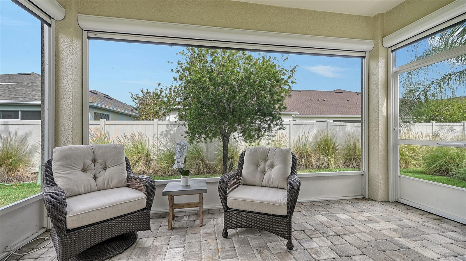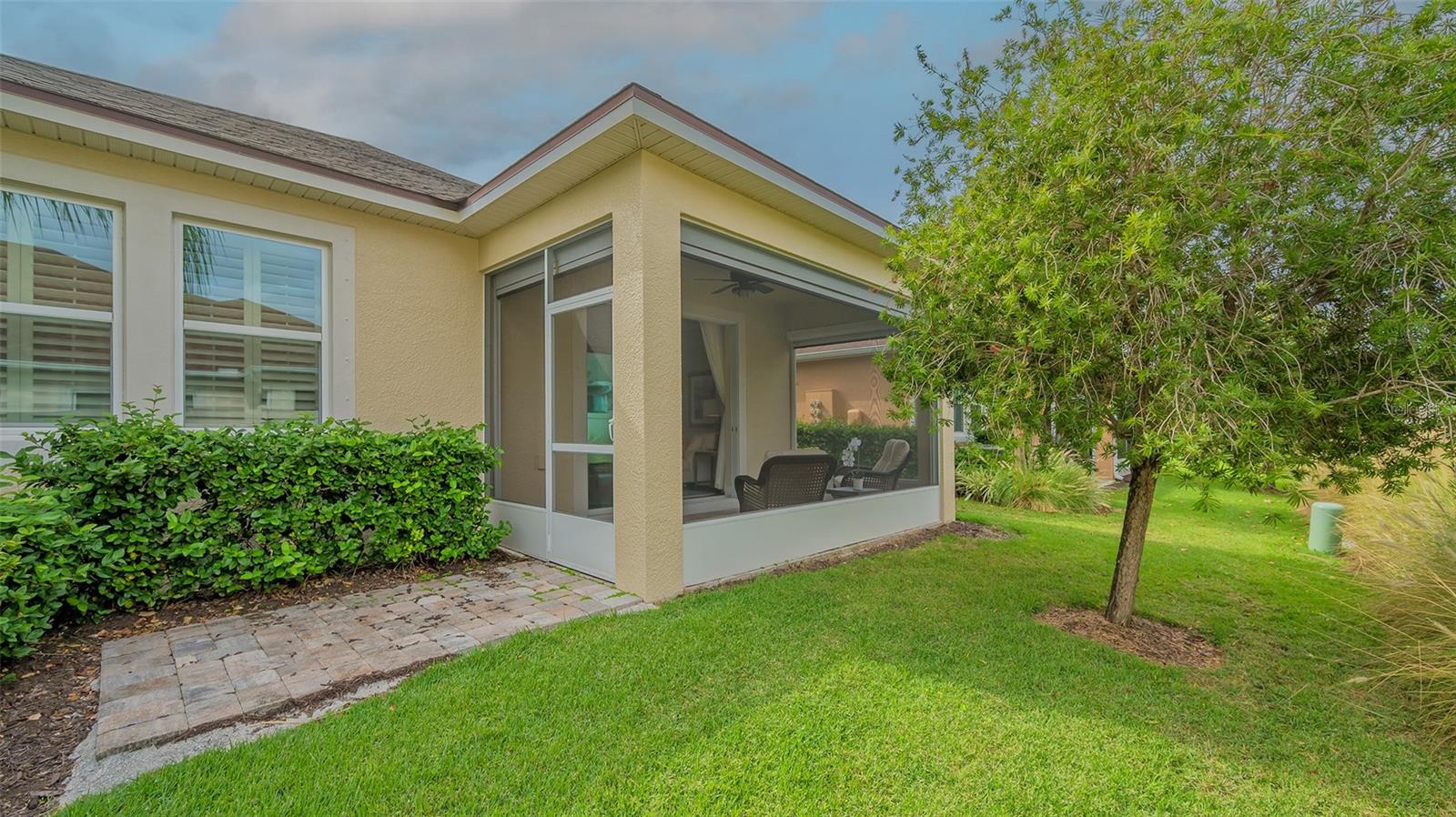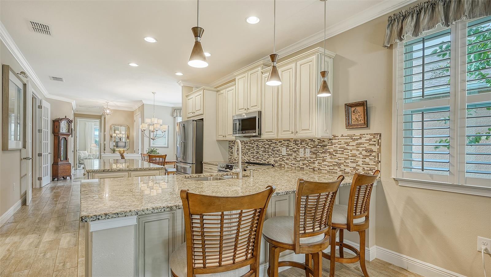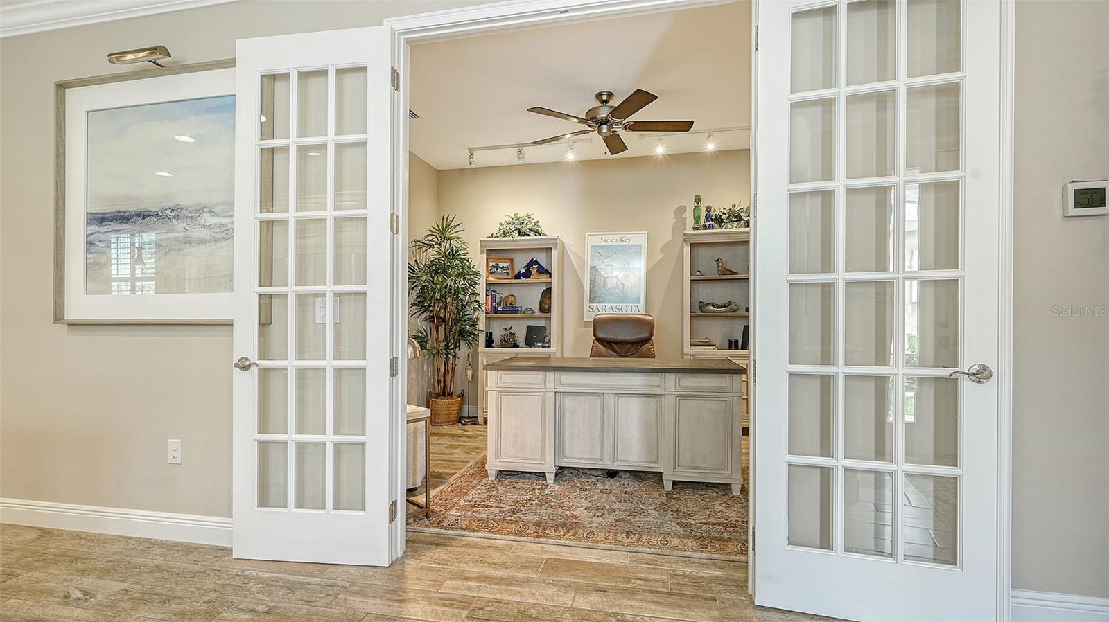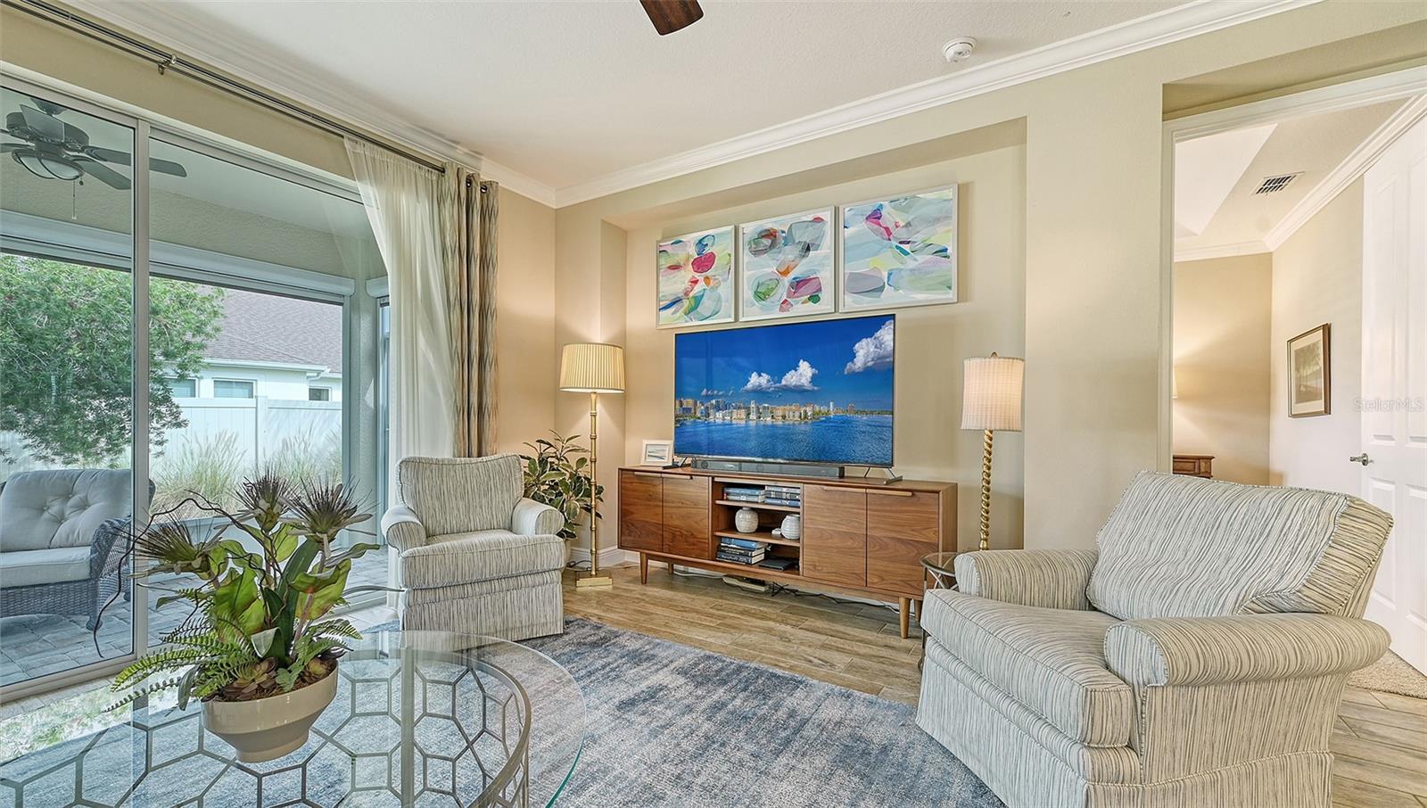 This tastefully furnished single-story townhouse has 2 bedrooms, an office, and 2 baths. Everything is on one level, so there are no stairs to navigate, and lots of windows and natural light in this end-unit home. The interior has 9' ceilings, 8' paneled doors, decorative moldings, granite countertops, plantation shutters, & plank tile flooring. The kitchen has wood cabinets, a large island, granite worksurfaces, glass tile backsplash, newer stainless appliances, breakfast bar, and a pantry. The dining area features an alcove with 3 large windows, adding space & light. The office has French doors, tile flooring, and track lighting. The great room has sliding glass doors to the screened lanai, both perfect places to relax with friends and family. The lanai also includes remote control roll down see-through vinyl panels. The primary bedroom with its high tray ceiling and carpeted flooring and an en suite bath that includes a walk-in closet, linen closet and water closet, along with a walk-in shower, wood vanity, granite counters, and dual sinks. The guest bedroom is located at the front of the home alongside the guest bathroom. The laundry room is conveniently located just off the kitchen. And the 2-car garage has a utility sink, attic access, and epoxy flooring. This delightful home is one of only 162 homes in the gated, maintenance-free community of Enclave at Forest Lakes, which offers a heated community pool, poolside pavilion and a bark park! Worry-free, "lock and leave" living is the reality here. You'll live within walking or biking distance of Palms Golf Club, restaurants, shops and the Legacy Trail, an 18+ mile bike/walk path that extends from North Sarasota to Venice. Sarasota is home to a myriad of recreational activities, cultural events, golf, watersports, shopping, natural beauty, and any number of world-class Gulf beaches. Year round or seasonally, this is a wonderful place to call home.