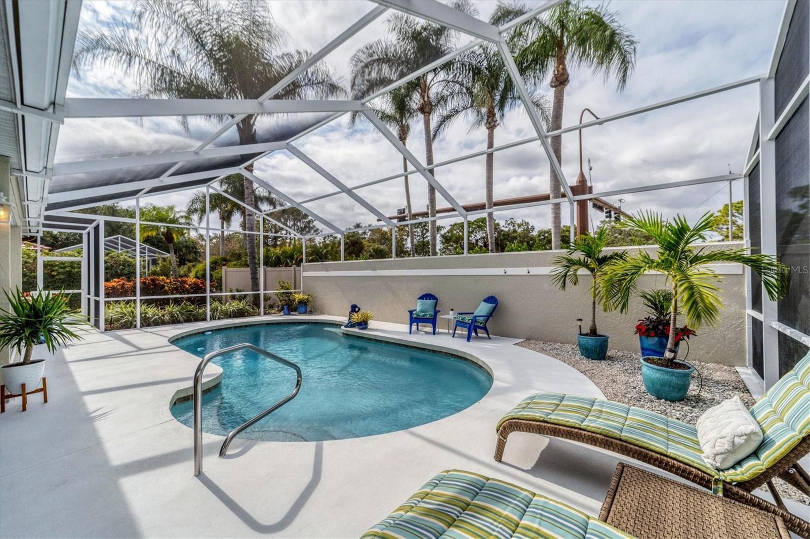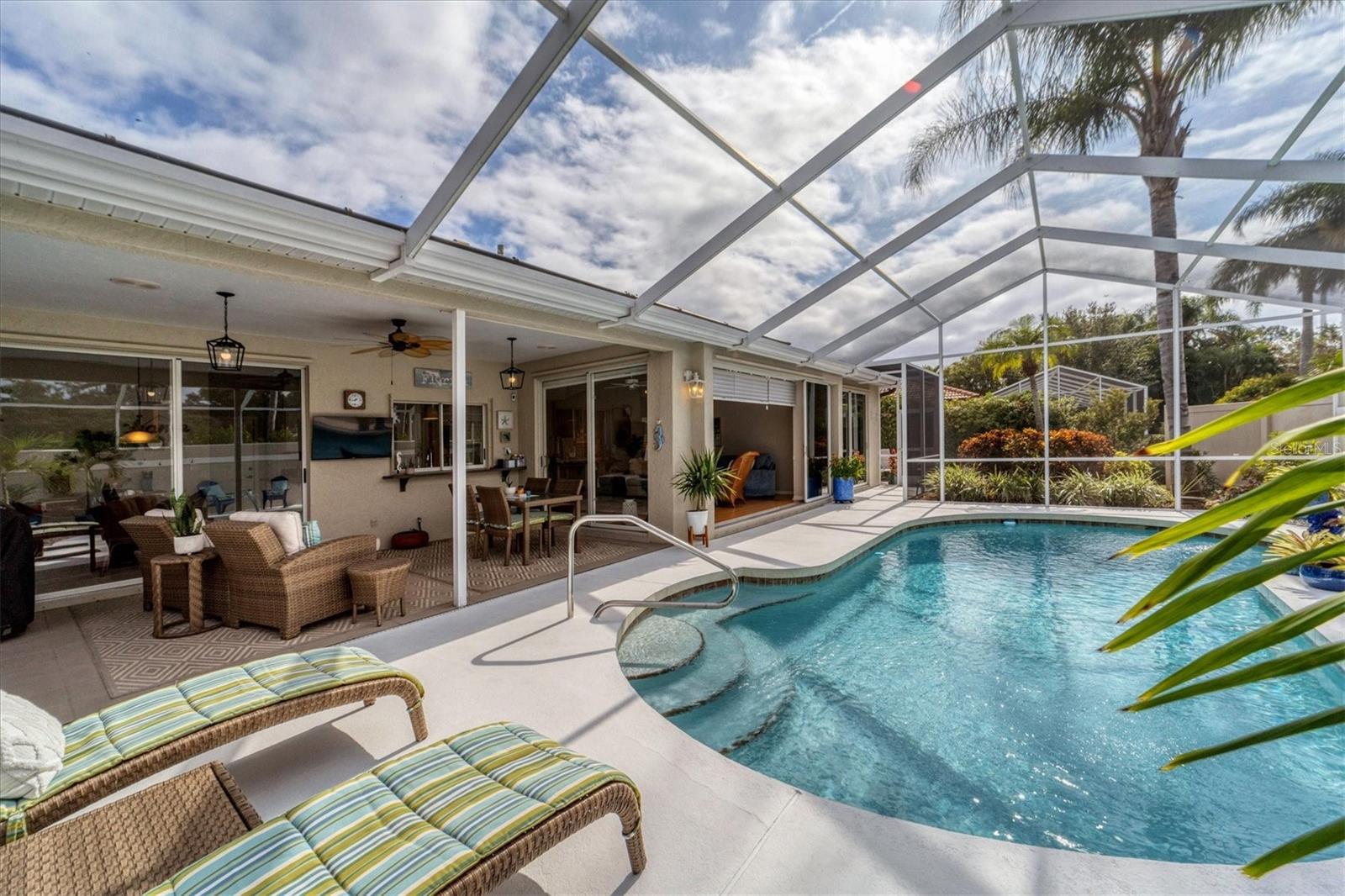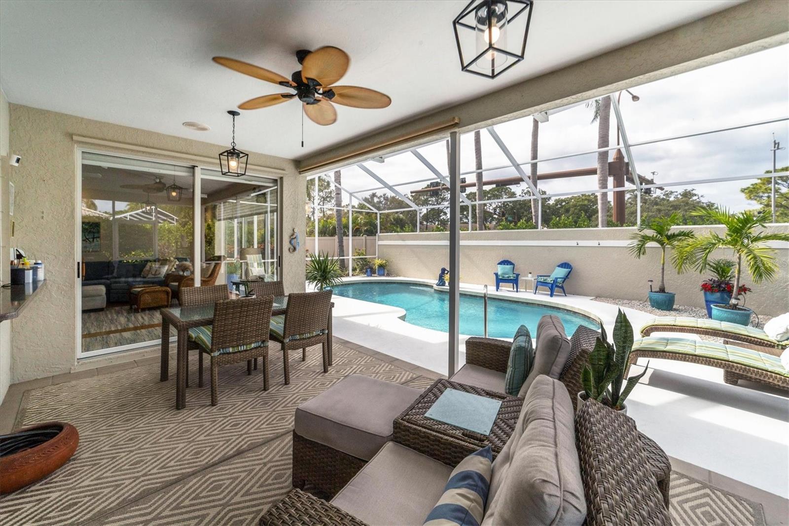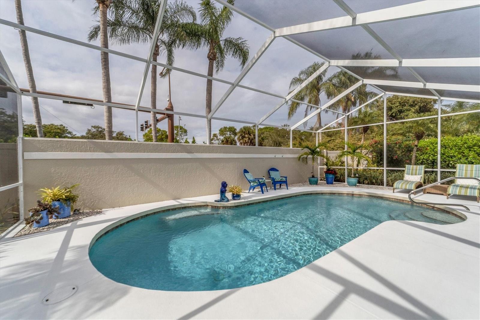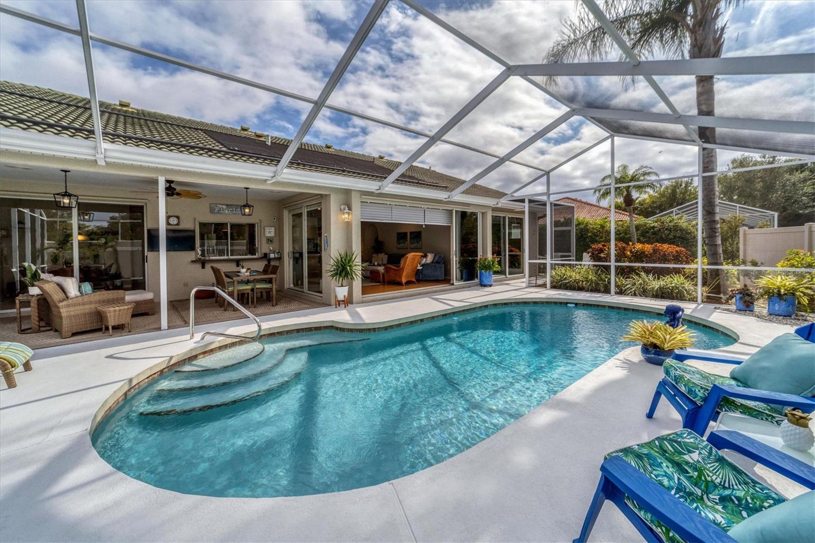 Welcome to Devonshire Place in The Meadows. This is an amazing 2 bedroom PLUS den (currently used as a third bedroom) single family POOL home located in a quaint cul-de-sac with no drive-through traffic. The lush landscaping and fresh exterior paint will impress you as you approach this impeccable property. With all living space located on one floor, the square footage lives large with high ceilings, bamboo and tile flooring, and walls of sliders across the entire back of the home overlooking the pool oasis. The coastal interior, attractive archways, newly painted walls, and updated lighting create such a supreme atmosphere of comfort that you will feel like you are on vacation every day. Updates and amenities of the home include; Solar heated pool, beautiful etched glass front door, separate laundry room with additional cabinets recently installed for extra storage, lawn irrigation on private well, no carpet, rescreened and repainted lanai pool cage, newer stainless steel appliances, insulated garage door with new garage door opener, plantation shutters and blinds, new bathroom vanity in guest bath, a laundry sink located in the garage, and a paver driveway. The primary bedroom offers an immaculate escape with high ceilings, glass slider doors to the pool, walk-in closet, double sink vanity, a garden tub and separate shower. The pool was resurfaced in 2014 and the water heater replaced in 2019. Home can be sold completely FURNISHED, with agreeable contract terms. Breathtaking home in a majestic community- The Meadows is a fantastic place to call home, whether primary, second/vacation home or investment property! With very low HOA fees, the amenities include: a dog park, playground, pickleball courts, tennis courts (tennis with additional membership), walking/biking trails, basketball court, gardens, fishing, restaurants, shopping, brand-new fitness and wellness center, community events and activities, 3 golf courses, clubhouse, and a farmer's market during winter months. The unbeatable Meadows location offers easy access to beaches, Downtown Sarasota, University Town Center, Downtown Lakewood Ranch, I-75, Nathan Benderson aquatic Center, Mote Marine Aquarium and the white sandy beaches and gulf waters. The Village Shops located within the Meadows provides a convenience store, restaurants, pre-school, and a multitude of other conveniences. The Meadows is very pet-friendly so bring your fur-baby too. Membership to the Meadows Country Club is optional for additional benefits.