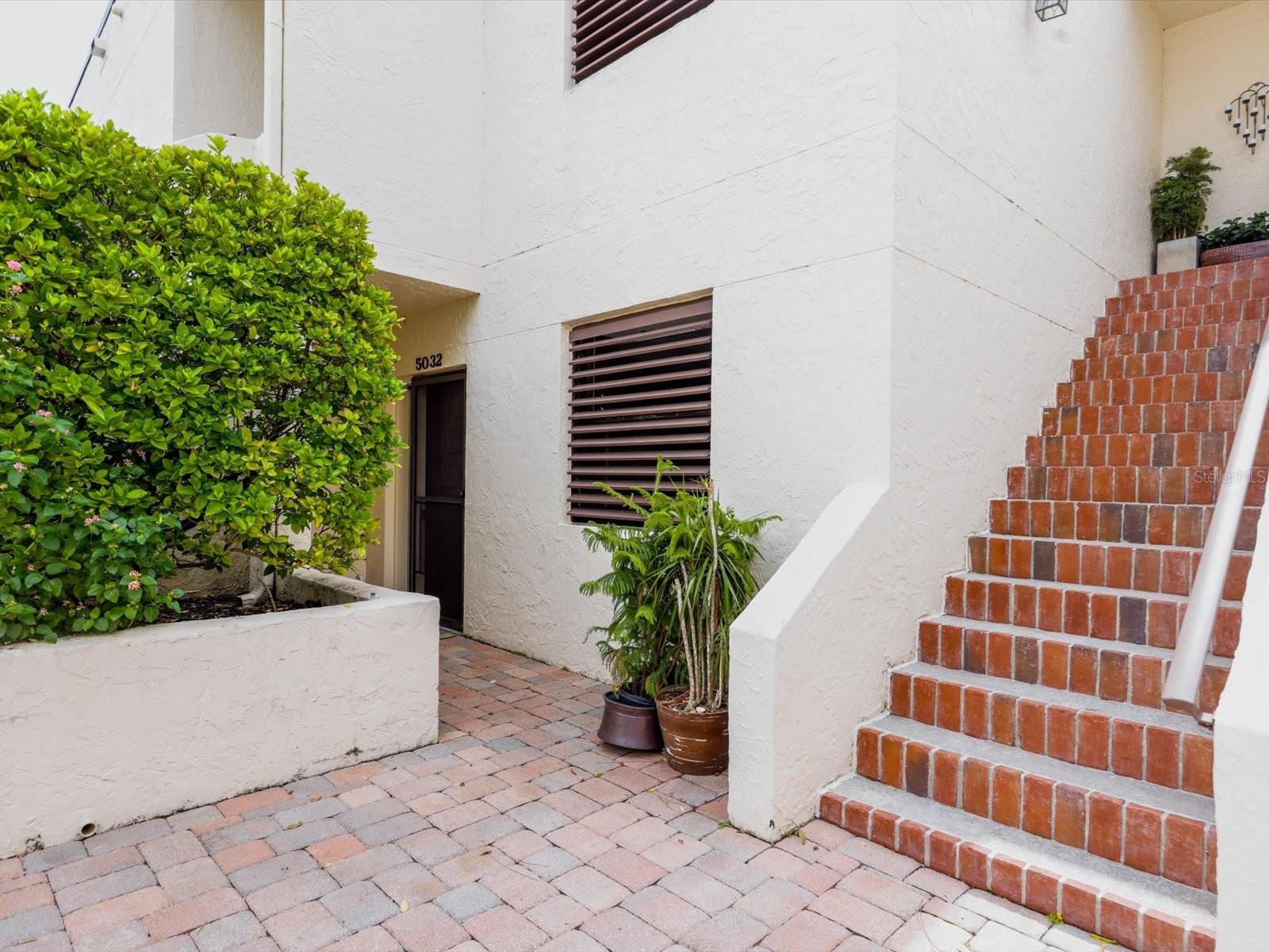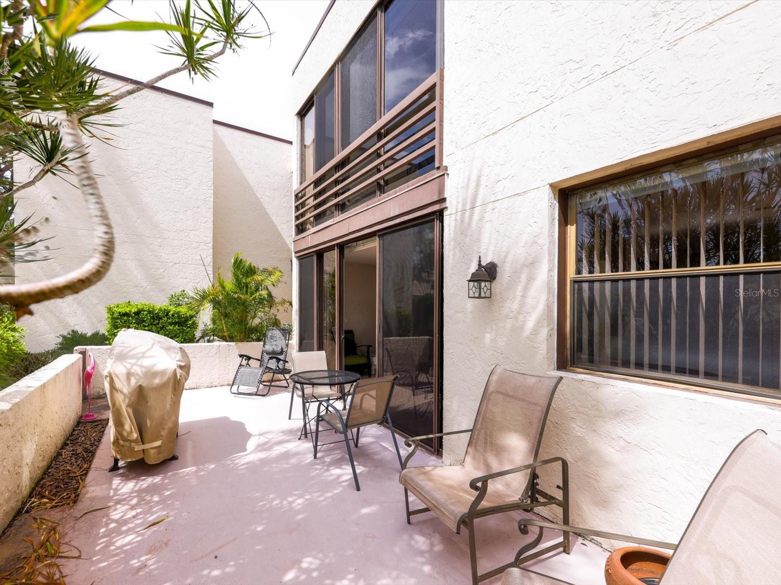 - Exterior: Courtyard, Rain Gutters, Sliding Doors, Storage
