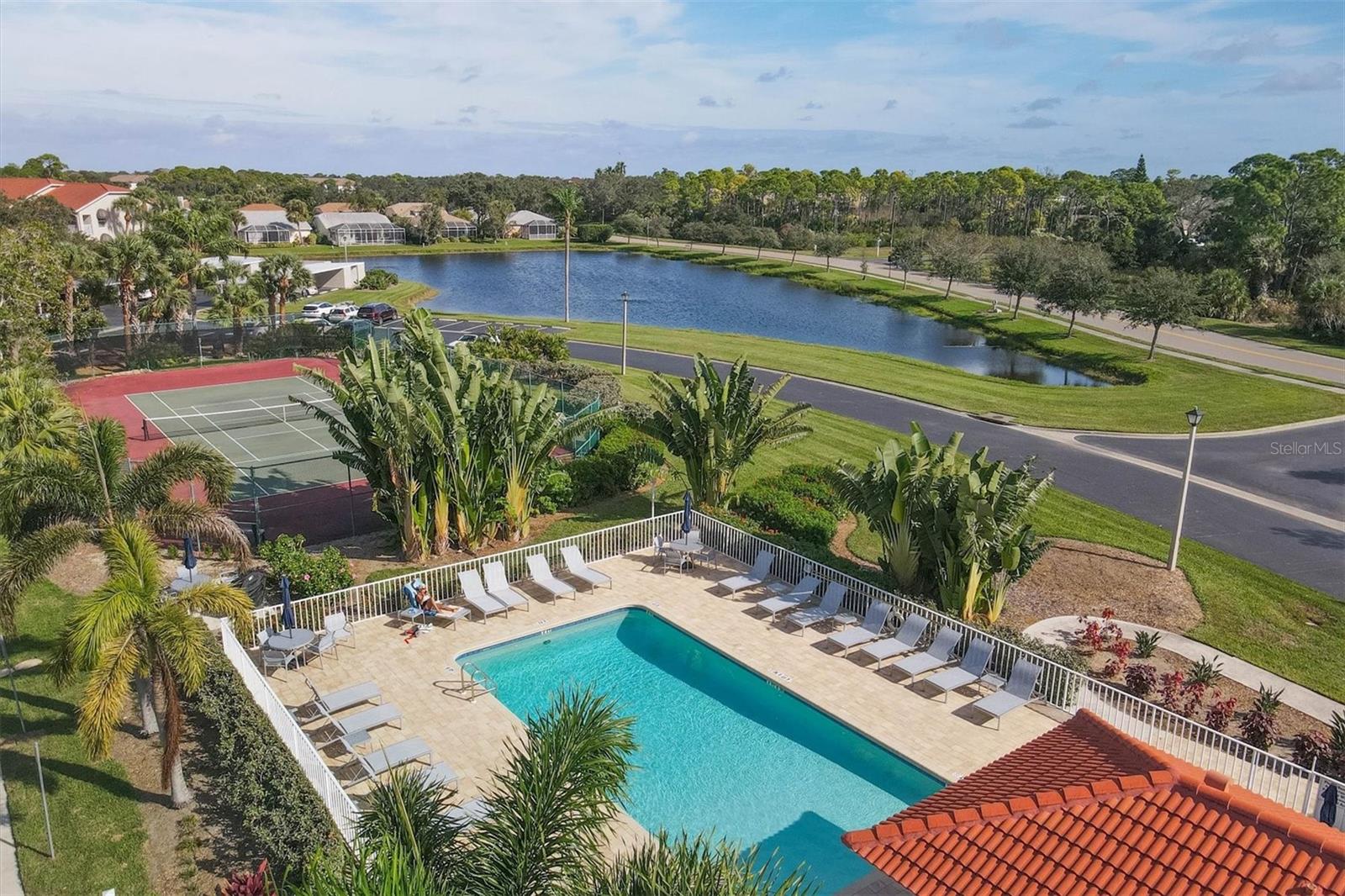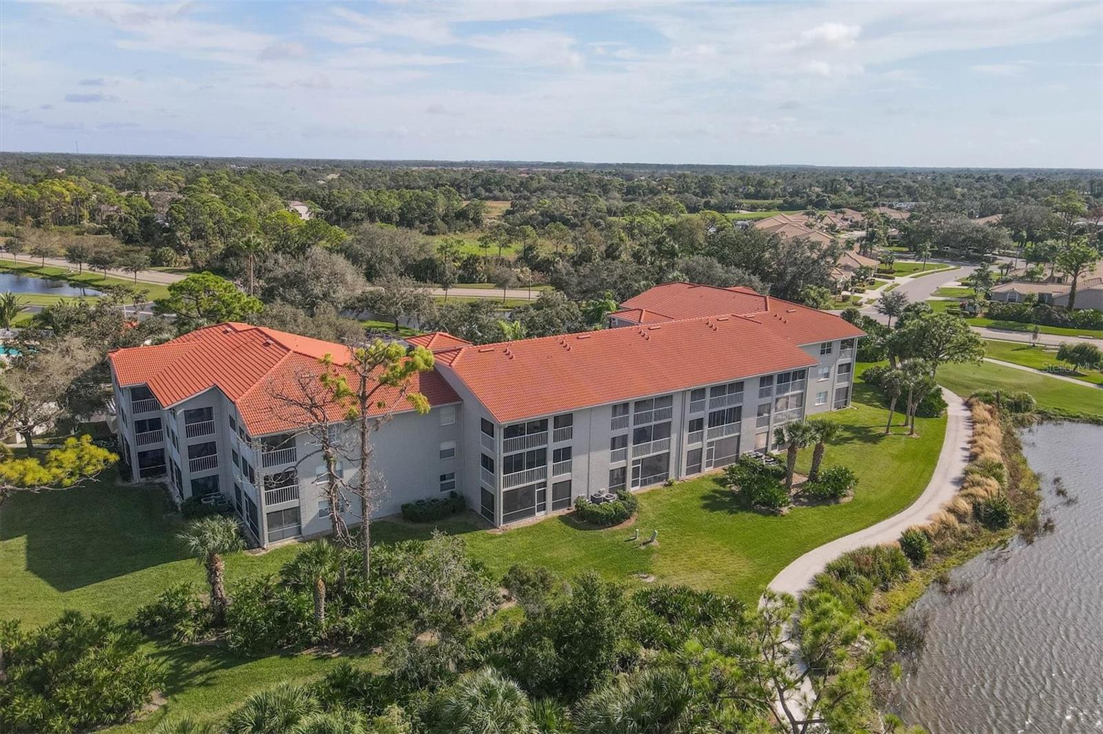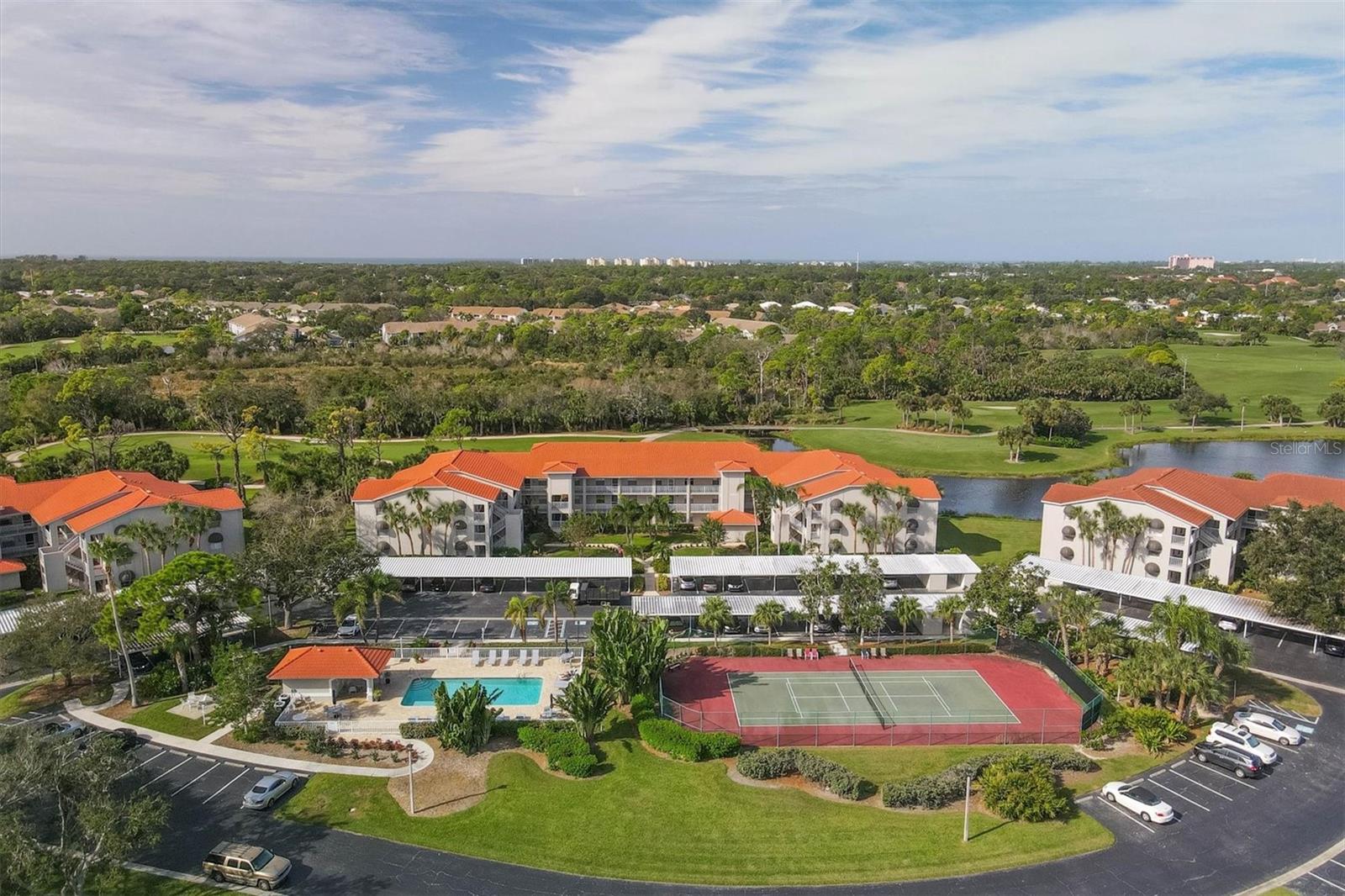 Experience the epitome of luxury living with breathtaking sunset views and a glass of fine wine in hand, all from the comfort of your lanai. As you overlook the golfers passing by and catch glimpses of majestic wildlife, you can't help but feel like you've stepped into a lavish resort. With 2 bedrooms and 2 full baths, this condo boasts a thoughtfully designed split floorplan that ensures both owners and guests enjoy utmost privacy. The kitchen has white cabinets, stainless steel appliances, and a cozy dinette area. Additional cabinets, complete with a built-in desk, provide ample storage space for all your culinary needs. The breakfast bar seamlessly opens up to the dining room, making entertaining a breeze. Step into the dining room and living room, where an airy open space awaits, adorned with soaring ceilings and expansive sliding glass doors leading out to the lanai. This harmonious blend of indoor and outdoor living allows you to revel in the Florida lifestyle we all cherish. The primary bedroom offers magnificent views of the golf course and pond, further enhanced by sliding glass doors that grant access to the lanai. In addition, a sumptuous ensuite bathroom, a custom walk-in closet, and a newly updated master shower provide the utmost luxury and convenience. The laundry closet features custom shelving and a stackable washer and dryer, making laundry a breeze. Meanwhile, the spacious guest bedroom has a custom closet and bathes in natural light and conveniently shares a nearby bathroom. Neutral colors adorn every corner of this stunning condo, creating a soothing and timeless aesthetic. Residents of this community can also enjoy a refreshing pool and state-of-the-art tennis courts mere steps away. Stoneybrook is truly a haven for golf enthusiasts and nature lovers alike, boasting an Arthur Hills designed golf course and expansive green space. Beyond the community's incredible amenities, Stoneybrook's location offers easy access to pristine beaches, world-class shopping, the renowned Legacy Trail, and an array of delectable restaurants. By a condo anywhere, buy a lifestyle at Stoneybrook.