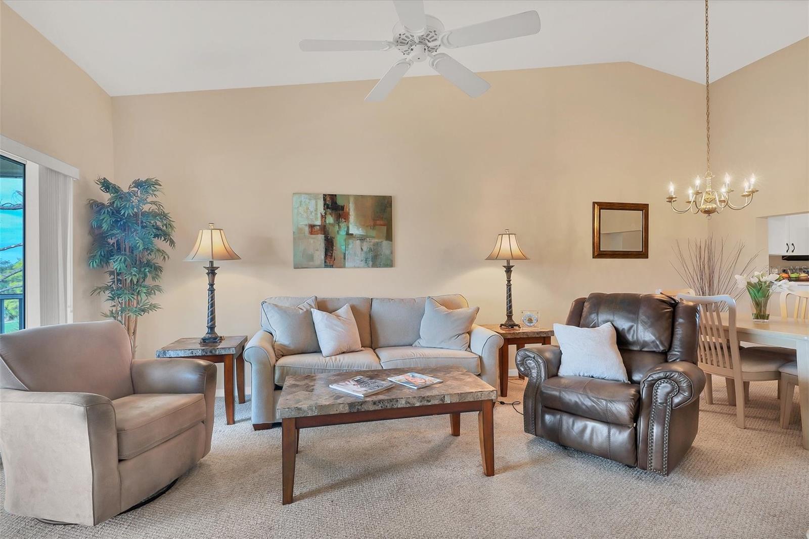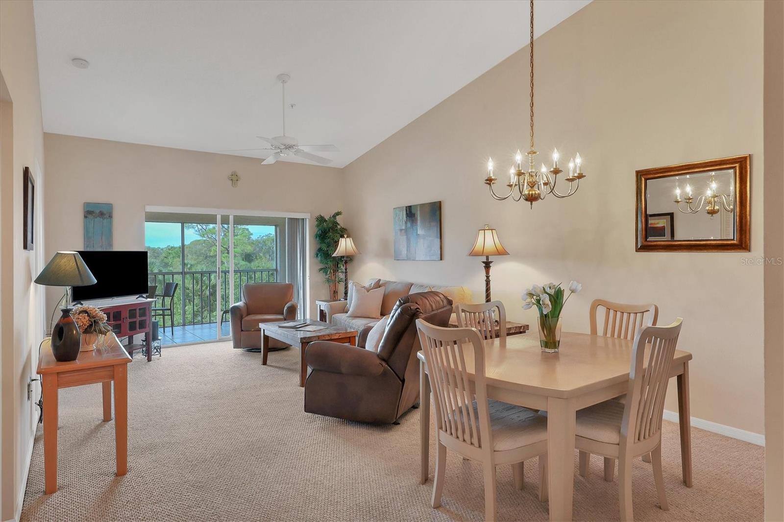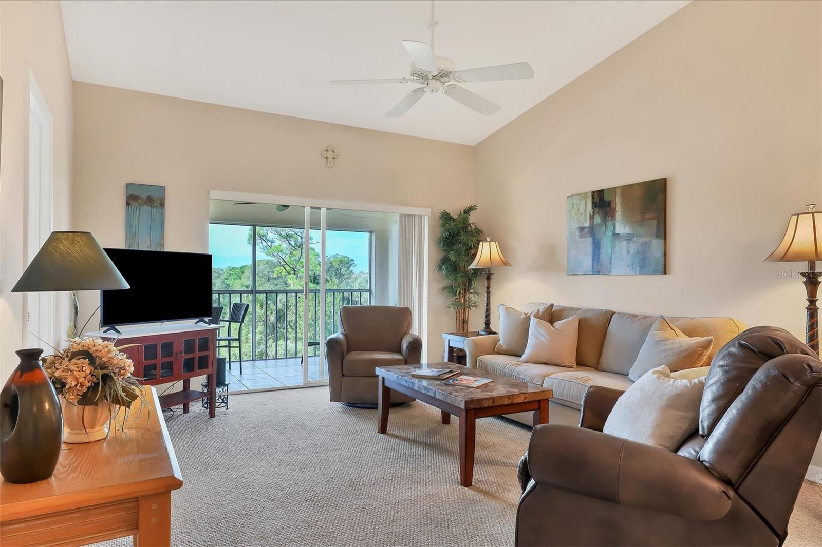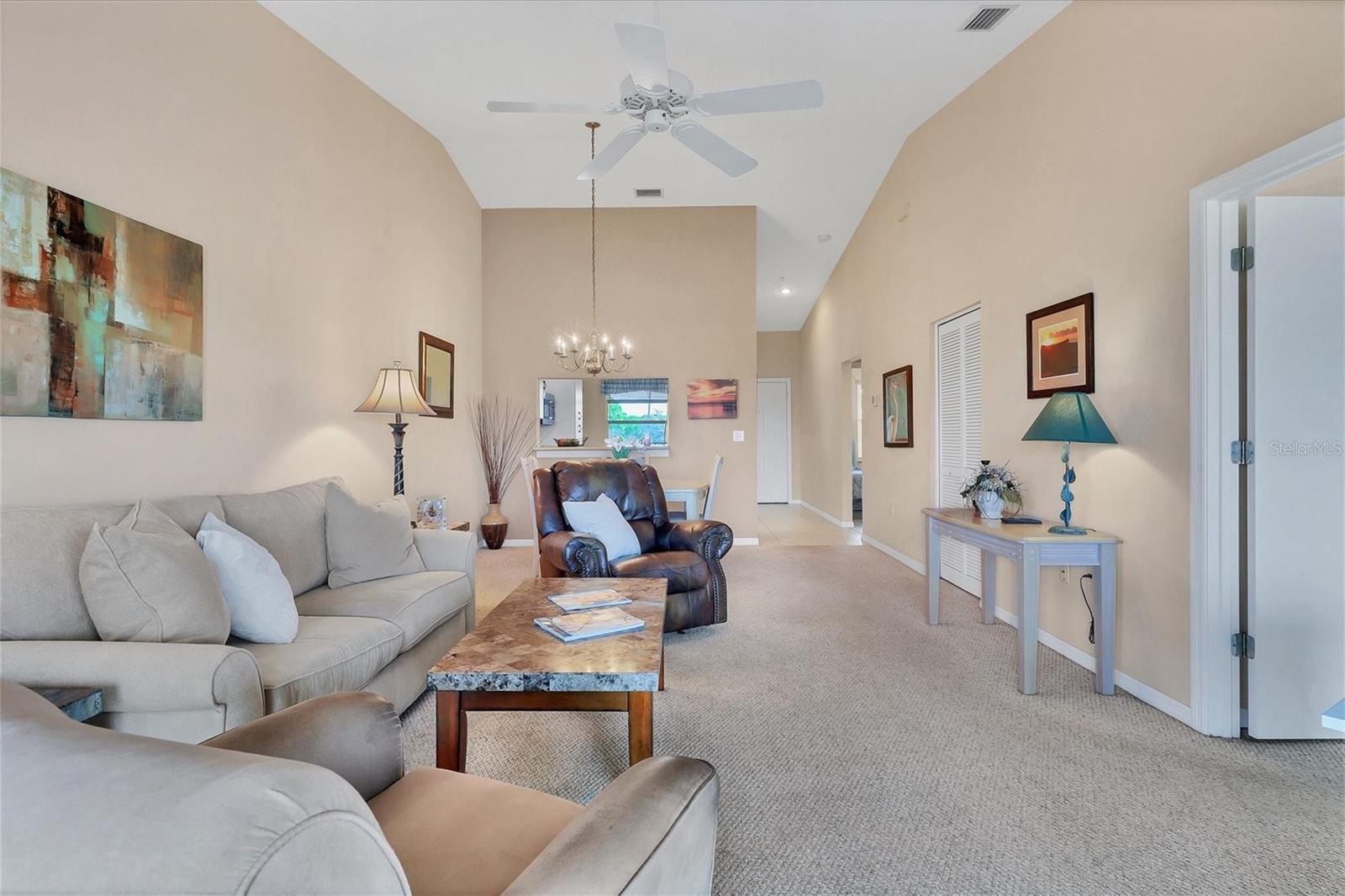 Experience the epitome of luxury living with breathtaking sunset views and a glass of fine wine in hand, all from the comfort of your lanai. As you overlook the golfers passing by and catch glimpses of majestic wildlife, you can't help but feel like you've stepped into a lavish resort. With 2 bedrooms and 2 full baths, this condo boasts a thoughtfully designed split floorplan that ensures both owners and guests enjoy utmost privacy. The kitchen has white cabinets, stainless steel appliances, and a cozy dinette area. Additional cabinets, complete with a built-in desk, provide ample storage space for all your culinary needs. The breakfast bar seamlessly opens up to the dining room, making entertaining a breeze. Step into the dining room and living room, where an airy open space awaits, adorned with soaring ceilings and expansive sliding glass doors leading out to the lanai. This harmonious blend of indoor and outdoor living allows you to revel in the Florida lifestyle we all cherish. The primary bedroom offers magnificent views of the golf course and pond, further enhanced by sliding glass doors that grant access to the lanai. In addition, a sumptuous ensuite bathroom, a custom walk-in closet, and a newly updated master shower provide the utmost luxury and convenience. The laundry closet features custom shelving and a stackable washer and dryer, making laundry a breeze. Meanwhile, the spacious guest bedroom has a custom closet and bathes in natural light and conveniently shares a nearby bathroom. Neutral colors adorn every corner of this stunning condo, creating a soothing and timeless aesthetic. Residents of this community can also enjoy a refreshing pool and state-of-the-art tennis courts mere steps away. Stoneybrook is truly a haven for golf enthusiasts and nature lovers alike, boasting an Arthur Hills designed golf course and expansive green space. Beyond the community's incredible amenities, Stoneybrook's location offers easy access to pristine beaches, world-class shopping, the renowned Legacy Trail, and an array of delectable restaurants. By a condo anywhere, buy a lifestyle at Stoneybrook.