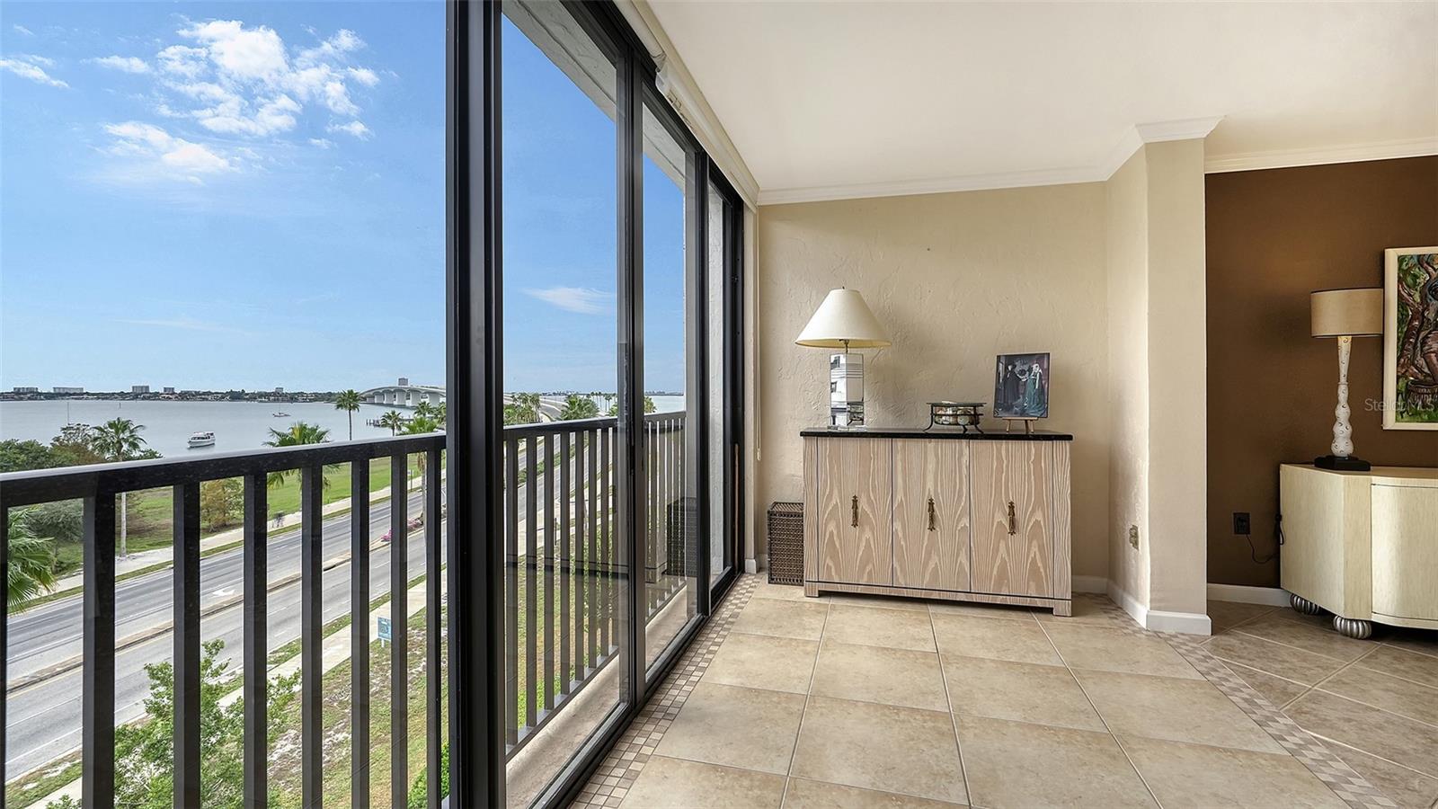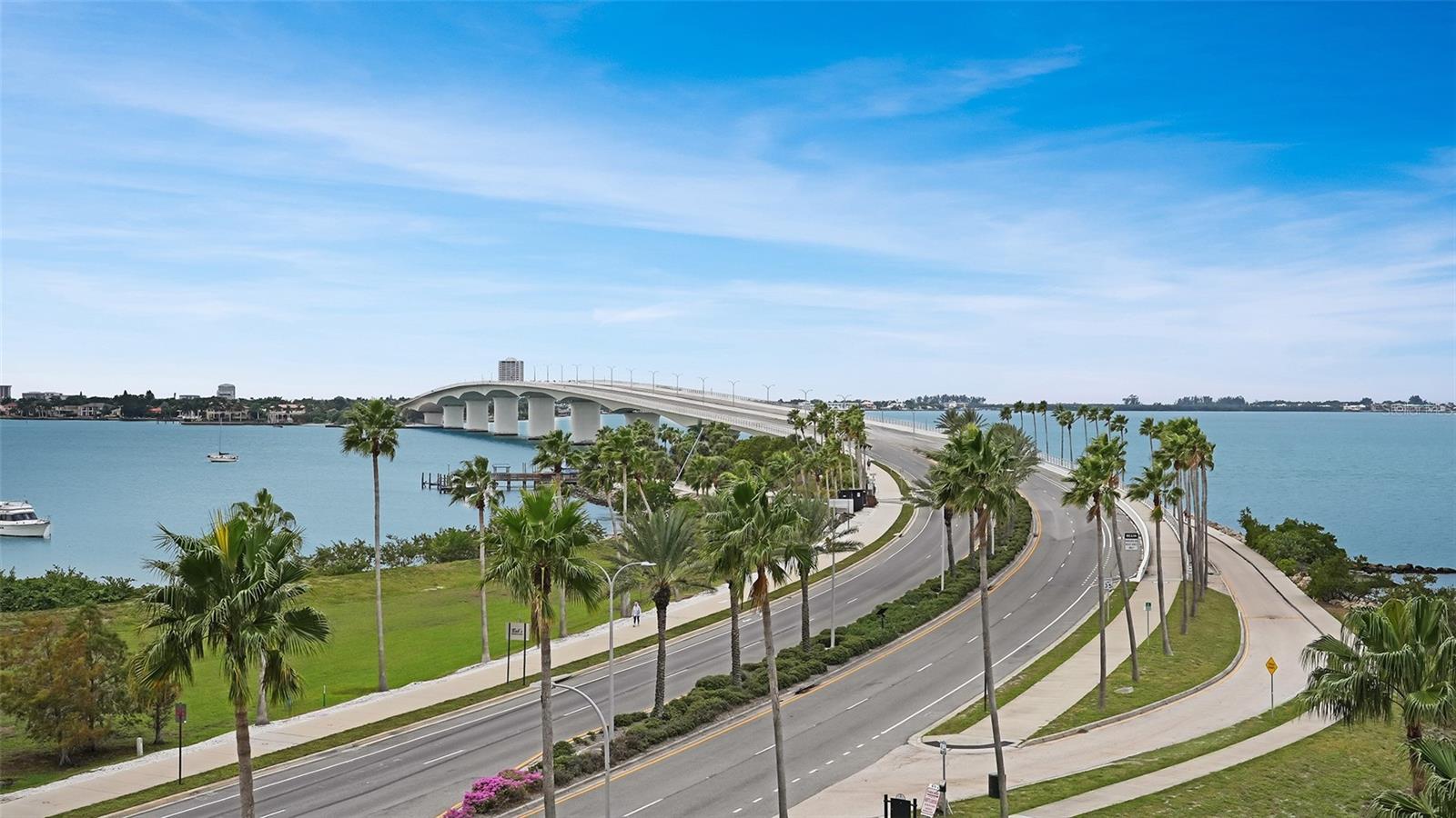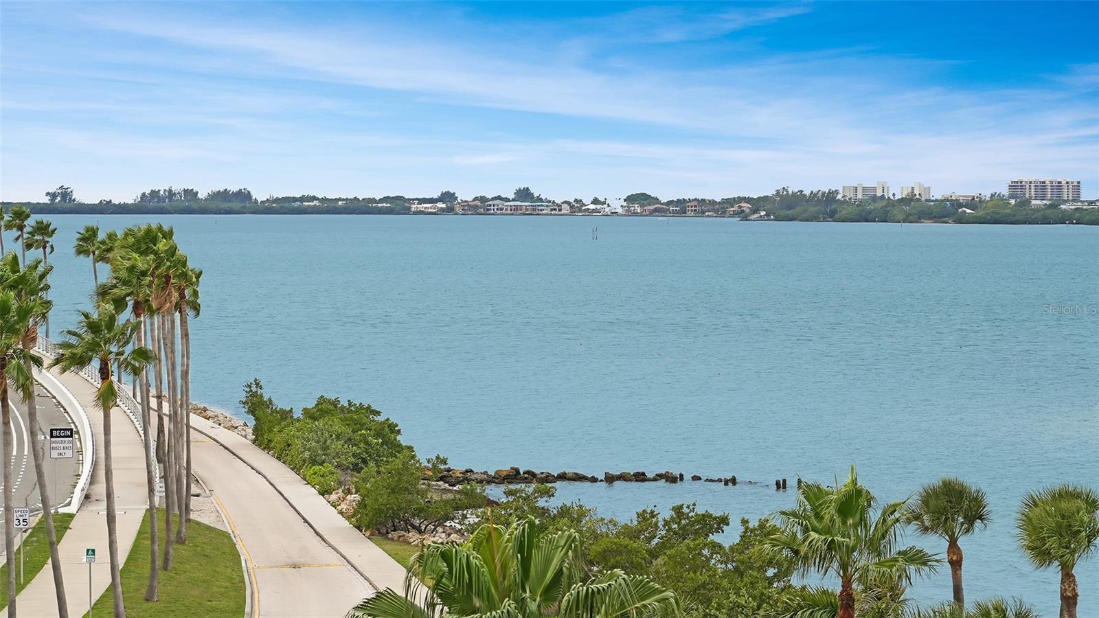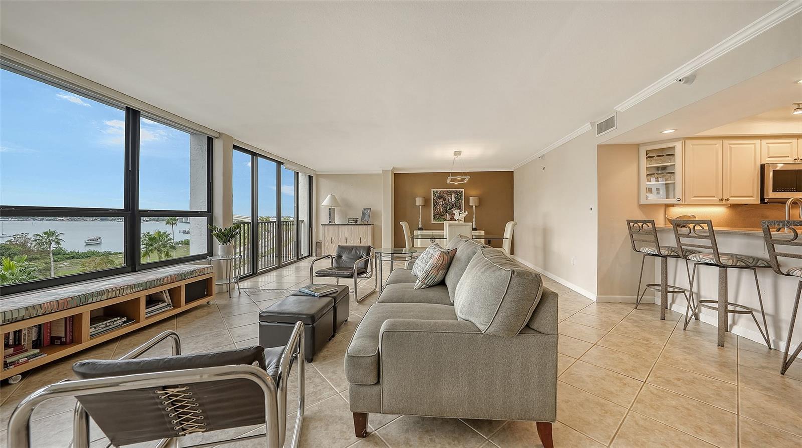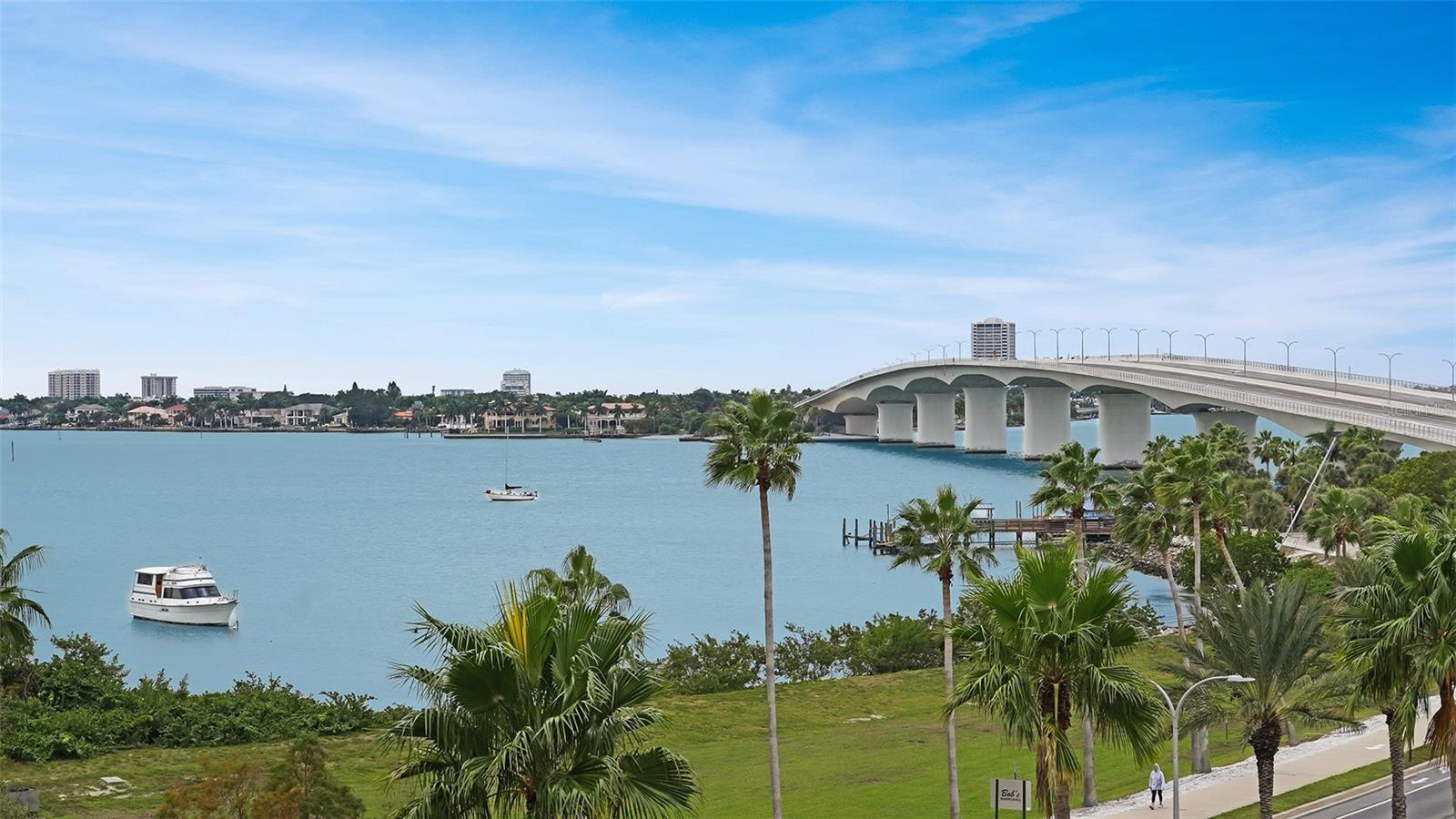 Dramatic full Bay view from this stunning unit in Sunset Tower in the heart of downtown Sarasota. Breathtaking vista includes tropical landscaping, boat activity, marina, sparkling water, and ever changing skies. The spectacular Ringling Bridge stretches out to the west and you will be amazed by your direct viewing of each nightly sunset. Floor to ceiling windows and a southern exposure lend a cheerful ambiance throughout, any time of year. Well appointed kitchen with stainless appliances and inviting bar area for entertaining or just enjoying your morning coffee. The master suite is expansive with plenty of room for a king size bed and a cozy sitting area. The balcony off the living room and master bedroom can also be used as an office or TV room. The building has numerous amenities including a fitness room, pool with grilling and picnic areas, kayak storage and launch, and a private beach. All of this is a short stroll to a wealth of shopping, dining and world class theatre. It does not get better than this ! Second bedroom photo is shown "As Is" and also virtually staged.