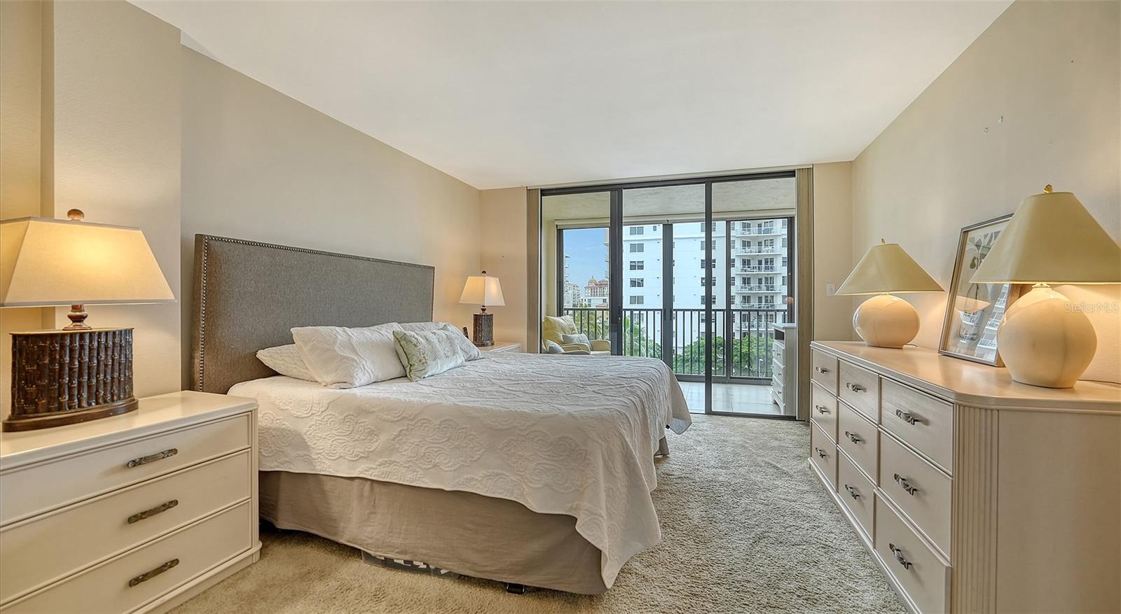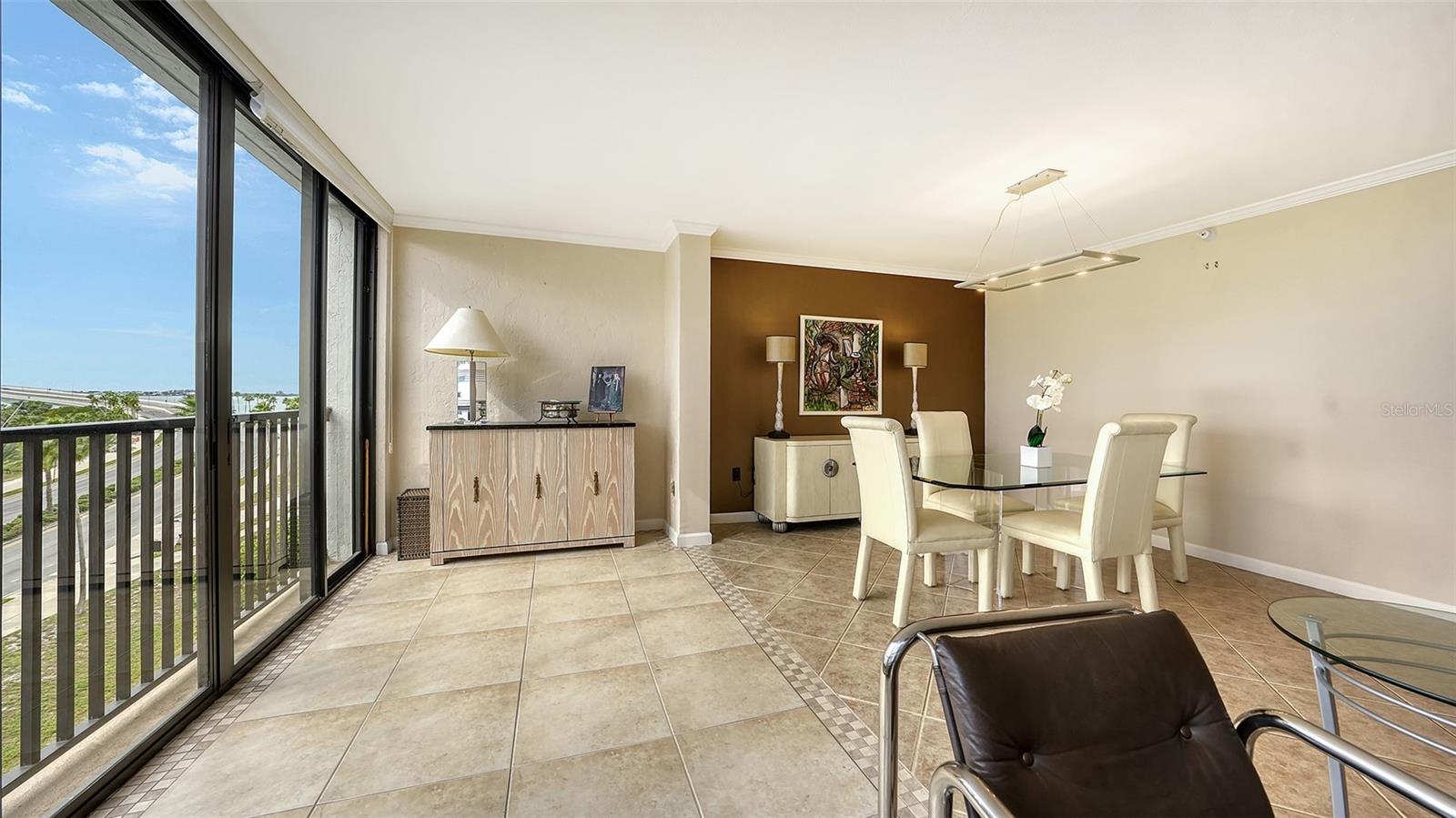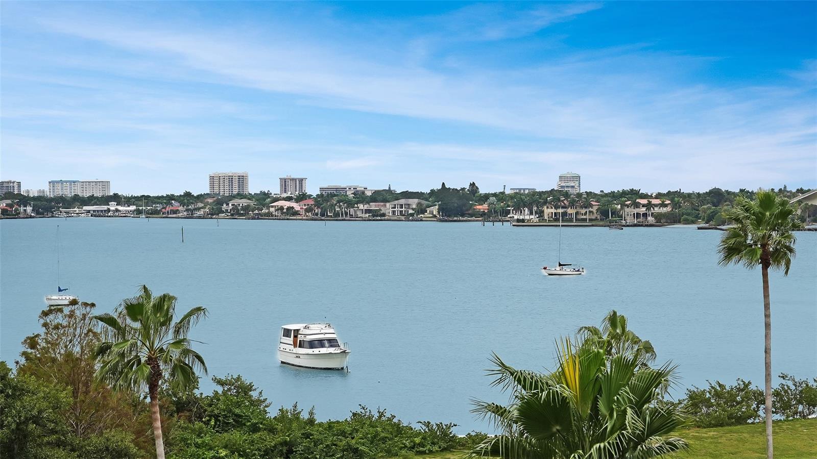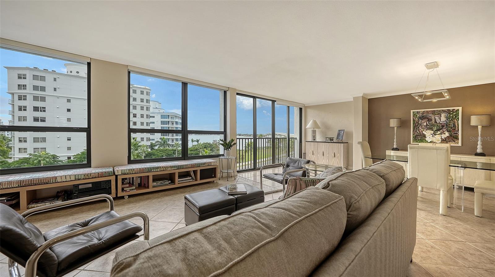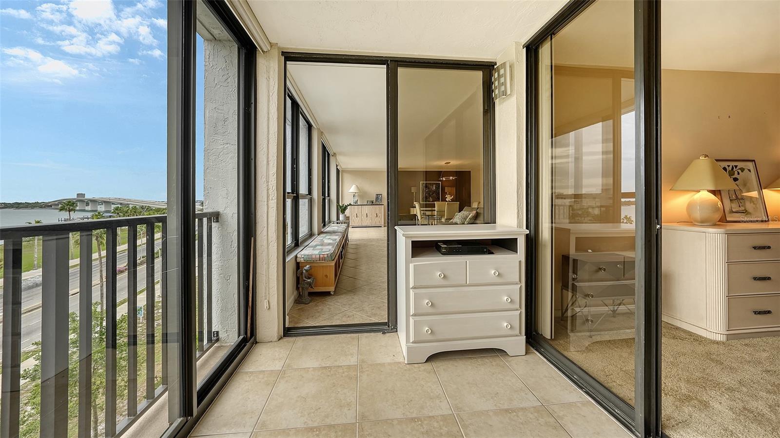 Dramatic full Bay view from this stunning unit in Sunset Tower in the heart of downtown Sarasota. Breathtaking vista includes tropical landscaping, boat activity, marina, sparkling water, and ever changing skies. The spectacular Ringling Bridge stretches out to the west and you will be amazed by your direct viewing of each nightly sunset. Floor to ceiling windows and a southern exposure lend a cheerful ambiance throughout, any time of year. Well appointed kitchen with stainless appliances and inviting bar area for entertaining or just enjoying your morning coffee. The master suite is expansive with plenty of room for a king size bed and a cozy sitting area. The balcony off the living room and master bedroom can also be used as an office or TV room. The building has numerous amenities including a fitness room, pool with grilling and picnic areas, kayak storage and launch, and a private beach. All of this is a short stroll to a wealth of shopping, dining and world class theatre. It does not get better than this ! Second bedroom photo is shown "As Is" and also virtually staged.