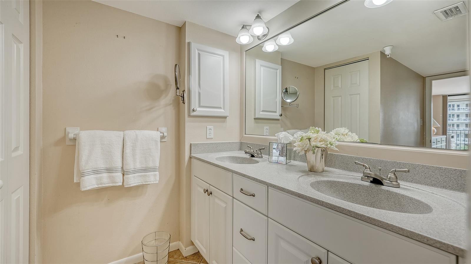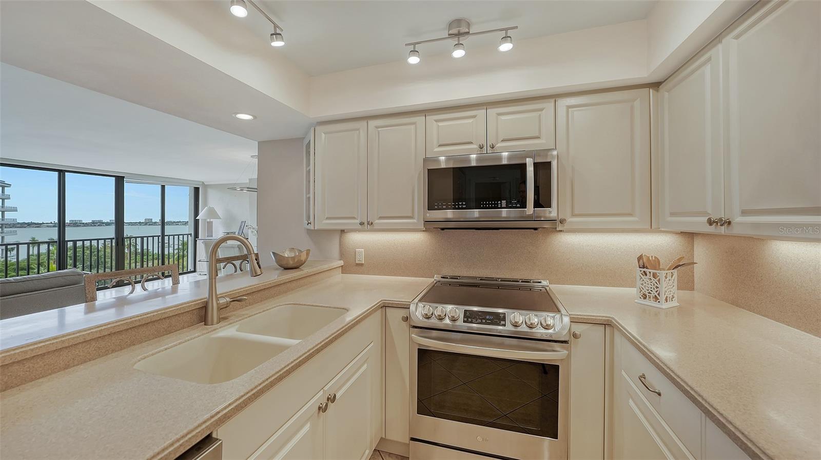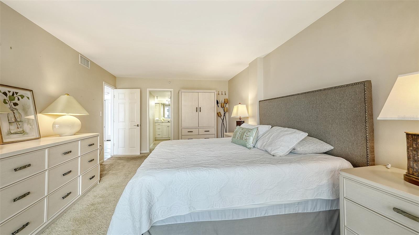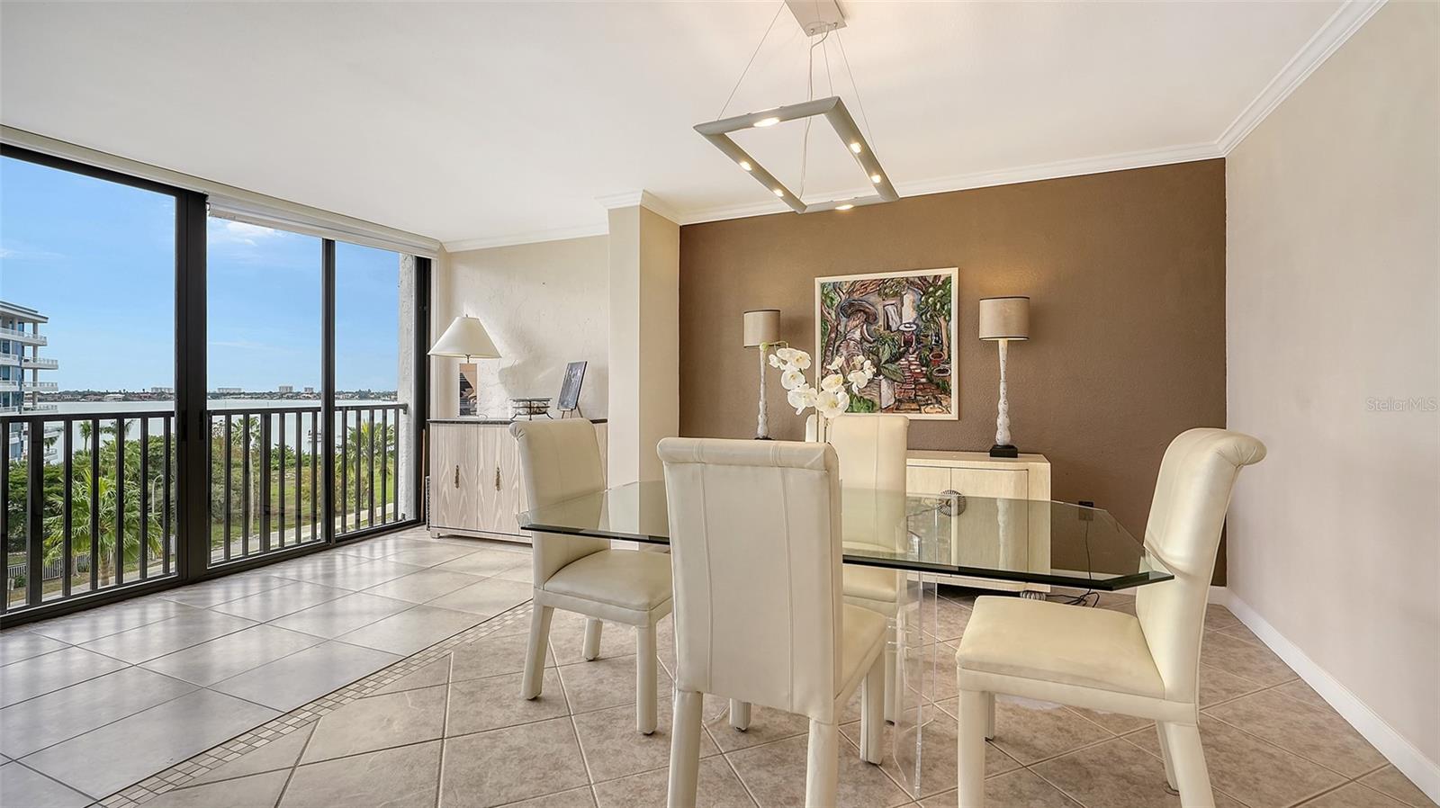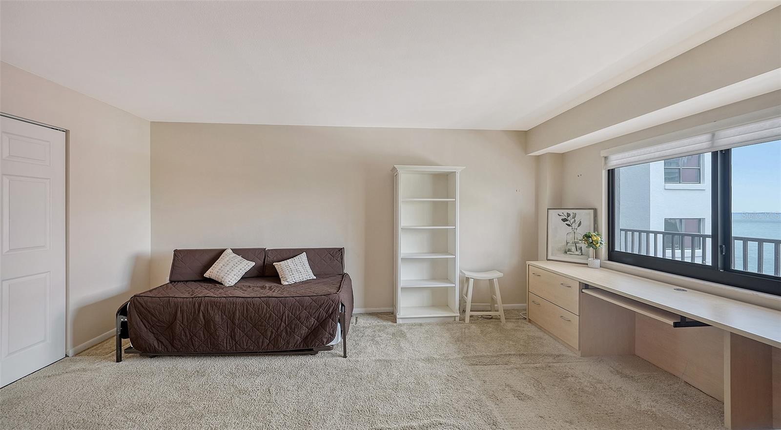 Dramatic full Bay view from this stunning unit in Sunset Tower in the heart of downtown Sarasota. Breathtaking vista includes tropical landscaping, boat activity, marina, sparkling water, and ever changing skies. The spectacular Ringling Bridge stretches out to the west and you will be amazed by your direct viewing of each nightly sunset. Floor to ceiling windows and a southern exposure lend a cheerful ambiance throughout, any time of year. Well appointed kitchen with stainless appliances and inviting bar area for entertaining or just enjoying your morning coffee. The master suite is expansive with plenty of room for a king size bed and a cozy sitting area. The balcony off the living room and master bedroom can also be used as an office or TV room. The building has numerous amenities including a fitness room, pool with grilling and picnic areas, kayak storage and launch, and a private beach. All of this is a short stroll to a wealth of shopping, dining and world class theatre. It does not get better than this ! Second bedroom photo is shown "As Is" and also virtually staged.