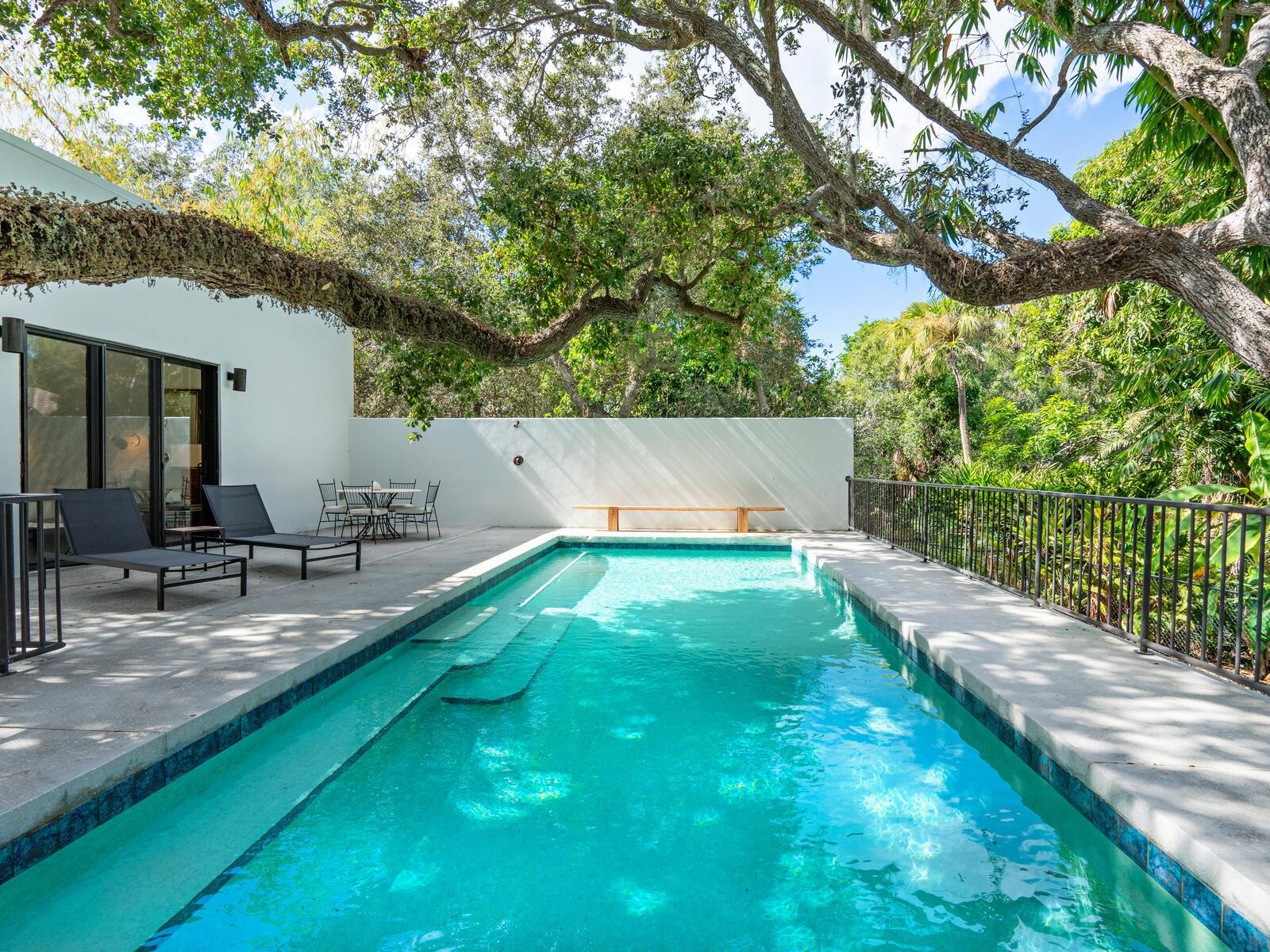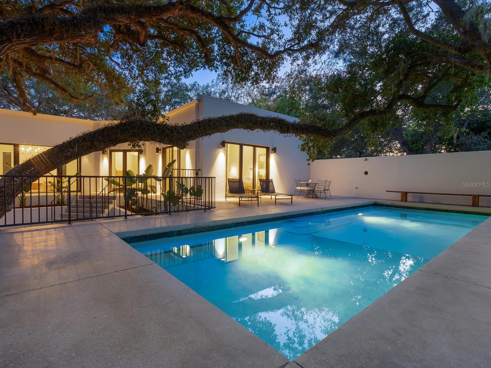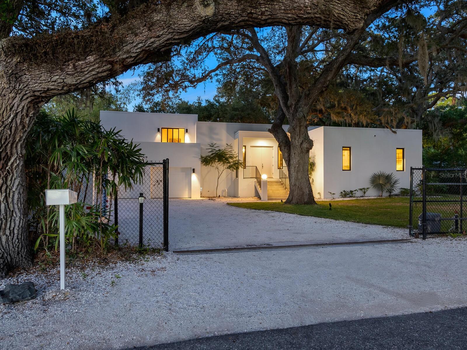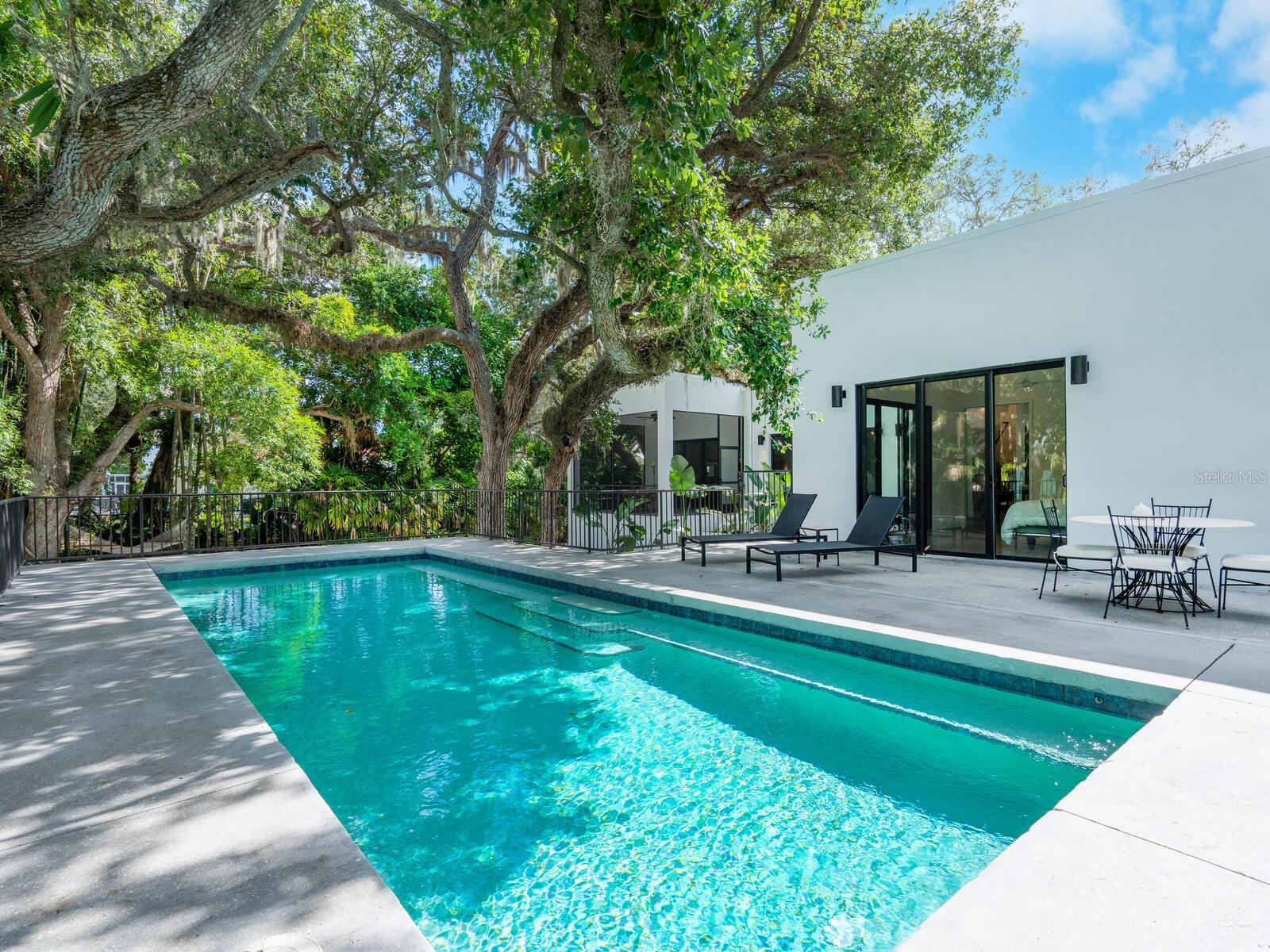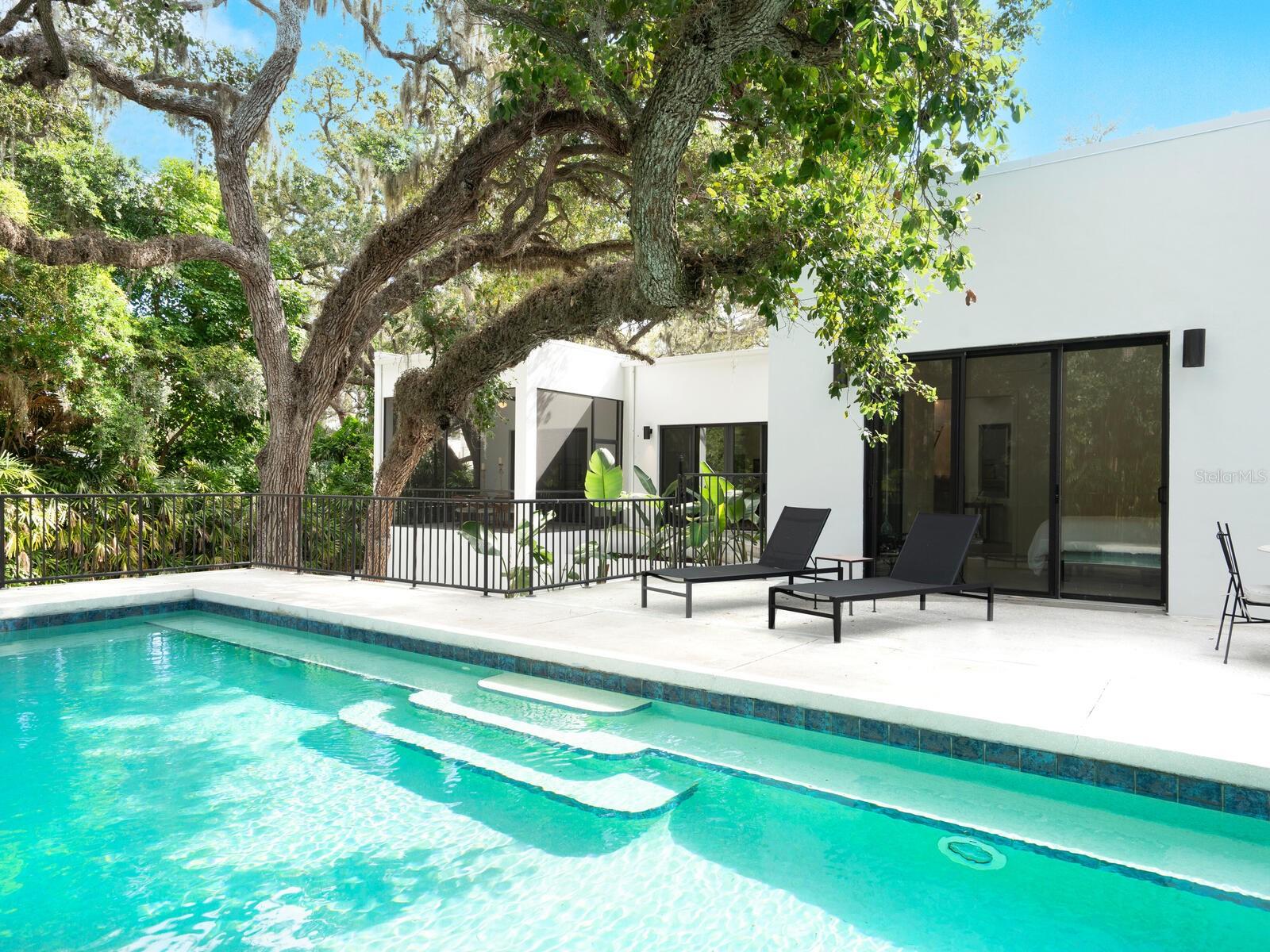 Villa Coquina is a luxurious, modern residence in the exclusive Oyster Bay neighborhood. Built in 2006 by architect Jack Jetton, one of the original members of the Sarasota School of Architecture, it blends the iconic Sarasota School style with modern construction, featuring steel reinforced concrete walls, hurricane impact windows, and a raised/ventilated foundation. The fenced and gated property spans almost half an acre and includes tropical landscaping, ancient live oaks, and a heated salt-water pool creating your own private tropical modern resort. This home offers nearly 3,400 sq ft of space, including 2,400 sq feet of interior space, with 3 bedrooms, 3 bathrooms, and an open floor plan designed to bring the outdoors in, with 12' ceilings and walls of glass. The home was fully renovated in 2023 by architect Daniel Lear, with updates to electrical, plumbing, HVAC, cabinetry, counters, roof, and the addition of a third bedroom and bathroom. Interiors by designer Blair Moritz feature high-end finishes like Water Works plumbing, Bertazzoni appliances, Italian travertine counters, Reform European Cabinetry, and vintage lighting. Every single detail was completed with the highest quality craftsmanship, perhaps especially the original seashell concrete floors which were lovingly restored to enhance the properties midcentury modern roots.The property also allows for future expansion, including the potential for a third-story ocean-view deck already engineered into the 2nd story. Villa Coquina offers a rare combination of modern luxury, climate proof construction, architectural history, and a prime Sarasota location near shopping, schools, beaches, and nightlife.