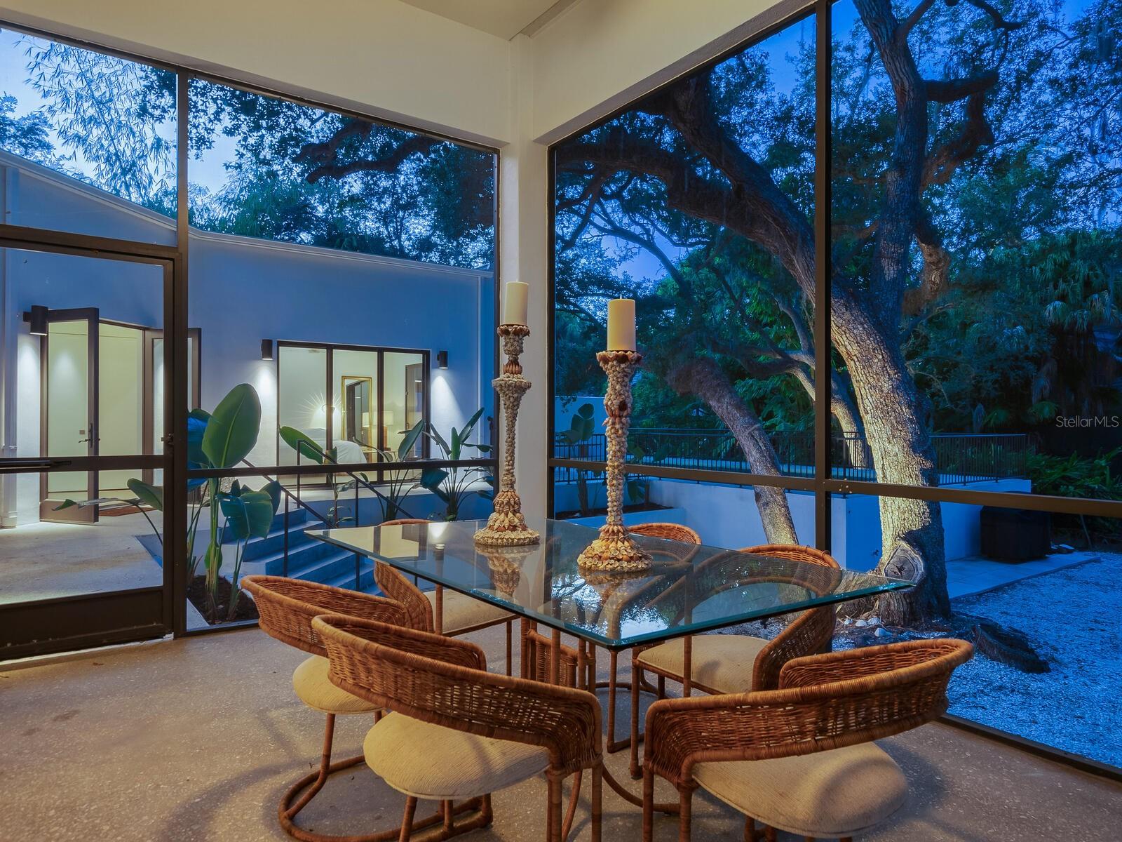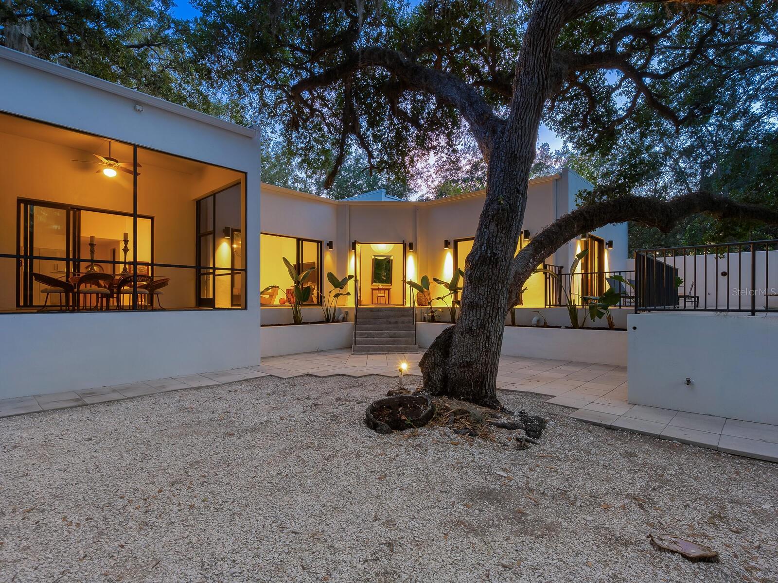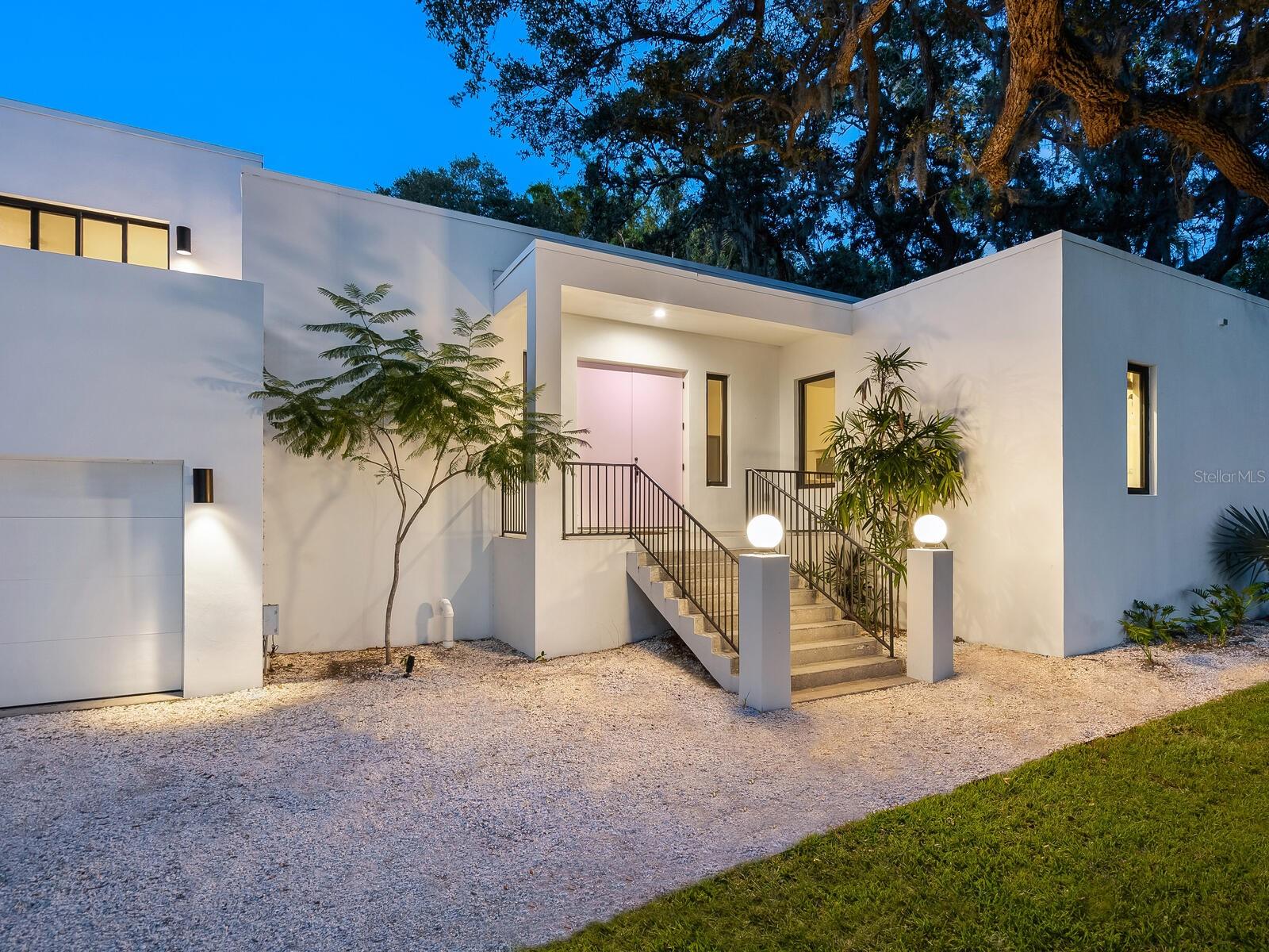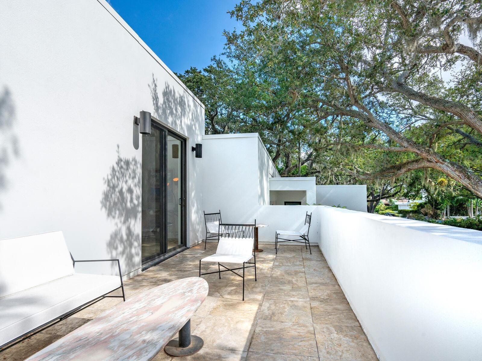 Villa Coquina is a luxurious, modern residence in the exclusive Oyster Bay neighborhood. Built in 2006 by architect Jack Jetton, one of the original members of the Sarasota School of Architecture, it blends the iconic Sarasota School style with modern construction, featuring steel reinforced concrete walls, hurricane impact windows, and a raised/ventilated foundation. The fenced and gated property spans almost half an acre and includes tropical landscaping, ancient live oaks, and a heated salt-water pool creating your own private tropical modern resort. This home offers nearly 3,400 sq ft of space, including 2,400 sq feet of interior space, with 3 bedrooms, 3 bathrooms, and an open floor plan designed to bring the outdoors in, with 12' ceilings and walls of glass. The home was fully renovated in 2023 by architect Daniel Lear, with updates to electrical, plumbing, HVAC, cabinetry, counters, roof, and the addition of a third bedroom and bathroom. Interiors by designer Blair Moritz feature high-end finishes like Water Works plumbing, Bertazzoni appliances, Italian travertine counters, Reform European Cabinetry, and vintage lighting. Every single detail was completed with the highest quality craftsmanship, perhaps especially the original seashell concrete floors which were lovingly restored to enhance the properties midcentury modern roots.The property also allows for future expansion, including the potential for a third-story ocean-view deck already engineered into the 2nd story. Villa Coquina offers a rare combination of modern luxury, climate proof construction, architectural history, and a prime Sarasota location near shopping, schools, beaches, and nightlife.