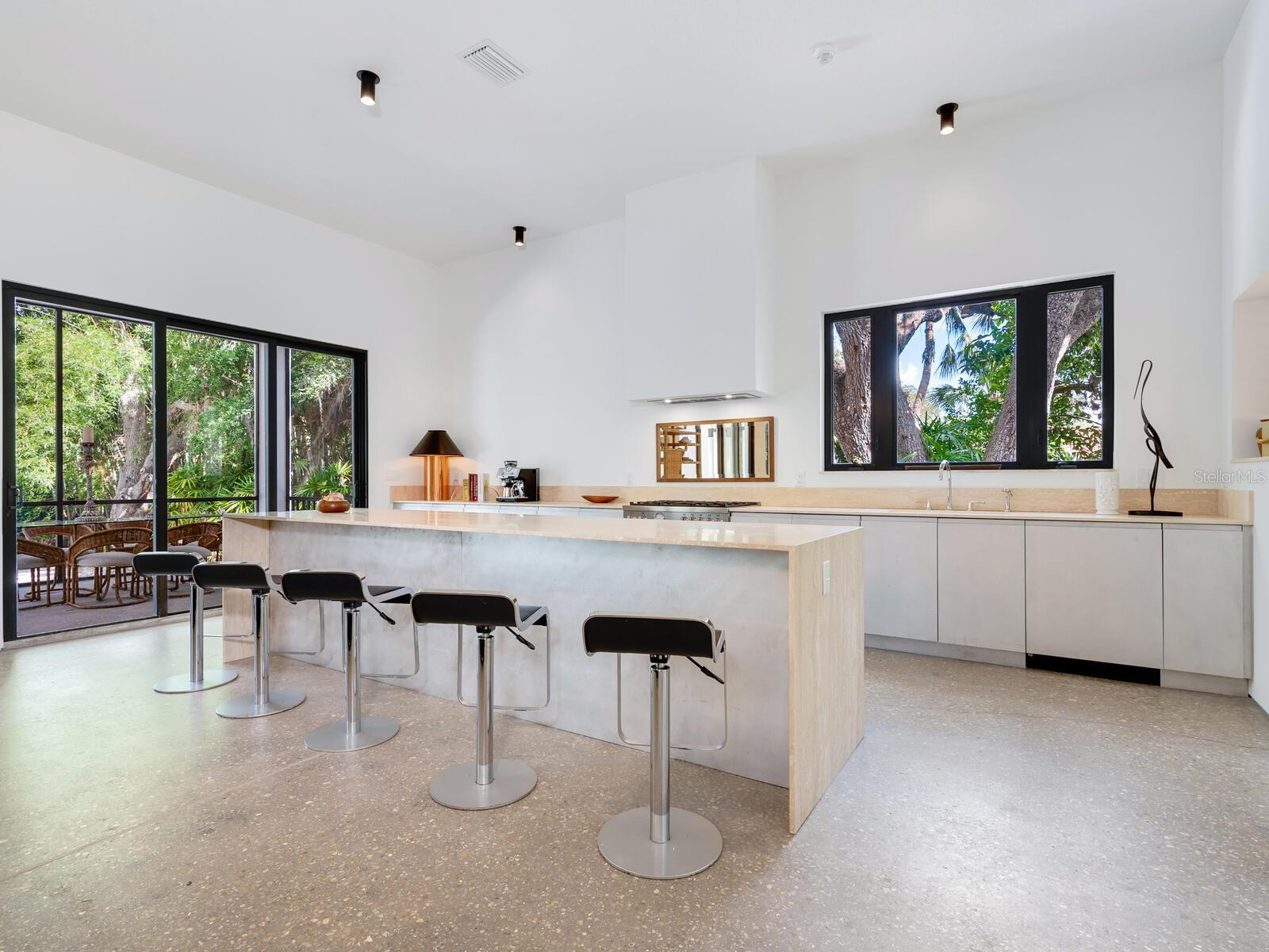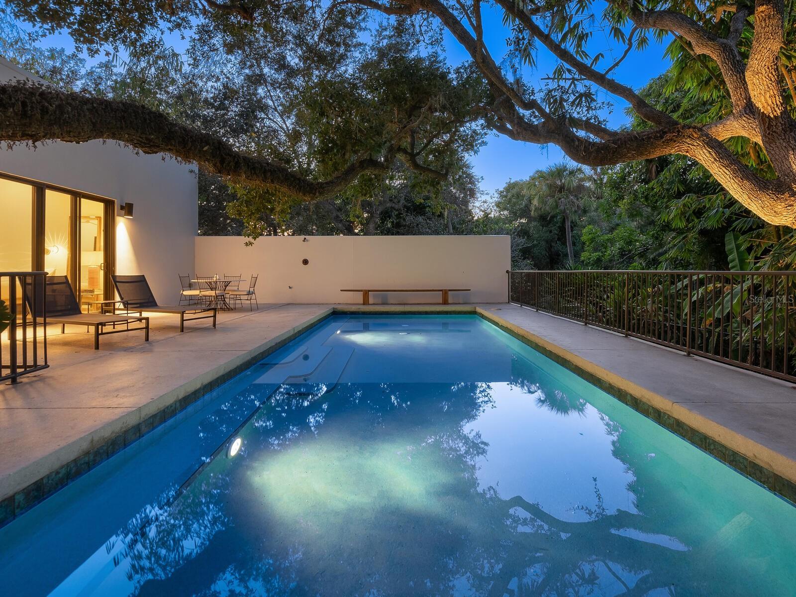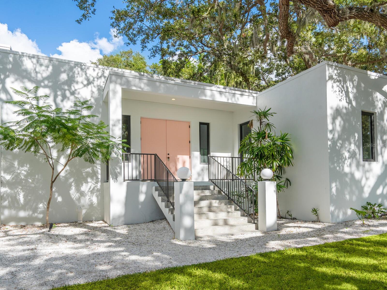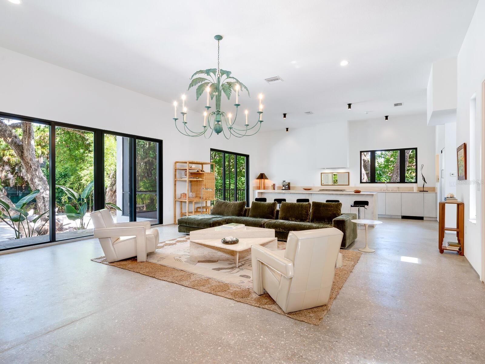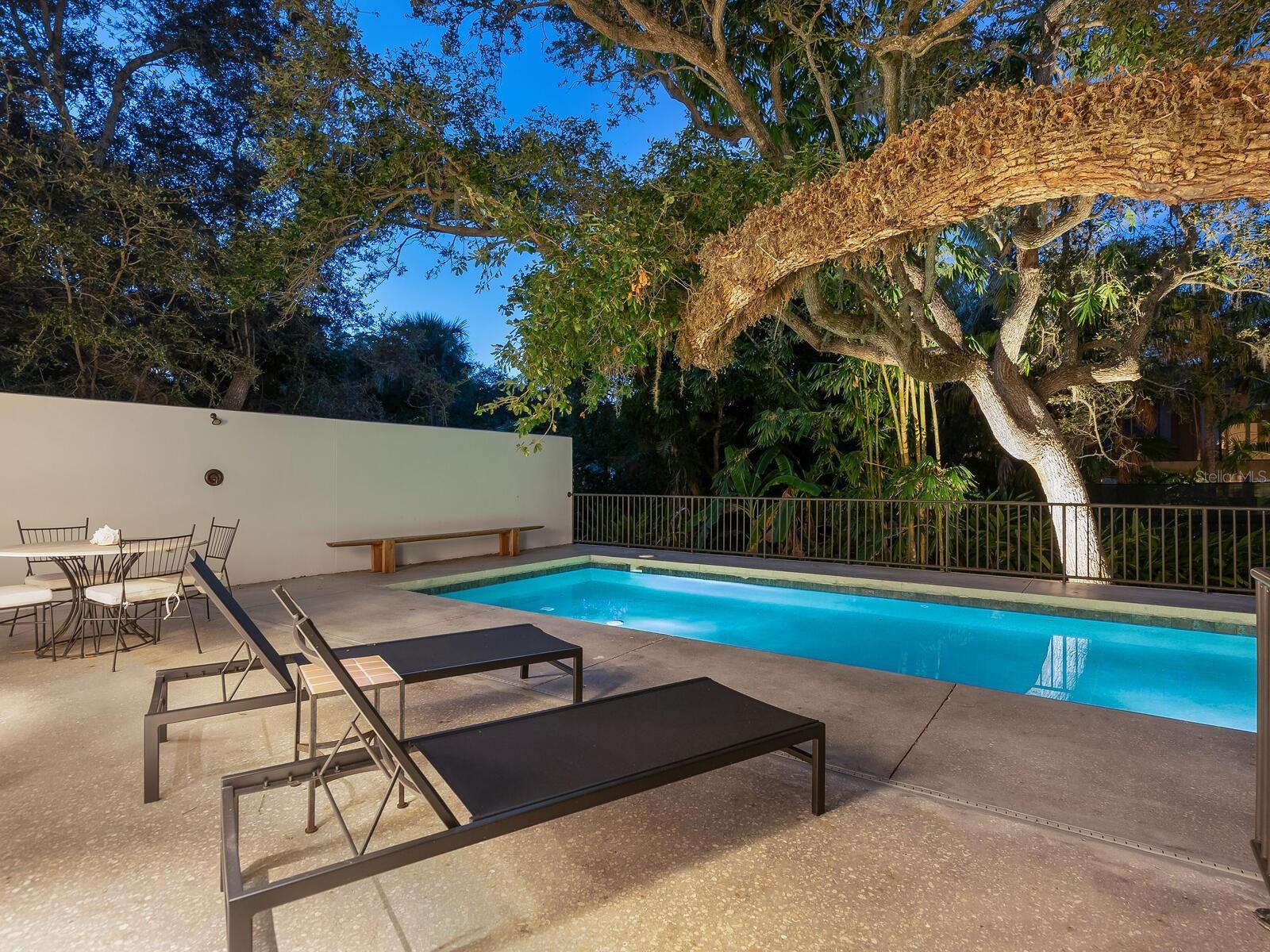 Villa Coquina is a luxurious, modern residence in the exclusive Oyster Bay neighborhood. Built in 2006 by architect Jack Jetton, one of the original members of the Sarasota School of Architecture, it blends the iconic Sarasota School style with modern construction, featuring steel reinforced concrete walls, hurricane impact windows, and a raised/ventilated foundation. The fenced and gated property spans almost half an acre and includes tropical landscaping, ancient live oaks, and a heated salt-water pool creating your own private tropical modern resort. This home offers nearly 3,400 sq ft of space, including 2,400 sq feet of interior space, with 3 bedrooms, 3 bathrooms, and an open floor plan designed to bring the outdoors in, with 12' ceilings and walls of glass. The home was fully renovated in 2023 by architect Daniel Lear, with updates to electrical, plumbing, HVAC, cabinetry, counters, roof, and the addition of a third bedroom and bathroom. Interiors by designer Blair Moritz feature high-end finishes like Water Works plumbing, Bertazzoni appliances, Italian travertine counters, Reform European Cabinetry, and vintage lighting. Every single detail was completed with the highest quality craftsmanship, perhaps especially the original seashell concrete floors which were lovingly restored to enhance the properties midcentury modern roots.The property also allows for future expansion, including the potential for a third-story ocean-view deck already engineered into the 2nd story. Villa Coquina offers a rare combination of modern luxury, climate proof construction, architectural history, and a prime Sarasota location near shopping, schools, beaches, and nightlife.