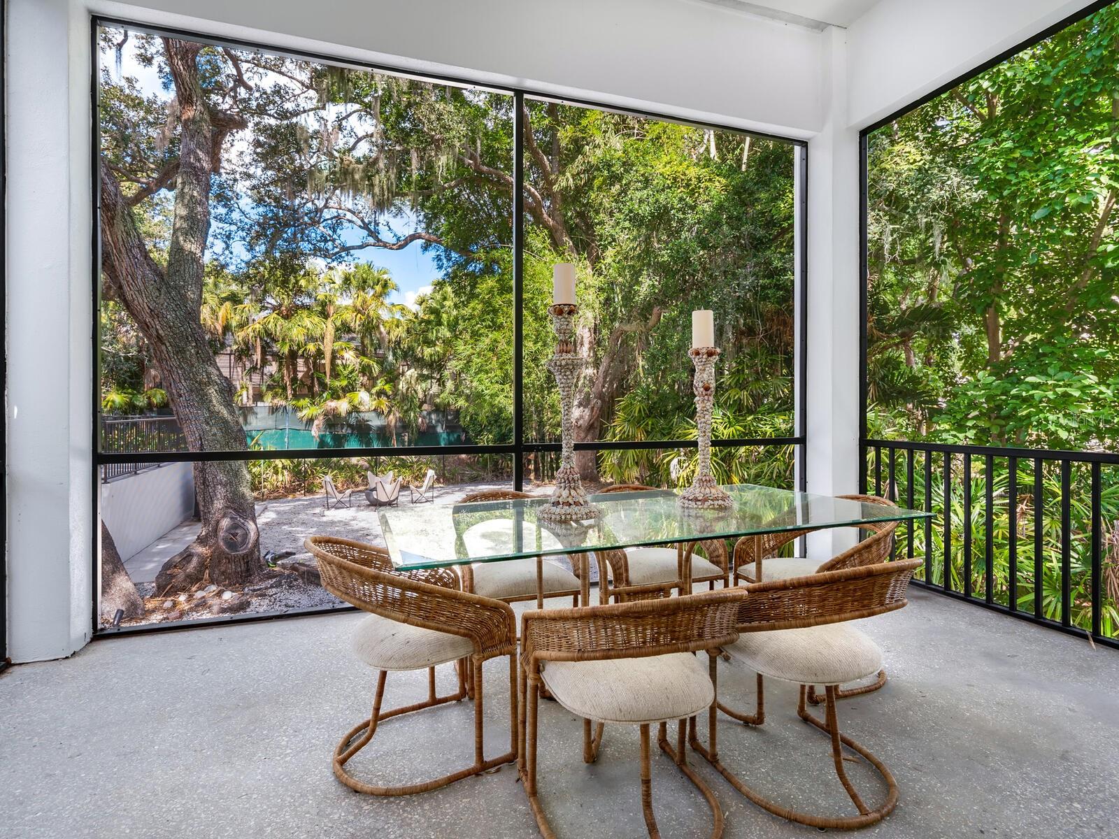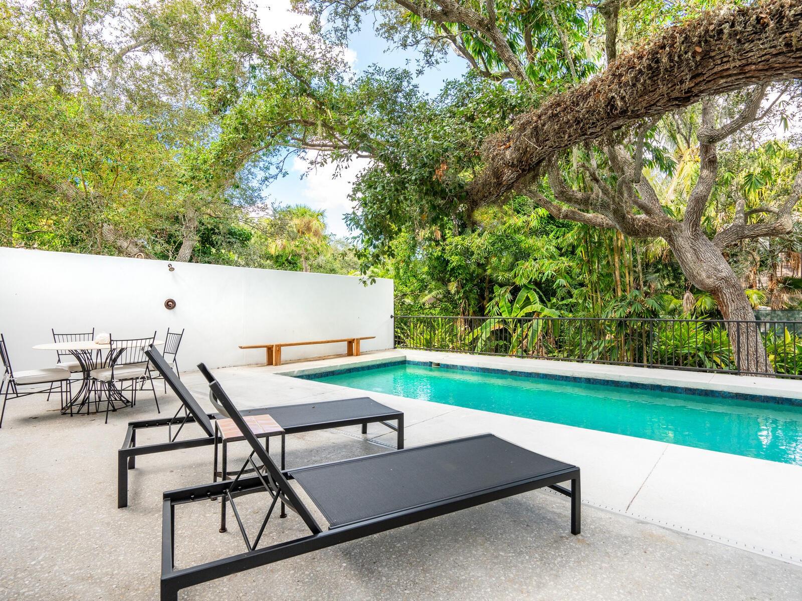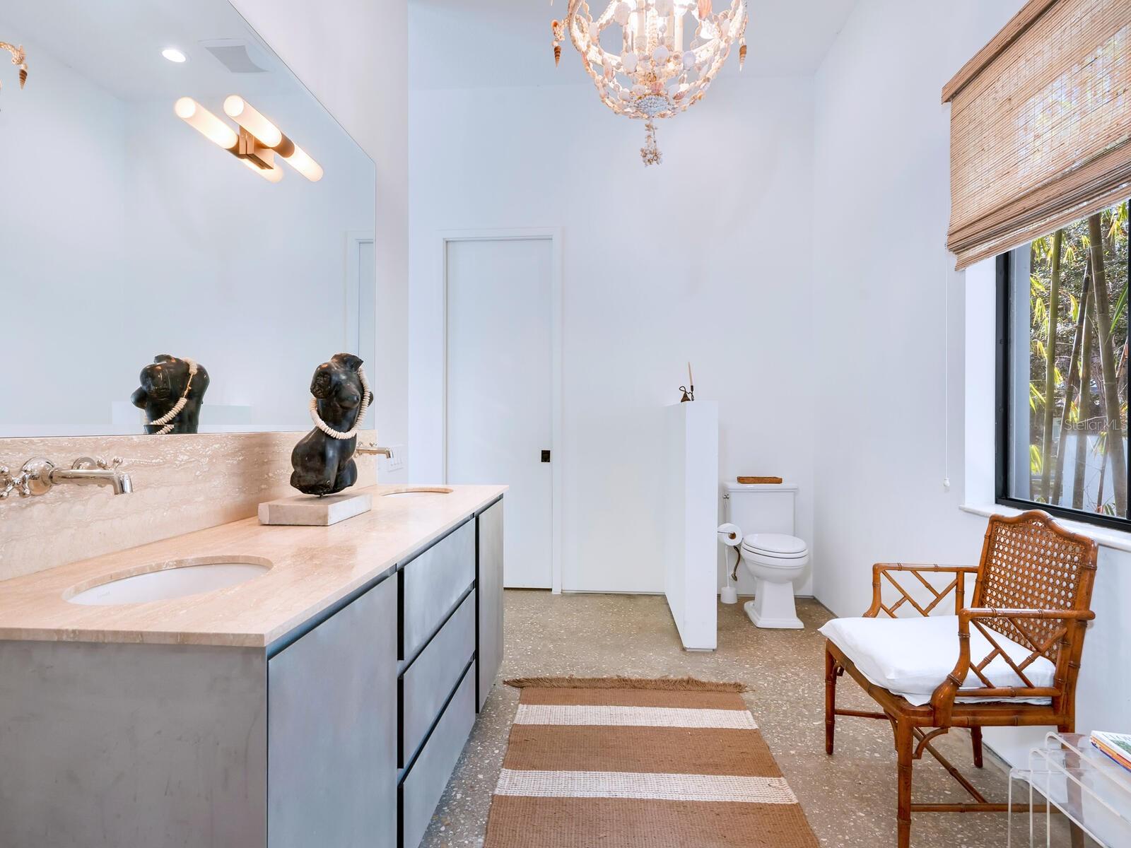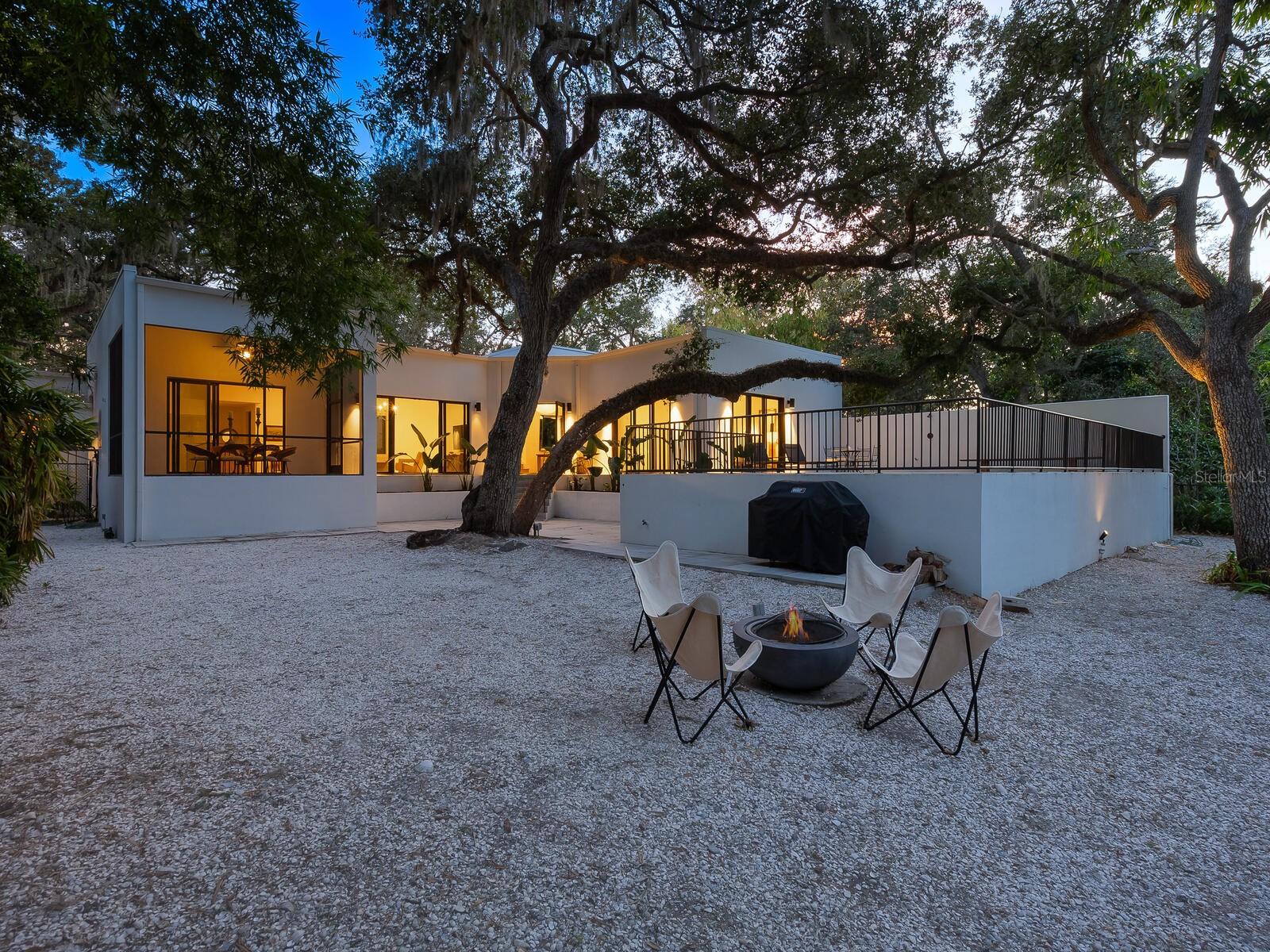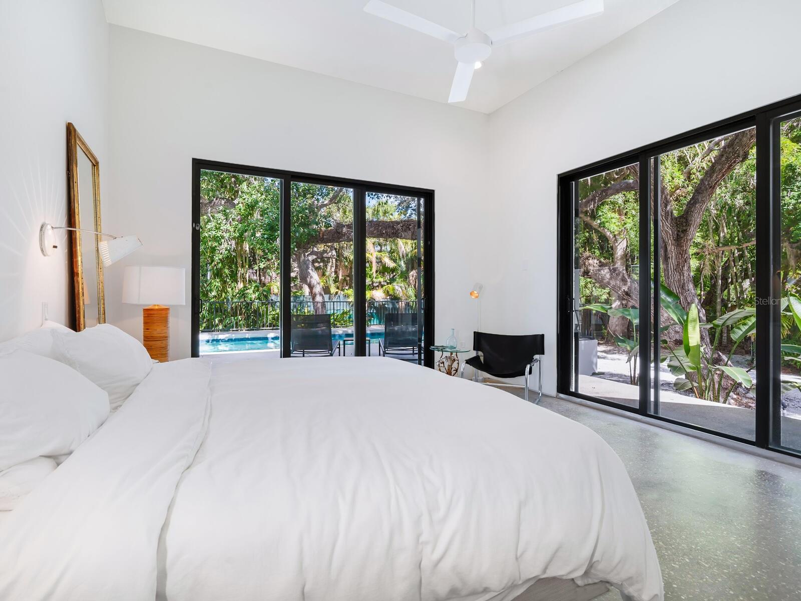 Villa Coquina is a luxurious, modern residence in the exclusive Oyster Bay neighborhood. Built in 2006 by architect Jack Jetton, one of the original members of the Sarasota School of Architecture, it blends the iconic Sarasota School style with modern construction, featuring steel reinforced concrete walls, hurricane impact windows, and a raised/ventilated foundation. The fenced and gated property spans almost half an acre and includes tropical landscaping, ancient live oaks, and a heated salt-water pool creating your own private tropical modern resort. This home offers nearly 3,400 sq ft of space, including 2,400 sq feet of interior space, with 3 bedrooms, 3 bathrooms, and an open floor plan designed to bring the outdoors in, with 12' ceilings and walls of glass. The home was fully renovated in 2023 by architect Daniel Lear, with updates to electrical, plumbing, HVAC, cabinetry, counters, roof, and the addition of a third bedroom and bathroom. Interiors by designer Blair Moritz feature high-end finishes like Water Works plumbing, Bertazzoni appliances, Italian travertine counters, Reform European Cabinetry, and vintage lighting. Every single detail was completed with the highest quality craftsmanship, perhaps especially the original seashell concrete floors which were lovingly restored to enhance the properties midcentury modern roots.The property also allows for future expansion, including the potential for a third-story ocean-view deck already engineered into the 2nd story. Villa Coquina offers a rare combination of modern luxury, climate proof construction, architectural history, and a prime Sarasota location near shopping, schools, beaches, and nightlife.