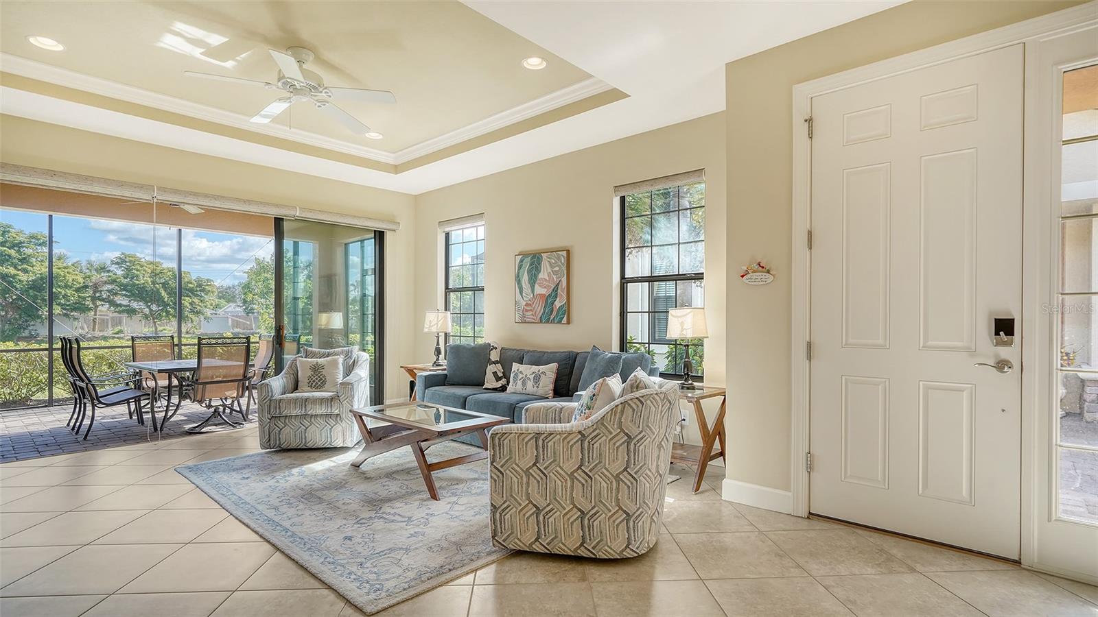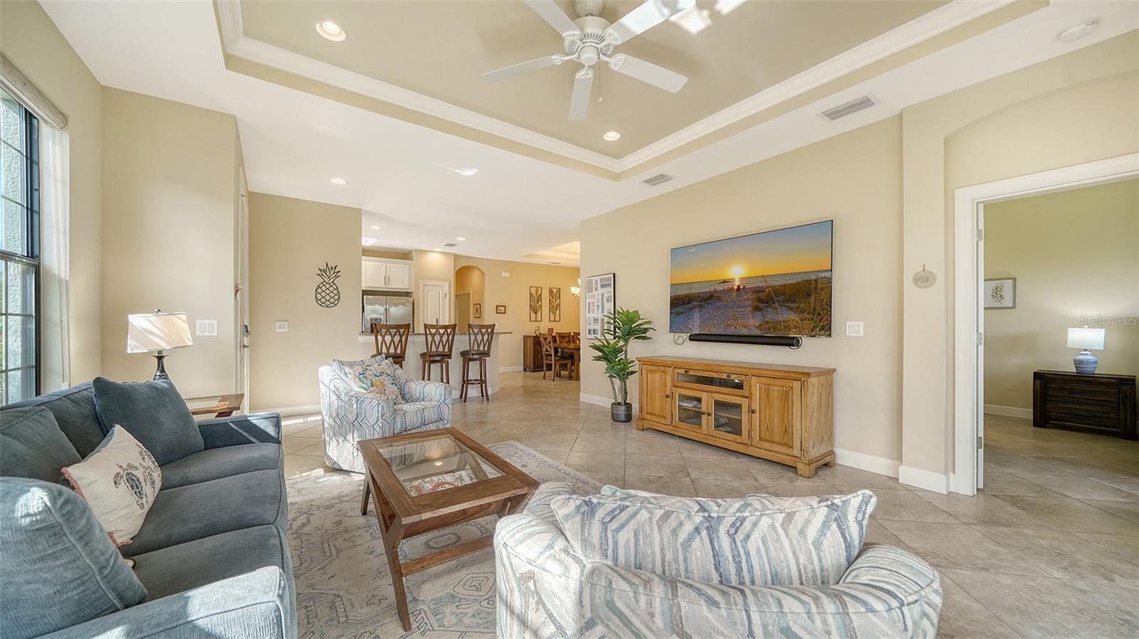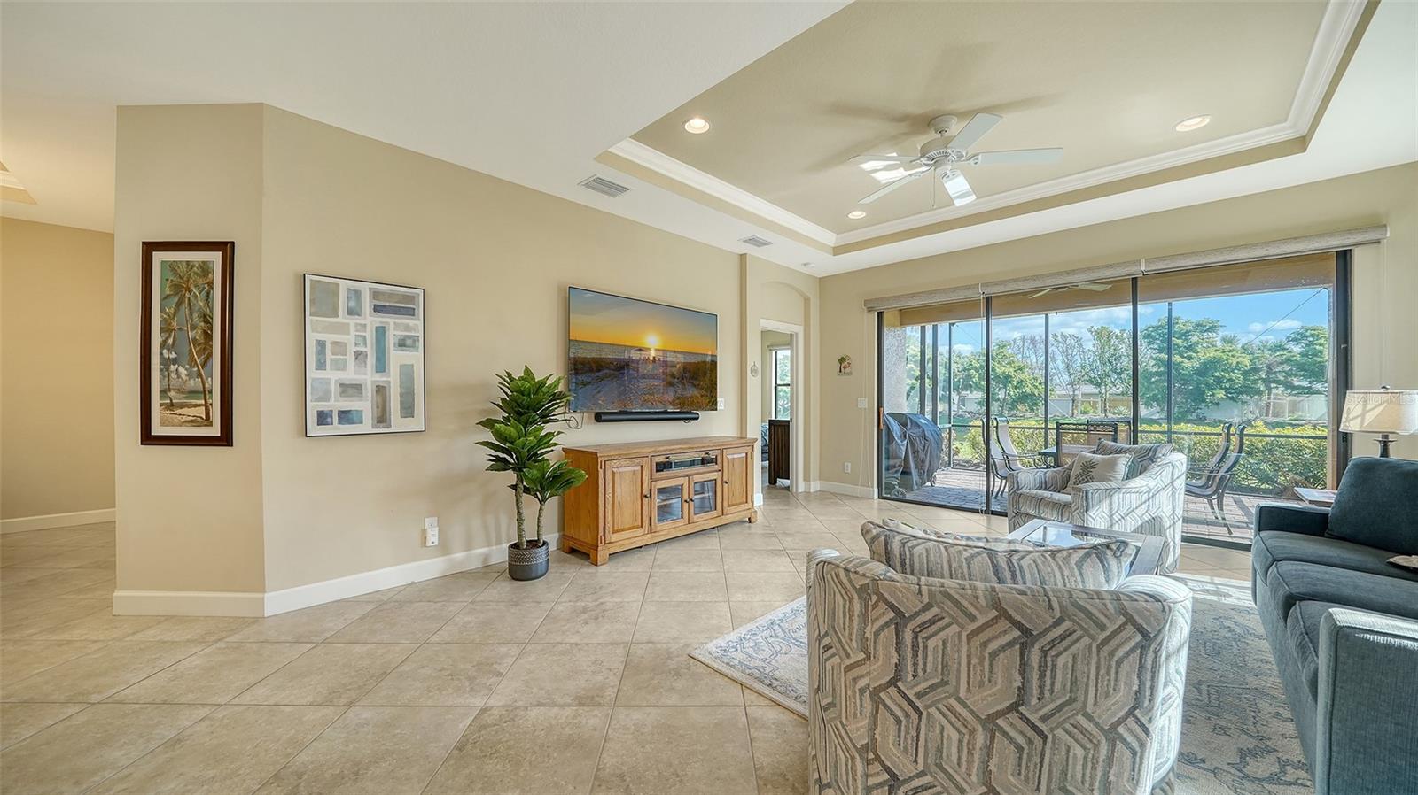Welcome to the coveted Esplanade by Siesta Key, where convenience meets luxury living. This comfortable maintenance-free villa offers pond views and an extended lanai, providing the perfect space for outdoor relaxation and entertaining. With tile floors throughout and a thoughtfully designed layout, this home offers both functionality and style. This villa includes two generously sized bedrooms with walk-in closets and designated bathrooms. Additionally, a den provides versatile space that could easily serve as an office or a third bedroom, accommodating your lifestyle needs. The chef in you will appreciate the well-equipped kitchen, featuring a gas range with double ovens, a well-sized breakfast bar, and ample cabinetry for all your culinary needs. The home includes a two-car garage with epoxy flooring, offering both durability and easy maintenance. Enjoy peace of mind with hurricane shutters, solid construction, and a low-maintenance lifestyle. This villa is designed for "lock and leave" convenience, making it the perfect retreat or second home. The Esplanade is an active, gated community with only 250 homes, creating a close-knit and welcoming atmosphere. The community's amenity center is top-notch, featuring a state-of-the-art gym, social spaces, resort-style pool, relaxing spa, tennis court, pickleball court, bocce ball and a Paw Park. Whether you're seeking an active lifestyle or simply enjoying time with friends and neighbors, the amenities cater to all. Centrally located, this home is just minutes from shopping, restaurants, and the world-famous Siesta Key Beach. This villa offers the ideal blend of comfort, convenience, and luxury, with easy access to everything Siesta Key and the surrounding area provides. Whether you're enjoying the quiet pond views, engaging in recreational activities, or exploring nearby attractions, this home is designed to complement an effortless, enjoyable lifestyle.