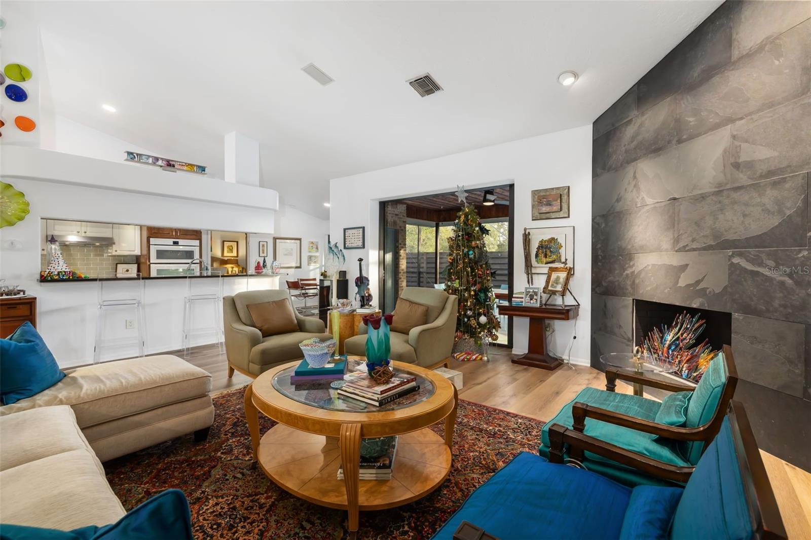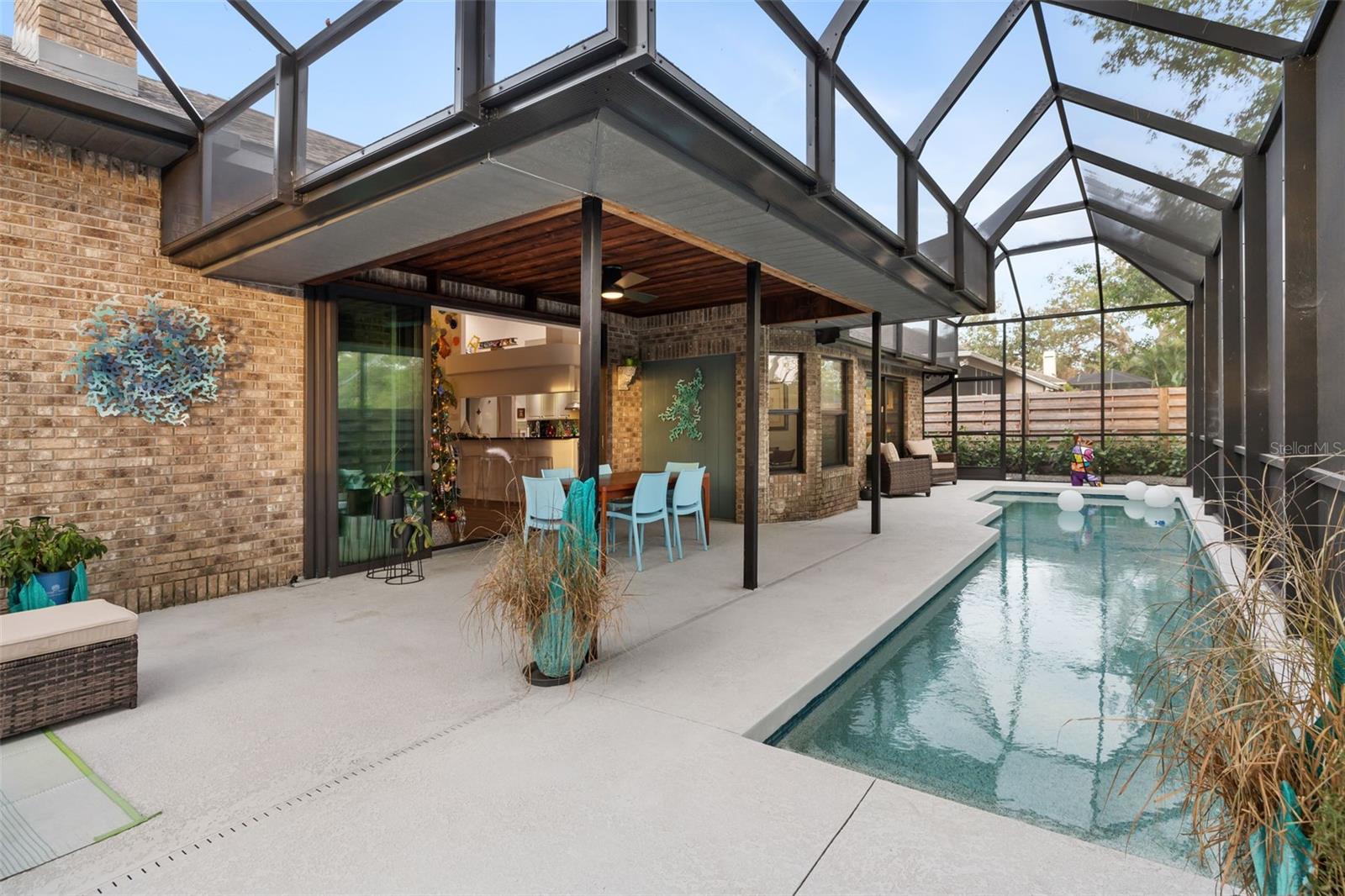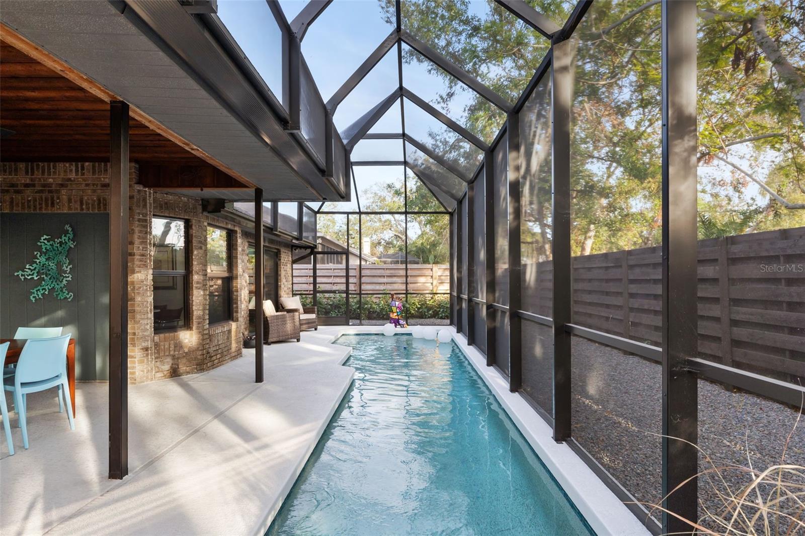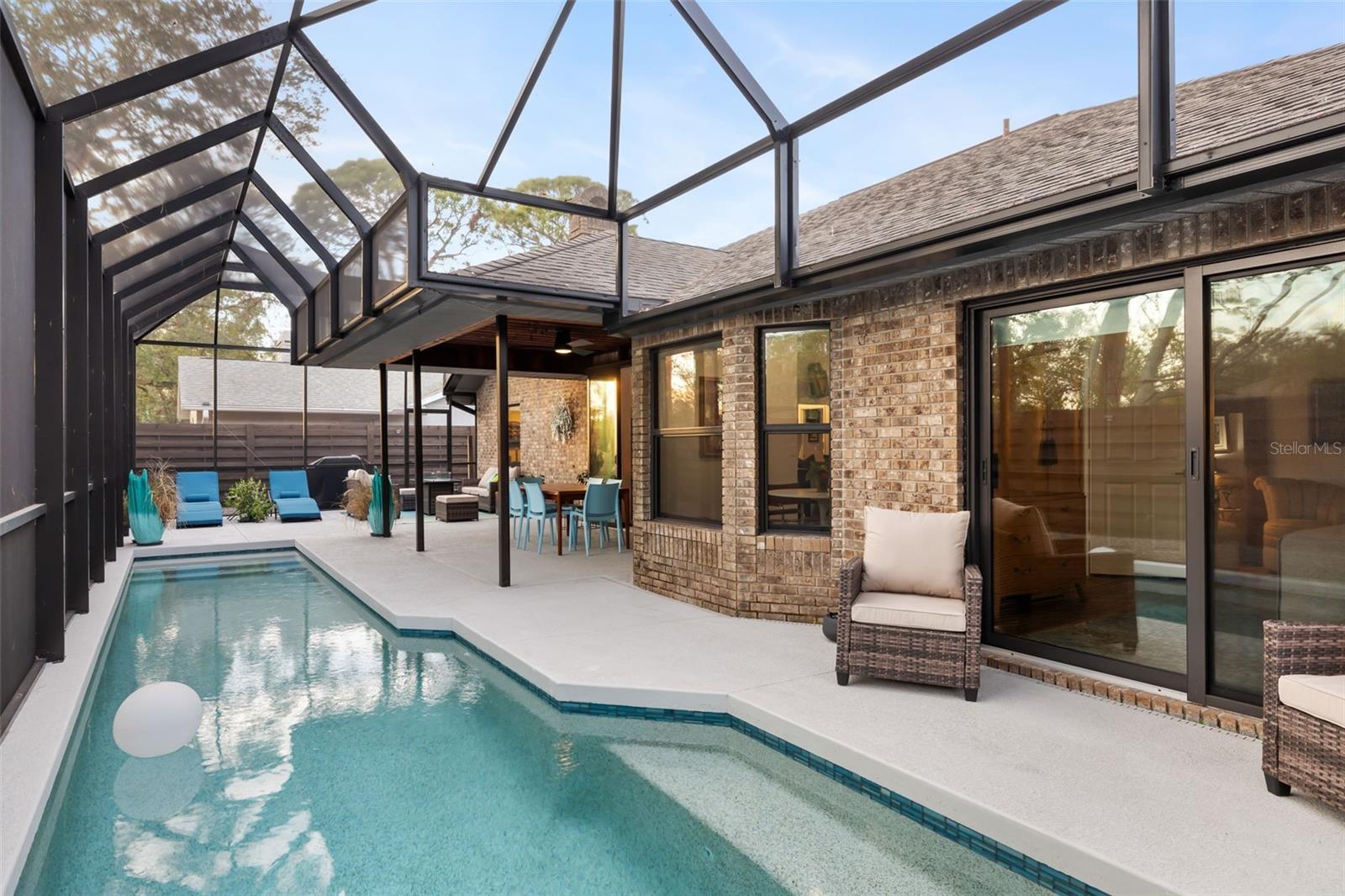 This rare brick-faced residence has been thoughtfully revitalized by the owners to offer modern luxury and timeless appeal. In a sought-after neighborhood, this exceptional three-bedroom, two-bath home combines quality craftsmanship with contemporary features to create a one-of-a-kind living experience. Step inside to discover a spacious and inviting layout, featuring whole-house Aquasana water purification system, and new impact windows and sliders that bring in abundant natural light. Both bathrooms have been tastefully and elegantly updated with soft close cabinetry, Kraus faucets, quartz countertops, and Oxygenics showerheads. Featured as well throughout the home are Italian-designed Iotty smart light glass-fronted light switches, programmable, with their neat soft LED halos. The convenience-inspired kitchen has been updated with top-of-the-line Bosch smart appliances, including a four-door refrigerator, five-burner gas stove top and dishwasher. The new cupboard style pantry offers stylish practicality with its pull out wood shelves. The kitchen also features a wall-mounted oven and microwave. The countertop extends to create a bar-height breakfast bar underneath the overhang, itself a nod to the mid-century style. The adjacent laundry and butler's pantry has also been updated, offering new quartz countertops, Kraus faucet, reverse osmosis tap and new soft-close cabinetry. The owners also added countertop to ceiling shelving for extra storage. The open floor plan allows for casual and formal entertaining and dining, comfortably accommodating larger gatherings as well as intimate dinners. This home features new luxury vinyl plank flooring, blending ideally with the original brick planter in the foyer, another nod to the mid-century style. In the dining area is a stunning new Kelly Wearstler chandelier, and there is another in the laundry/butler's pantry. The living room, with its cathedral ceiling, gives that feeling of spaciousness, and the slate-fronted, wood-burning fireplace adds sophistication to the room. The home also features extensive art lighting to showcase your pieces. Outside, the home, the owners have created an oasis, a space for outdoor relaxing and entertaining. The NEW lap pool uses a salt filtration system, has a PebbleTec finish and multi-colored lighting, with a seating shelf that invites you to unwind in comfort. The extended lanai and new pool cage provide a seamless transition to the outdoors, ideal for enjoying the beautiful Florida weather year-round. For added convenience and energy efficiency, the home also features a new leased LPG tank that powers the water heater and Bosch stovetop, lowering utility costs. With its low-maintenance landscaping, modern amenities and thoughtful updates throughout, this home has it all and is waiting for you. Minutes to beaches and downtown by car, easy access also to I-75. The location of this striking property makes it easy to reach amenities such as golf courses, parks, tennis clubs and more!