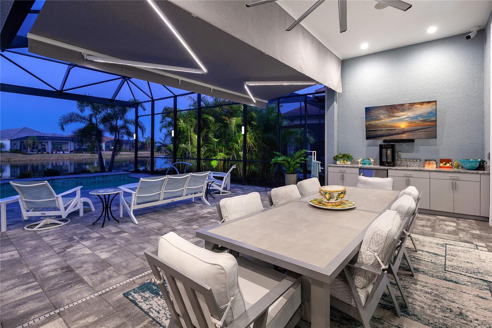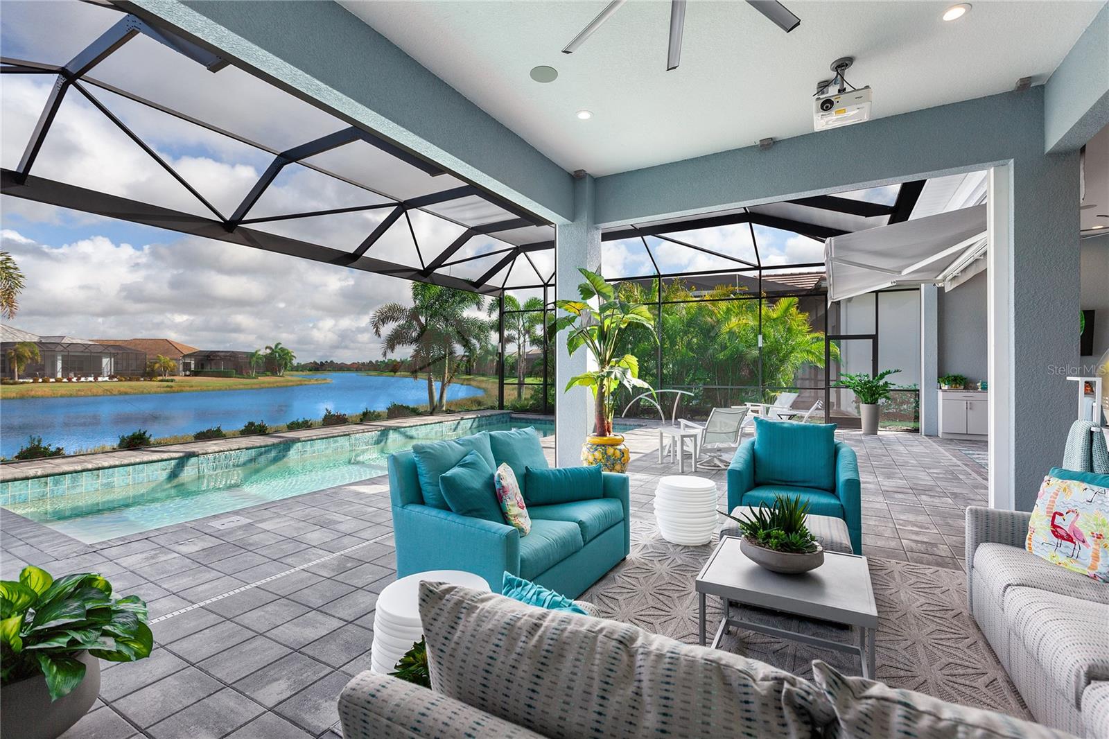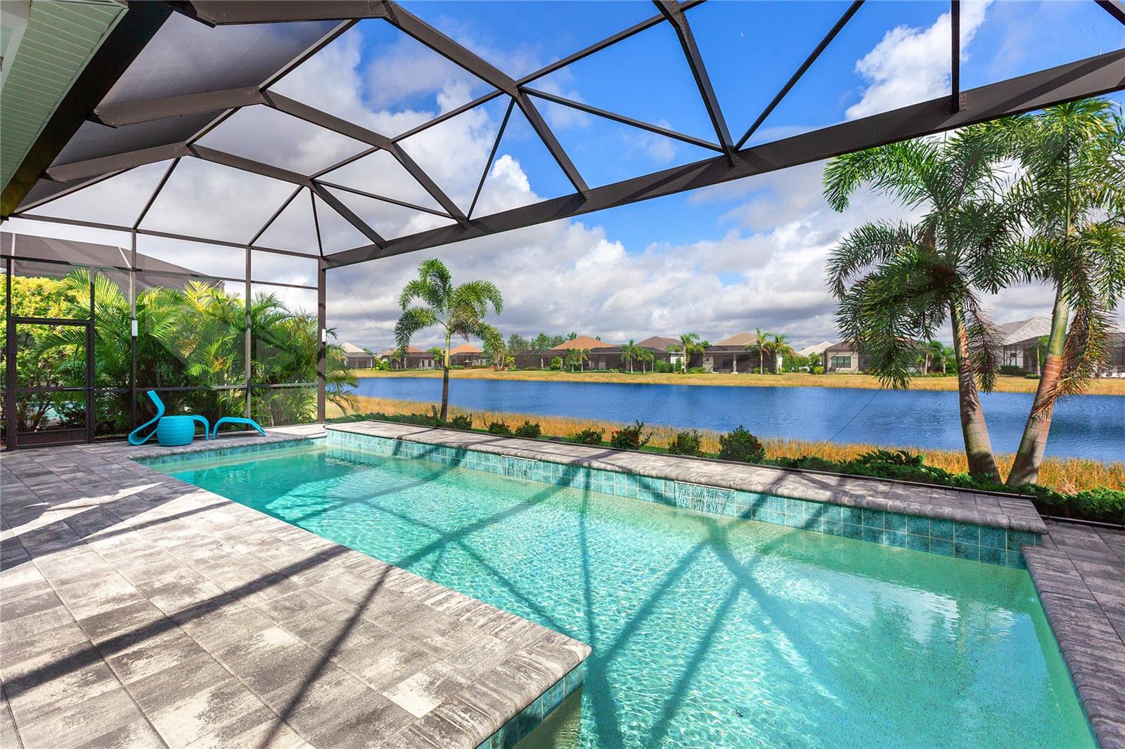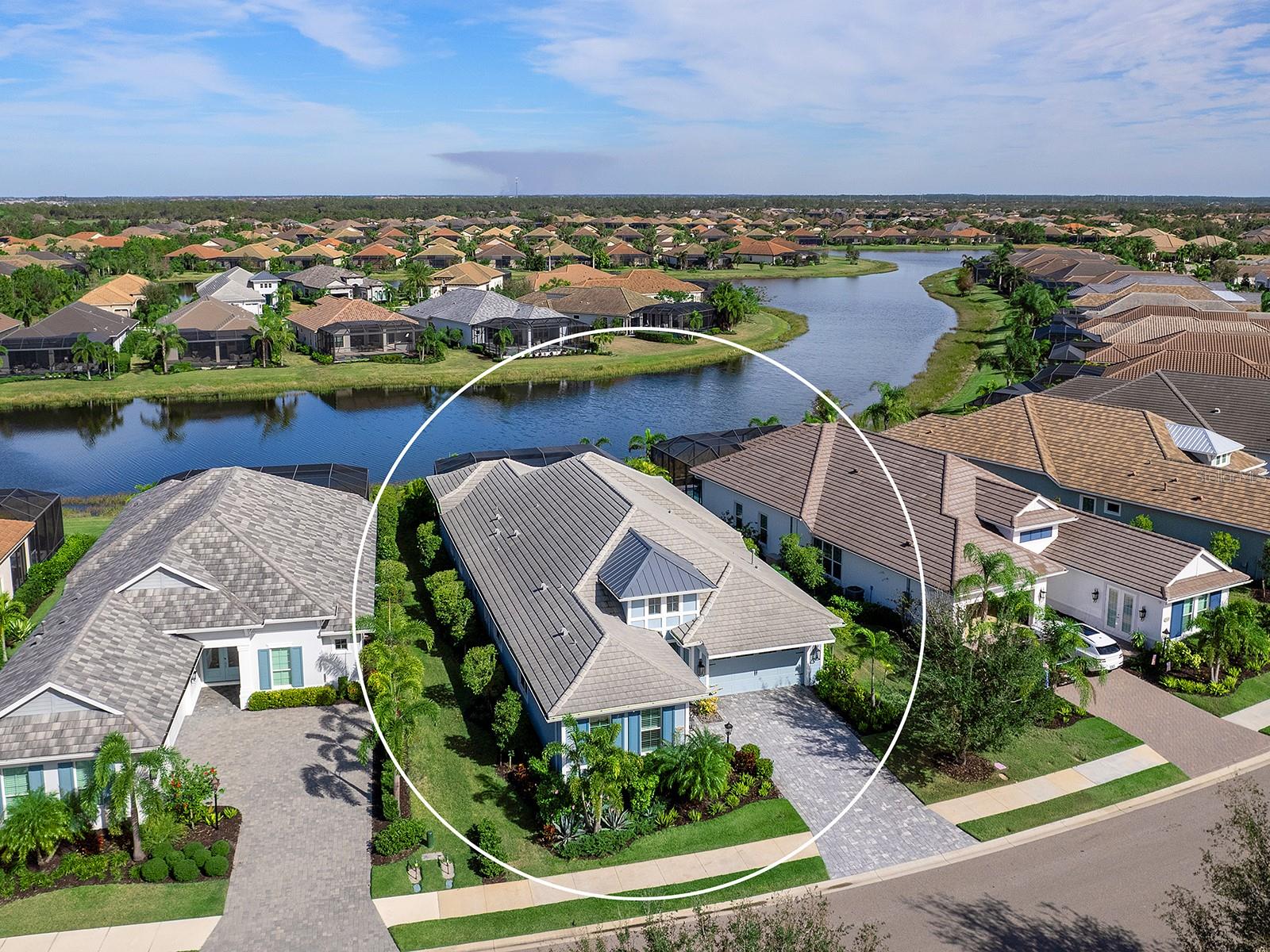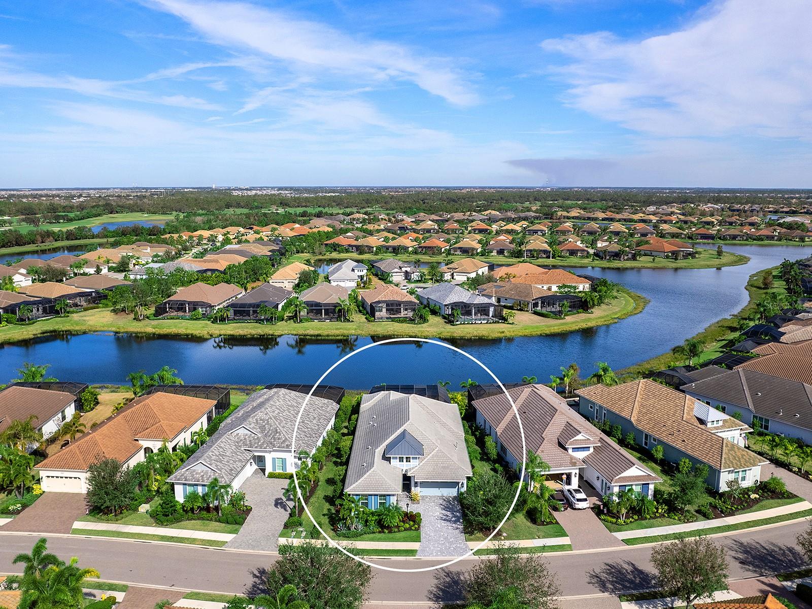 Luxury meets sophistication!! Designed for refined living and seamless entertaining, this expanded and customized Carlotta model by Neal Signature Homes is set within the gated enclave of Country Club East. Positioned on a premier lakefront homesite, the residence captures sweeping, uninterrupted views of a tranquil private lake and surrounding natural habitat. The outdoor living area is a private retreat, featuring a fully equipped summer kitchen with a grill and pizza oven, fireplace, projector screen, multiple televisions, and dedicated lounge zones--all oriented to overlook the winding waters of Lakewood Ranch. Every detail of this masterpiece has been meticulously curated, with over $200,000 in upgrades and aftermarket enhancements. The open and thoughtfully designed floor plan includes a 2-foot extension in the great room, dining room, primary bedroom, and a versatile club/bonus room, three bedrooms, and a chef's dream kitchen. The gourmet kitchen serves as the heart of the home, featuring a grand 13-foot extended Cambria designer island, sleek Italian-style cabinetry, top-of-the-line Caf appliances, and a custom-organized walk-in pantry. Seamlessly flowing into the great room and dining area, this space is perfect for entertaining while showcasing stunning lake vistas. The owner's retreat is a sanctuary of modern luxury, boasting a spa-inspired bathroom with split vanities, a Smart Moen shower system, and an oversized walk-in closet outfitted with custom built-ins. Two additional guest bedrooms, one includes a private en suite, ensuring comfort and privacy for visitors. Outdoor living reaches new heights on the extended lanai, a true resort-style escape. Enjoy a large heated swimming pool with multiple waterfalls, a panoramic screen overlooking the long winding lake, and a fully equipped outdoor kitchen with a grill, double burners, pizza oven, a separate serving buffet, retractable awning, an outdoor fireplace and three Storm Smart sun screens giving you rest and enjoyment. For unforgettable evenings, gather under the stars with the outdoor movie projection system featuring a 120-inch screen and additional speakers. This state-of-the-art smart home integrates Lutron lighting, security cameras, remote-controlled garage and door systems, Sonos sound system both indoors and out, EV charging station and motorized Hunter Douglas zebra blinds, TVs, and an iPad for easy controlling of this high tech home. Other upgrades include tray ceilings, crown moldings, extensive landscaping with modern outdoor lighting, multi-color changing pool lighting, and custom Closet Tech systems for optimal storage in all closets, the pantry, laundry room, and garages. Additional highlights include all impact windows and doors, designer light fixtures and ceiling fans, porcelain tile flooring throughout, a spacious laundry room with ample storage cabinets, a dedicated folding area, and custom organizers. Indulge in the lifestyle you've been dreaming of in the marvelous home. Residents of Country Club East enjoy a resort lifestyle with access to The Retreat an amenity center offering a resort-style pool, fitness facility, social spaces, an outdoor kitchen, nature trails for biking and walking. Optional memberships available at the LWR Golf and Country Club: golf, fitness and social. Conveniently located near shopping and restaurants, dining, cultural venues and renowned beaches.