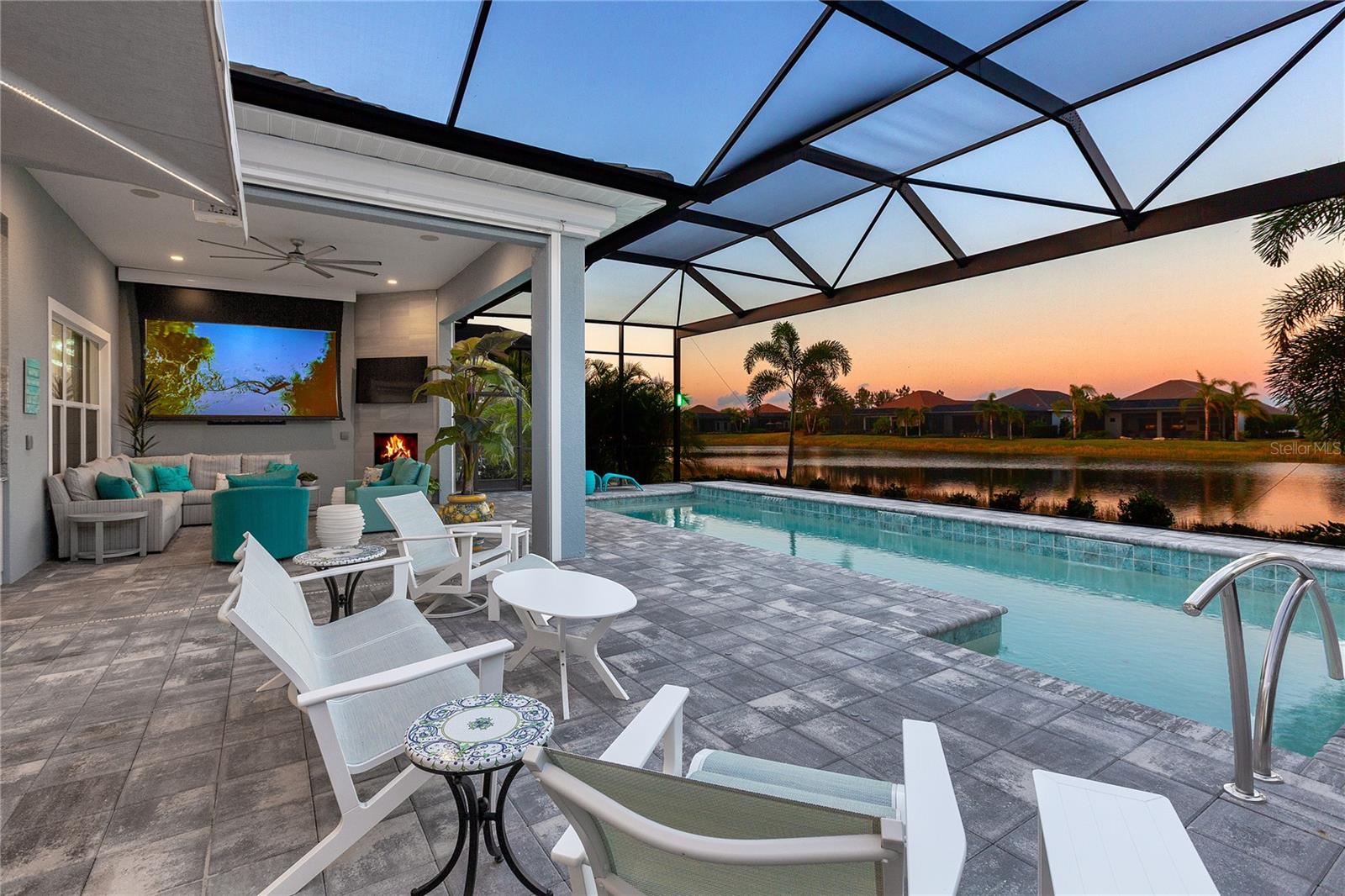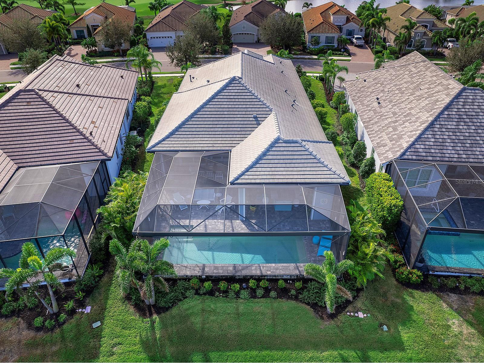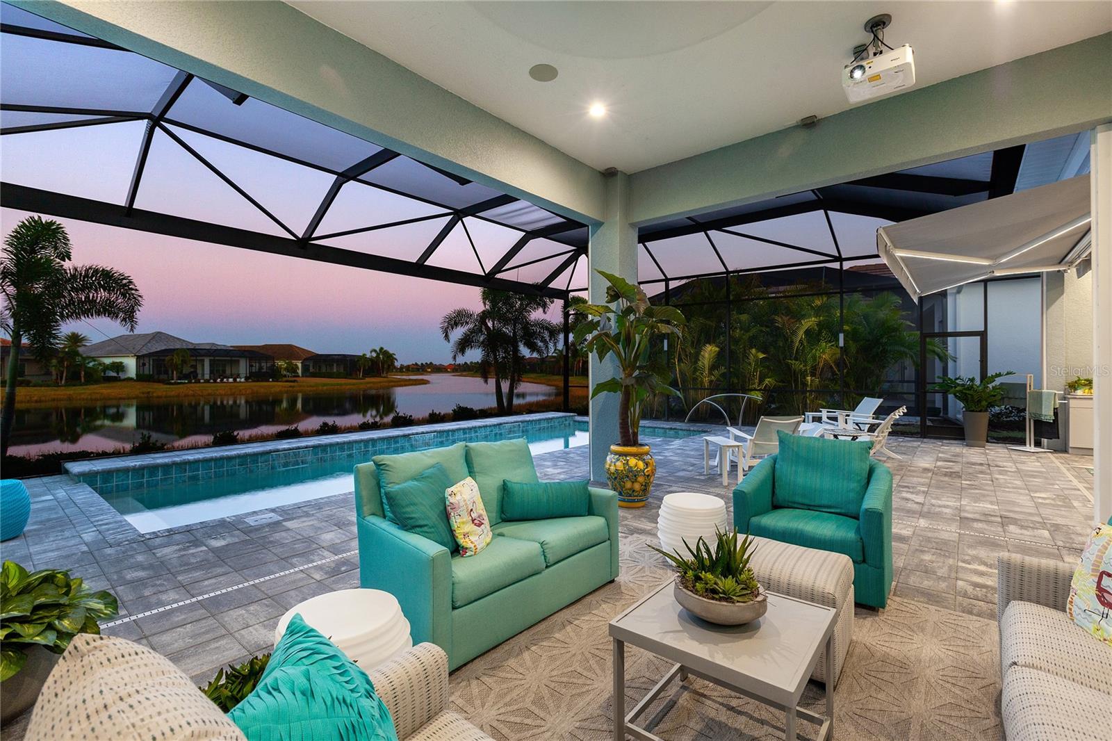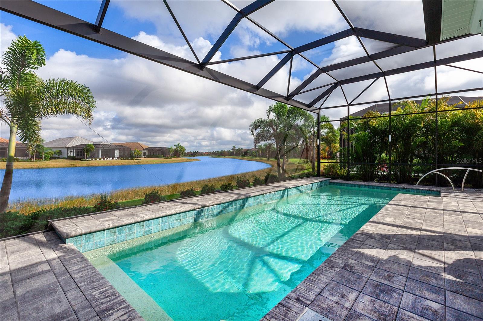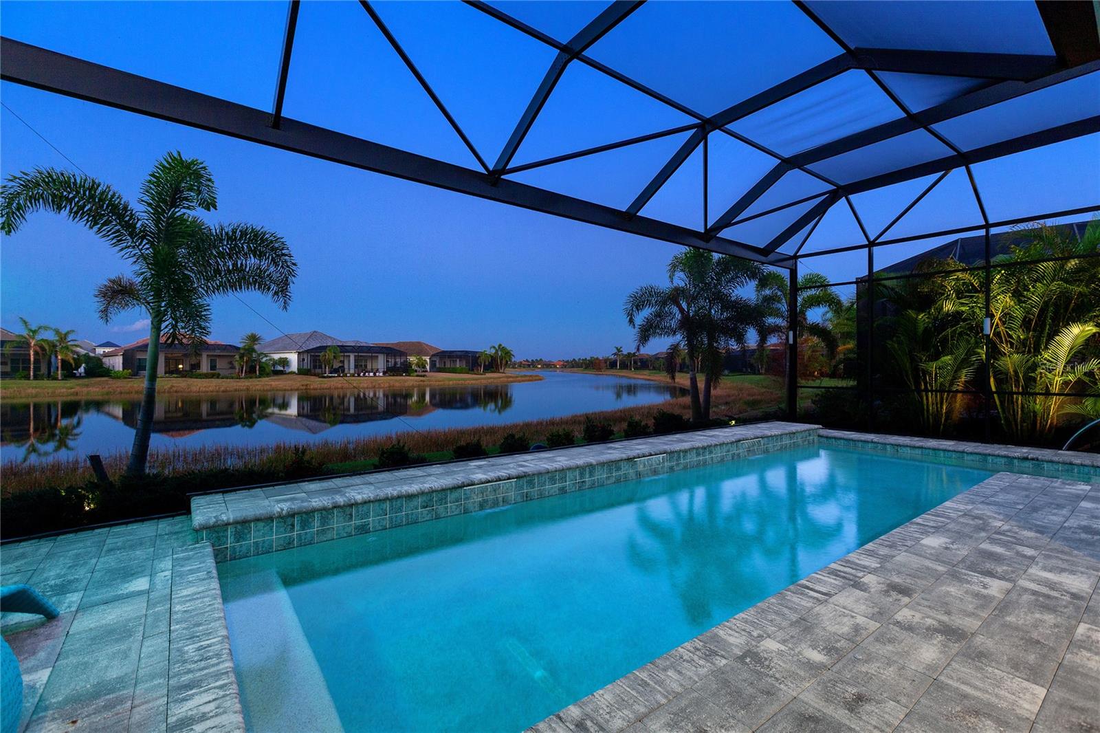 Luxury meets sophistication!! Designed for refined living and seamless entertaining, this expanded and customized Carlotta model by Neal Signature Homes is set within the gated enclave of Country Club East. Positioned on a premier lakefront homesite, the residence captures sweeping, uninterrupted views of a tranquil private lake and surrounding natural habitat. The outdoor living area is a private retreat, featuring a fully equipped summer kitchen with a grill and pizza oven, fireplace, projector screen, multiple televisions, and dedicated lounge zones--all oriented to overlook the winding waters of Lakewood Ranch. Every detail of this masterpiece has been meticulously curated, with over $200,000 in upgrades and aftermarket enhancements. The open and thoughtfully designed floor plan includes a 2-foot extension in the great room, dining room, primary bedroom, and a versatile club/bonus room, three bedrooms, and a chef's dream kitchen. The gourmet kitchen serves as the heart of the home, featuring a grand 13-foot extended Cambria designer island, sleek Italian-style cabinetry, top-of-the-line Caf appliances, and a custom-organized walk-in pantry. Seamlessly flowing into the great room and dining area, this space is perfect for entertaining while showcasing stunning lake vistas. The owner's retreat is a sanctuary of modern luxury, boasting a spa-inspired bathroom with split vanities, a Smart Moen shower system, and an oversized walk-in closet outfitted with custom built-ins. Two additional guest bedrooms, one includes a private en suite, ensuring comfort and privacy for visitors. Outdoor living reaches new heights on the extended lanai, a true resort-style escape. Enjoy a large heated swimming pool with multiple waterfalls, a panoramic screen overlooking the long winding lake, and a fully equipped outdoor kitchen with a grill, double burners, pizza oven, a separate serving buffet, retractable awning, an outdoor fireplace and three Storm Smart sun screens giving you rest and enjoyment. For unforgettable evenings, gather under the stars with the outdoor movie projection system featuring a 120-inch screen and additional speakers. This state-of-the-art smart home integrates Lutron lighting, security cameras, remote-controlled garage and door systems, Sonos sound system both indoors and out, EV charging station and motorized Hunter Douglas zebra blinds, TVs, and an iPad for easy controlling of this high tech home. Other upgrades include tray ceilings, crown moldings, extensive landscaping with modern outdoor lighting, multi-color changing pool lighting, and custom Closet Tech systems for optimal storage in all closets, the pantry, laundry room, and garages. Additional highlights include all impact windows and doors, designer light fixtures and ceiling fans, porcelain tile flooring throughout, a spacious laundry room with ample storage cabinets, a dedicated folding area, and custom organizers. Indulge in the lifestyle you've been dreaming of in the marvelous home. Residents of Country Club East enjoy a resort lifestyle with access to The Retreat an amenity center offering a resort-style pool, fitness facility, social spaces, an outdoor kitchen, nature trails for biking and walking. Optional memberships available at the LWR Golf and Country Club: golf, fitness and social. Conveniently located near shopping and restaurants, dining, cultural venues and renowned beaches.