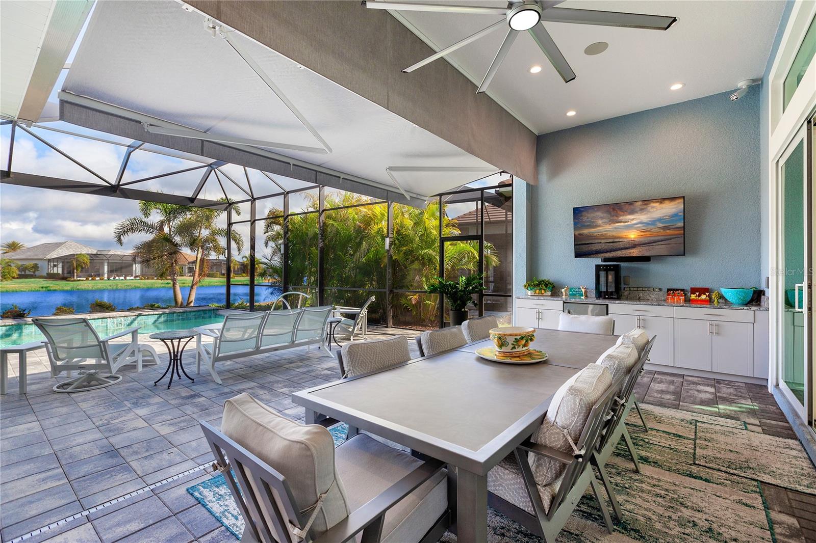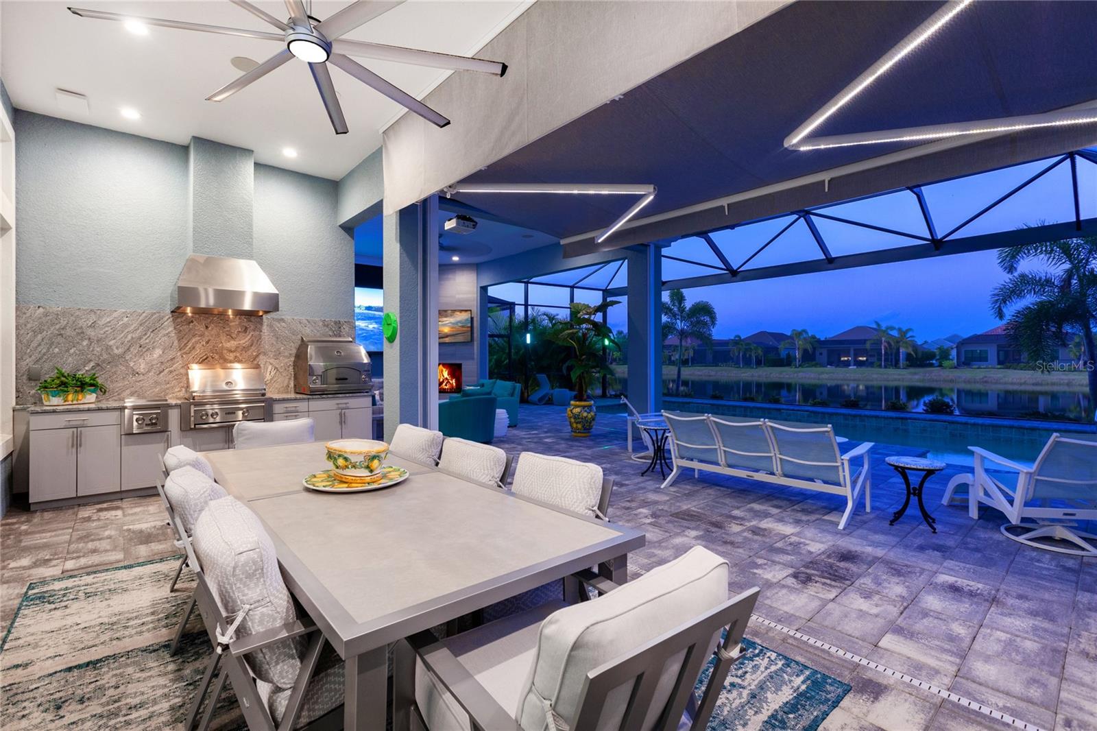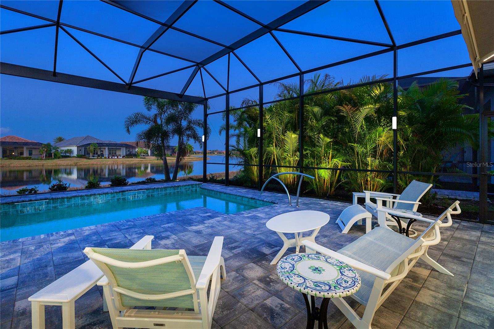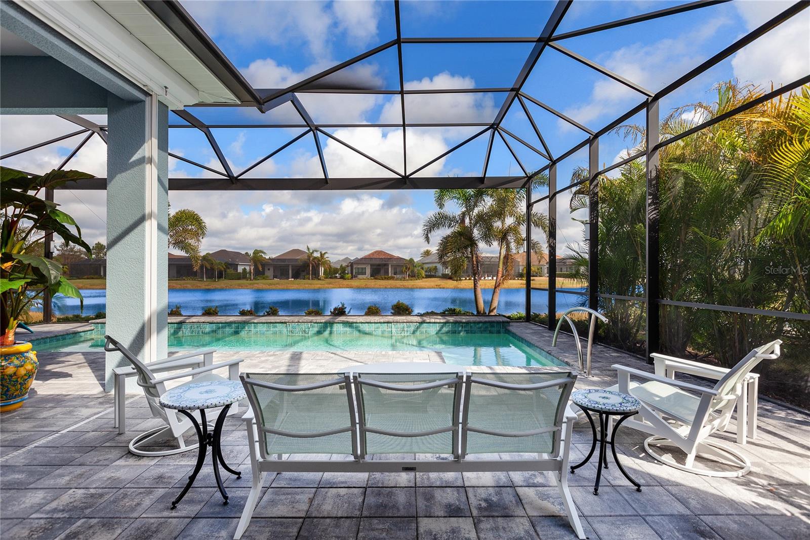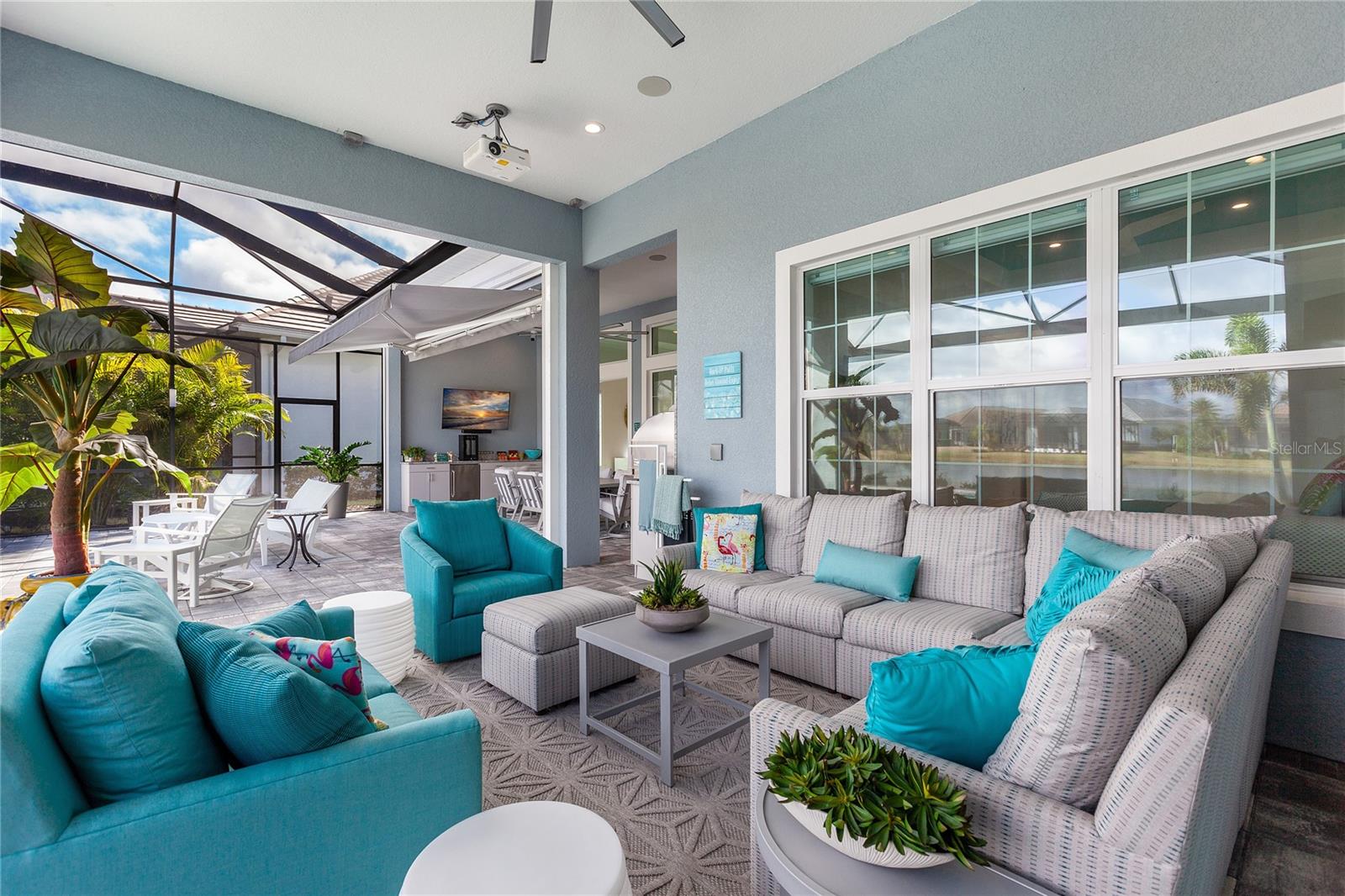Luxury meets sophistication!! Designed for refined living and seamless entertaining, this expanded and customized Carlotta model by Neal Signature Homes is set within the gated enclave of Country Club East. Positioned on a premier lakefront homesite, the residence captures sweeping, uninterrupted views of a tranquil private lake and surrounding natural habitat. The outdoor living area is a private retreat, featuring a fully equipped summer kitchen with a grill and pizza oven, fireplace, projector screen, multiple televisions, and dedicated lounge zones--all oriented to overlook the winding waters of Lakewood Ranch. Every detail of this masterpiece has been meticulously curated, with over $200,000 in upgrades and aftermarket enhancements. The open and thoughtfully designed floor plan includes a 2-foot extension in the great room, dining room, primary bedroom, and a versatile club/bonus room, three bedrooms, and a chef's dream kitchen. The gourmet kitchen serves as the heart of the home, featuring a grand 13-foot extended Cambria designer island, sleek Italian-style cabinetry, top-of-the-line Caf appliances, and a custom-organized walk-in pantry. Seamlessly flowing into the great room and dining area, this space is perfect for entertaining while showcasing stunning lake vistas. The owner's retreat is a sanctuary of modern luxury, boasting a spa-inspired bathroom with split vanities, a Smart Moen shower system, and an oversized walk-in closet outfitted with custom built-ins. Two additional guest bedrooms, one includes a private en suite, ensuring comfort and privacy for visitors. Outdoor living reaches new heights on the extended lanai, a true resort-style escape. Enjoy a large heated swimming pool with multiple waterfalls, a panoramic screen overlooking the long winding lake, and a fully equipped outdoor kitchen with a grill, double burners, pizza oven, a separate serving buffet, retractable awning, an outdoor fireplace and three Storm Smart sun screens giving you rest and enjoyment. For unforgettable evenings, gather under the stars with the outdoor movie projection system featuring a 120-inch screen and additional speakers. This state-of-the-art smart home integrates Lutron lighting, security cameras, remote-controlled garage and door systems, Sonos sound system both indoors and out, EV charging station and motorized Hunter Douglas zebra blinds, TVs, and an iPad for easy controlling of this high tech home. Other upgrades include tray ceilings, crown moldings, extensive landscaping with modern outdoor lighting, multi-color changing pool lighting, and custom Closet Tech systems for optimal storage in all closets, the pantry, laundry room, and garages. Additional highlights include all impact windows and doors, designer light fixtures and ceiling fans, porcelain tile flooring throughout, a spacious laundry room with ample storage cabinets, a dedicated folding area, and custom organizers. Indulge in the lifestyle you've been dreaming of in the marvelous home. Residents of Country Club East enjoy a resort lifestyle with access to The Retreat an amenity center offering a resort-style pool, fitness facility, social spaces, an outdoor kitchen, nature trails for biking and walking. Optional memberships available at the LWR Golf and Country Club: golf, fitness and social. Conveniently located near shopping and restaurants, dining, cultural venues and renowned beaches.