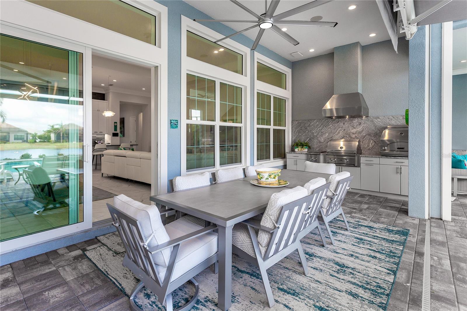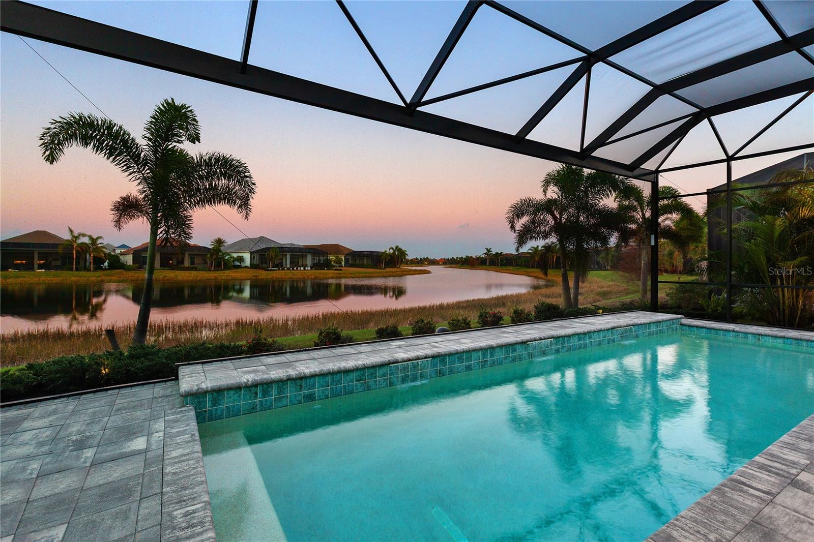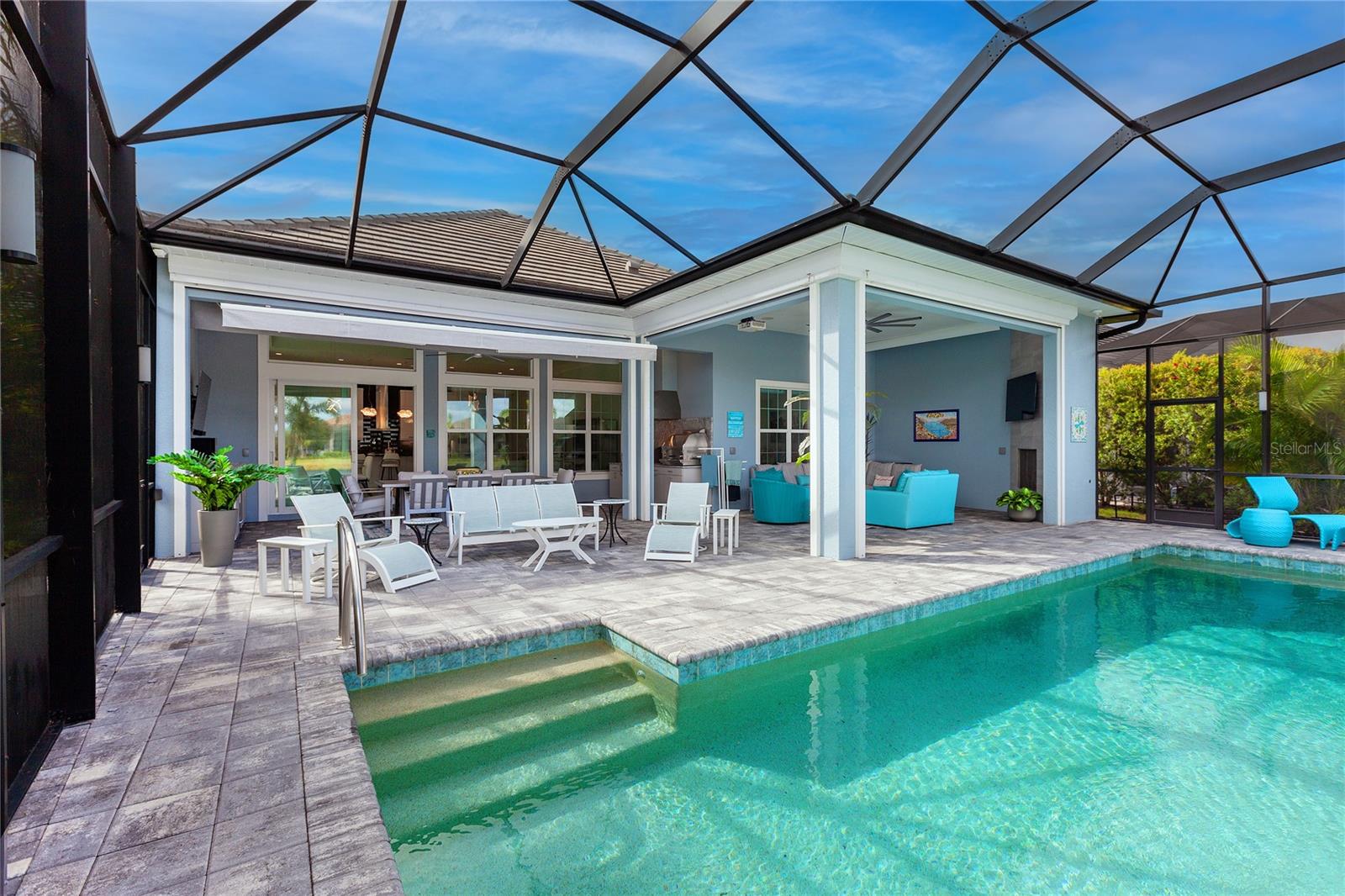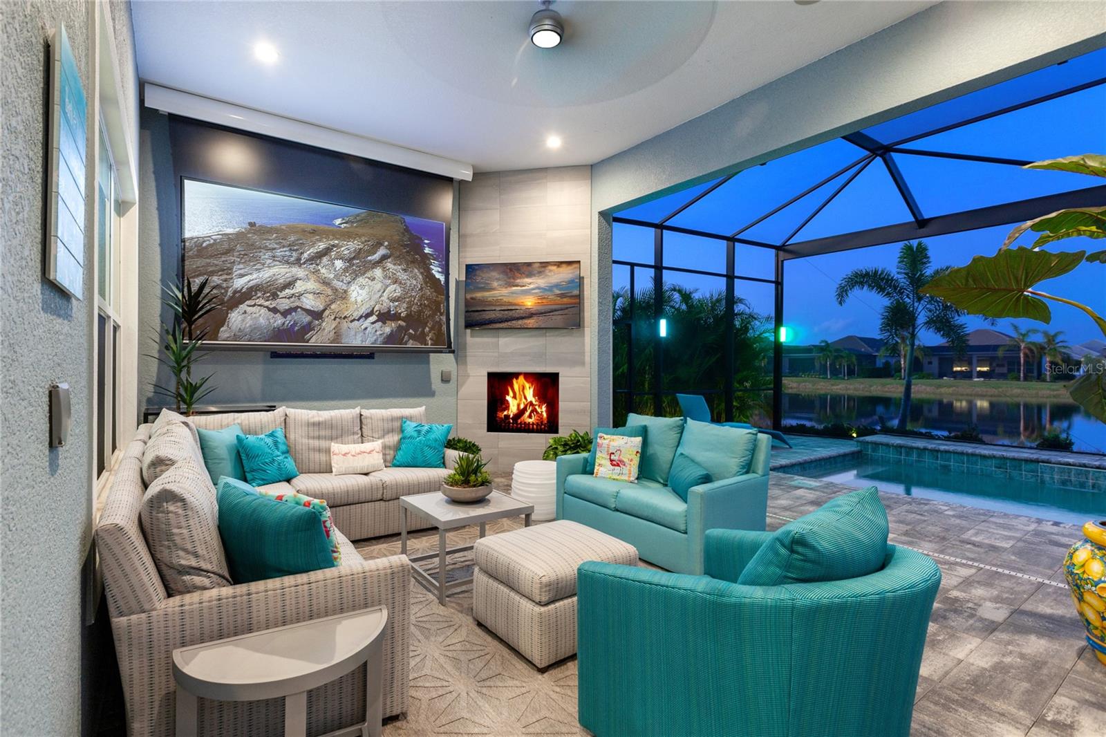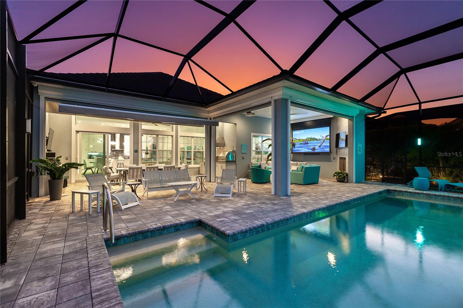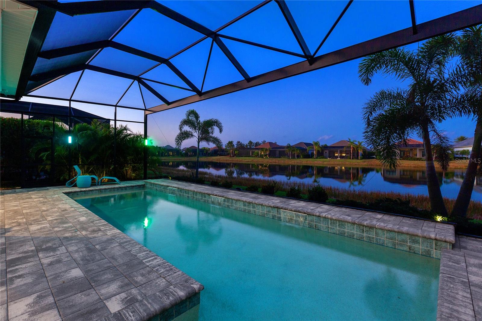 Luxury meets sophistication!! Designed for refined living and seamless entertaining, this expanded and customized Carlotta model by Neal Signature Homes is set within the gated enclave of Country Club East. Positioned on a premier lakefront homesite, the residence captures sweeping, uninterrupted views of a tranquil private lake and surrounding natural habitat. The outdoor living area is a private retreat, featuring a fully equipped summer kitchen with a grill and pizza oven, fireplace, projector screen, multiple televisions, and dedicated lounge zones--all oriented to overlook the winding waters of Lakewood Ranch. Every detail of this masterpiece has been meticulously curated, with over $200,000 in upgrades and aftermarket enhancements. The open and thoughtfully designed floor plan includes a 2-foot extension in the great room, dining room, primary bedroom, and a versatile club/bonus room, three bedrooms, and a chef's dream kitchen. The gourmet kitchen serves as the heart of the home, featuring a grand 13-foot extended Cambria designer island, sleek Italian-style cabinetry, top-of-the-line Caf appliances, and a custom-organized walk-in pantry. Seamlessly flowing into the great room and dining area, this space is perfect for entertaining while showcasing stunning lake vistas. The owner's retreat is a sanctuary of modern luxury, boasting a spa-inspired bathroom with split vanities, a Smart Moen shower system, and an oversized walk-in closet outfitted with custom built-ins. Two additional guest bedrooms, one includes a private en suite, ensuring comfort and privacy for visitors. Outdoor living reaches new heights on the extended lanai, a true resort-style escape. Enjoy a large heated swimming pool with multiple waterfalls, a panoramic screen overlooking the long winding lake, and a fully equipped outdoor kitchen with a grill, double burners, pizza oven, a separate serving buffet, retractable awning, an outdoor fireplace and three Storm Smart sun screens giving you rest and enjoyment. For unforgettable evenings, gather under the stars with the outdoor movie projection system featuring a 120-inch screen and additional speakers. This state-of-the-art smart home integrates Lutron lighting, security cameras, remote-controlled garage and door systems, Sonos sound system both indoors and out, EV charging station and motorized Hunter Douglas zebra blinds, TVs, and an iPad for easy controlling of this high tech home. Other upgrades include tray ceilings, crown moldings, extensive landscaping with modern outdoor lighting, multi-color changing pool lighting, and custom Closet Tech systems for optimal storage in all closets, the pantry, laundry room, and garages. Additional highlights include all impact windows and doors, designer light fixtures and ceiling fans, porcelain tile flooring throughout, a spacious laundry room with ample storage cabinets, a dedicated folding area, and custom organizers. Indulge in the lifestyle you've been dreaming of in the marvelous home. Residents of Country Club East enjoy a resort lifestyle with access to The Retreat an amenity center offering a resort-style pool, fitness facility, social spaces, an outdoor kitchen, nature trails for biking and walking. Optional memberships available at the LWR Golf and Country Club: golf, fitness and social. Conveniently located near shopping and restaurants, dining, cultural venues and renowned beaches.