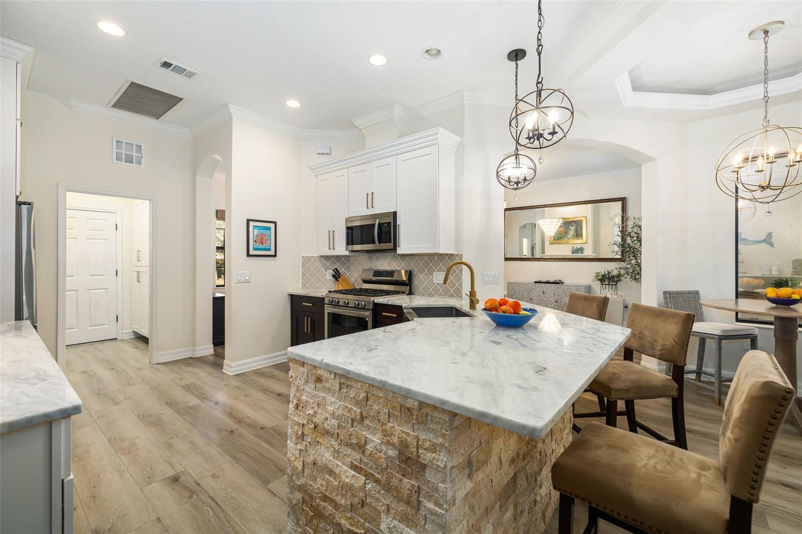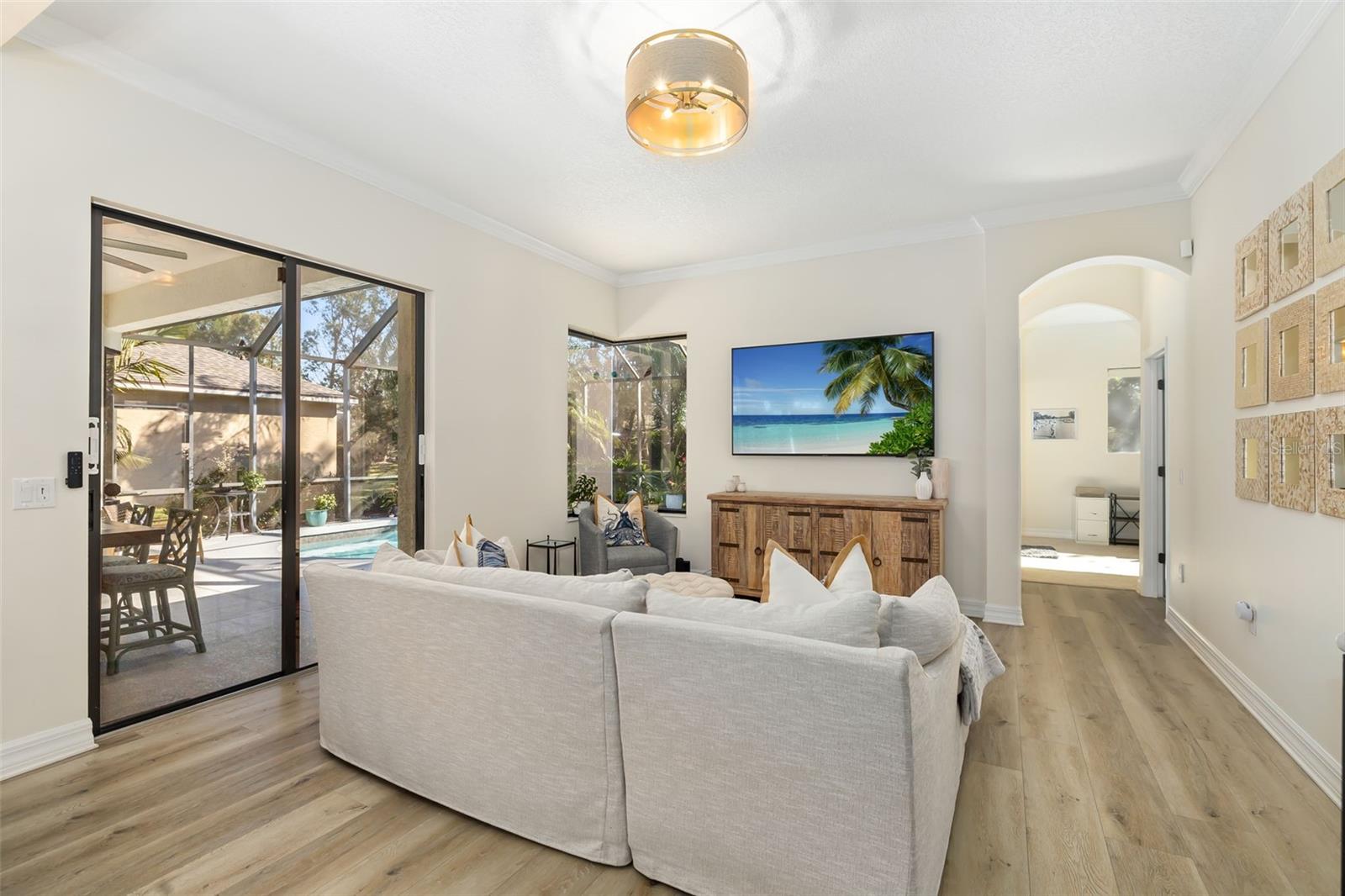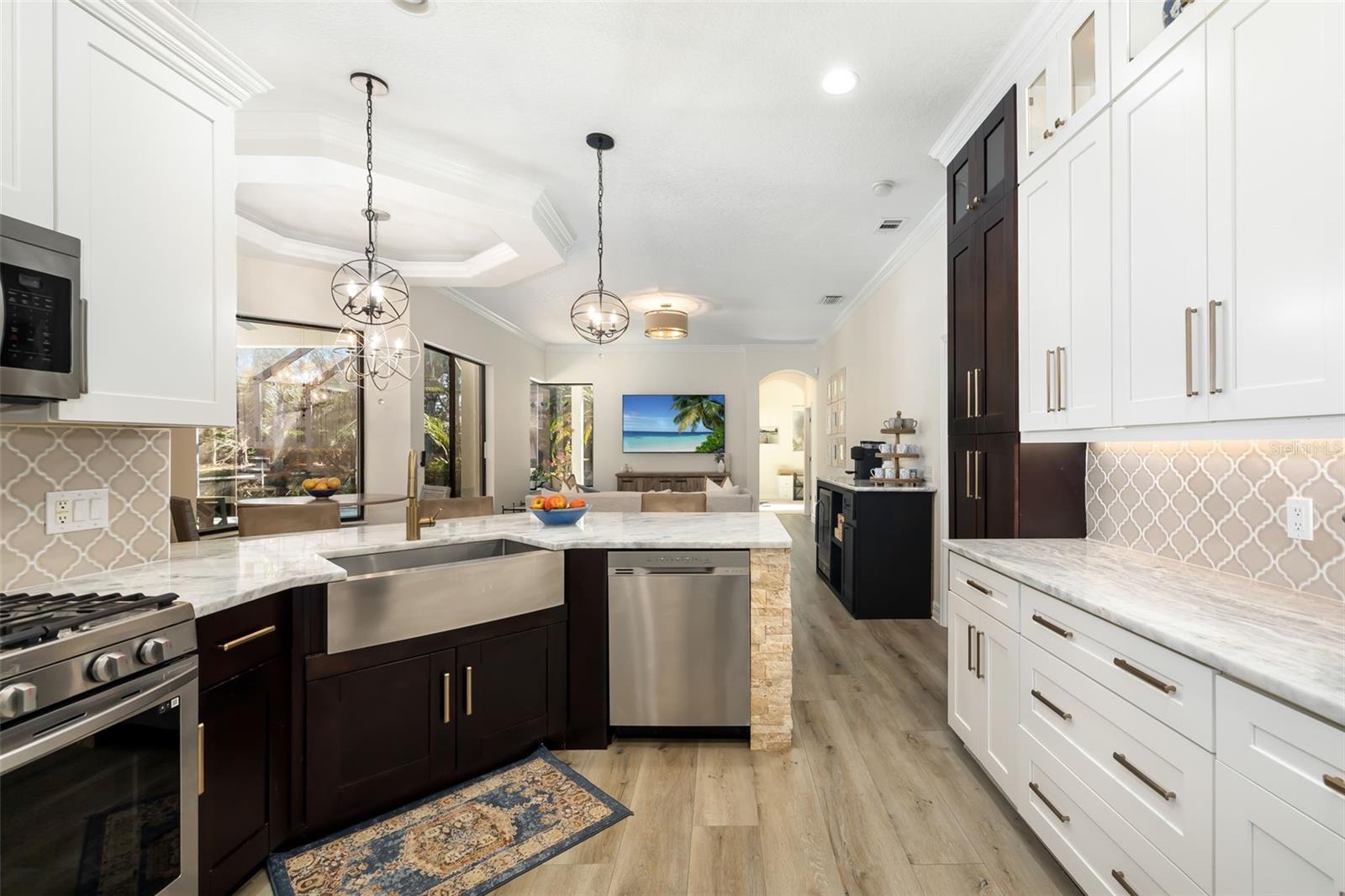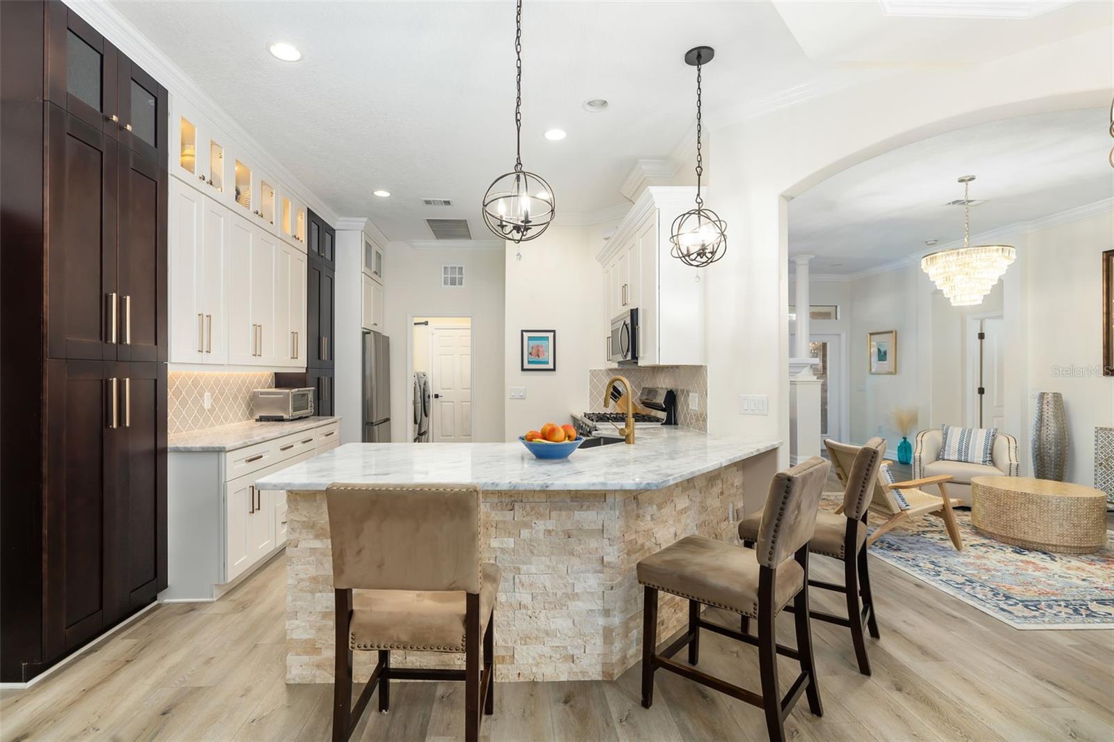 This impeccably maintained Greenbrook home features a side-entry oversized garage, a paver driveway, a charming front porch, and a stacked stone faade. The property also boasts a 2-year-old roof with full-house gutters and a new 6-camera ADT security system with Alert 360. The peaceful rear lanai is home to a heated saltwater pool with a new filter, a freestanding therapy spa, and a Southern rear exposure.Inside, you'll find luxury vinyl plank flooring throughout the living areas, custom light fixtures, an electric wall fireplace in the living room, 5 " baseboards, and an abundance of crown molding and architectural details. The kitchen is a chef's dream with white and cherry cabinetry, granite countertops, 42" upper cabinets with additional stacked glass-front lit cabinets reaching the ceiling, pull-out drawers in the base cabinets, a stainless steel gas stove and appliances, a farmhouse sink, and a built-in wine and coffee bar. The home also includes a whole-house water filter and softener.All four bedrooms feature built-in closet systems, along with a spacious home office. Double-pane bronze windows add energy efficiency, while the garage offers extra storage above the car space and built-ins. The garage door opener comes with a transferable 3-year warranty. The laundry room is fully equipped with ample cabinets and storage space.The exterior showcases genuine curb appeal with upgraded landscaping and lighting.Greenbrook is a fantastic community within walking distance to A-rated McNeal and Nolan Elementary & Middle Schools. The Greenbrook Adventure Park offers ball fields, inline skating, dog parks, walking trails, playgrounds, pickleball/tennis courts, and a Pavilion. The neighborhood has incredibly low HOA fees--less than $10 per month--and is conveniently located within Lakewood Ranch, close to Lakewood Ranch Main Street, Waterside, restaurants, shopping, and just a short drive to Sarasota's crystal-clear beaches, including Siesta Key, Bradenton, and Anna Maria Island.Some furniture may be available for purchase via a separate bill of sale.