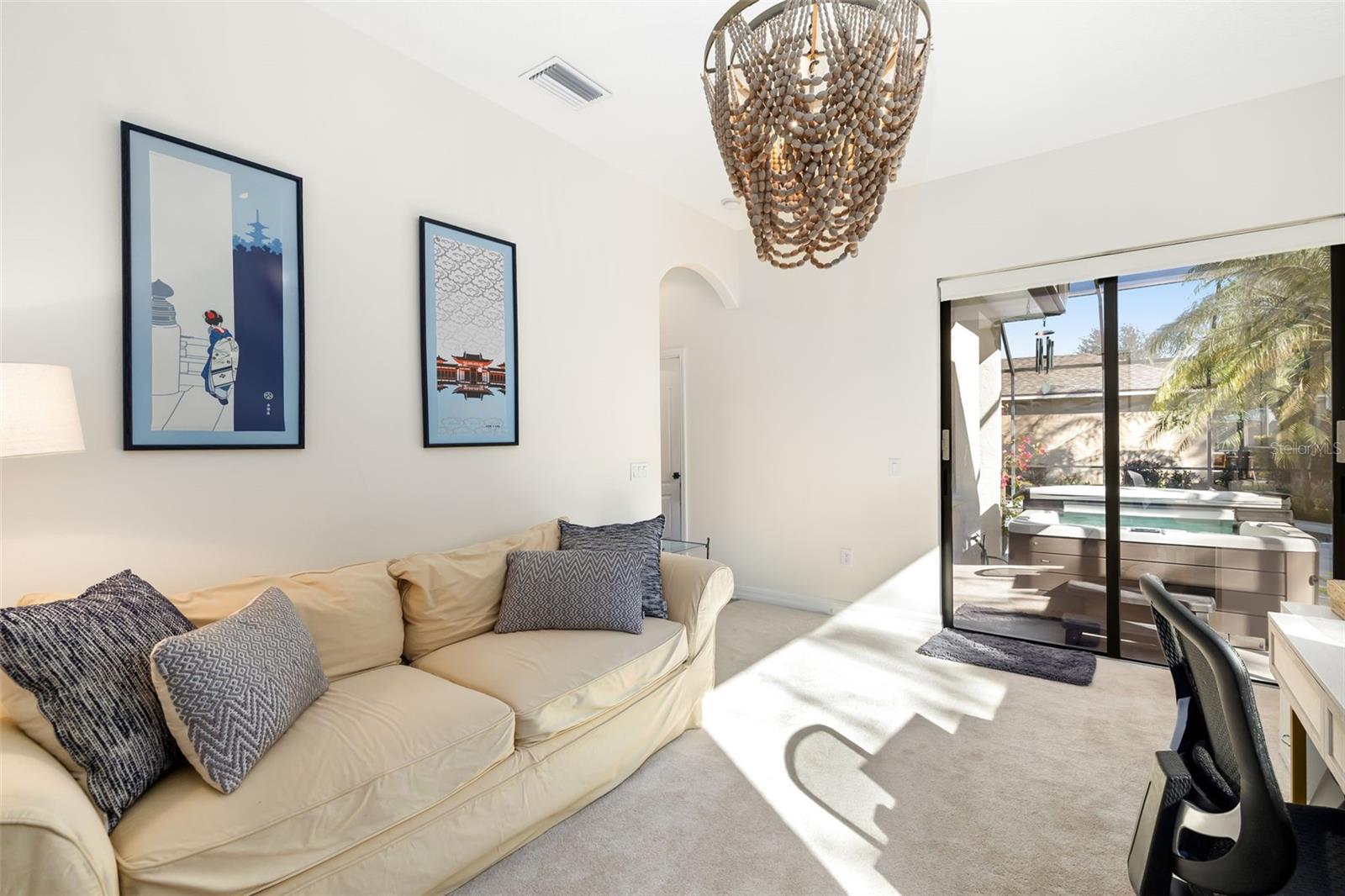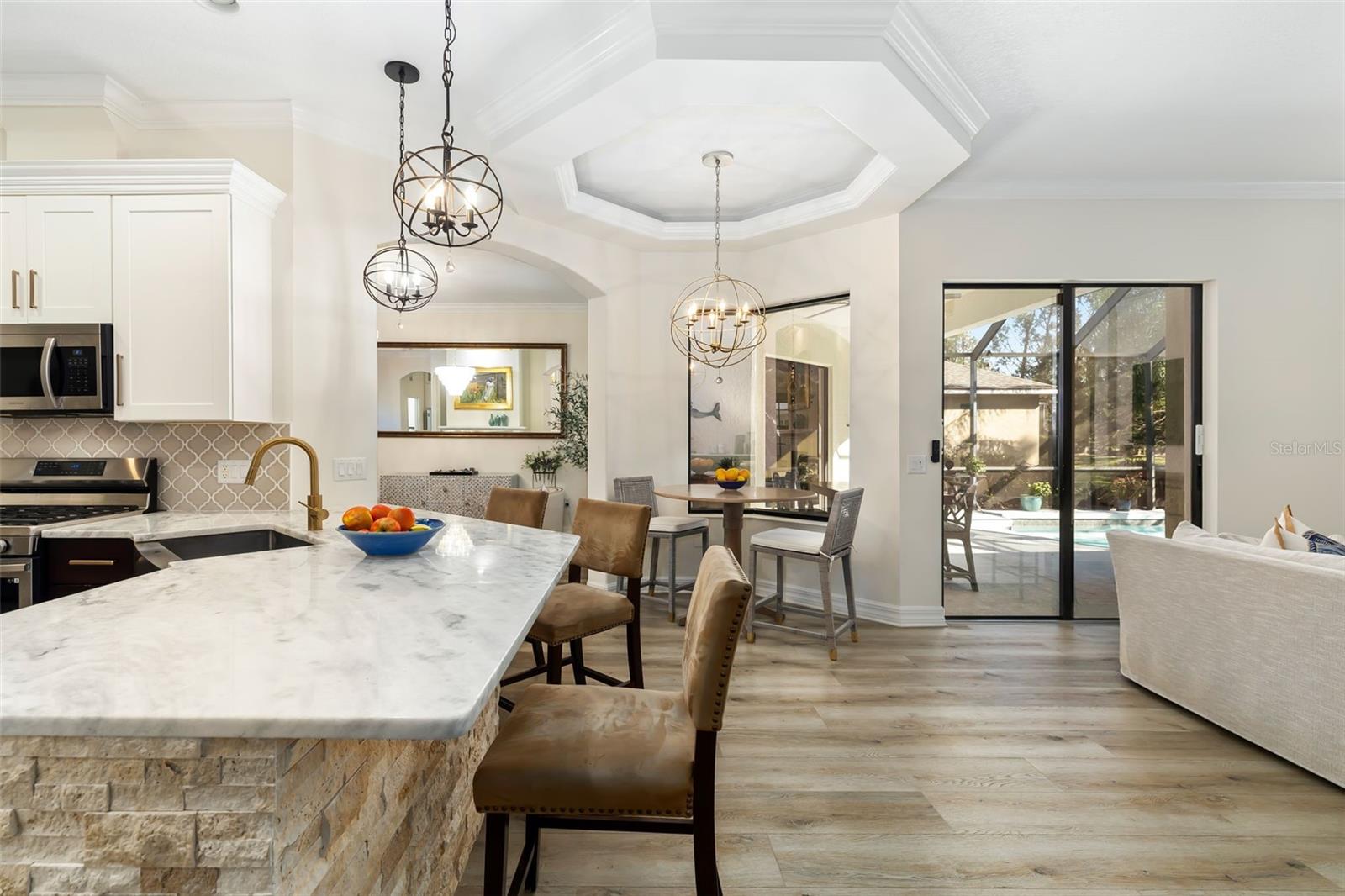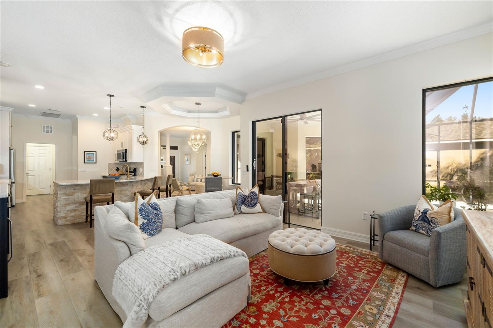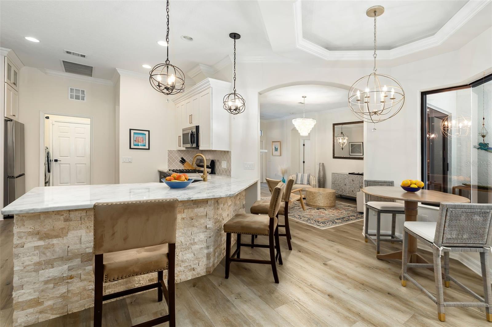 This impeccably maintained Greenbrook home features a side-entry oversized garage, a paver driveway, a charming front porch, and a stacked stone faade. The property also boasts a 2-year-old roof with full-house gutters and a new 6-camera ADT security system with Alert 360. The peaceful rear lanai is home to a heated saltwater pool with a new filter, a freestanding therapy spa, and a Southern rear exposure.Inside, you'll find luxury vinyl plank flooring throughout the living areas, custom light fixtures, an electric wall fireplace in the living room, 5 " baseboards, and an abundance of crown molding and architectural details. The kitchen is a chef's dream with white and cherry cabinetry, granite countertops, 42" upper cabinets with additional stacked glass-front lit cabinets reaching the ceiling, pull-out drawers in the base cabinets, a stainless steel gas stove and appliances, a farmhouse sink, and a built-in wine and coffee bar. The home also includes a whole-house water filter and softener.All four bedrooms feature built-in closet systems, along with a spacious home office. Double-pane bronze windows add energy efficiency, while the garage offers extra storage above the car space and built-ins. The garage door opener comes with a transferable 3-year warranty. The laundry room is fully equipped with ample cabinets and storage space.The exterior showcases genuine curb appeal with upgraded landscaping and lighting.Greenbrook is a fantastic community within walking distance to A-rated McNeal and Nolan Elementary & Middle Schools. The Greenbrook Adventure Park offers ball fields, inline skating, dog parks, walking trails, playgrounds, pickleball/tennis courts, and a Pavilion. The neighborhood has incredibly low HOA fees--less than $10 per month--and is conveniently located within Lakewood Ranch, close to Lakewood Ranch Main Street, Waterside, restaurants, shopping, and just a short drive to Sarasota's crystal-clear beaches, including Siesta Key, Bradenton, and Anna Maria Island.Some furniture may be available for purchase via a separate bill of sale.
