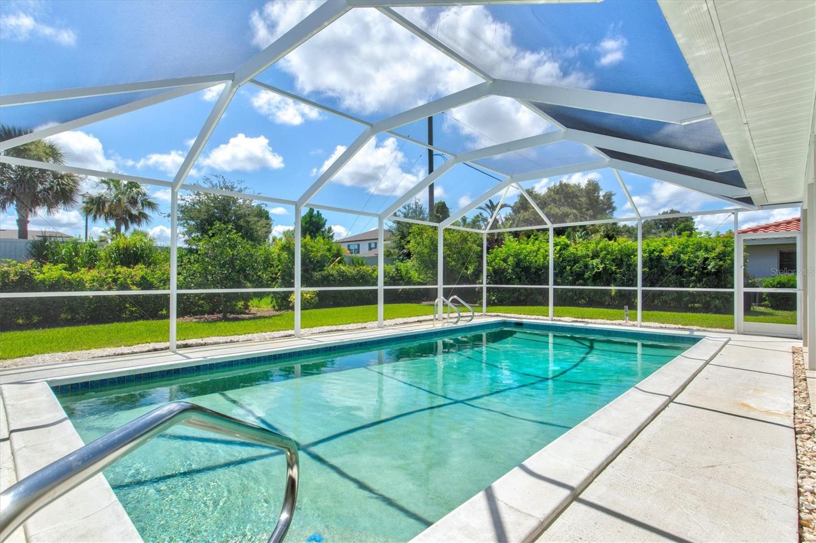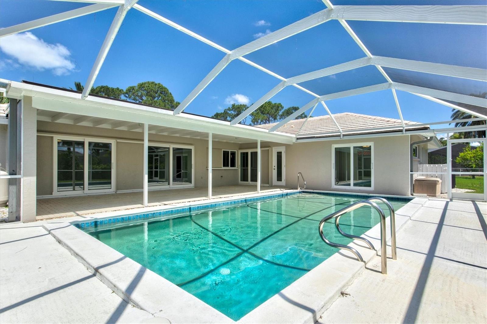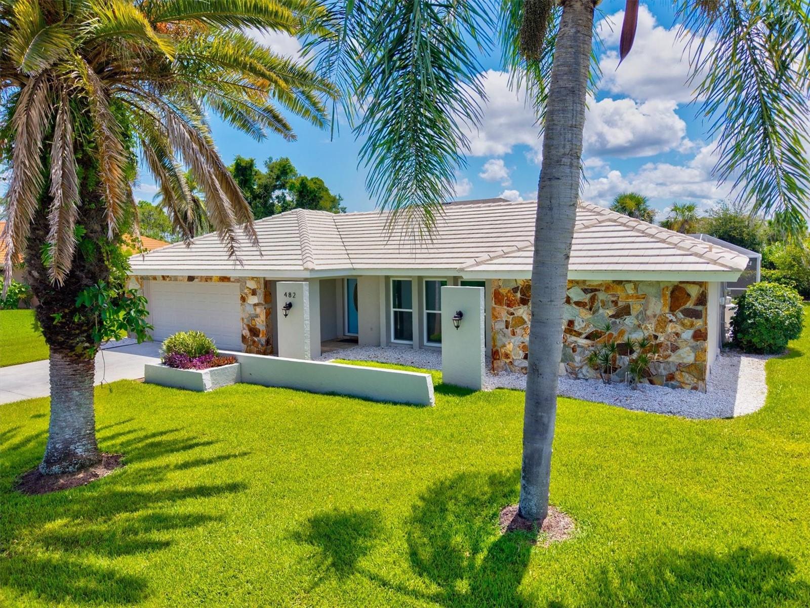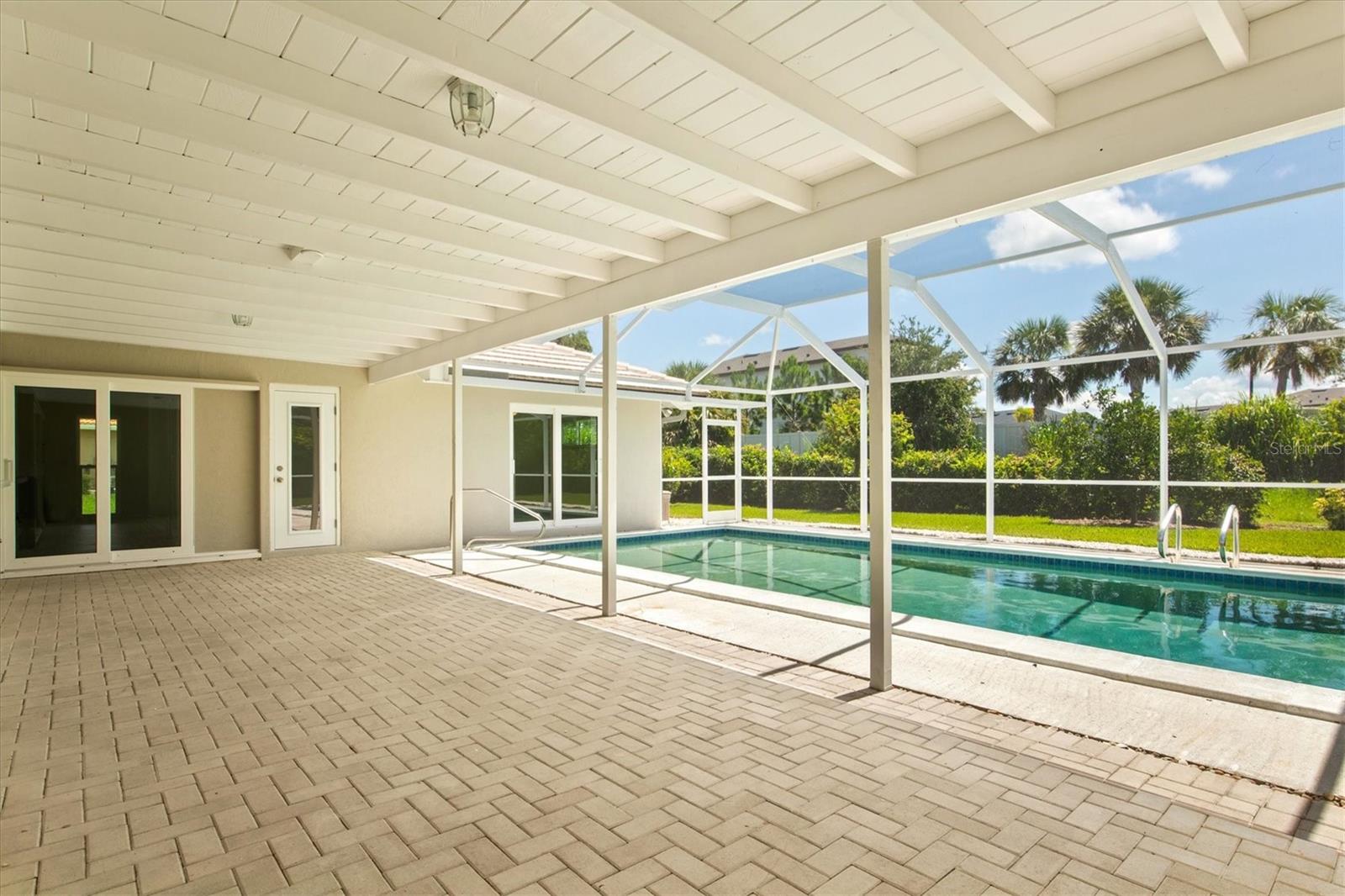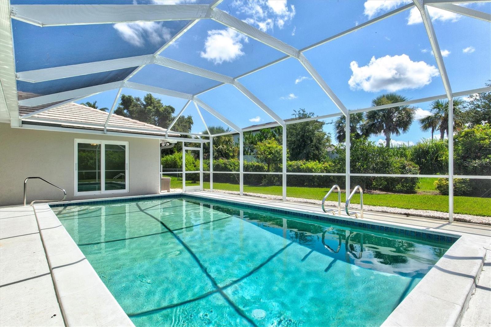 One or more photo(s) has been virtually staged. WOW FACTOR! Welcome to Sorrento East, one of the area's most sought-after neighborhoods! This beautifully updated 3-bedroom, 2-bathroom residence boasts nearly 1,800 sq. ft. of modern comfort, perfectly designed with a desirable split floor plan for ultimate privacy. Step inside to find soaring vaulted ceilings and Brand New 8" x 48" porcelain plank tile floors, creating a sleek, light-filled atmosphere. The spacious open-concept living and dining areas flow effortlessly into a true chef's kitchen--complete with rich wood cabinetry, gas range, sparkling granite countertops and premium stainless steel appliances. Retreat to the private primary suite, complete with an en-suite bath and cedar-lined closets. Both bathrooms shine with Brand New shaker-style vanities, quartz countertops, and elegant plumbing finishes. Peace of mind comes with hurricane-impact windows and sliding glass doors and a Brand New 2025 HVAC system ensuring security and energy efficiency! Step outside and discover your private backyard paradise--a refreshing inground pool, lush mature landscaping, and decorative shell accents set the scene for relaxation. The covered lanai, with its striking tongue-and-groove wood ceiling, makes this the ultimate year-round entertaining space. Best of all, you're just minutes from A-rated schools, fabulous dining, endless shopping, and only 4 miles from the sugar-white sands of Nokomis Beach!