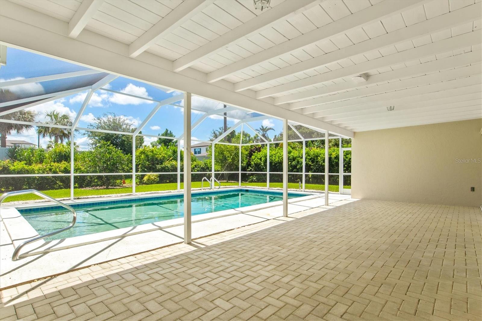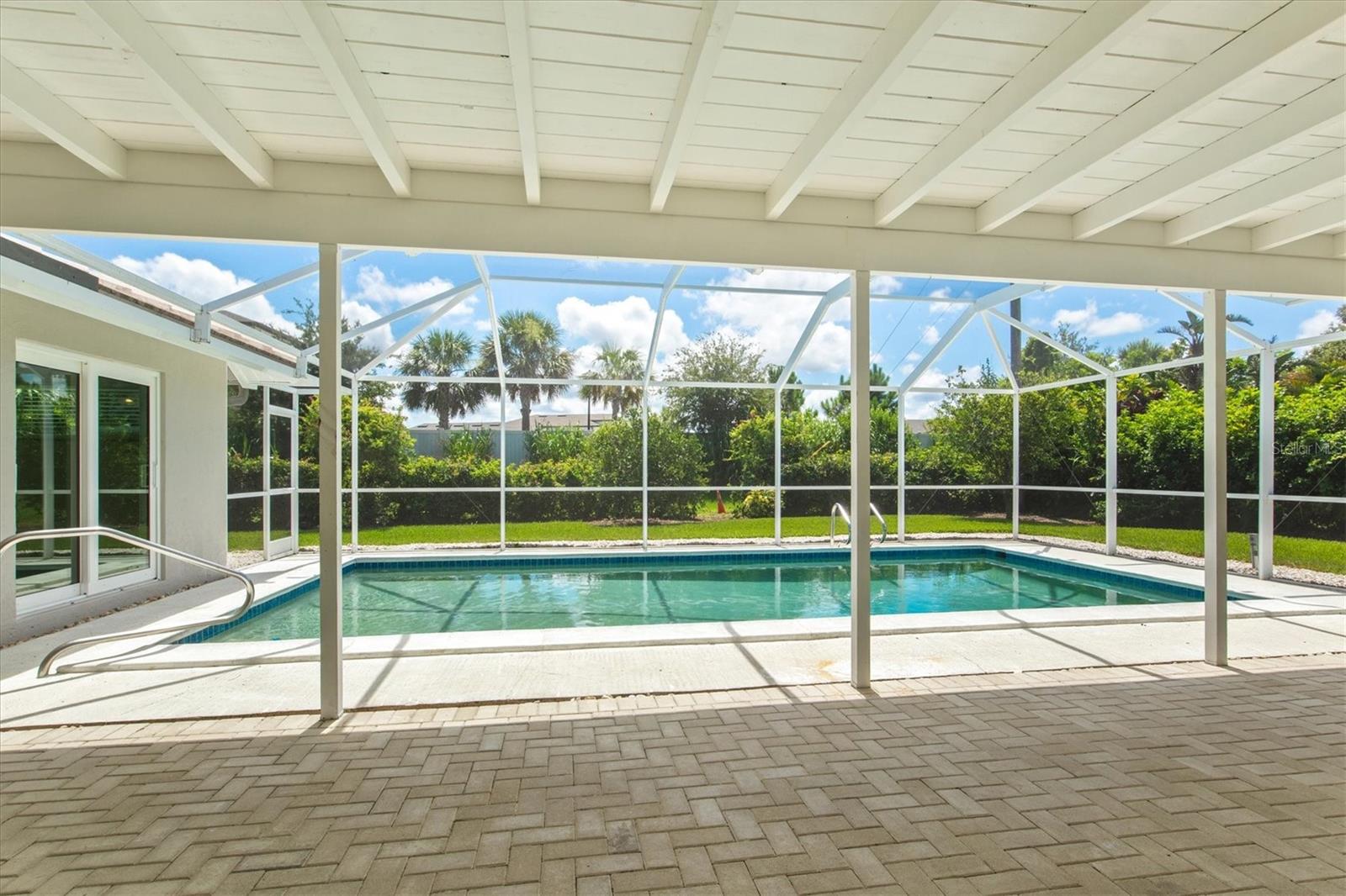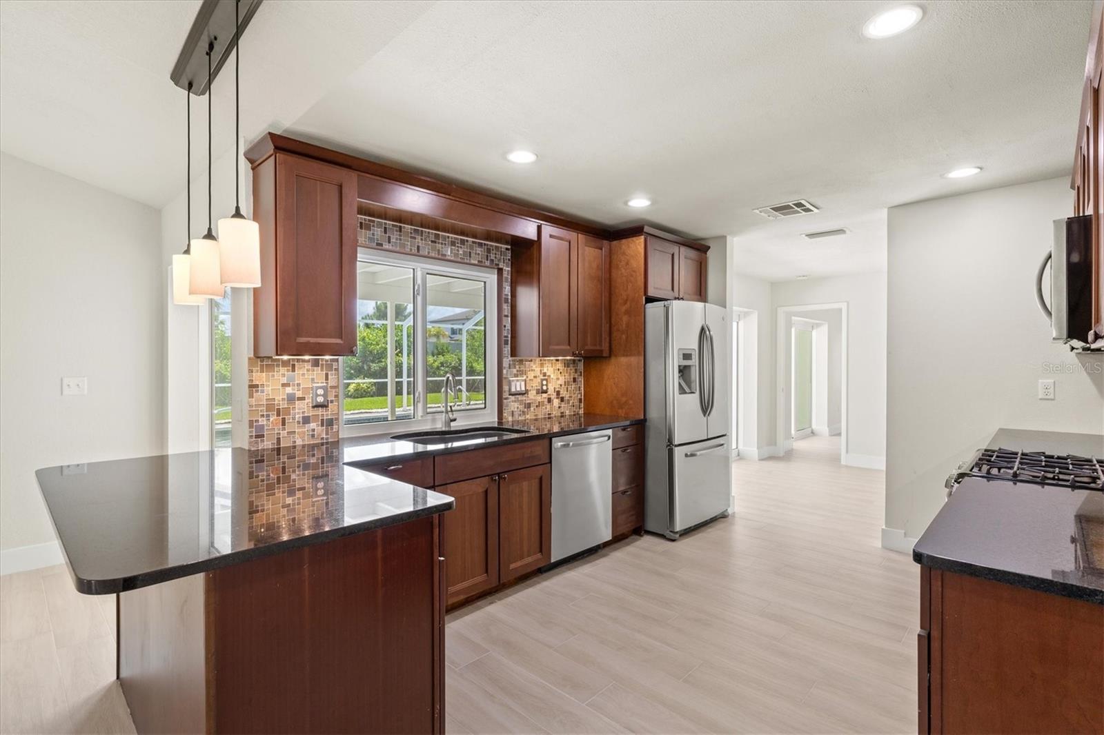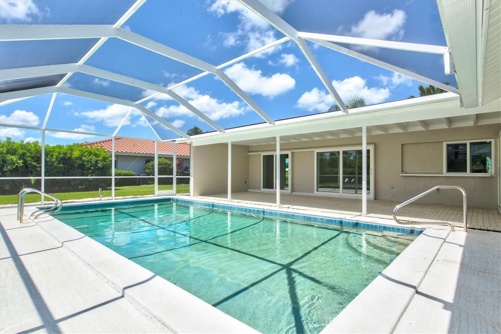 One or more photo(s) has been virtually staged. WOW FACTOR! Welcome to Sorrento East, one of the area's most sought-after neighborhoods! This beautifully updated 3-bedroom, 2-bathroom residence boasts nearly 1,800 sq. ft. of modern comfort, perfectly designed with a desirable split floor plan for ultimate privacy. Step inside to find soaring vaulted ceilings and Brand New 8" x 48" porcelain plank tile floors, creating a sleek, light-filled atmosphere. The spacious open-concept living and dining areas flow effortlessly into a true chef's kitchen--complete with rich wood cabinetry, gas range, sparkling granite countertops and premium stainless steel appliances. Retreat to the private primary suite, complete with an en-suite bath and cedar-lined closets. Both bathrooms shine with Brand New shaker-style vanities, quartz countertops, and elegant plumbing finishes. Peace of mind comes with hurricane-impact windows and sliding glass doors and a Brand New 2025 HVAC system ensuring security and energy efficiency! Step outside and discover your private backyard paradise--a refreshing inground pool, lush mature landscaping, and decorative shell accents set the scene for relaxation. The covered lanai, with its striking tongue-and-groove wood ceiling, makes this the ultimate year-round entertaining space. Best of all, you're just minutes from A-rated schools, fabulous dining, endless shopping, and only 4 miles from the sugar-white sands of Nokomis Beach!