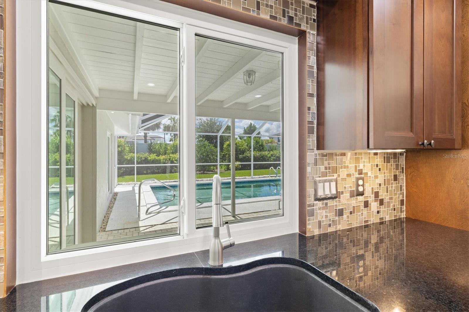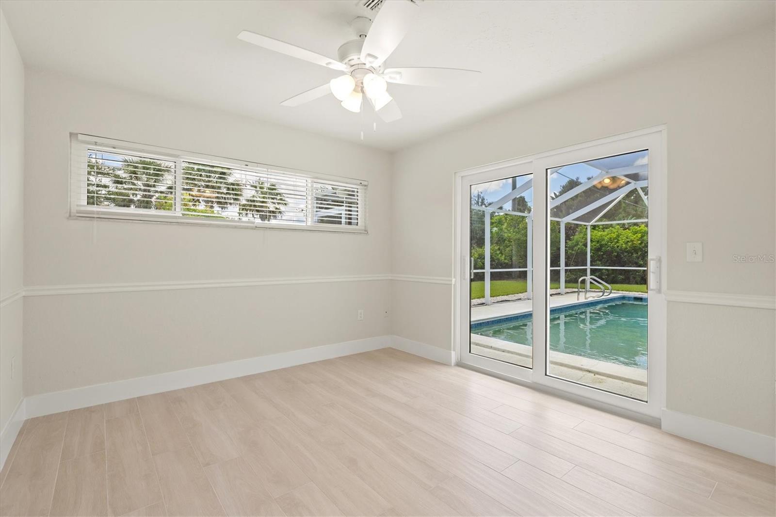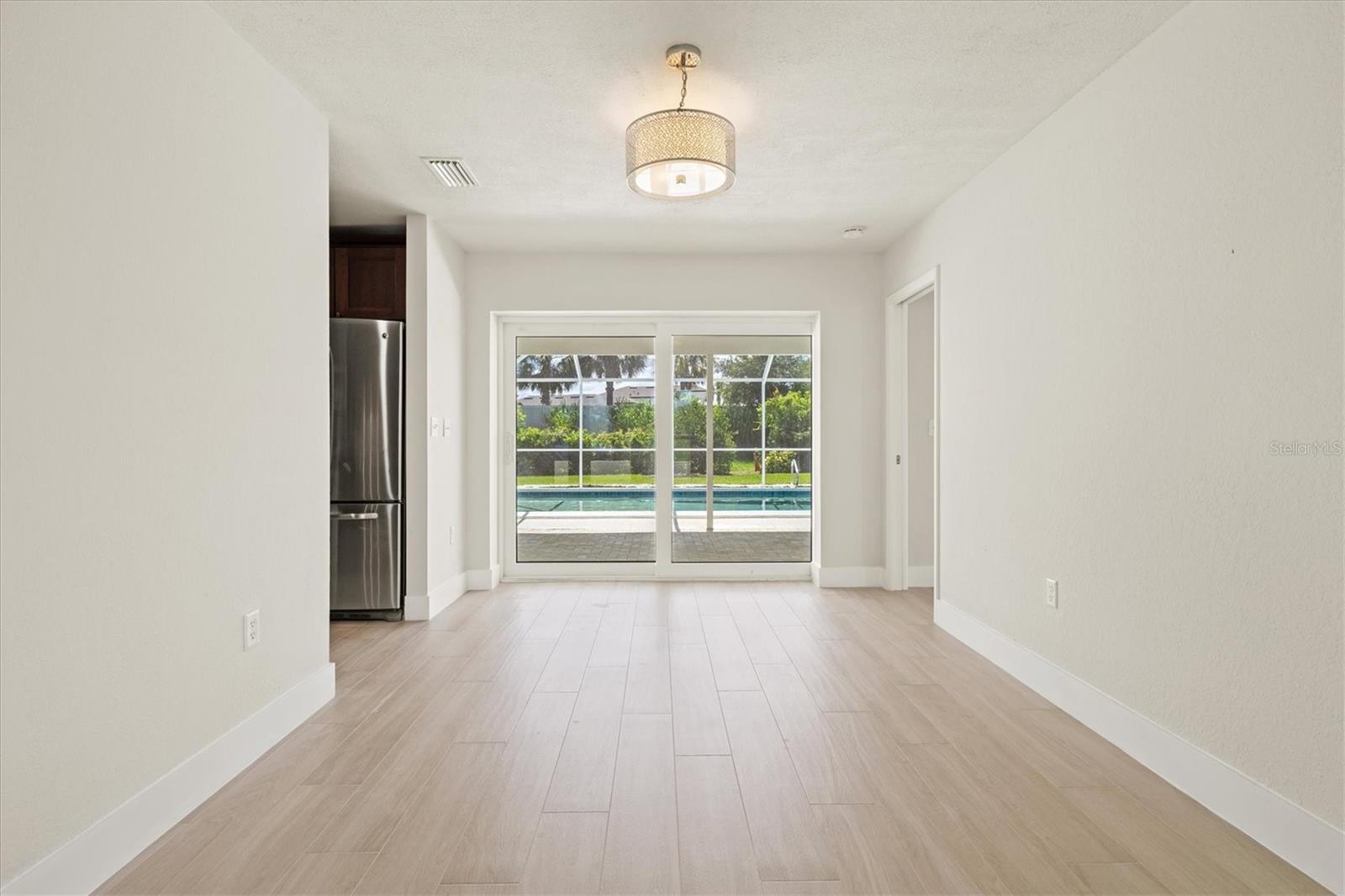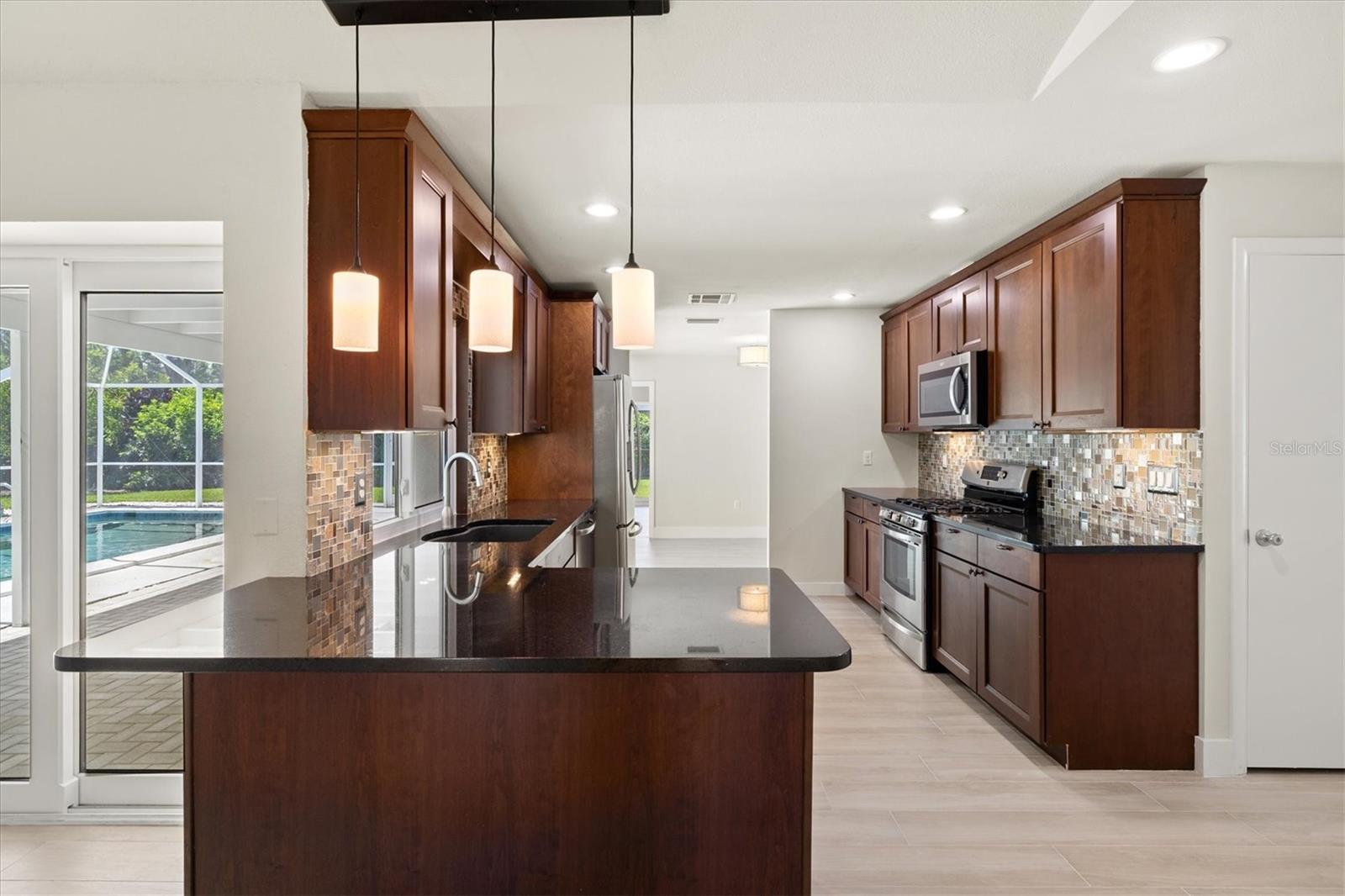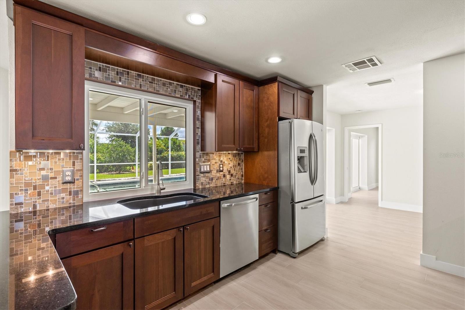 One or more photo(s) has been virtually staged. WOW FACTOR! Welcome to Sorrento East, one of the area's most sought-after neighborhoods! This beautifully updated 3-bedroom, 2-bathroom residence boasts nearly 1,800 sq. ft. of modern comfort, perfectly designed with a desirable split floor plan for ultimate privacy. Step inside to find soaring vaulted ceilings and Brand New 8" x 48" porcelain plank tile floors, creating a sleek, light-filled atmosphere. The spacious open-concept living and dining areas flow effortlessly into a true chef's kitchen--complete with rich wood cabinetry, gas range, sparkling granite countertops and premium stainless steel appliances. Retreat to the private primary suite, complete with an en-suite bath and cedar-lined closets. Both bathrooms shine with Brand New shaker-style vanities, quartz countertops, and elegant plumbing finishes. Peace of mind comes with hurricane-impact windows and sliding glass doors and a Brand New 2025 HVAC system ensuring security and energy efficiency! Step outside and discover your private backyard paradise--a refreshing inground pool, lush mature landscaping, and decorative shell accents set the scene for relaxation. The covered lanai, with its striking tongue-and-groove wood ceiling, makes this the ultimate year-round entertaining space. Best of all, you're just minutes from A-rated schools, fabulous dining, endless shopping, and only 4 miles from the sugar-white sands of Nokomis Beach!