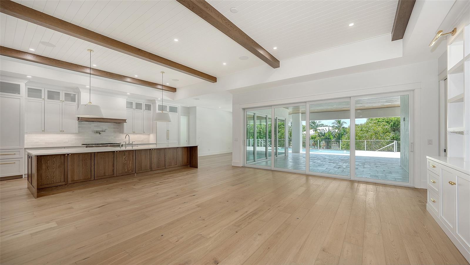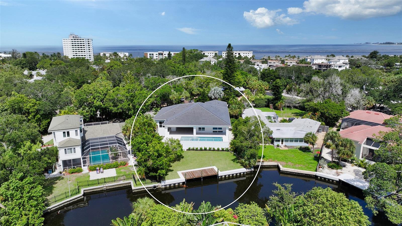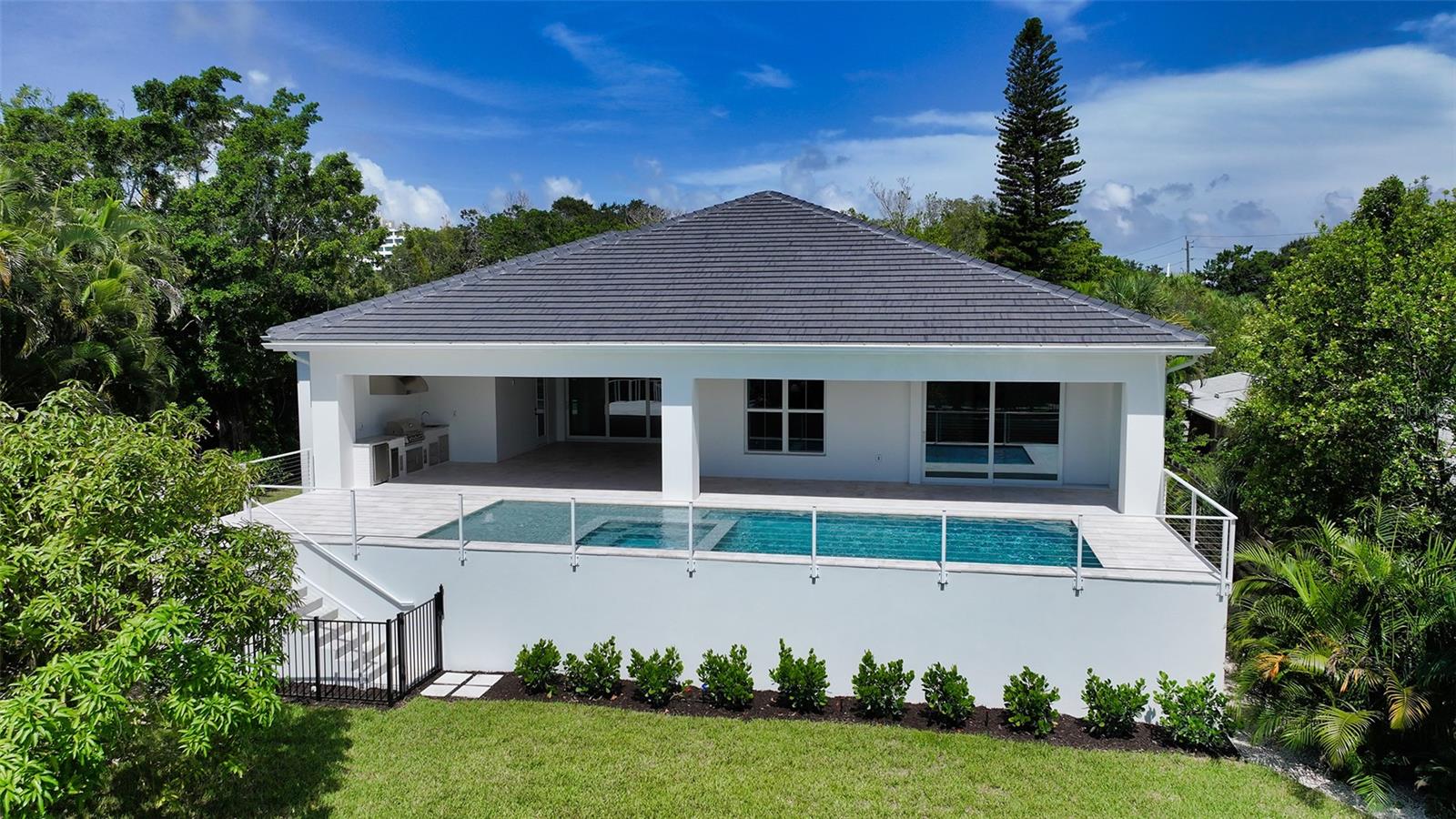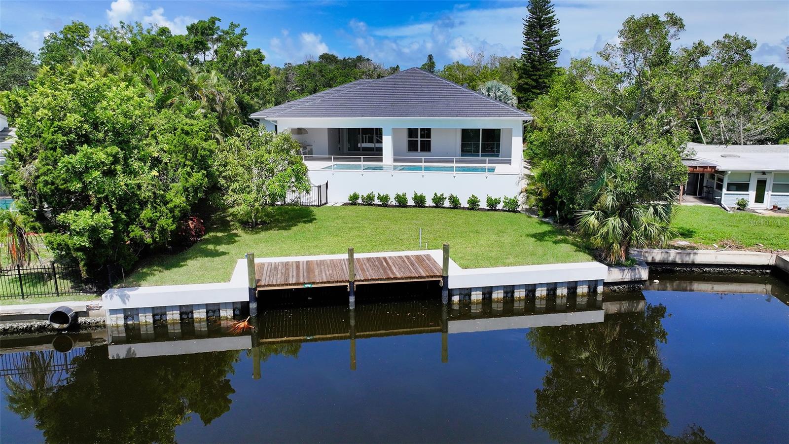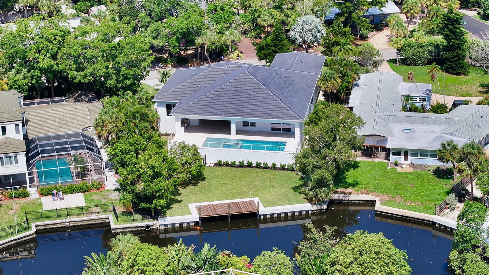 Just Completed! This brand-new, custom waterfront home on Siesta Key is now move-in ready, built above current elevation code with a brand-new raised seawall and dock, offering an unparalleled display of high-end, designer finishes throughout. The home features a spacious, open-floor plan with 5 bedrooms, 4 full bathrooms, and a sizable chef's kitchen complete with custom-designed cabinetry, an oversized cooking island, panel-ready Thermador appliances, and under-cabinet lighting. A custom wine bar with a dual-temperature wine fridge adds to the kitchen's appeal, while the large dining area provides stunning water views. Every inch of this home reflects meticulous attention to detail, including engineered hardwood floors throughout, solid core 8' interior doors, and high-impact windows and doors. The living room and primary bedroom boast 12-foot ceilings with tongue & groove and custom beam accents and expansive glass sliders leading out to the pool patio, providing seamless indoor-outdoor living. The external living space is enhanced by an elevated pool patio, a heated saltwater pool and spa, a shallow sun shelf, and a full outdoor kitchen--all with panoramic canal views, perfect for embracing the Florida lifestyle. The home is equipped with the latest technology and conveniences, including Cat 6 wiring at all TV locations, pre-wiring for security cameras, and a built-in indoor/outdoor speaker system. Located in the heart of Siesta Key, this home is within walking or biking distance to the famous white sand beaches and the vibrant shopping and dining district of "The Village." Don't miss this opportunity to own this exquisite new construction--contact us today for more information!