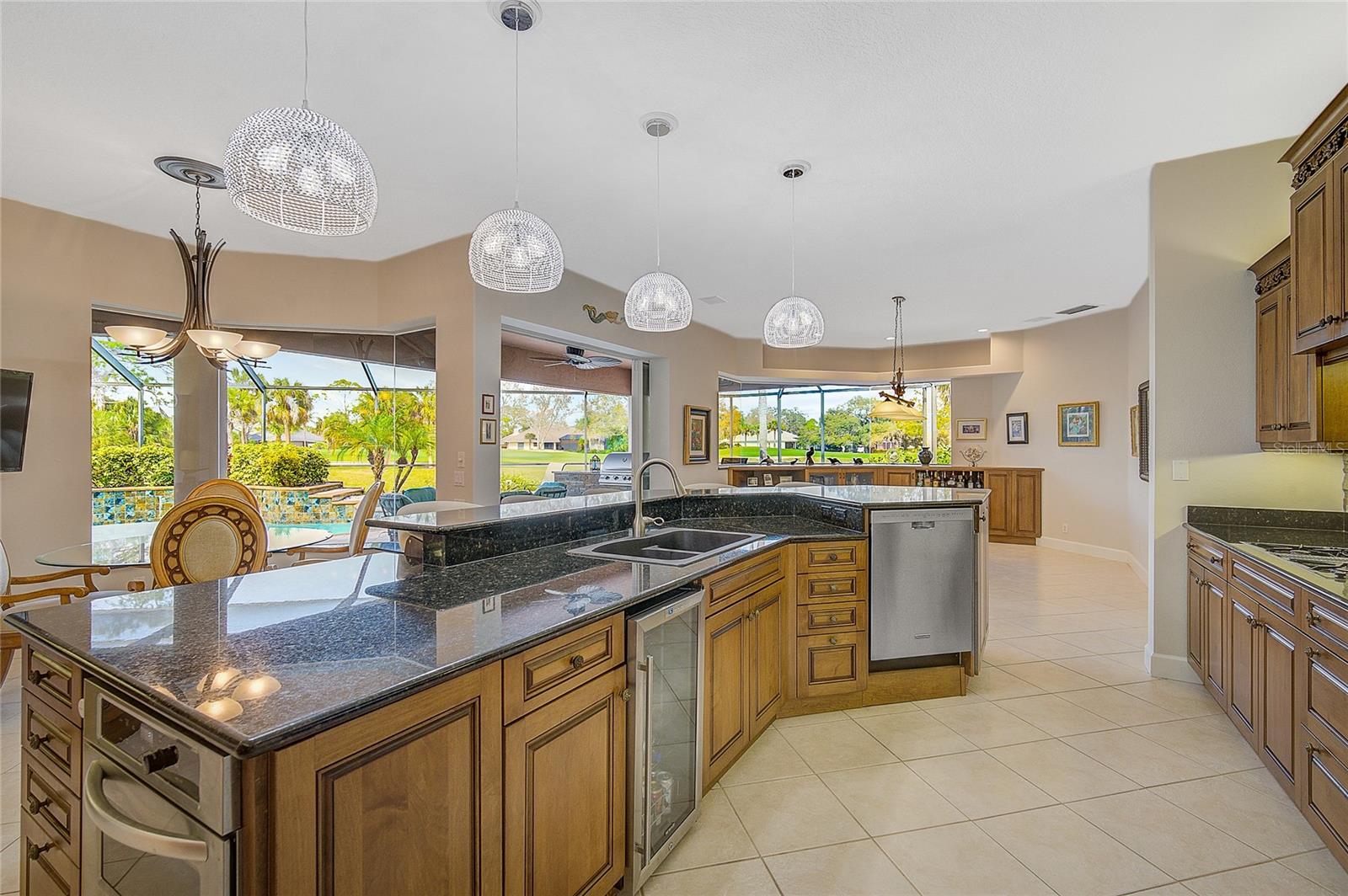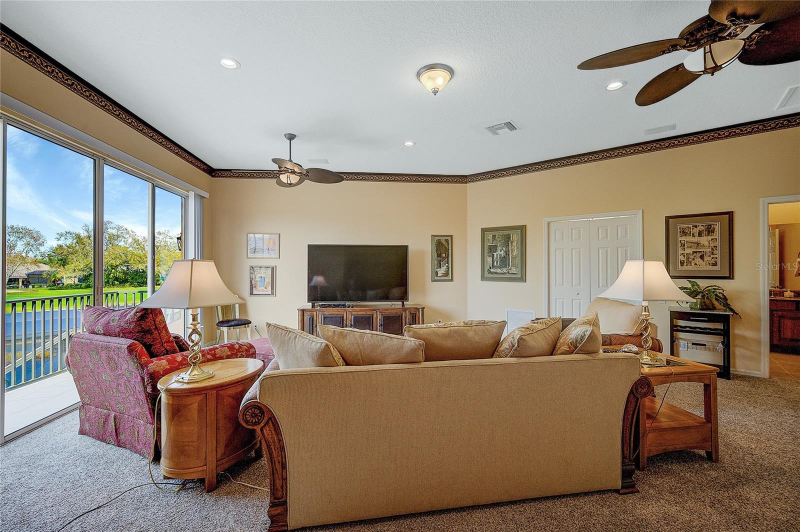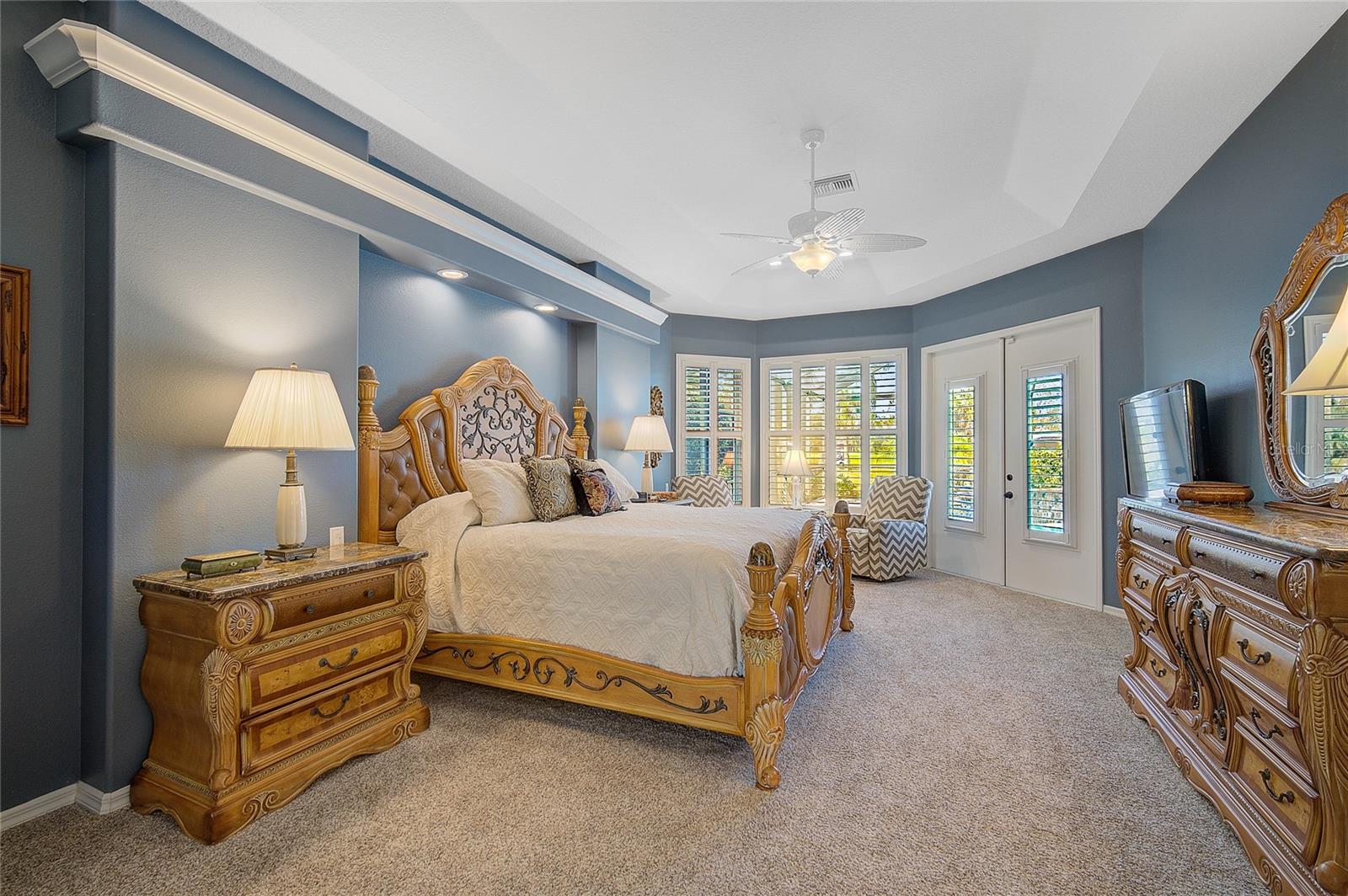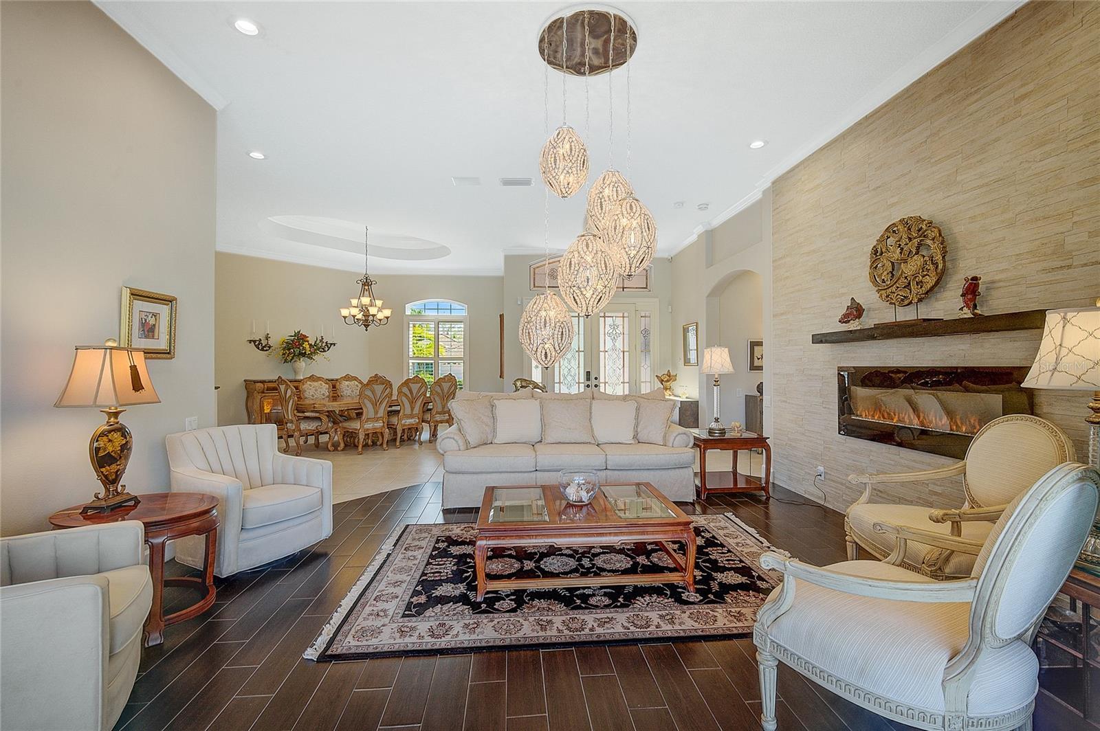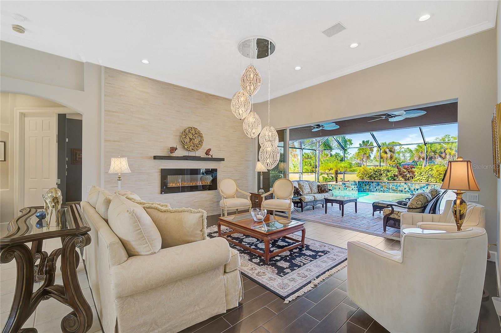 One or more photo(s) has been virtually staged. Luxury, comfort, and breathtaking lakefront views converge in this captivating home located in the highly desirable golf community of Calusa Lakes. This expansive 4,255 sq ft two-story residence with a 3-car garage offers a blend of refined design and everyday comfort. The grand foyer opens to a bright living room featuring a striking stone-accented fireplace and an open formal dining area. Elegant finishes include crown molding, plantation shutters, recessed lighting, and custom wood cabinetry throughout.The gourmet kitchen is designed for the culinary enthusiast with a gas cooktop, built-in ovens, granite countertops, and an oversized island with microwave and beverage cooler. An aquarium window brings in natural light and seamlessly connects to the spacious family room with tray ceilings, perfect for gathering and entertaining.With four bedrooms in total, three are ensuite. One ensuite bedroom is located on the second floor, ideal as a private guest retreat, media room, or potential in-law suite, complete with a private balcony offering scenic views of the tranquil pond, manicured grounds, and the 16th green. The main level features a dedicated office, along with a flexible media room that can also serve as a gym or second workspace.The luxurious primary suite boasts two walk-in closets and a spa-like ensuite bathroom with dual sinks, a jetted tub, marble finishes, and a walk-in shower. Direct access from the primary suite to the lanai enhances the resort-style living experience. The lanai itself is a showstopper, with a newly resurfaced (2021) heated pool, spa, and cascading water features. Entertain effortlessly with a built-in outdoor kitchen and granite bar seating on the expansive brick-paved patio.This home has been recently updated with brand new carpeting in all bedrooms and a freshly painted exterior. The interior features a tasteful, neutral palette and four zoned air-conditioning systems for optimal comfort throughout.With no CDD fee, a low HOA of just $327/quarter, and no mandatory golf membership, this community offers both luxury and value. Conveniently located near world-renowned beaches, boutique shopping, fine dining, cultural venues, I-75, the new Sarasota Memorial Hospital, and international airports, this home is a true lakeside paradise. Be sure to view the 3-D and aerial tours.