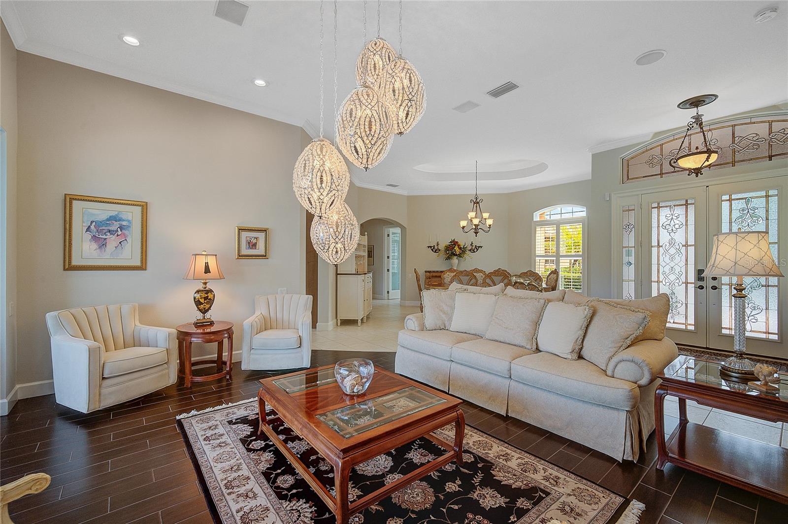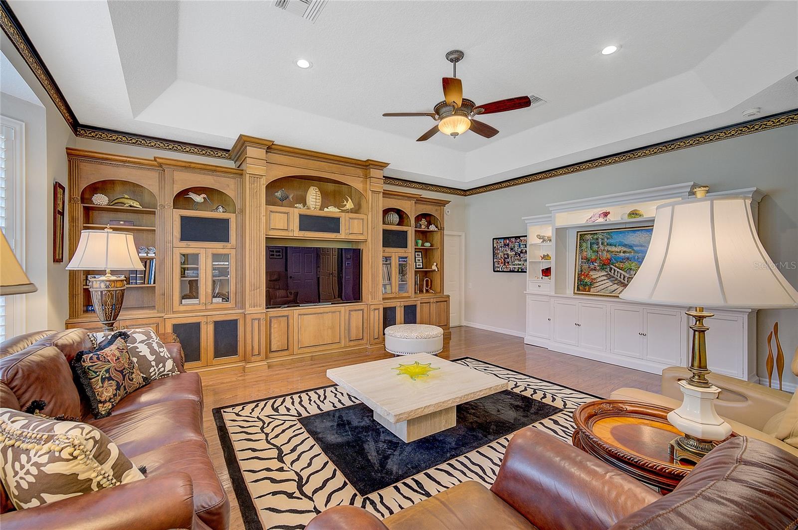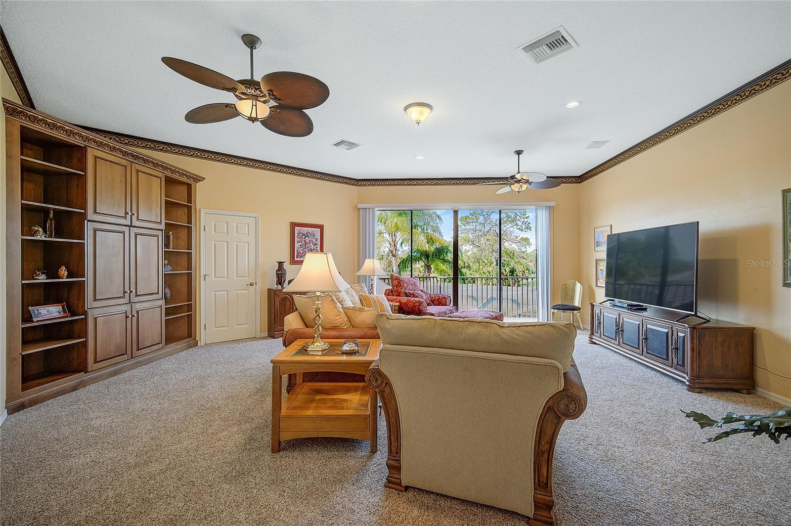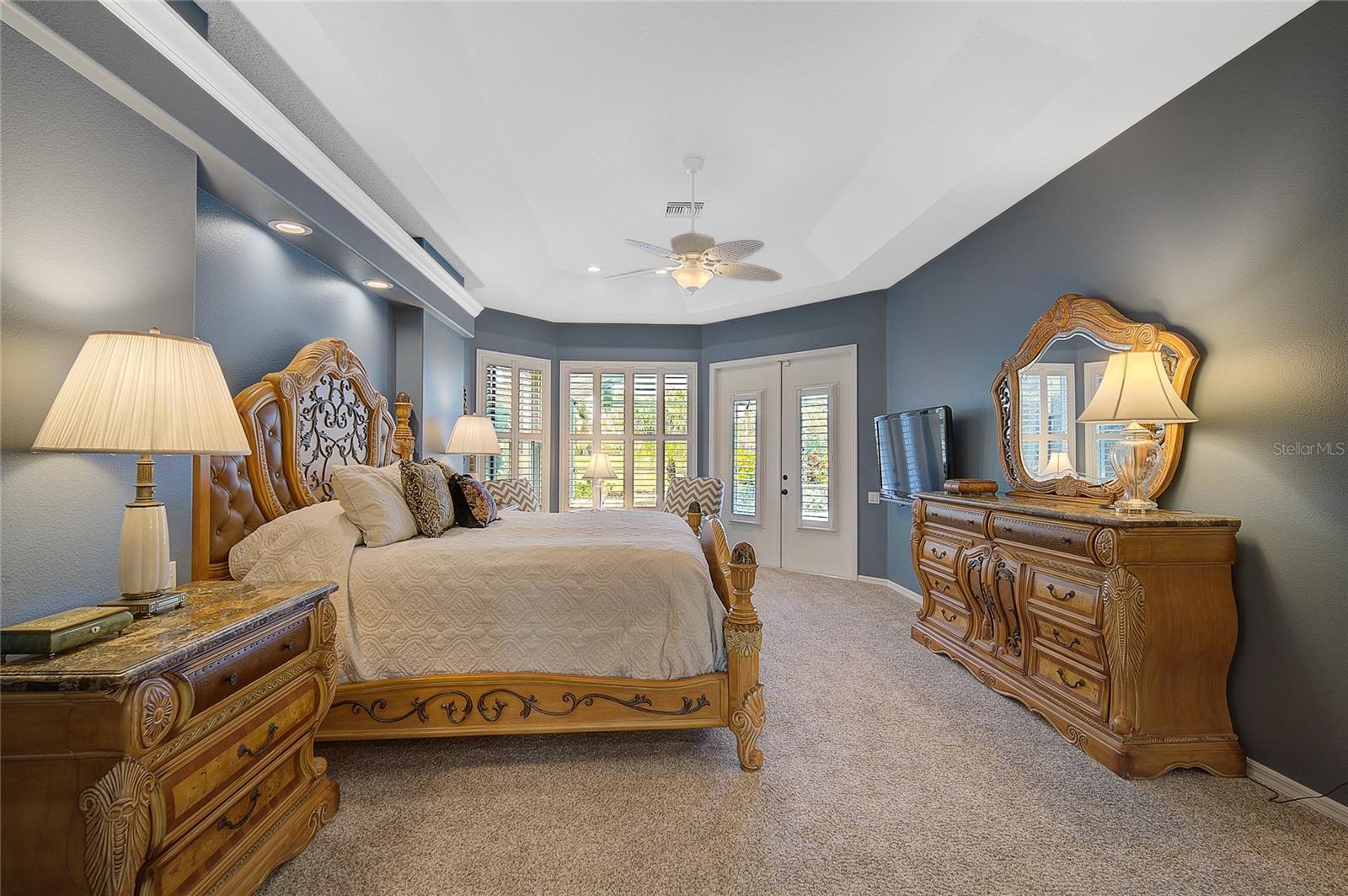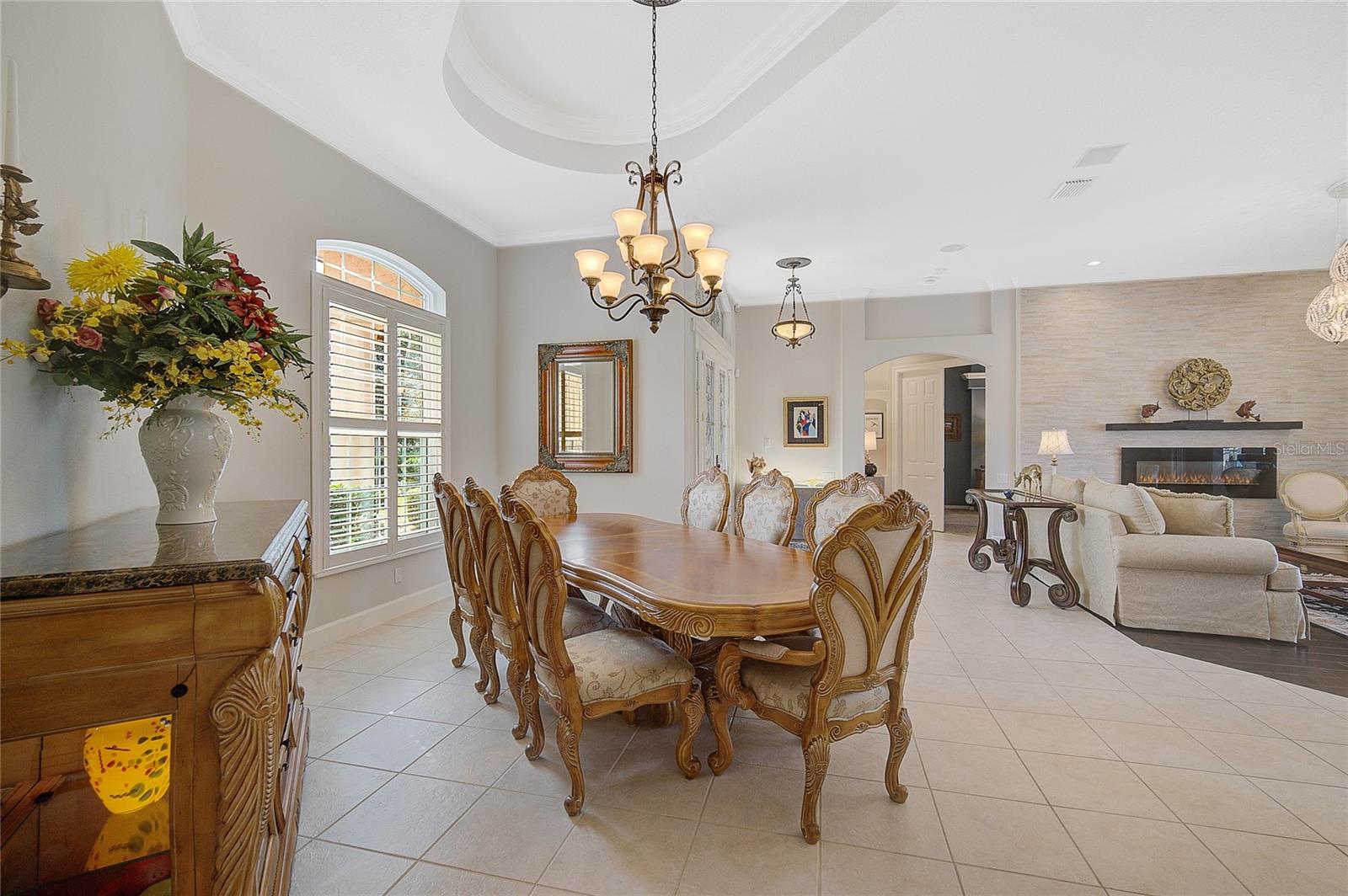 One or more photo(s) has been virtually staged. Luxury, comfort, and breathtaking lakefront views converge in this captivating home located in the highly desirable golf community of Calusa Lakes. This expansive 4,255 sq ft two-story residence with a 3-car garage offers a blend of refined design and everyday comfort. The grand foyer opens to a bright living room featuring a striking stone-accented fireplace and an open formal dining area. Elegant finishes include crown molding, plantation shutters, recessed lighting, and custom wood cabinetry throughout.The gourmet kitchen is designed for the culinary enthusiast with a gas cooktop, built-in ovens, granite countertops, and an oversized island with microwave and beverage cooler. An aquarium window brings in natural light and seamlessly connects to the spacious family room with tray ceilings, perfect for gathering and entertaining.With four bedrooms in total, three are ensuite. One ensuite bedroom is located on the second floor, ideal as a private guest retreat, media room, or potential in-law suite, complete with a private balcony offering scenic views of the tranquil pond, manicured grounds, and the 16th green. The main level features a dedicated office, along with a flexible media room that can also serve as a gym or second workspace.The luxurious primary suite boasts two walk-in closets and a spa-like ensuite bathroom with dual sinks, a jetted tub, marble finishes, and a walk-in shower. Direct access from the primary suite to the lanai enhances the resort-style living experience. The lanai itself is a showstopper, with a newly resurfaced (2021) heated pool, spa, and cascading water features. Entertain effortlessly with a built-in outdoor kitchen and granite bar seating on the expansive brick-paved patio.This home has been recently updated with brand new carpeting in all bedrooms and a freshly painted exterior. The interior features a tasteful, neutral palette and four zoned air-conditioning systems for optimal comfort throughout.With no CDD fee, a low HOA of just $327/quarter, and no mandatory golf membership, this community offers both luxury and value. Conveniently located near world-renowned beaches, boutique shopping, fine dining, cultural venues, I-75, the new Sarasota Memorial Hospital, and international airports, this home is a true lakeside paradise. Be sure to view the 3-D and aerial tours.