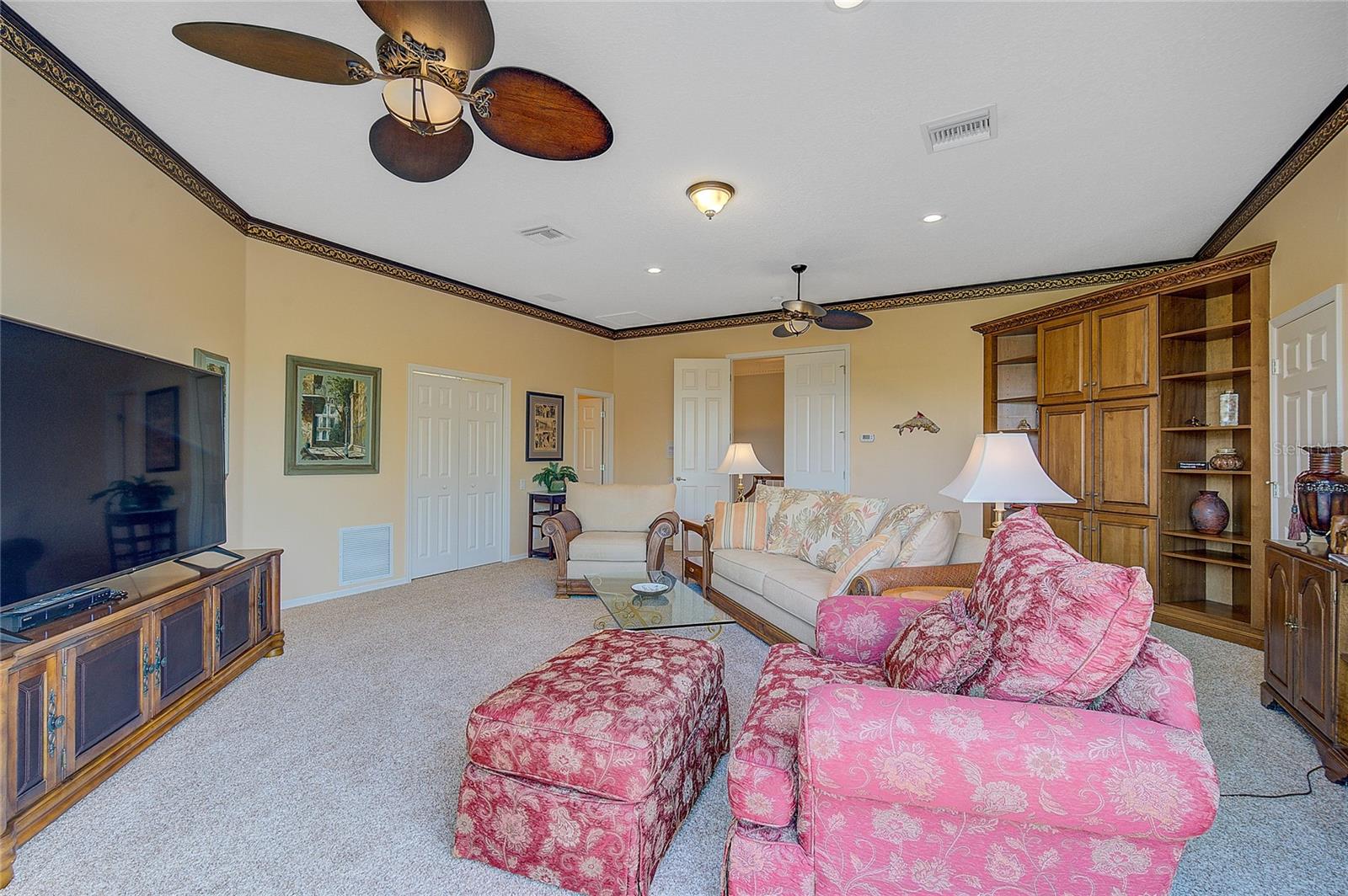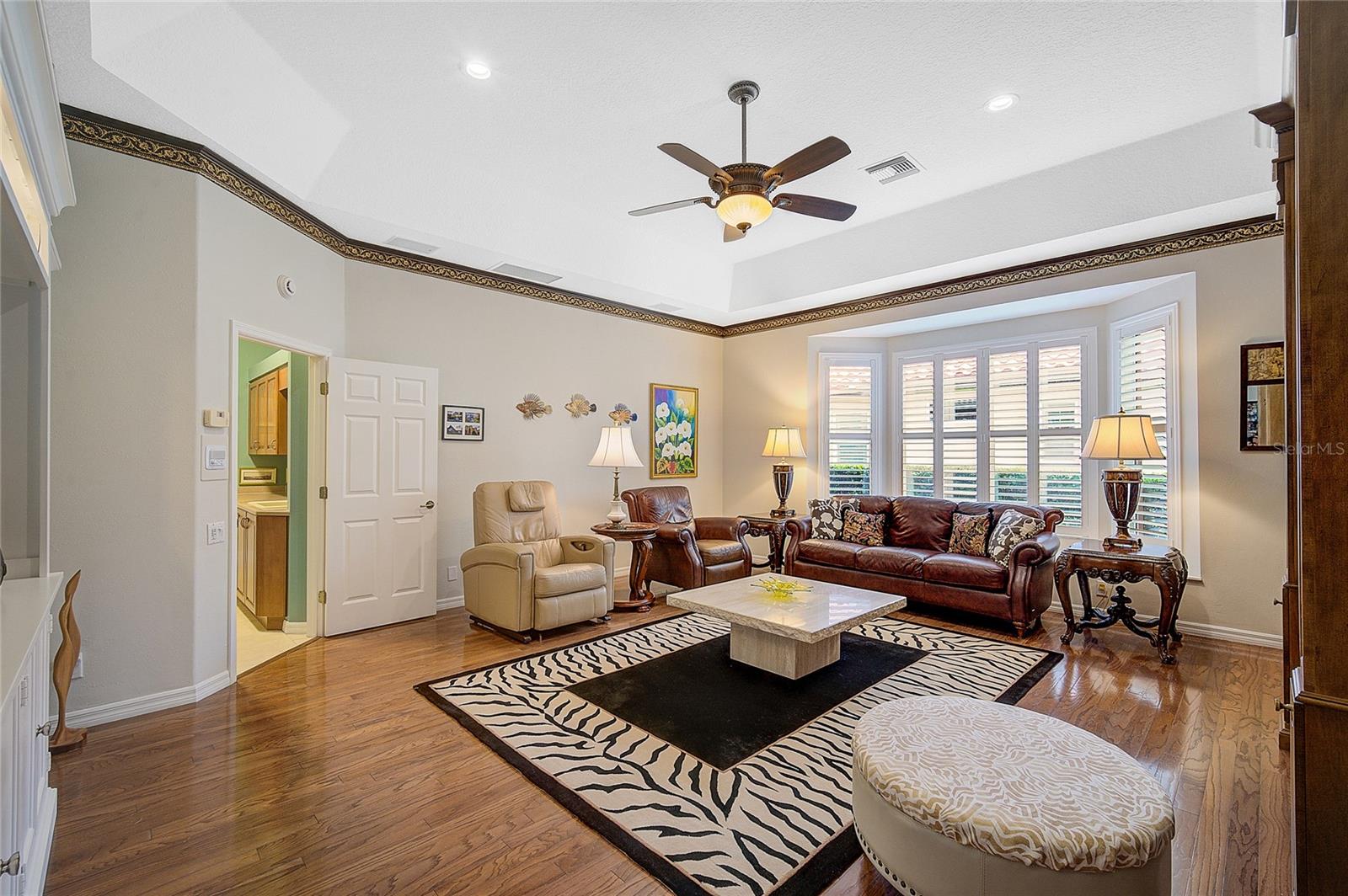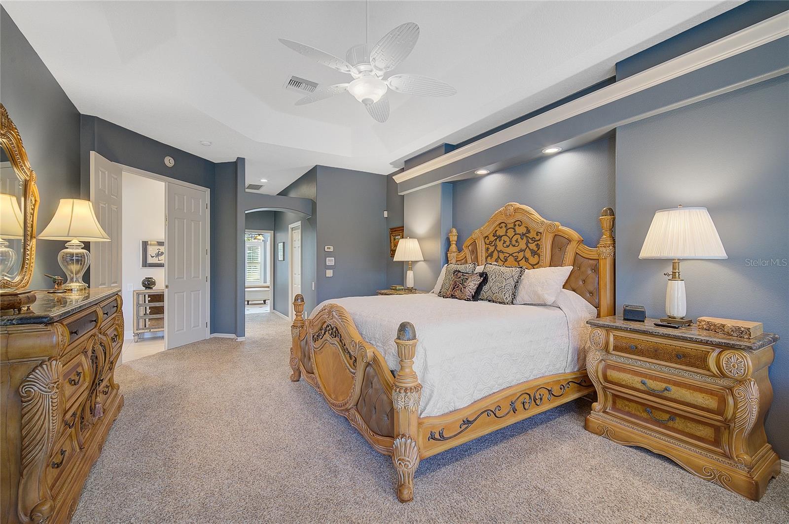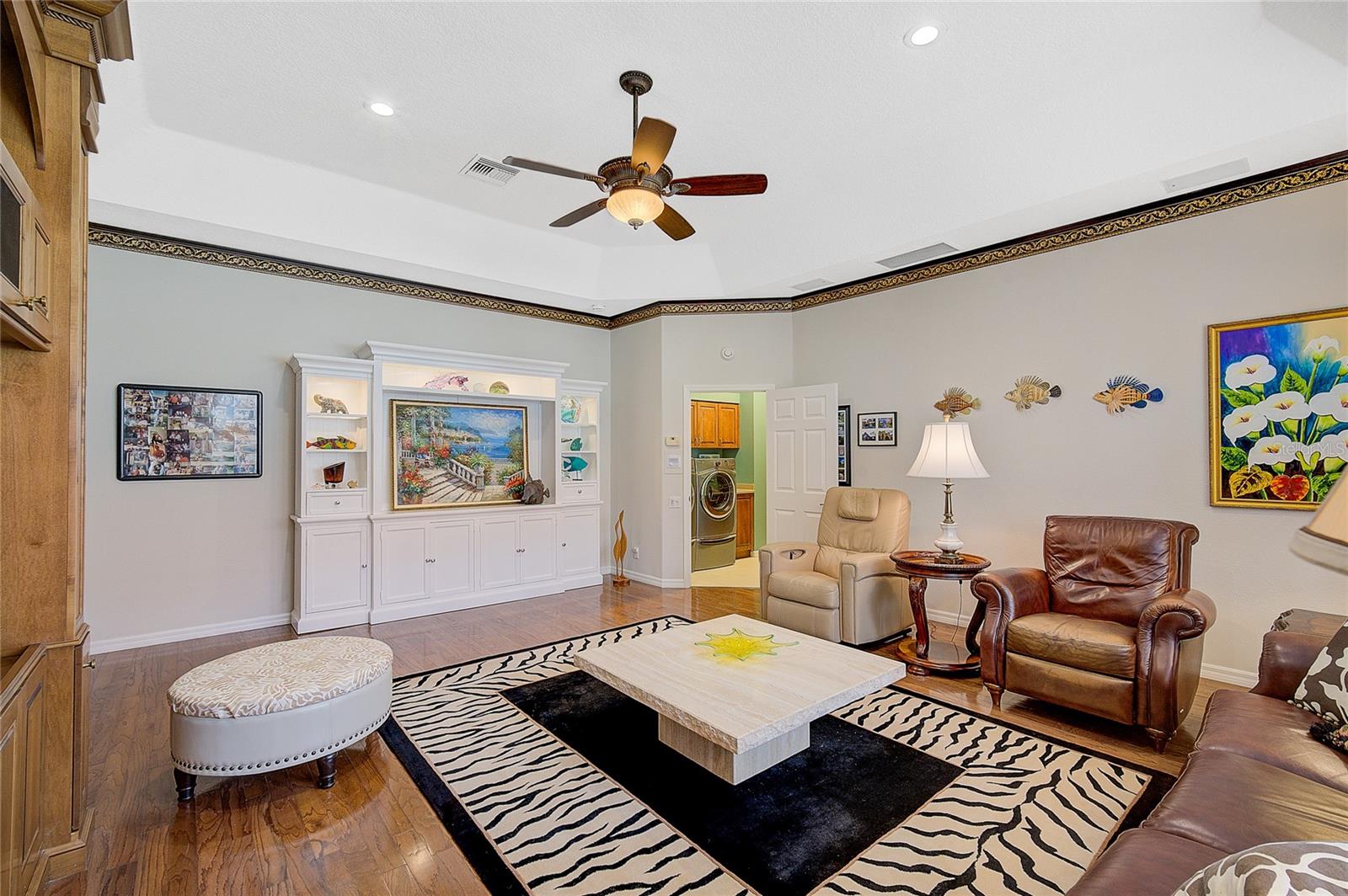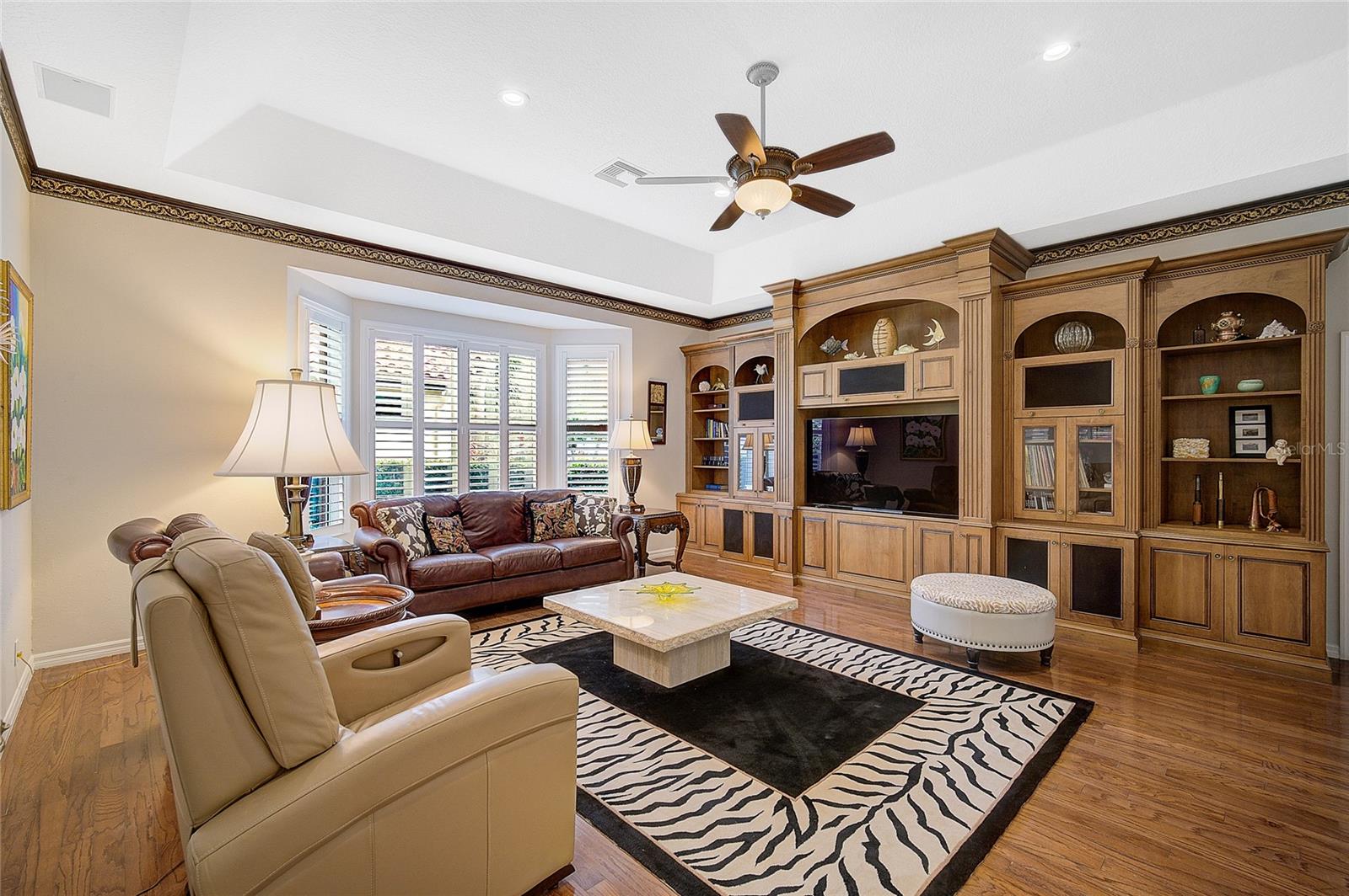 One or more photo(s) has been virtually staged. Luxury, comfort, and breathtaking lakefront views converge in this captivating home located in the highly desirable golf community of Calusa Lakes. This expansive 4,255 sq ft two-story residence with a 3-car garage offers a blend of refined design and everyday comfort. The grand foyer opens to a bright living room featuring a striking stone-accented fireplace and an open formal dining area. Elegant finishes include crown molding, plantation shutters, recessed lighting, and custom wood cabinetry throughout.The gourmet kitchen is designed for the culinary enthusiast with a gas cooktop, built-in ovens, granite countertops, and an oversized island with microwave and beverage cooler. An aquarium window brings in natural light and seamlessly connects to the spacious family room with tray ceilings, perfect for gathering and entertaining.With four bedrooms in total, three are ensuite. One ensuite bedroom is located on the second floor, ideal as a private guest retreat, media room, or potential in-law suite, complete with a private balcony offering scenic views of the tranquil pond, manicured grounds, and the 16th green. The main level features a dedicated office, along with a flexible media room that can also serve as a gym or second workspace.The luxurious primary suite boasts two walk-in closets and a spa-like ensuite bathroom with dual sinks, a jetted tub, marble finishes, and a walk-in shower. Direct access from the primary suite to the lanai enhances the resort-style living experience. The lanai itself is a showstopper, with a newly resurfaced (2021) heated pool, spa, and cascading water features. Entertain effortlessly with a built-in outdoor kitchen and granite bar seating on the expansive brick-paved patio.This home has been recently updated with brand new carpeting in all bedrooms and a freshly painted exterior. The interior features a tasteful, neutral palette and four zoned air-conditioning systems for optimal comfort throughout.With no CDD fee, a low HOA of just $327/quarter, and no mandatory golf membership, this community offers both luxury and value. Conveniently located near world-renowned beaches, boutique shopping, fine dining, cultural venues, I-75, the new Sarasota Memorial Hospital, and international airports, this home is a true lakeside paradise. Be sure to view the 3-D and aerial tours.