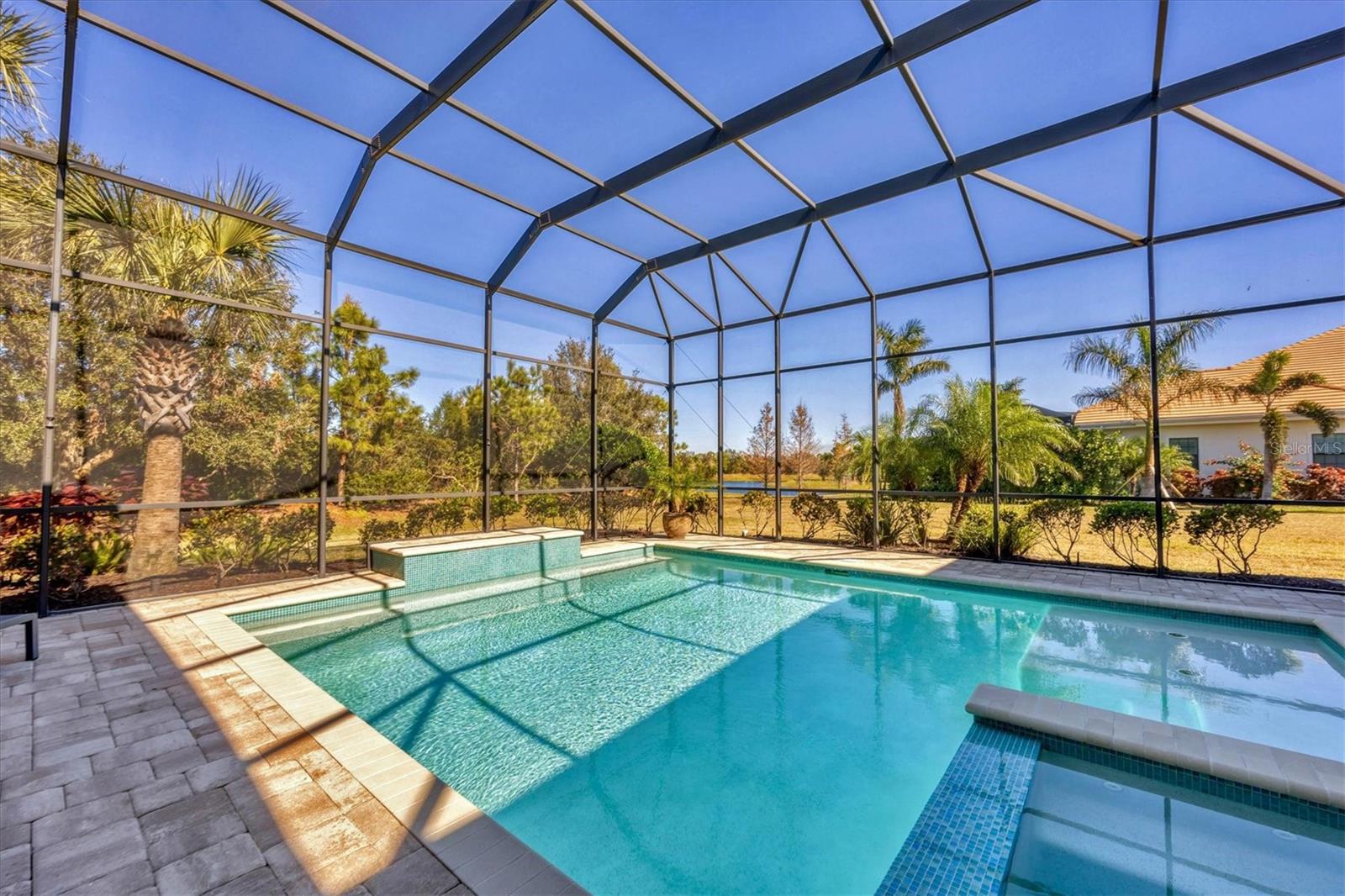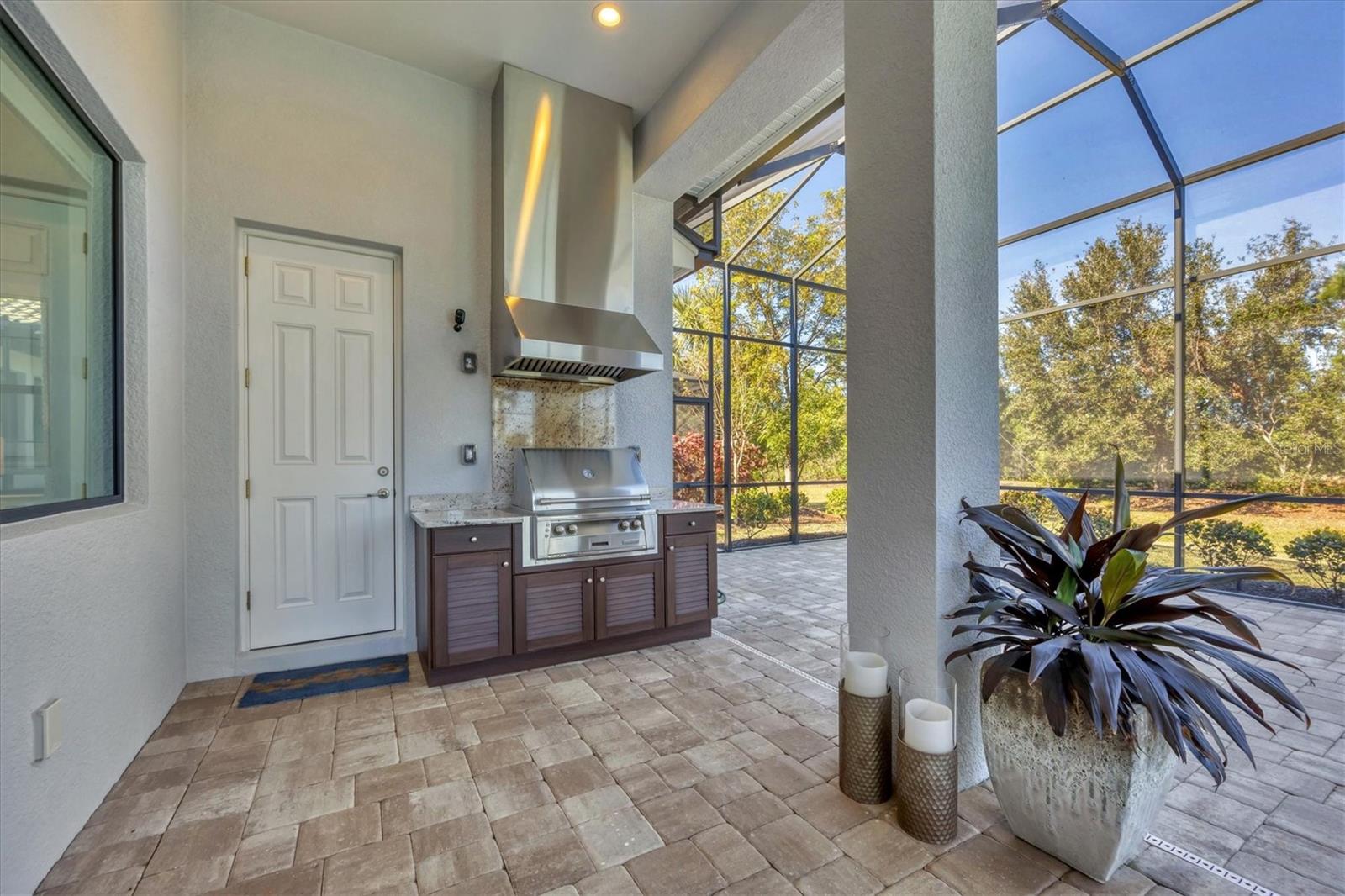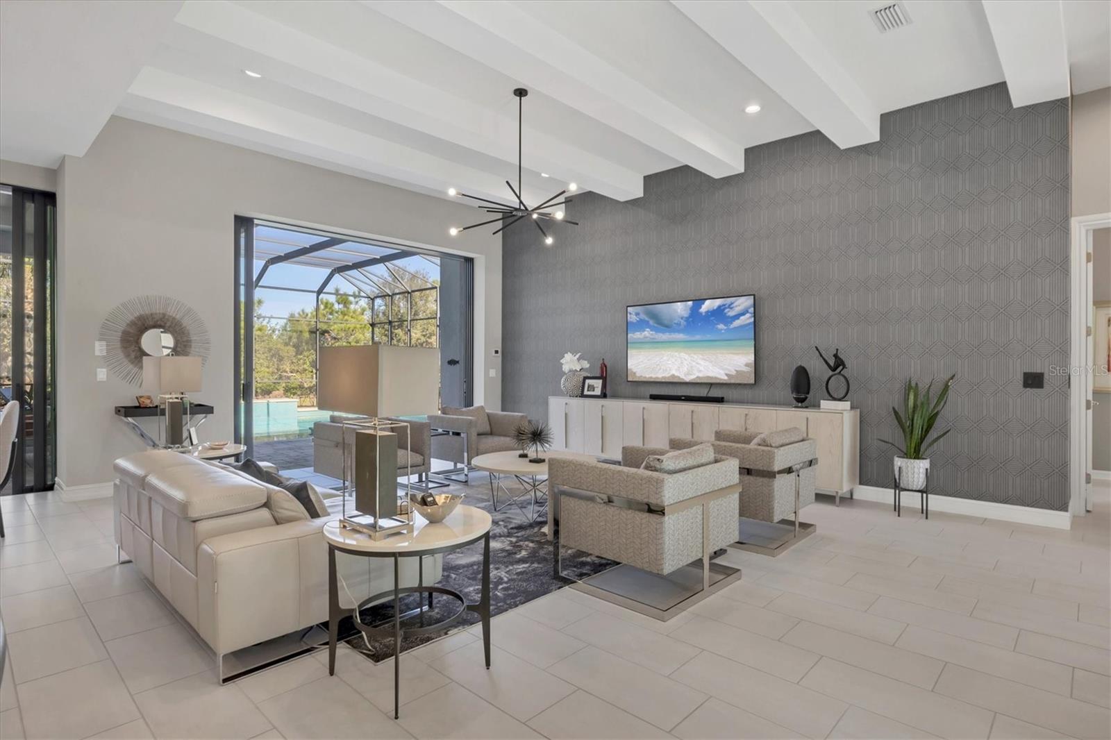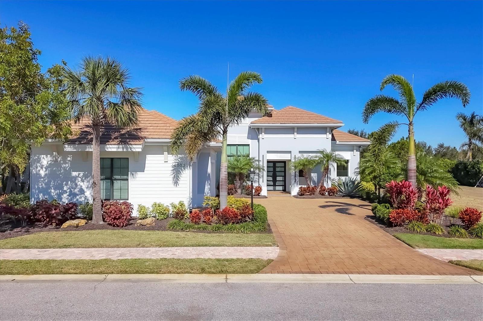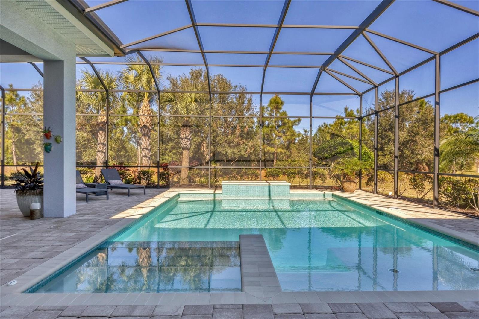 Welcome to the Captiva II model by Stock Signature Homes, a stunning low-maintenance Country Club East residence that combines contemporary design with exceptional functionality. This beautiful home sits on a private, wooded lot with an easement next door, ensuring privacy and breathtaking views of a serene pond. The home's striking modern black iron and frosted glass doors invite you into a spacious foyer, where a mirrored wall treatment adds an elegant touch. Inside, you'll find an open floor plan that allows natural light to flood the space. The expansive great room features 12-foot ceilings, pocketing sliders that open to the lanai, and modern white ceiling beams that enhance the room's airy feel. Off the great room is the kitchen, offering a large island with additional storage, quartz countertops, and high-end appliances such as a Fulgor Milano refrigerator and dishwasher, GE Profile five-burner cooktop, oven and convection microwave. Adjacent to the kitchen is an eat-in dining area, perfect for casual meals and family gatherings. A spacious walk-in butler's pantry with modern cabinetry makes it easy to store culinary essentials. This home offers four bedrooms and three-and-a-half baths. The primary suite is a true sanctuary, featuring a 12-foot tray ceiling, two walk-in closets with built-in organizers, and French doors that open to the lanai, bringing the beauty of the outdoors in. The en-suite bath includes dual sinks, a freestanding tub and a walk-in shower. The home's design also includes a flexible fourth bedroom, perfect as a secondary primary suite or bonus room, complete with an en-suite bath and pool access. Bedrooms two and three share a Jack-and-Jill bath with dual sinks and a tub/shower combo, the perfect space for family or guests. The den with a 15-foot ceilings and wooden feature wall is the perfect space for a quiet retreat. A convenient powder room with stylish lighting and a lit vanity is also available for guests. The large laundry room provides abundant storage and counterspace, while the oversized three-car garage features durable epoxy floors. The home also boasts impact windows and doors for added security and energy efficiency. The large lanai features a heated pool and spa, complete with a waterfall feature, sun shelf, colorful pool lighting and built-in lanai cage lighting. The spacious outdoor space includes an outdoor grill with an exhaust fan for alfresco dining. Additional details include a gas water heater with a hot water recirculation system for instant hot water, low-voltage landscape lighting, and a recently updated irrigation system. Country Club East residents enjoy exclusive access to The Retreat, a neighborhood amenity center boasting a resort-style pool, fitness center, and billiards room. Additionally, The Residents Club offers another pool, spa, and a volleyball court for residents to indulge in leisure and recreation. For those seeking more recreational options, just a few streets away lies the Lakewood Ranch Golf & Country Club, featuring 54 holes of golf, 20 Har-Tru tennis courts, 20 pickleball courts, multiple pools, Grand Clubhouse, and The Lodge bar/restaurant. Residents have the option to avail themselves of these facilities through various membership packages. Discover this gem in Lakewood Ranch, America's top best-selling, master-planned multigenerational community.