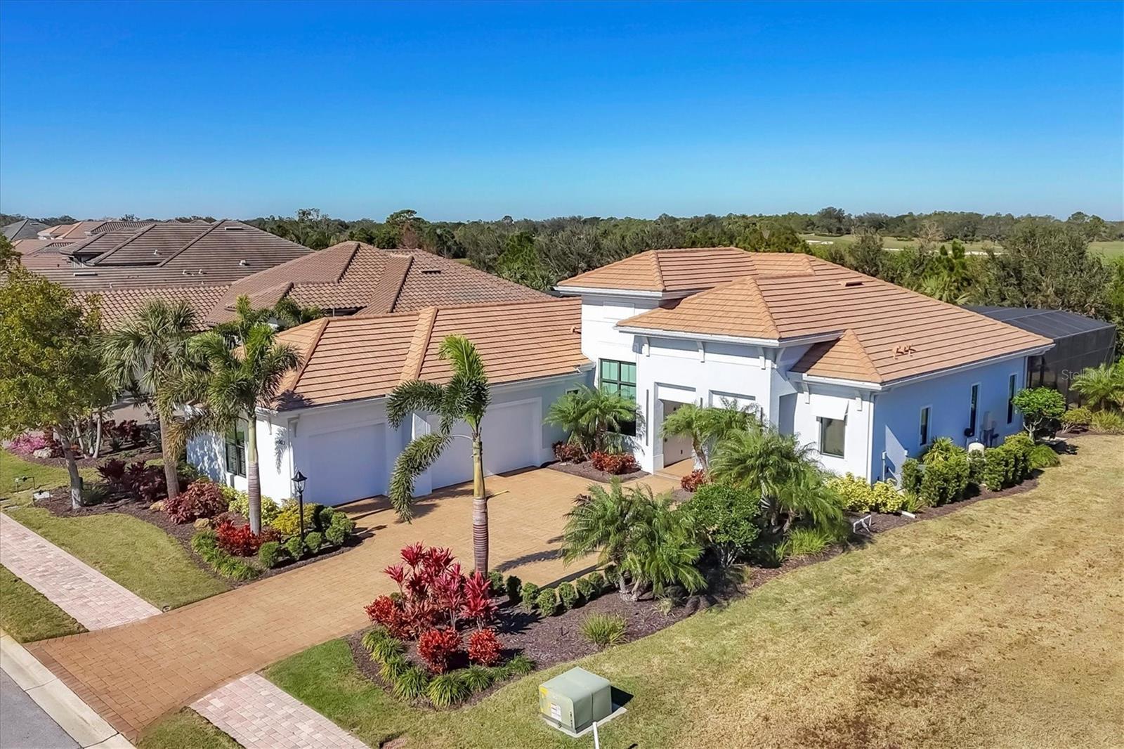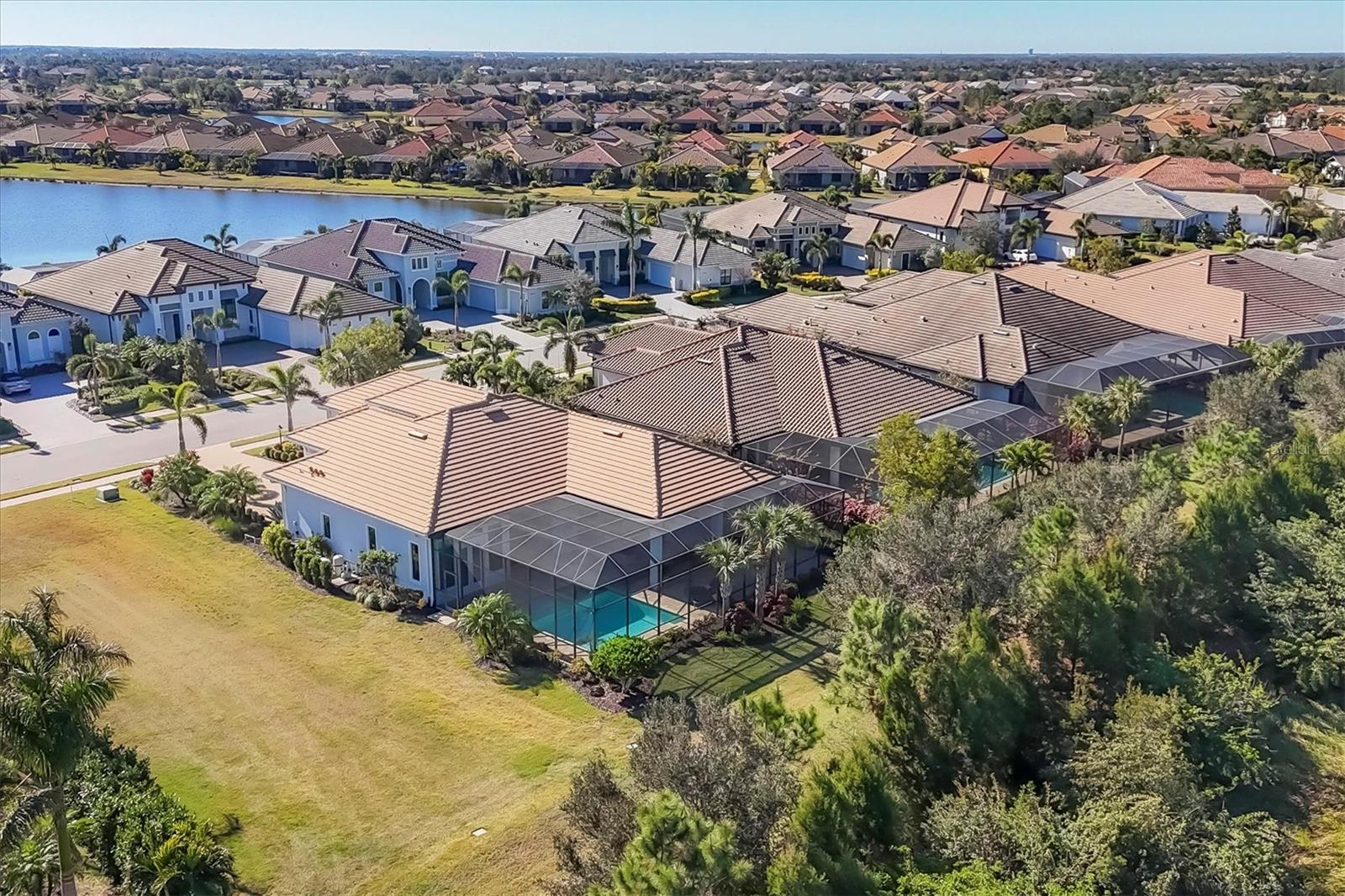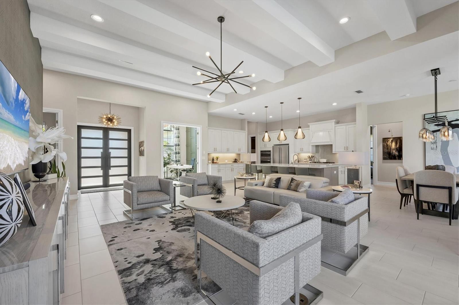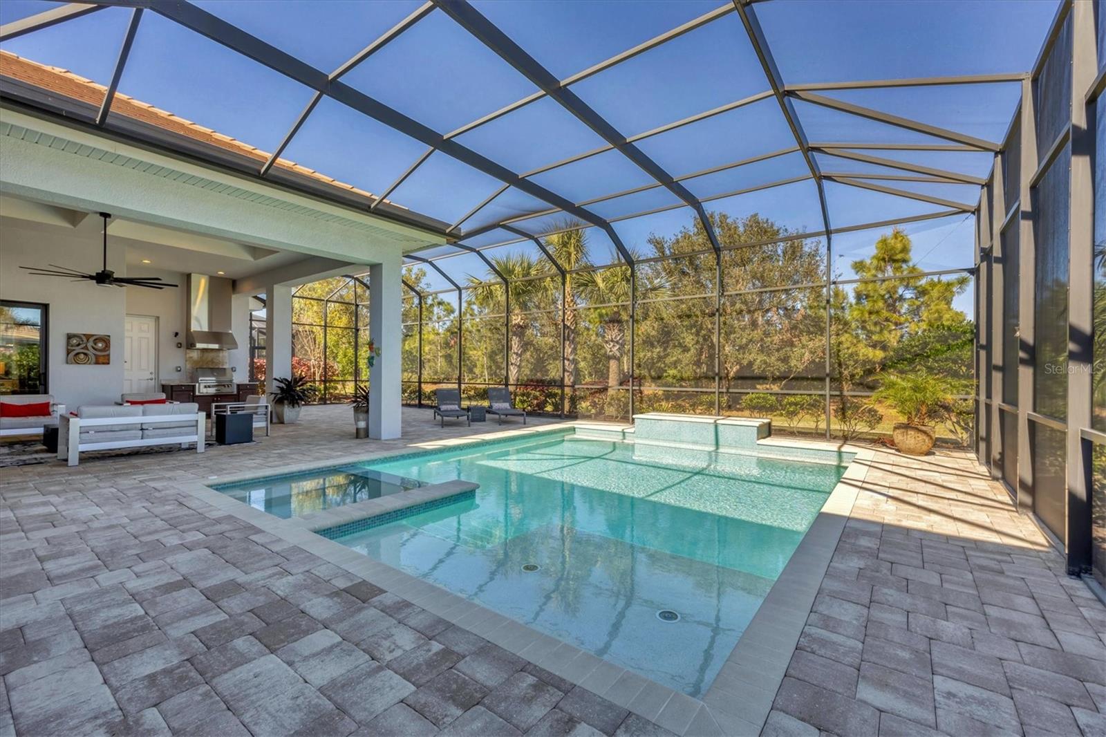 Welcome to the Captiva II model by Stock Signature Homes, a stunning low-maintenance Country Club East residence that combines contemporary design with exceptional functionality. This beautiful home sits on a private, wooded lot with an easement next door, ensuring privacy and breathtaking views of a serene pond. The home's striking modern black iron and frosted glass doors invite you into a spacious foyer, where a mirrored wall treatment adds an elegant touch. Inside, you'll find an open floor plan that allows natural light to flood the space. The expansive great room features 12-foot ceilings, pocketing sliders that open to the lanai, and modern white ceiling beams that enhance the room's airy feel. Off the great room is the kitchen, offering a large island with additional storage, quartz countertops, and high-end appliances such as a Fulgor Milano refrigerator and dishwasher, GE Profile five-burner cooktop, oven and convection microwave. Adjacent to the kitchen is an eat-in dining area, perfect for casual meals and family gatherings. A spacious walk-in butler's pantry with modern cabinetry makes it easy to store culinary essentials. This home offers four bedrooms and three-and-a-half baths. The primary suite is a true sanctuary, featuring a 12-foot tray ceiling, two walk-in closets with built-in organizers, and French doors that open to the lanai, bringing the beauty of the outdoors in. The en-suite bath includes dual sinks, a freestanding tub and a walk-in shower. The home's design also includes a flexible fourth bedroom, perfect as a secondary primary suite or bonus room, complete with an en-suite bath and pool access. Bedrooms two and three share a Jack-and-Jill bath with dual sinks and a tub/shower combo, the perfect space for family or guests. The den with a 15-foot ceilings and wooden feature wall is the perfect space for a quiet retreat. A convenient powder room with stylish lighting and a lit vanity is also available for guests. The large laundry room provides abundant storage and counterspace, while the oversized three-car garage features durable epoxy floors. The home also boasts impact windows and doors for added security and energy efficiency. The large lanai features a heated pool and spa, complete with a waterfall feature, sun shelf, colorful pool lighting and built-in lanai cage lighting. The spacious outdoor space includes an outdoor grill with an exhaust fan for alfresco dining. Additional details include a gas water heater with a hot water recirculation system for instant hot water, low-voltage landscape lighting, and a recently updated irrigation system. Country Club East residents enjoy exclusive access to The Retreat, a neighborhood amenity center boasting a resort-style pool, fitness center, and billiards room. Additionally, The Residents Club offers another pool, spa, and a volleyball court for residents to indulge in leisure and recreation. For those seeking more recreational options, just a few streets away lies the Lakewood Ranch Golf & Country Club, featuring 54 holes of golf, 20 Har-Tru tennis courts, 20 pickleball courts, multiple pools, Grand Clubhouse, and The Lodge bar/restaurant. Residents have the option to avail themselves of these facilities through various membership packages. Discover this gem in Lakewood Ranch, America's top best-selling, master-planned multigenerational community.