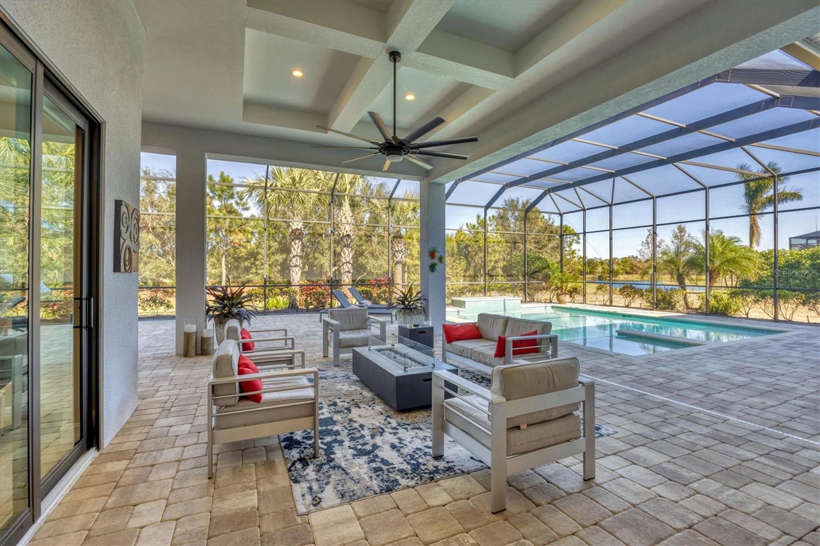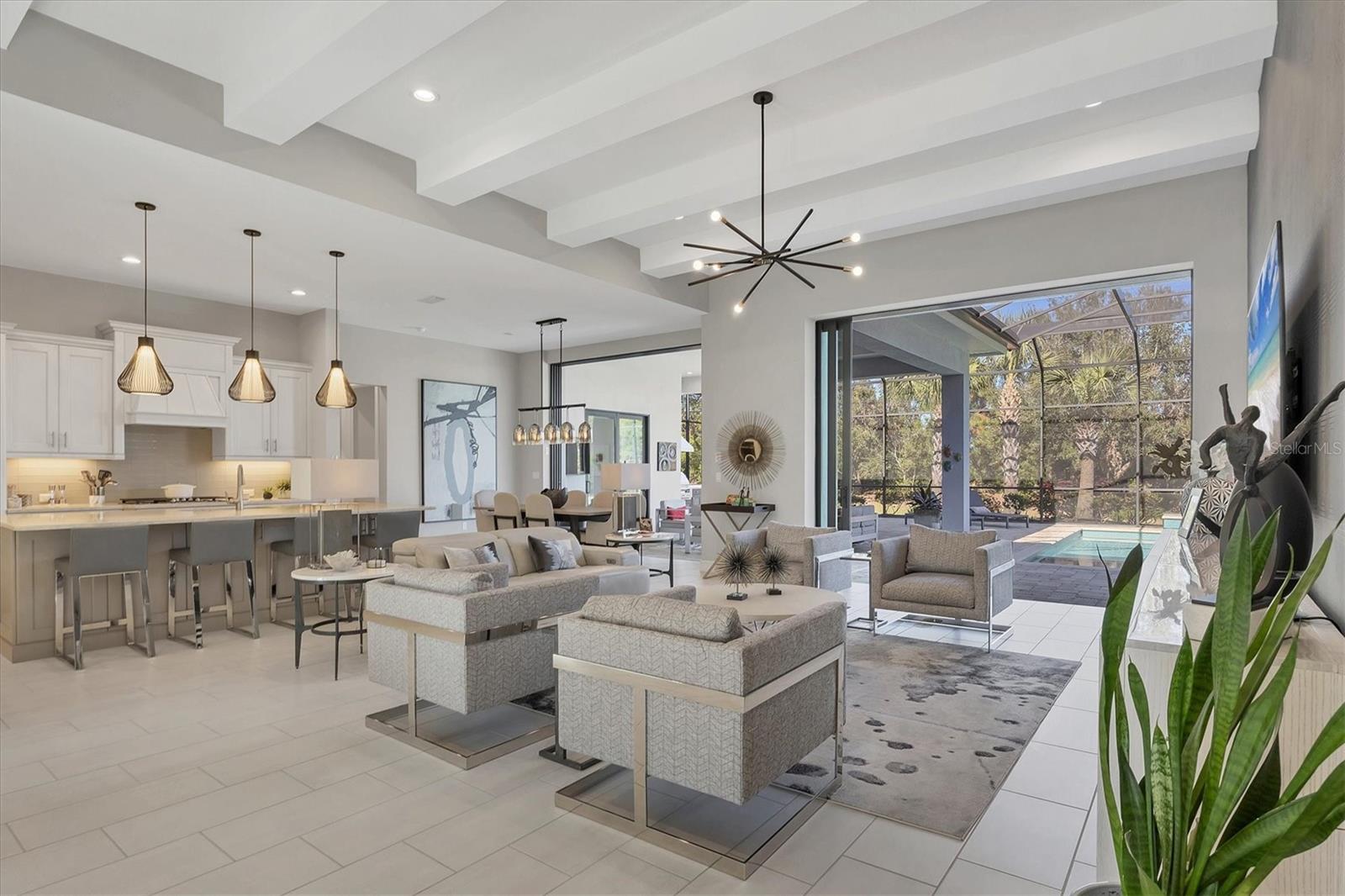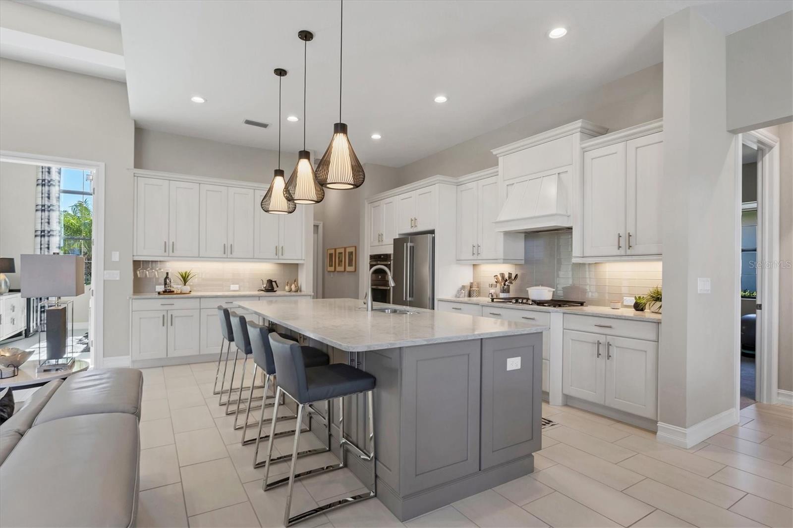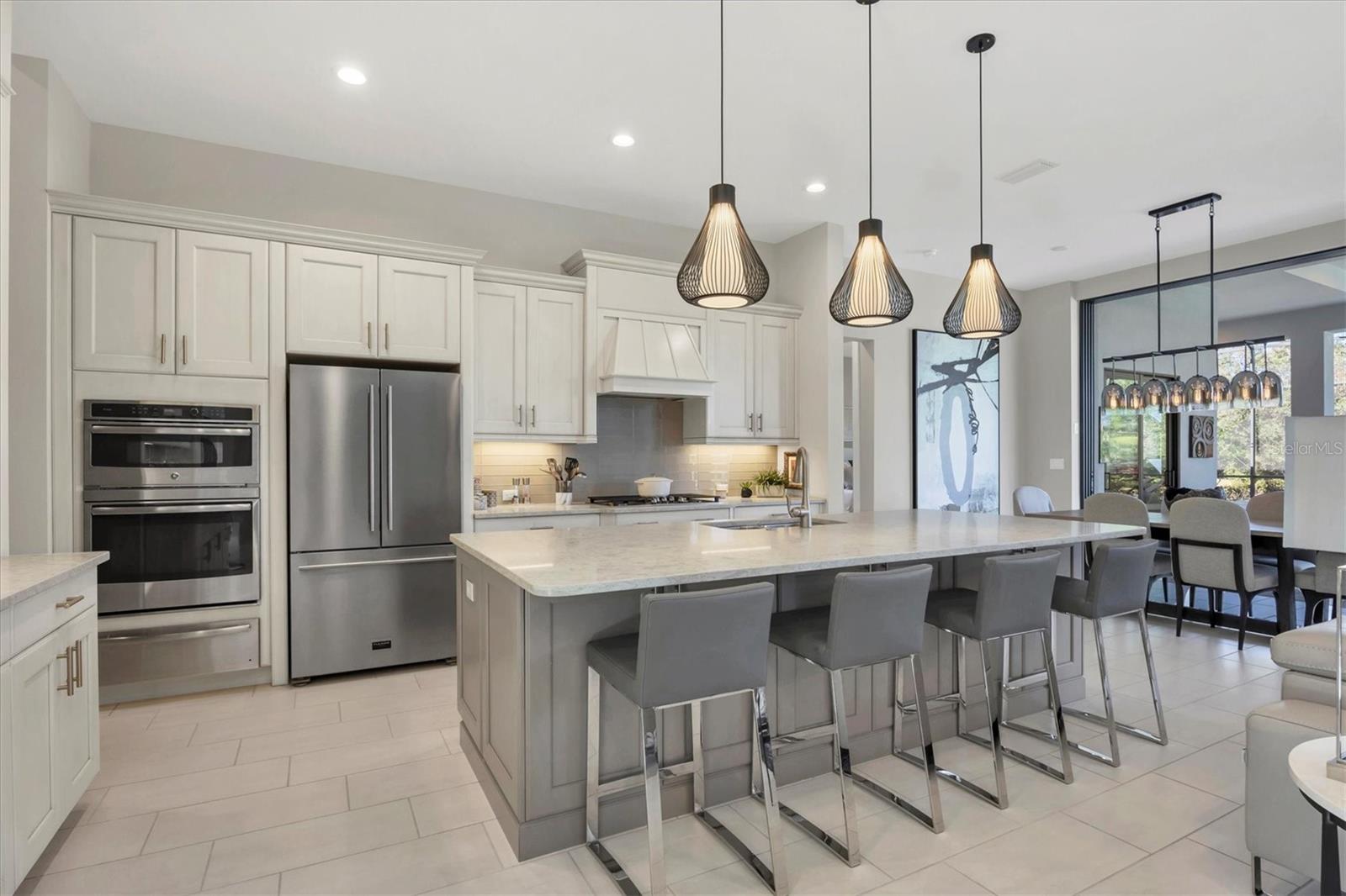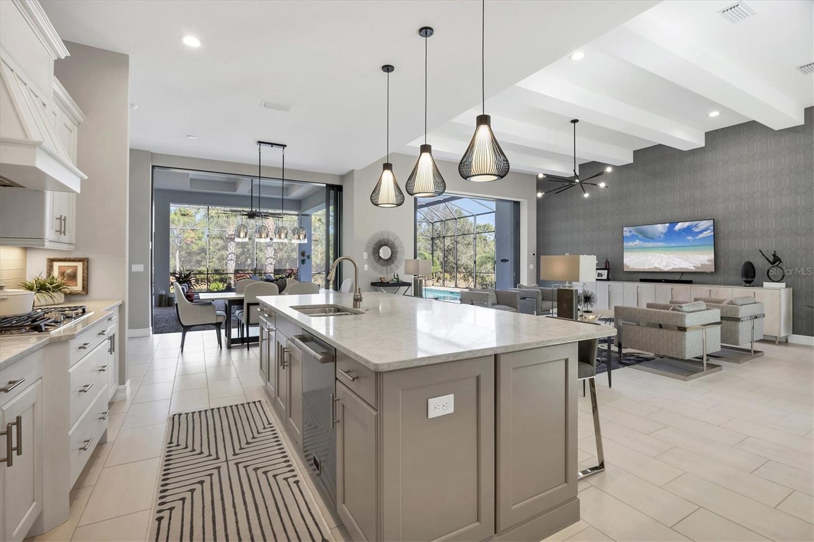 Welcome to the Captiva II model by Stock Signature Homes, a stunning low-maintenance Country Club East residence that combines contemporary design with exceptional functionality. This beautiful home sits on a private, wooded lot with an easement next door, ensuring privacy and breathtaking views of a serene pond. The home's striking modern black iron and frosted glass doors invite you into a spacious foyer, where a mirrored wall treatment adds an elegant touch. Inside, you'll find an open floor plan that allows natural light to flood the space. The expansive great room features 12-foot ceilings, pocketing sliders that open to the lanai, and modern white ceiling beams that enhance the room's airy feel. Off the great room is the kitchen, offering a large island with additional storage, quartz countertops, and high-end appliances such as a Fulgor Milano refrigerator and dishwasher, GE Profile five-burner cooktop, oven and convection microwave. Adjacent to the kitchen is an eat-in dining area, perfect for casual meals and family gatherings. A spacious walk-in butler's pantry with modern cabinetry makes it easy to store culinary essentials. This home offers four bedrooms and three-and-a-half baths. The primary suite is a true sanctuary, featuring a 12-foot tray ceiling, two walk-in closets with built-in organizers, and French doors that open to the lanai, bringing the beauty of the outdoors in. The en-suite bath includes dual sinks, a freestanding tub and a walk-in shower. The home's design also includes a flexible fourth bedroom, perfect as a secondary primary suite or bonus room, complete with an en-suite bath and pool access. Bedrooms two and three share a Jack-and-Jill bath with dual sinks and a tub/shower combo, the perfect space for family or guests. The den with a 15-foot ceilings and wooden feature wall is the perfect space for a quiet retreat. A convenient powder room with stylish lighting and a lit vanity is also available for guests. The large laundry room provides abundant storage and counterspace, while the oversized three-car garage features durable epoxy floors. The home also boasts impact windows and doors for added security and energy efficiency. The large lanai features a heated pool and spa, complete with a waterfall feature, sun shelf, colorful pool lighting and built-in lanai cage lighting. The spacious outdoor space includes an outdoor grill with an exhaust fan for alfresco dining. Additional details include a gas water heater with a hot water recirculation system for instant hot water, low-voltage landscape lighting, and a recently updated irrigation system. Country Club East residents enjoy exclusive access to The Retreat, a neighborhood amenity center boasting a resort-style pool, fitness center, and billiards room. Additionally, The Residents Club offers another pool, spa, and a volleyball court for residents to indulge in leisure and recreation. For those seeking more recreational options, just a few streets away lies the Lakewood Ranch Golf & Country Club, featuring 54 holes of golf, 20 Har-Tru tennis courts, 20 pickleball courts, multiple pools, Grand Clubhouse, and The Lodge bar/restaurant. Residents have the option to avail themselves of these facilities through various membership packages. Discover this gem in Lakewood Ranch, America's top best-selling, master-planned multigenerational community.