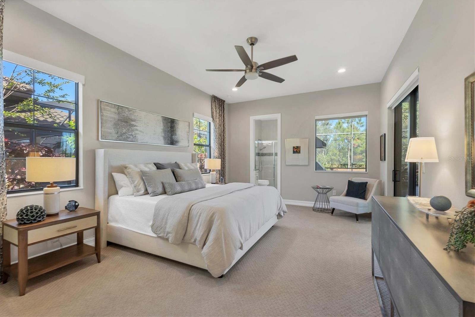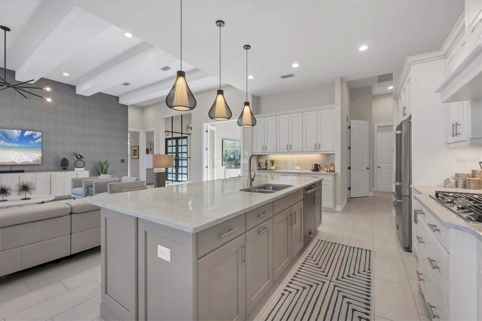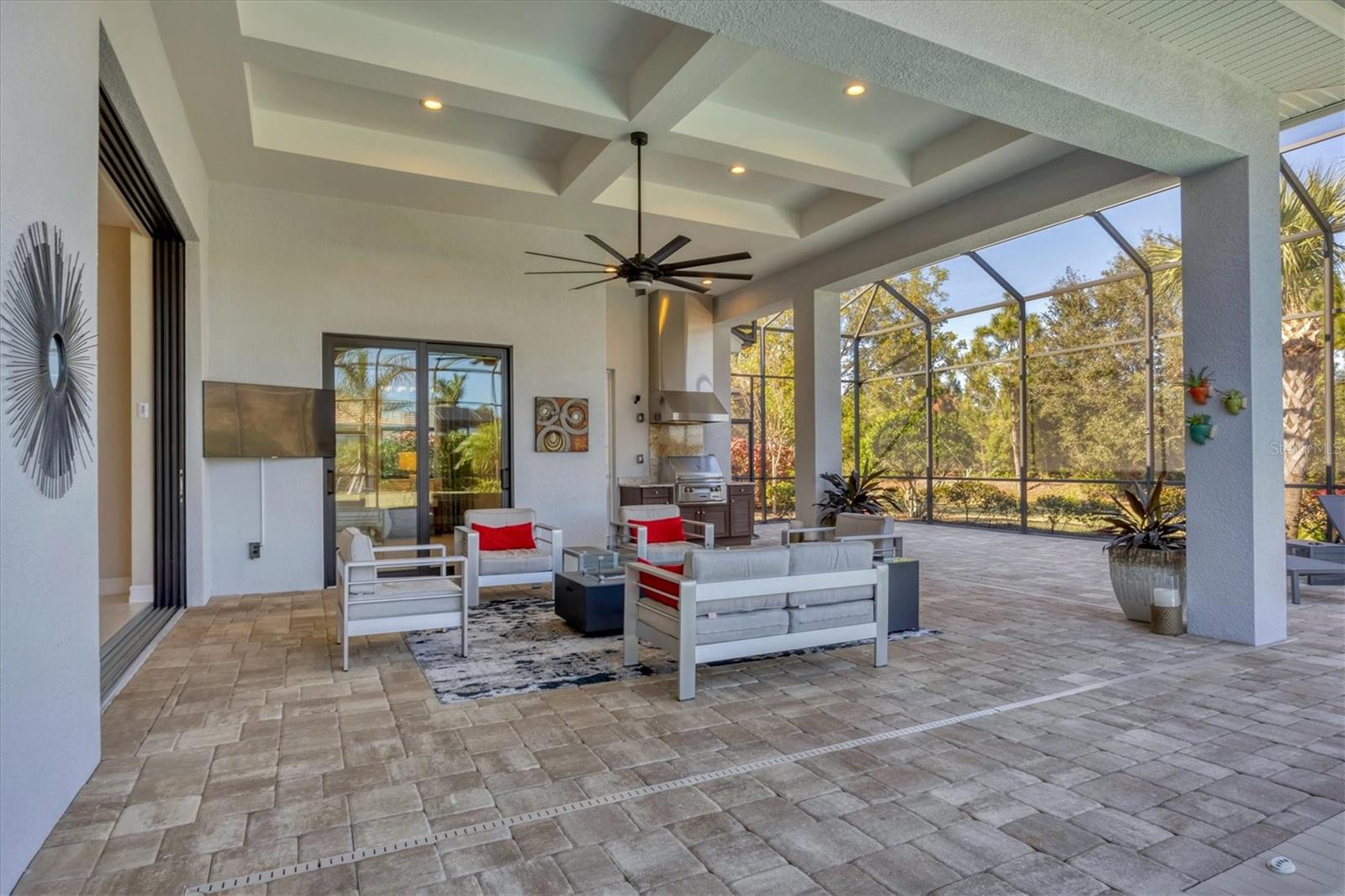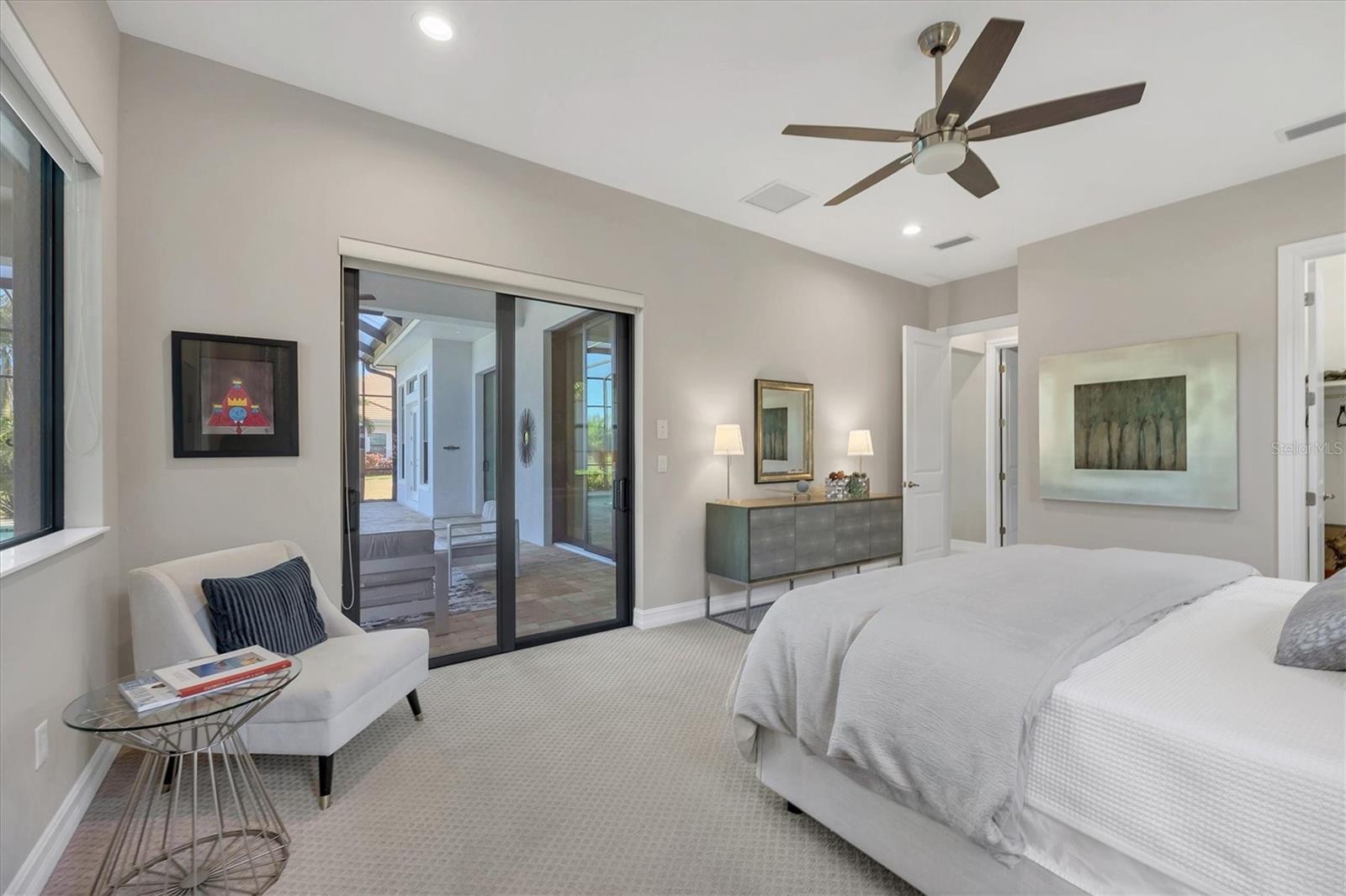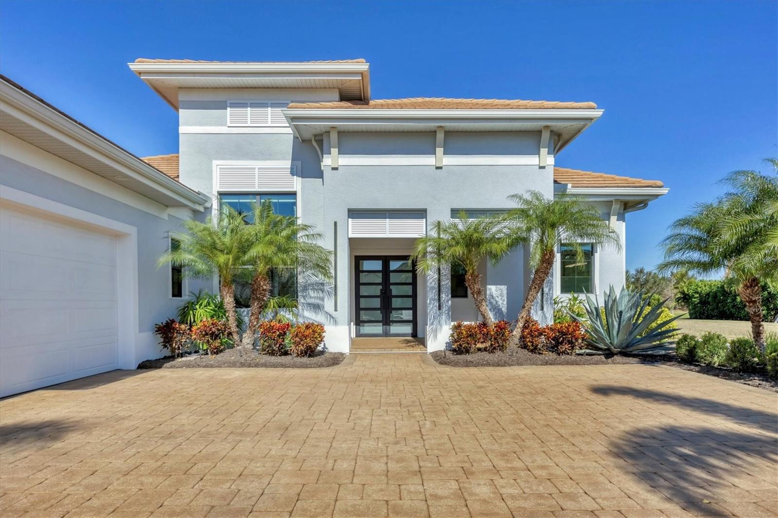 Welcome to the Captiva II model by Stock Signature Homes, a stunning low-maintenance Country Club East residence that combines contemporary design with exceptional functionality. This beautiful home sits on a private, wooded lot with an easement next door, ensuring privacy and breathtaking views of a serene pond. The home's striking modern black iron and frosted glass doors invite you into a spacious foyer, where a mirrored wall treatment adds an elegant touch. Inside, you'll find an open floor plan that allows natural light to flood the space. The expansive great room features 12-foot ceilings, pocketing sliders that open to the lanai, and modern white ceiling beams that enhance the room's airy feel. Off the great room is the kitchen, offering a large island with additional storage, quartz countertops, and high-end appliances such as a Fulgor Milano refrigerator and dishwasher, GE Profile five-burner cooktop, oven and convection microwave. Adjacent to the kitchen is an eat-in dining area, perfect for casual meals and family gatherings. A spacious walk-in butler's pantry with modern cabinetry makes it easy to store culinary essentials. This home offers four bedrooms and three-and-a-half baths. The primary suite is a true sanctuary, featuring a 12-foot tray ceiling, two walk-in closets with built-in organizers, and French doors that open to the lanai, bringing the beauty of the outdoors in. The en-suite bath includes dual sinks, a freestanding tub and a walk-in shower. The home's design also includes a flexible fourth bedroom, perfect as a secondary primary suite or bonus room, complete with an en-suite bath and pool access. Bedrooms two and three share a Jack-and-Jill bath with dual sinks and a tub/shower combo, the perfect space for family or guests. The den with a 15-foot ceilings and wooden feature wall is the perfect space for a quiet retreat. A convenient powder room with stylish lighting and a lit vanity is also available for guests. The large laundry room provides abundant storage and counterspace, while the oversized three-car garage features durable epoxy floors. The home also boasts impact windows and doors for added security and energy efficiency. The large lanai features a heated pool and spa, complete with a waterfall feature, sun shelf, colorful pool lighting and built-in lanai cage lighting. The spacious outdoor space includes an outdoor grill with an exhaust fan for alfresco dining. Additional details include a gas water heater with a hot water recirculation system for instant hot water, low-voltage landscape lighting, and a recently updated irrigation system. Country Club East residents enjoy exclusive access to The Retreat, a neighborhood amenity center boasting a resort-style pool, fitness center, and billiards room. Additionally, The Residents Club offers another pool, spa, and a volleyball court for residents to indulge in leisure and recreation. For those seeking more recreational options, just a few streets away lies the Lakewood Ranch Golf & Country Club, featuring 54 holes of golf, 20 Har-Tru tennis courts, 20 pickleball courts, multiple pools, Grand Clubhouse, and The Lodge bar/restaurant. Residents have the option to avail themselves of these facilities through various membership packages. Discover this gem in Lakewood Ranch, America's top best-selling, master-planned multigenerational community.