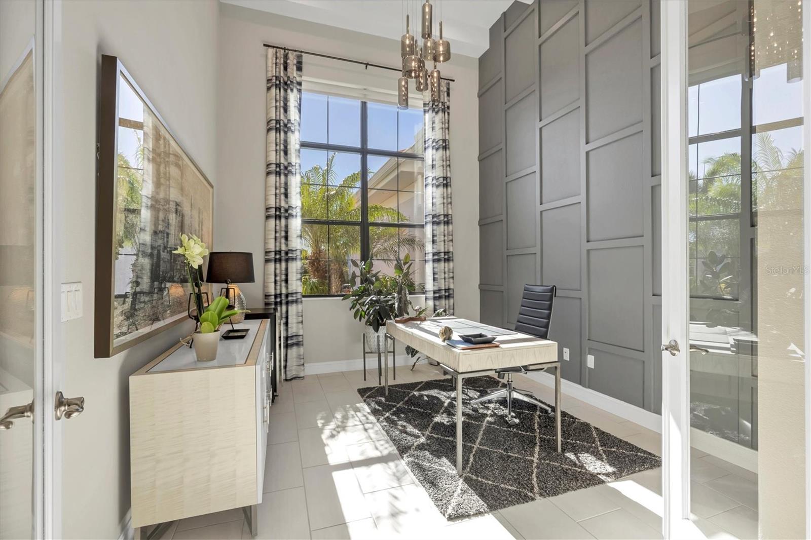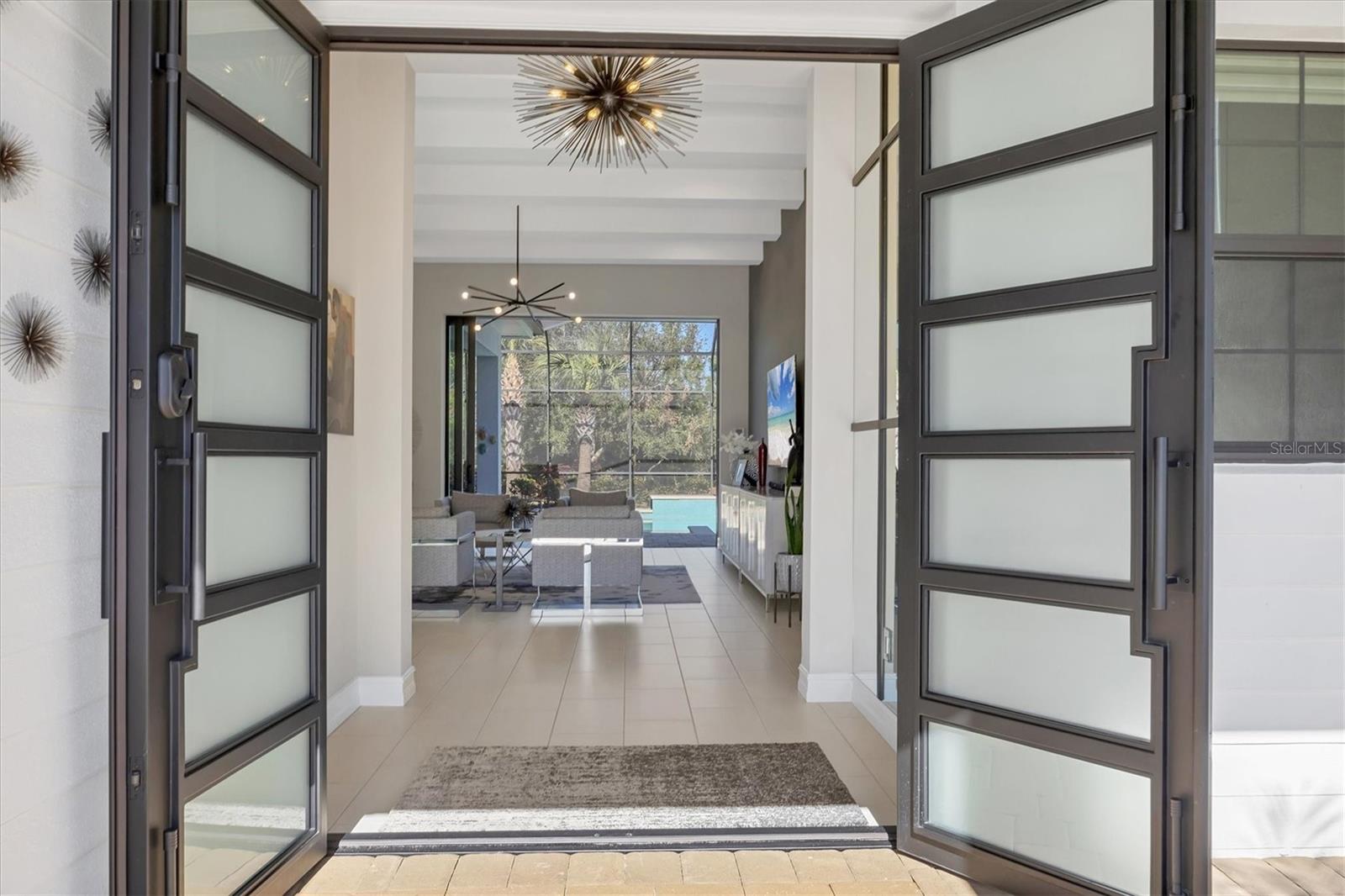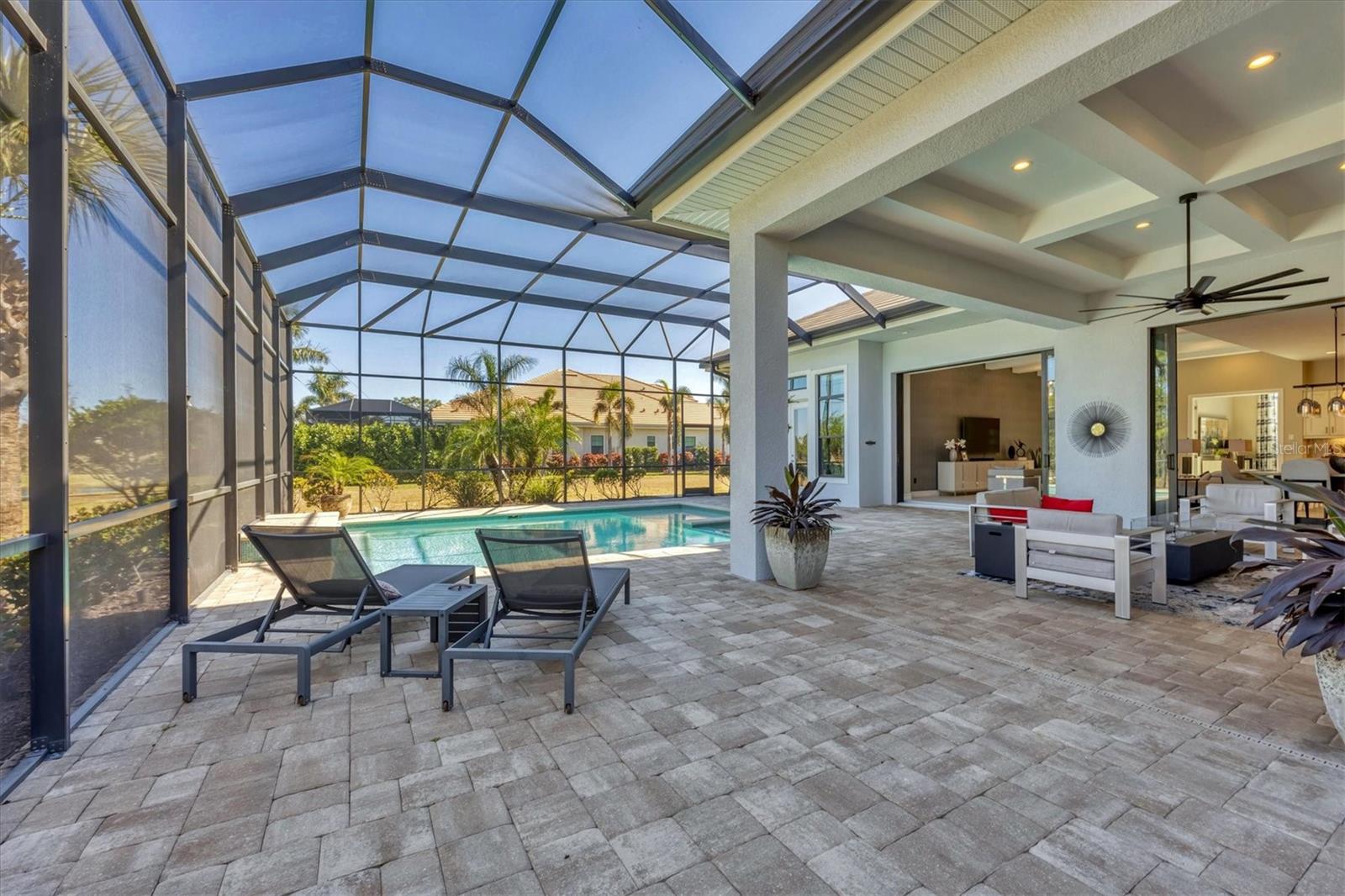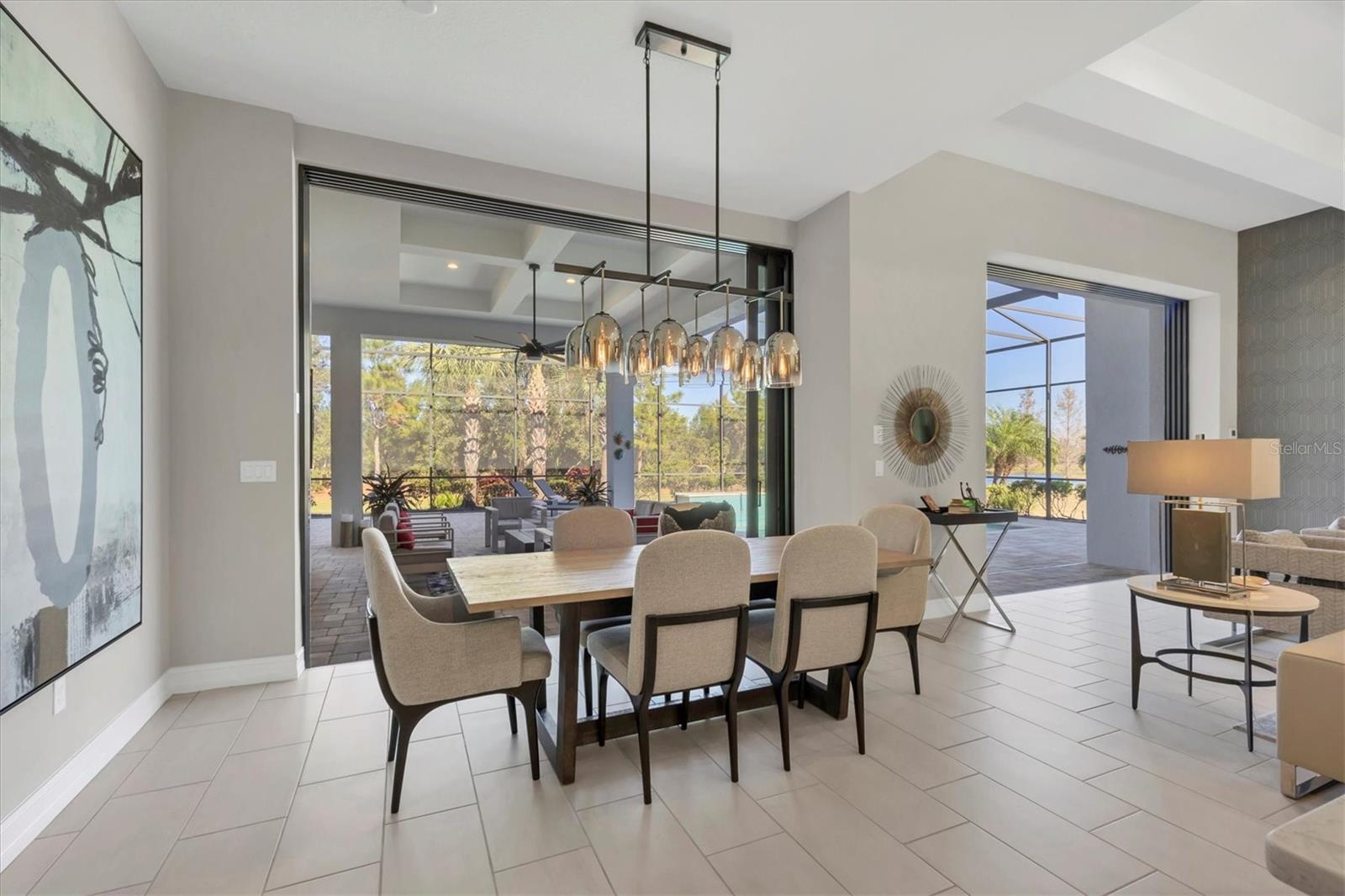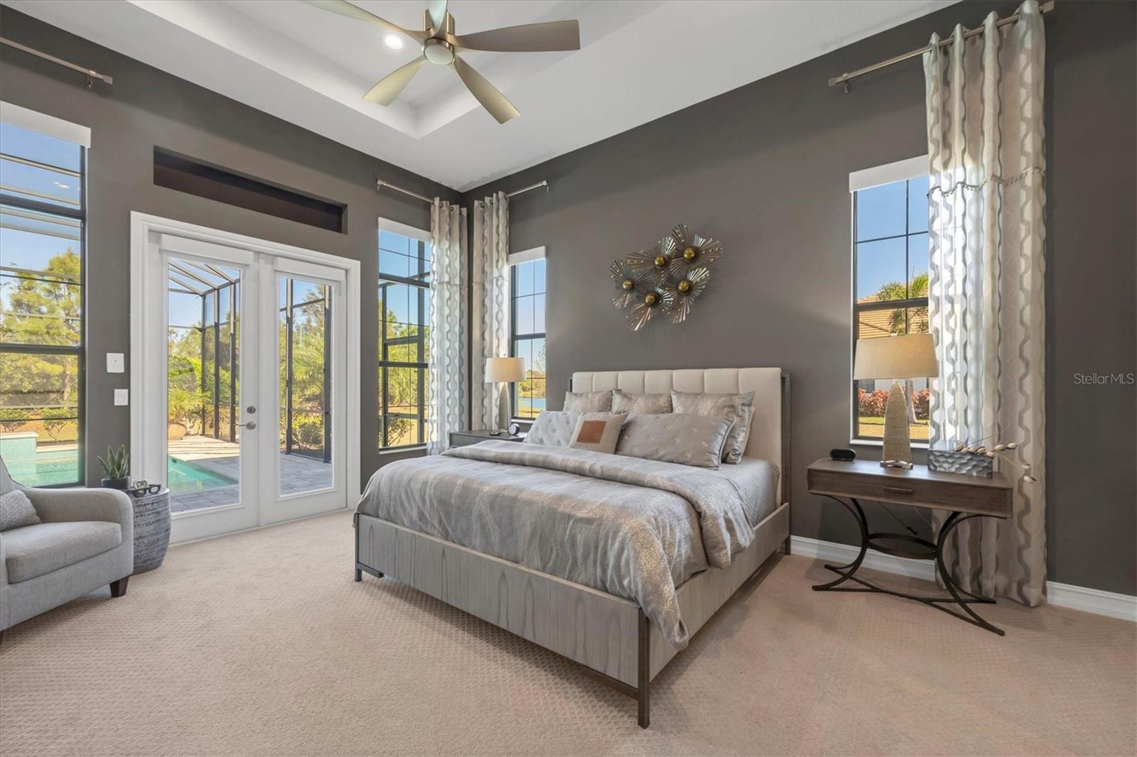 Welcome to the Captiva II model by Stock Signature Homes, a stunning low-maintenance Country Club East residence that combines contemporary design with exceptional functionality. This beautiful home sits on a private, wooded lot with an easement next door, ensuring privacy and breathtaking views of a serene pond. The home's striking modern black iron and frosted glass doors invite you into a spacious foyer, where a mirrored wall treatment adds an elegant touch. Inside, you'll find an open floor plan that allows natural light to flood the space. The expansive great room features 12-foot ceilings, pocketing sliders that open to the lanai, and modern white ceiling beams that enhance the room's airy feel. Off the great room is the kitchen, offering a large island with additional storage, quartz countertops, and high-end appliances such as a Fulgor Milano refrigerator and dishwasher, GE Profile five-burner cooktop, oven and convection microwave. Adjacent to the kitchen is an eat-in dining area, perfect for casual meals and family gatherings. A spacious walk-in butler's pantry with modern cabinetry makes it easy to store culinary essentials. This home offers four bedrooms and three-and-a-half baths. The primary suite is a true sanctuary, featuring a 12-foot tray ceiling, two walk-in closets with built-in organizers, and French doors that open to the lanai, bringing the beauty of the outdoors in. The en-suite bath includes dual sinks, a freestanding tub and a walk-in shower. The home's design also includes a flexible fourth bedroom, perfect as a secondary primary suite or bonus room, complete with an en-suite bath and pool access. Bedrooms two and three share a Jack-and-Jill bath with dual sinks and a tub/shower combo, the perfect space for family or guests. The den with a 15-foot ceilings and wooden feature wall is the perfect space for a quiet retreat. A convenient powder room with stylish lighting and a lit vanity is also available for guests. The large laundry room provides abundant storage and counterspace, while the oversized three-car garage features durable epoxy floors. The home also boasts impact windows and doors for added security and energy efficiency. The large lanai features a heated pool and spa, complete with a waterfall feature, sun shelf, colorful pool lighting and built-in lanai cage lighting. The spacious outdoor space includes an outdoor grill with an exhaust fan for alfresco dining. Additional details include a gas water heater with a hot water recirculation system for instant hot water, low-voltage landscape lighting, and a recently updated irrigation system. Country Club East residents enjoy exclusive access to The Retreat, a neighborhood amenity center boasting a resort-style pool, fitness center, and billiards room. Additionally, The Residents Club offers another pool, spa, and a volleyball court for residents to indulge in leisure and recreation. For those seeking more recreational options, just a few streets away lies the Lakewood Ranch Golf & Country Club, featuring 54 holes of golf, 20 Har-Tru tennis courts, 20 pickleball courts, multiple pools, Grand Clubhouse, and The Lodge bar/restaurant. Residents have the option to avail themselves of these facilities through various membership packages. Discover this gem in Lakewood Ranch, America's top best-selling, master-planned multigenerational community.