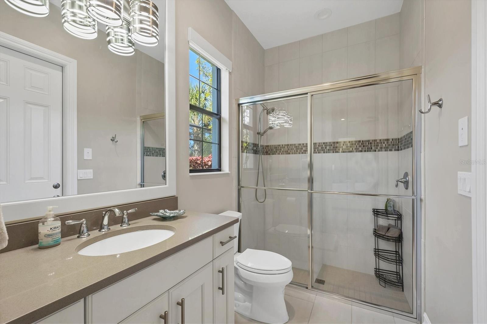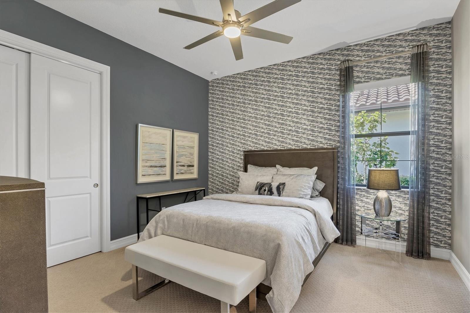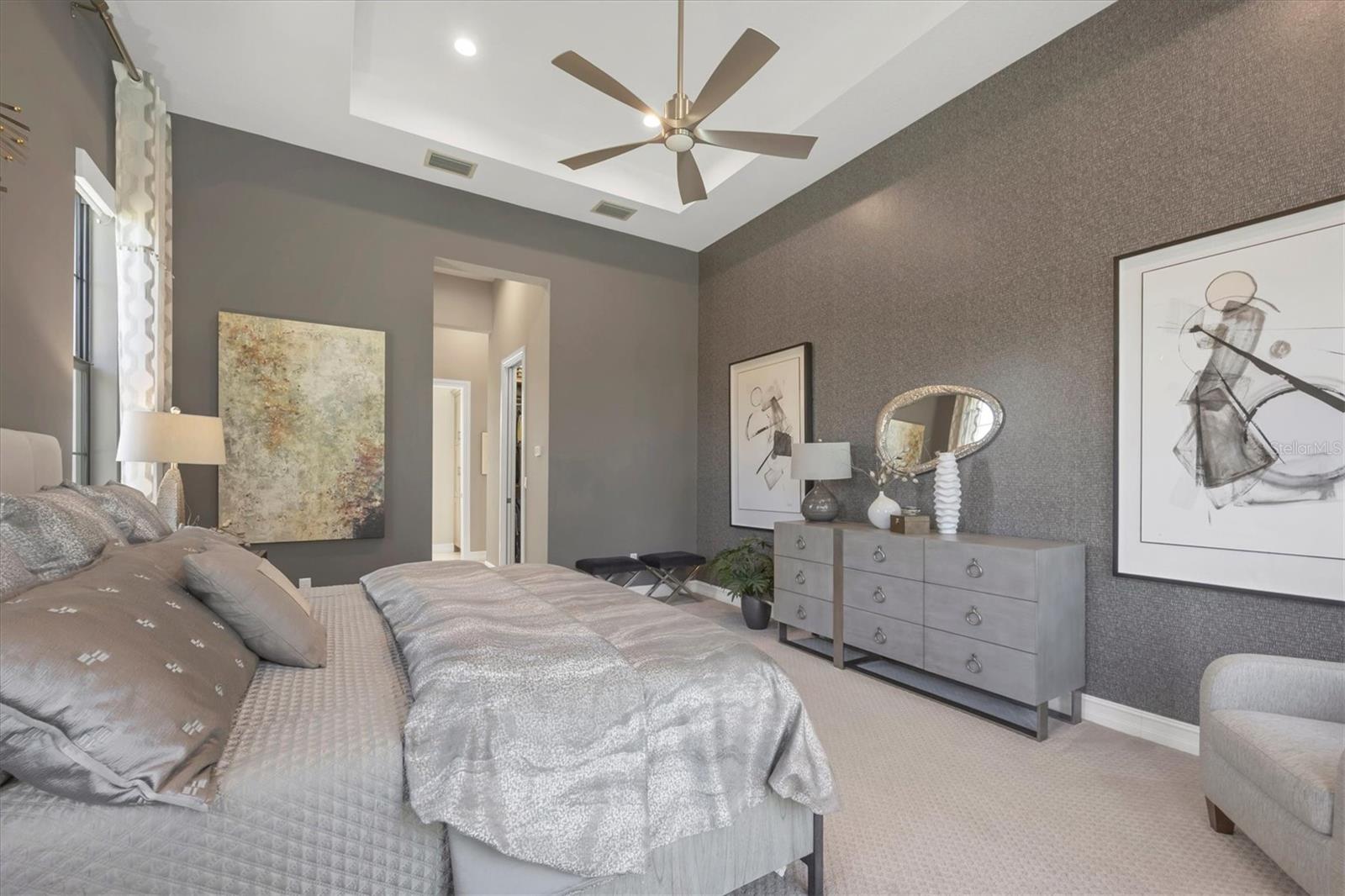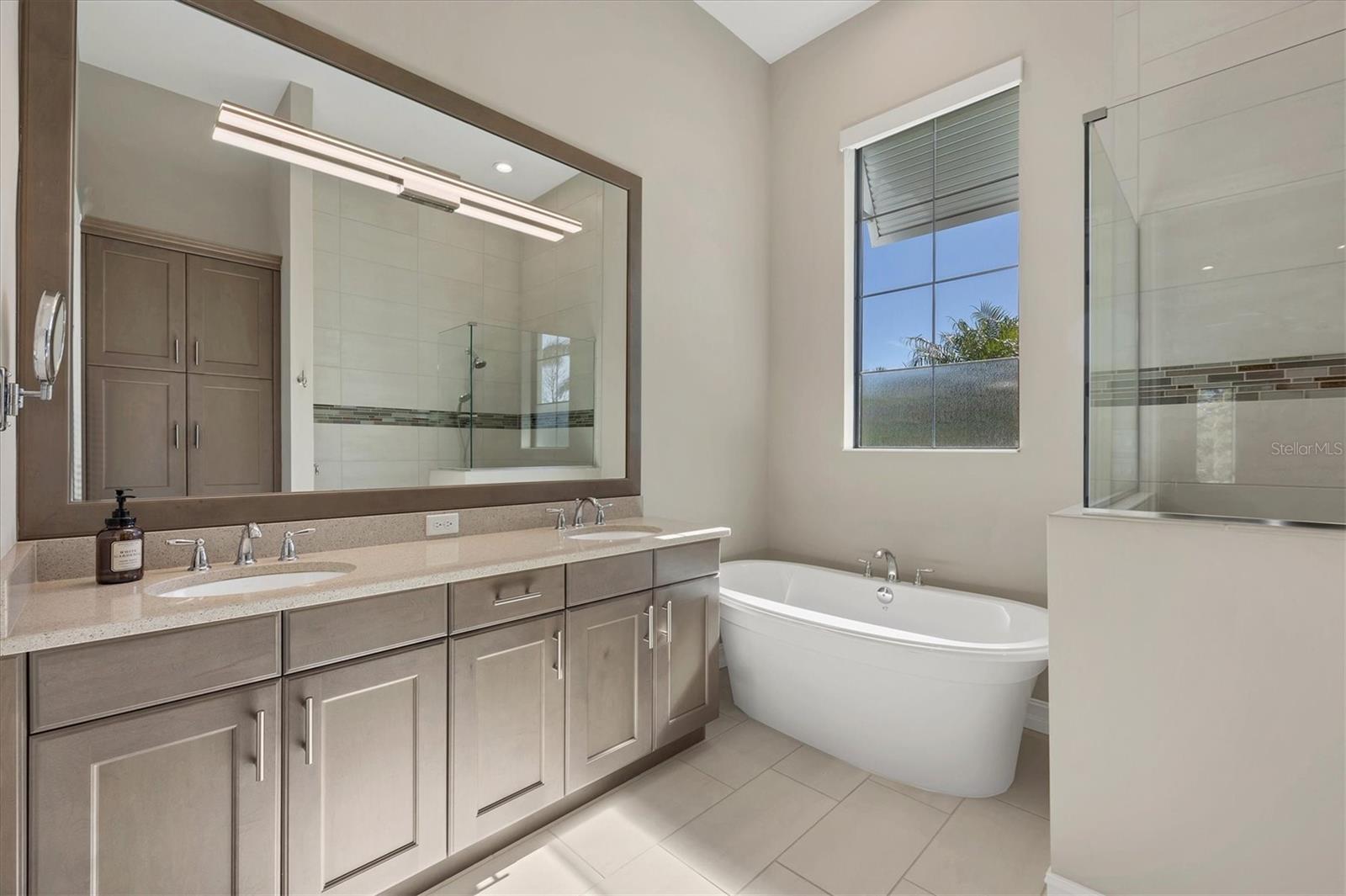 Welcome to the Captiva II model by Stock Signature Homes, a stunning low-maintenance Country Club East residence that combines contemporary design with exceptional functionality. This beautiful home sits on a private, wooded lot with an easement next door, ensuring privacy and breathtaking views of a serene pond. The home's striking modern black iron and frosted glass doors invite you into a spacious foyer, where a mirrored wall treatment adds an elegant touch. Inside, you'll find an open floor plan that allows natural light to flood the space. The expansive great room features 12-foot ceilings, pocketing sliders that open to the lanai, and modern white ceiling beams that enhance the room's airy feel. Off the great room is the kitchen, offering a large island with additional storage, quartz countertops, and high-end appliances such as a Fulgor Milano refrigerator and dishwasher, GE Profile five-burner cooktop, oven and convection microwave. Adjacent to the kitchen is an eat-in dining area, perfect for casual meals and family gatherings. A spacious walk-in butler's pantry with modern cabinetry makes it easy to store culinary essentials. This home offers four bedrooms and three-and-a-half baths. The primary suite is a true sanctuary, featuring a 12-foot tray ceiling, two walk-in closets with built-in organizers, and French doors that open to the lanai, bringing the beauty of the outdoors in. The en-suite bath includes dual sinks, a freestanding tub and a walk-in shower. The home's design also includes a flexible fourth bedroom, perfect as a secondary primary suite or bonus room, complete with an en-suite bath and pool access. Bedrooms two and three share a Jack-and-Jill bath with dual sinks and a tub/shower combo, the perfect space for family or guests. The den with a 15-foot ceilings and wooden feature wall is the perfect space for a quiet retreat. A convenient powder room with stylish lighting and a lit vanity is also available for guests. The large laundry room provides abundant storage and counterspace, while the oversized three-car garage features durable epoxy floors. The home also boasts impact windows and doors for added security and energy efficiency. The large lanai features a heated pool and spa, complete with a waterfall feature, sun shelf, colorful pool lighting and built-in lanai cage lighting. The spacious outdoor space includes an outdoor grill with an exhaust fan for alfresco dining. Additional details include a gas water heater with a hot water recirculation system for instant hot water, low-voltage landscape lighting, and a recently updated irrigation system. Country Club East residents enjoy exclusive access to The Retreat, a neighborhood amenity center boasting a resort-style pool, fitness center, and billiards room. Additionally, The Residents Club offers another pool, spa, and a volleyball court for residents to indulge in leisure and recreation. For those seeking more recreational options, just a few streets away lies the Lakewood Ranch Golf & Country Club, featuring 54 holes of golf, 20 Har-Tru tennis courts, 20 pickleball courts, multiple pools, Grand Clubhouse, and The Lodge bar/restaurant. Residents have the option to avail themselves of these facilities through various membership packages. Discover this gem in Lakewood Ranch, America's top best-selling, master-planned multigenerational community.