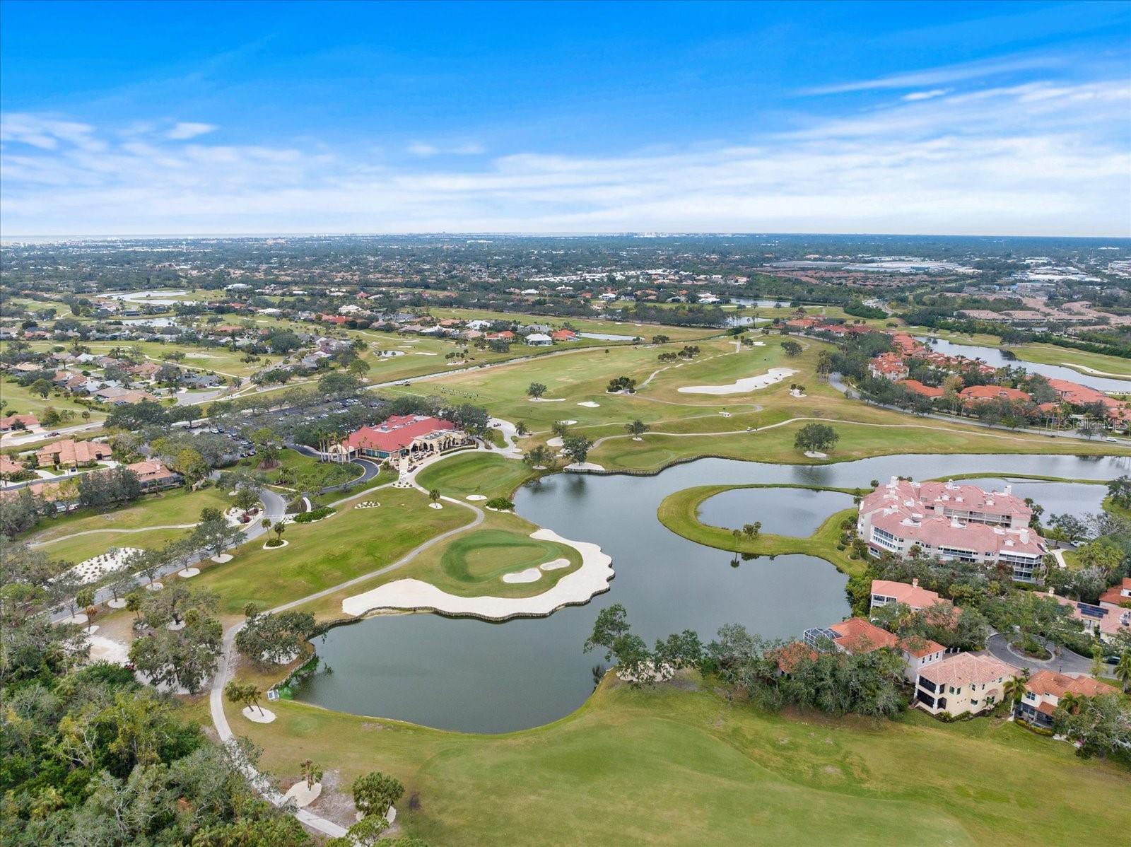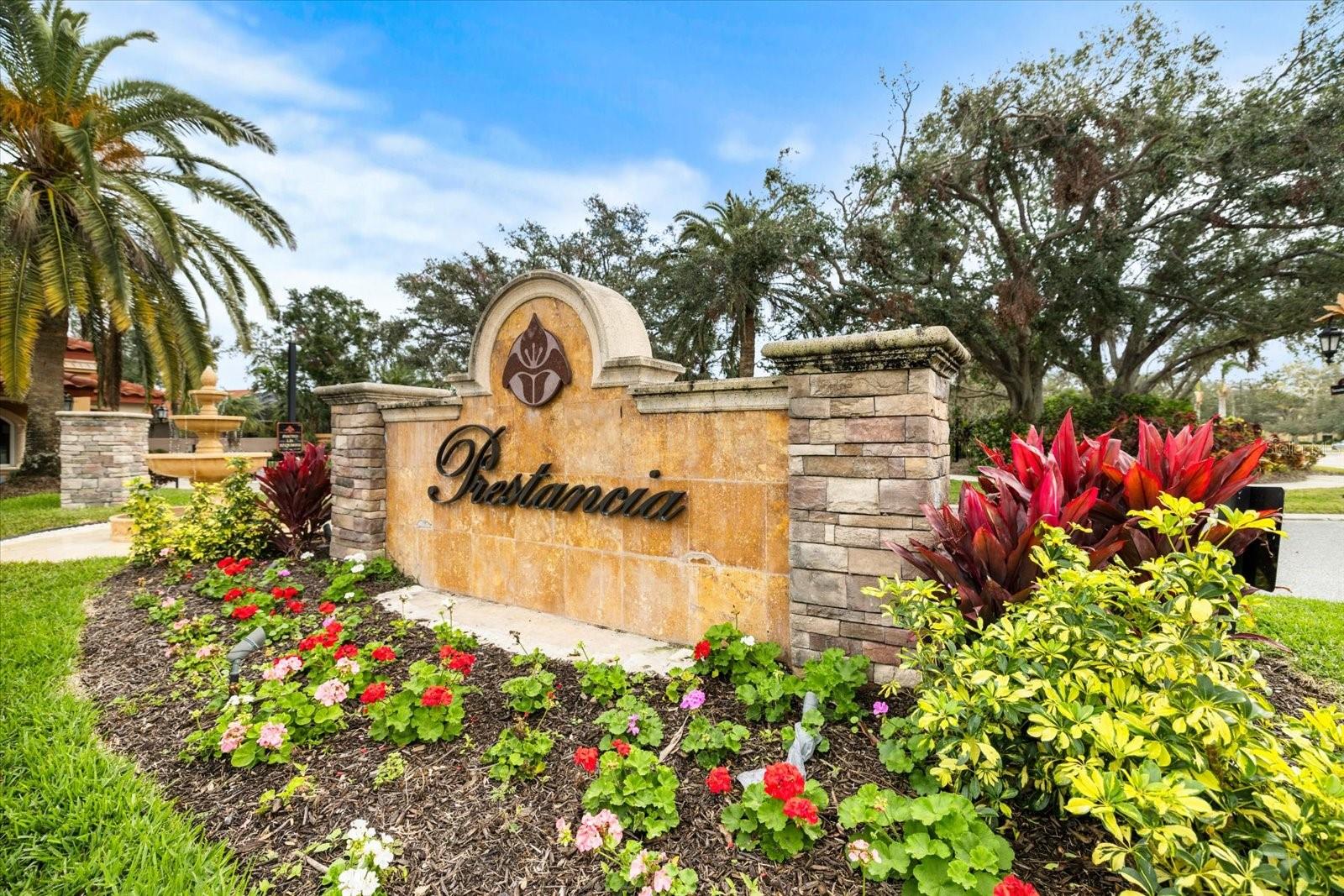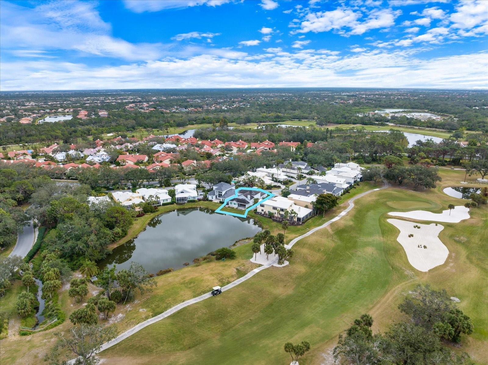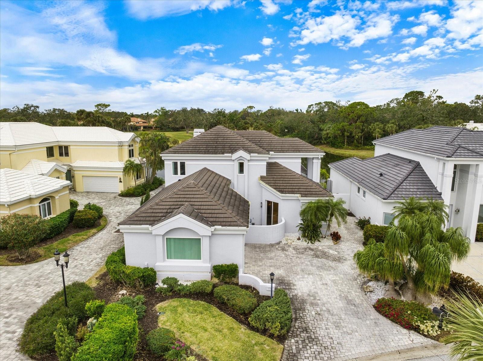 Modern Elegance with Golf Course Views in TPC PrestanciaSet within the gated community of TPC Prestancia, home to Sarasota's only TPC golf course, this custom two-story residence offers refined design and serene views along the 10th fairway. The home welcomes you with soaring ceilings, a graceful mahogany staircase, and Wenge hardwood floors. A 20-foot Jerusalem-stone fireplace anchors the main living area, framed by expansive windows overlooking the golf course and lake.The chef's kitchen features Sub-Zero and Wolf appliances, double ovens, wine cooler, custom cabinetry, and a butler's pantry with coffee bar. The primary suite includes a spa-style bath with dual vanities, soaking tub, body-spray shower, bidet, and custom walk-in closet with direct patio access. Two additional ensuite bedrooms provide comfort and privacy, including a main-level suite ideal for an office or guest room. Upstairs, a bonus/media room with wet bar expands the living space.Outdoor living includes a private courtyard with fountain and convenient access to the community pool across the street. Optional golf and social memberships available. Located minutes from Siesta Key Beach, Legacy Trail, and Sarasota's cultural, dining, and shopping destinations.
