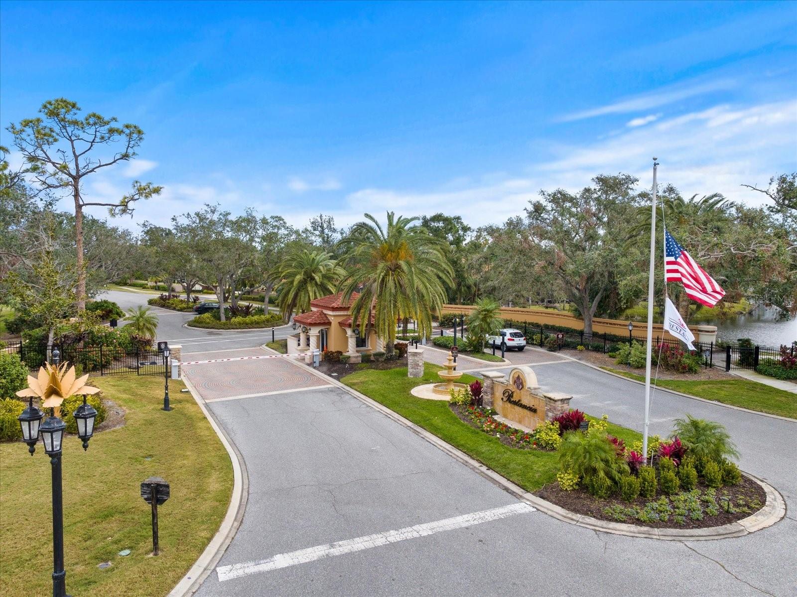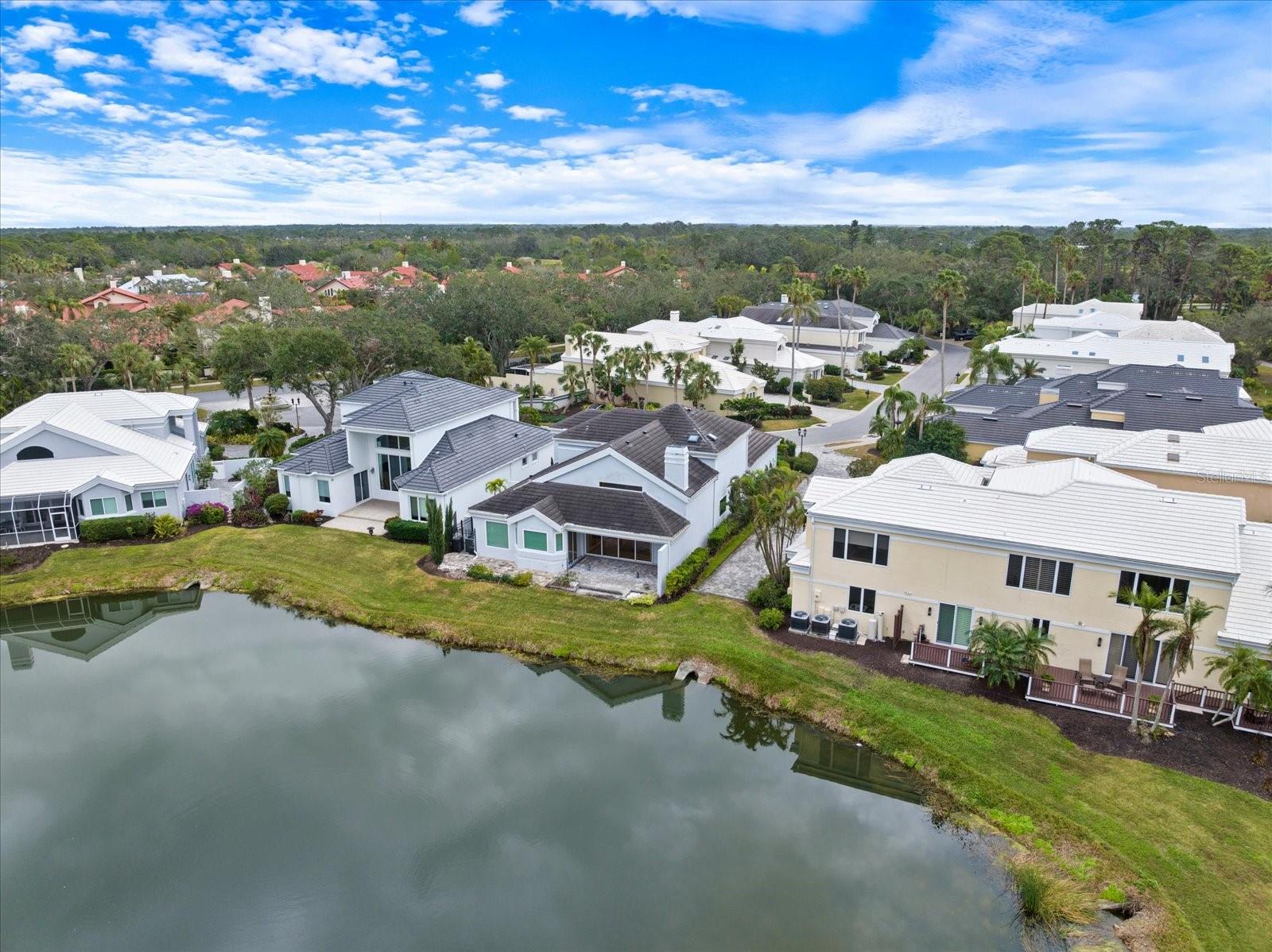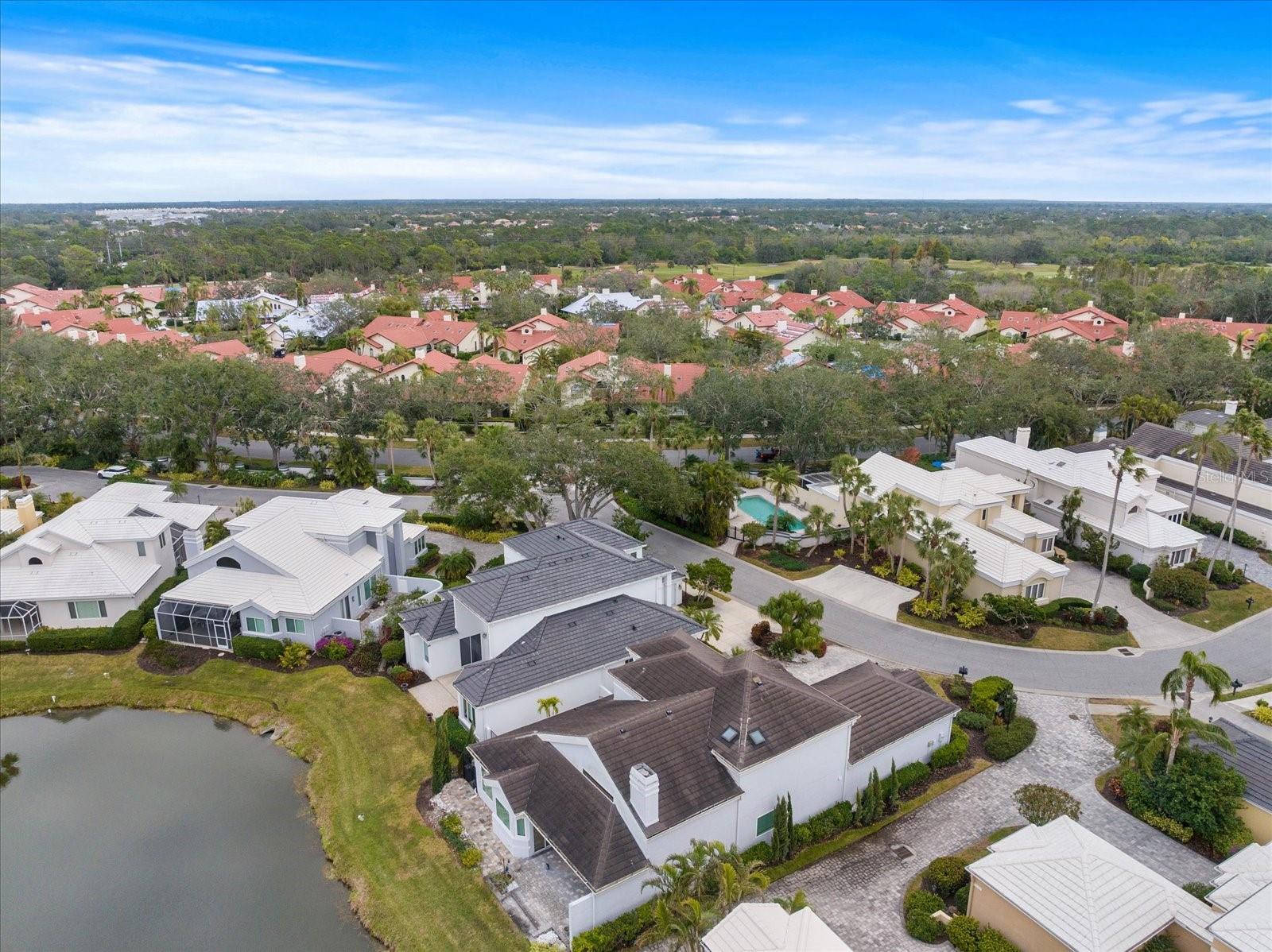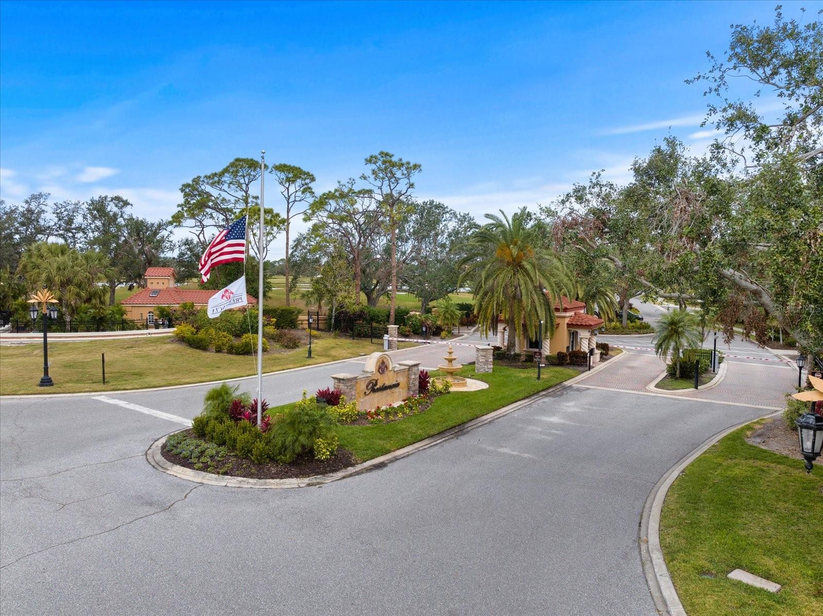 Modern Elegance with Golf Course Views in TPC PrestanciaSet within the gated community of TPC Prestancia, home to Sarasota's only TPC golf course, this custom two-story residence offers refined design and serene views along the 10th fairway. The home welcomes you with soaring ceilings, a graceful mahogany staircase, and Wenge hardwood floors. A 20-foot Jerusalem-stone fireplace anchors the main living area, framed by expansive windows overlooking the golf course and lake.The chef's kitchen features Sub-Zero and Wolf appliances, double ovens, wine cooler, custom cabinetry, and a butler's pantry with coffee bar. The primary suite includes a spa-style bath with dual vanities, soaking tub, body-spray shower, bidet, and custom walk-in closet with direct patio access. Two additional ensuite bedrooms provide comfort and privacy, including a main-level suite ideal for an office or guest room. Upstairs, a bonus/media room with wet bar expands the living space.Outdoor living includes a private courtyard with fountain and convenient access to the community pool across the street. Optional golf and social memberships available. Located minutes from Siesta Key Beach, Legacy Trail, and Sarasota's cultural, dining, and shopping destinations.