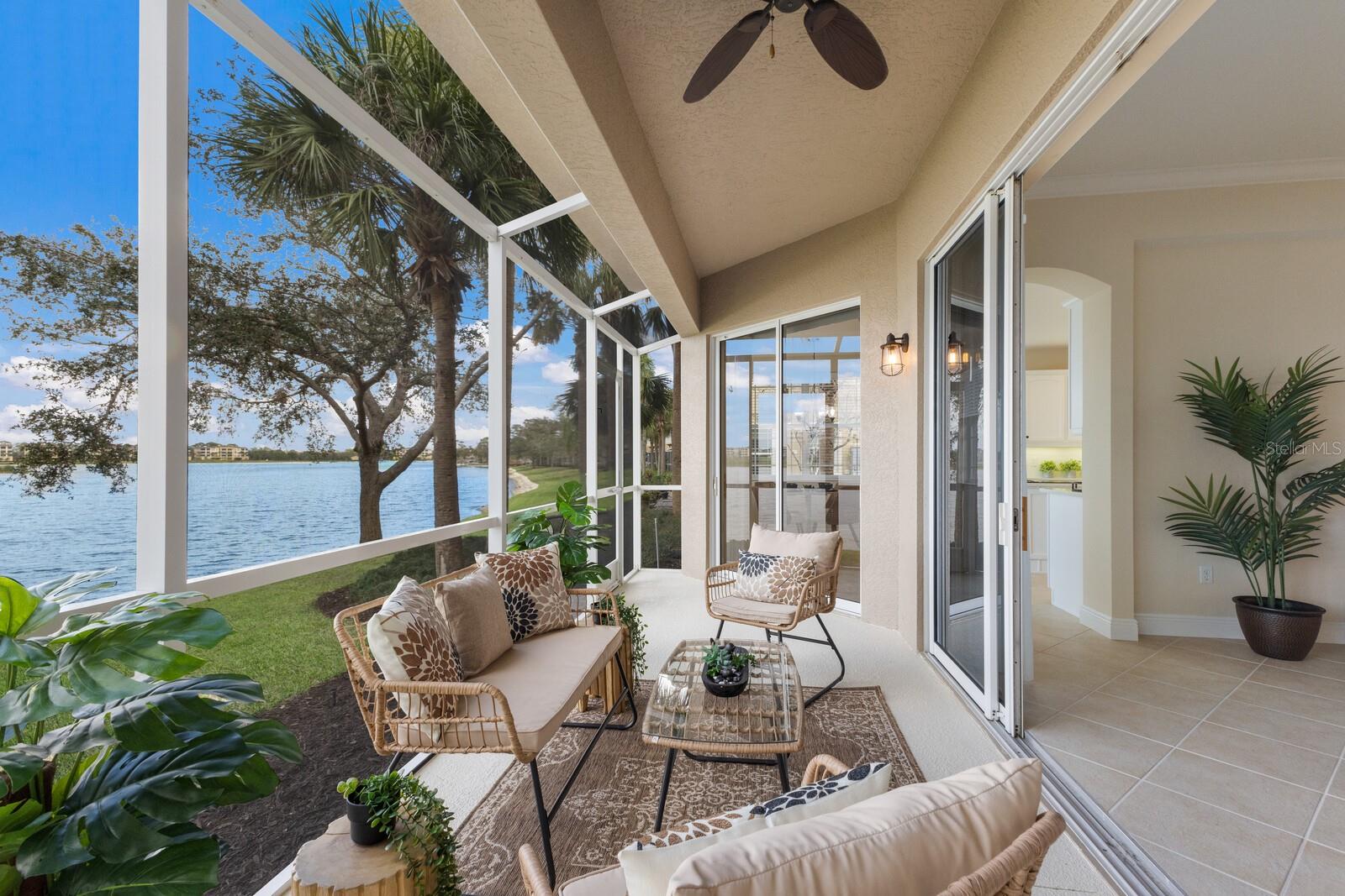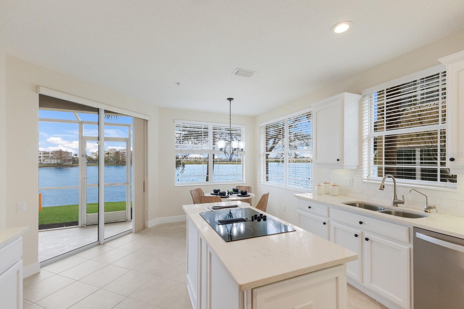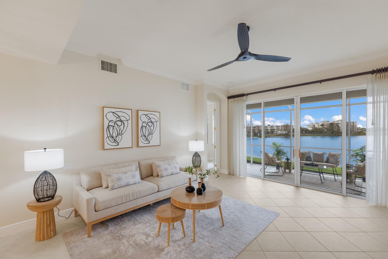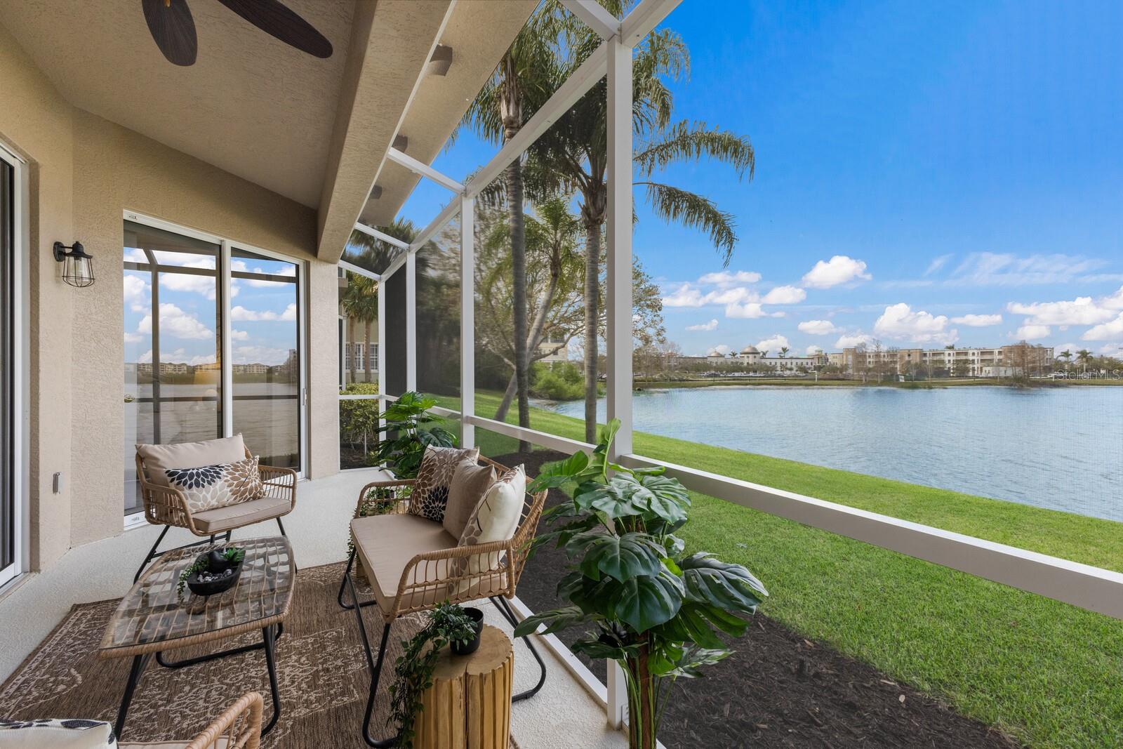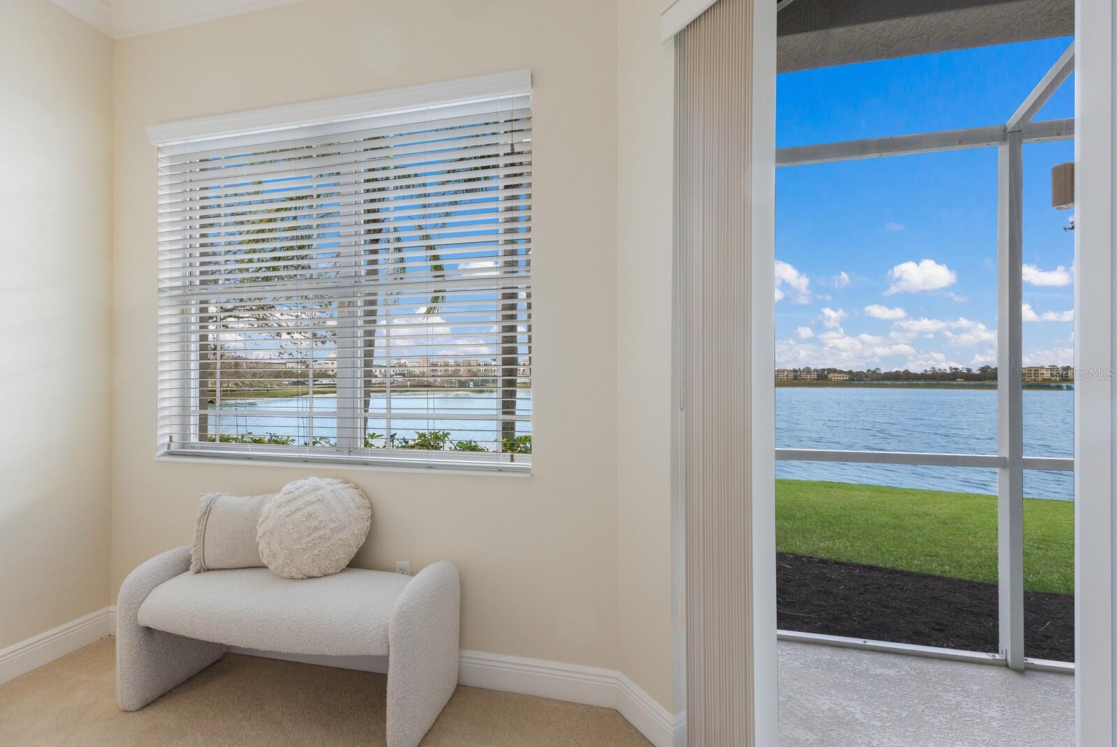 Welcome to The Moorings at Edgewater, a well-managed, gated waterfront community offering a maintenance-free lifestyle with amenities, just moments from Lakewood Main Street, Center Pointe, and University Town Center. This charming first-floor carriage home features breathtaking water views of Lake Uihlein from the kitchen, master bedroom, and living room. With a freshly painted interior, newly refreshed kitchen cabinets, and modern lighting and ceiling fans, this home is move-in ready. The thoughtfully designed floor plan includes two spacious bedrooms, each with its own private bath, plus an additional powder bath for guests. The kitchen is equipped with ample cabinet space, a center island with a cooktop, a cozy dinette area, and a wet bar with a beverage refrigerator--perfect for entertaining. There is a flex room perfect for an office, den, or even a third bedroom. Relax and enjoy the serene views of birds and wildlife from your screened lanai. The two-car garage has direct entry into the condo and a private side entrance, making it feel more like a single-family home than a condominium. The community amenities include a wonderful, heated pool and lounge area, grill, a fitness room, a library, a boardroom, and a social room with a catering kitchen. It is well-managed with an onsite property manager five days a week, all roofs replaced in the last four years, and landscape care included. Unique to The Moorings is a private island with a pier and an area to play Bocce Ball. Experience the perfect blend of convenience and leisure in this vibrant community. Residents of The Moorings enjoy a community atmosphere just around the corner from Lakewood Main Street's shopping, dining, movie theater, and scheduled events like car shows, Music on Main, holiday events, art shows, street markets, and more. Come see this lovely, easy-care home and learn why Lakewood Ranch has been heralded as the #1 multi-generational community in the USA for the last six years running!