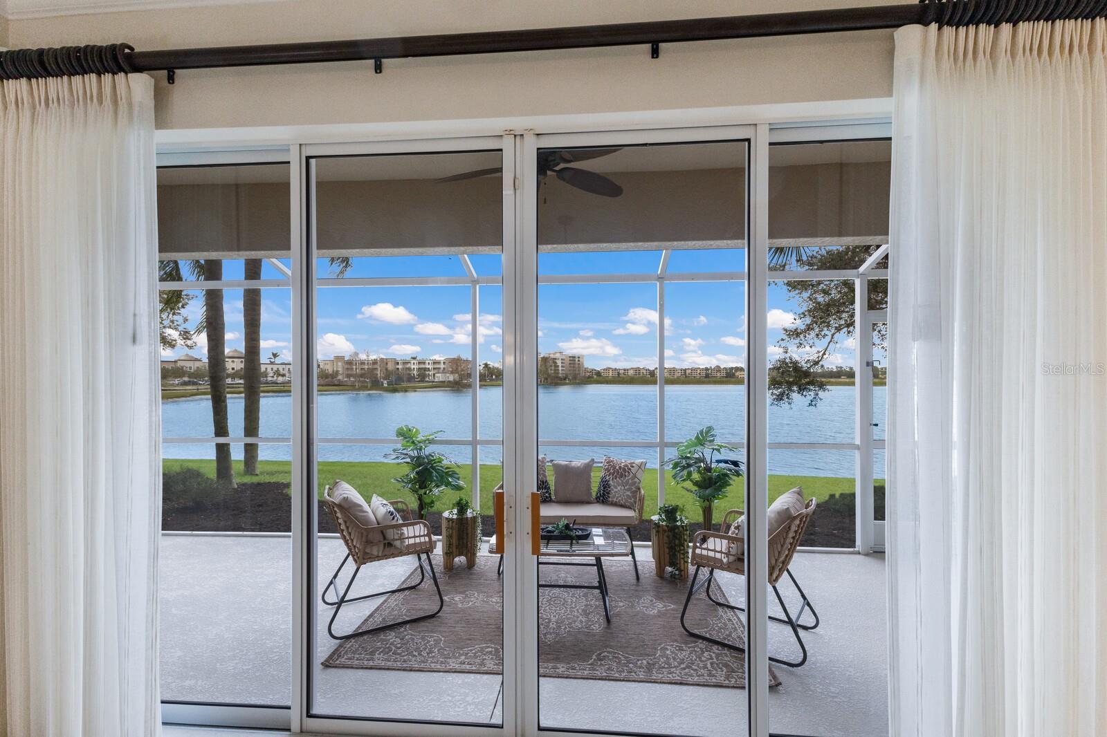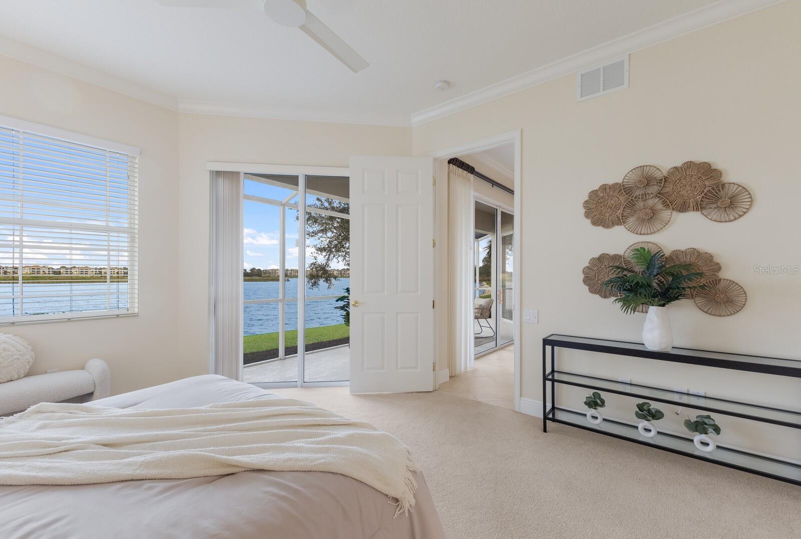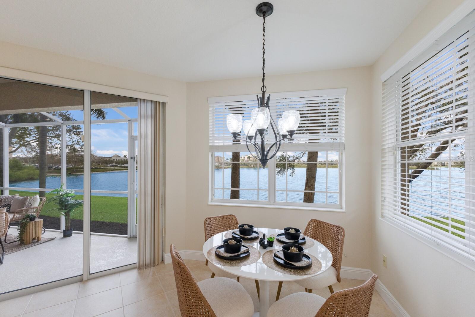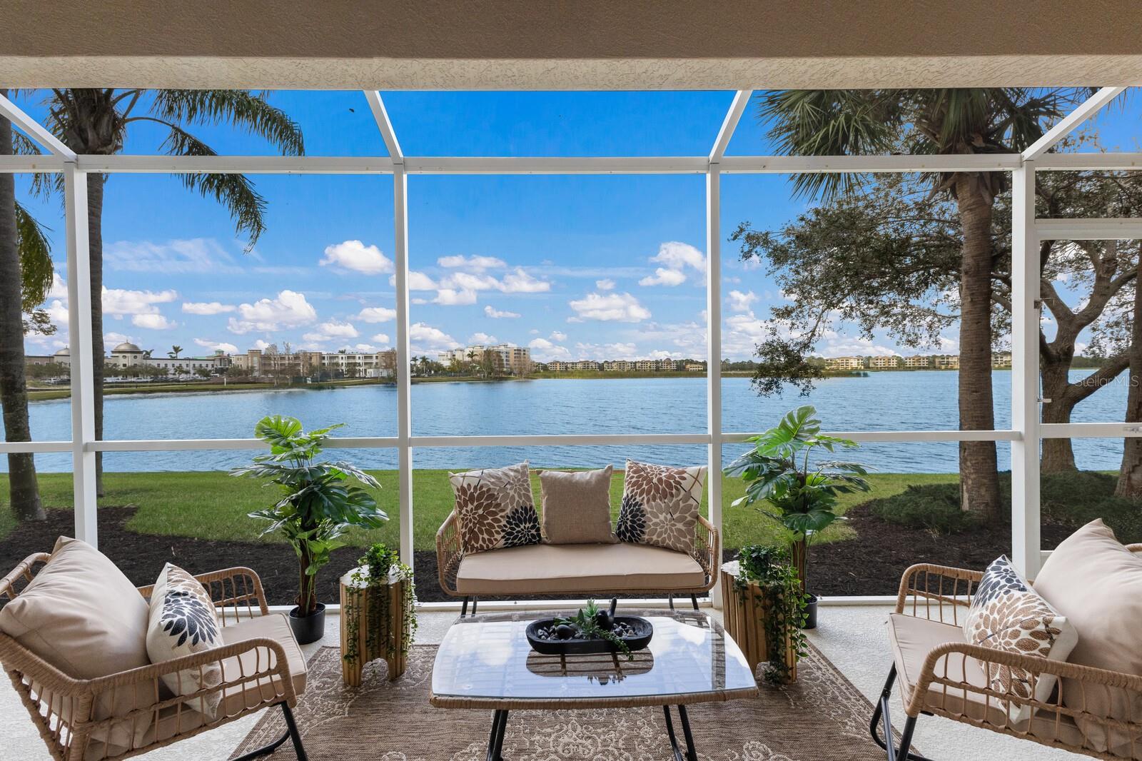Welcome to The Moorings at Edgewater, a well-managed, gated waterfront community offering a maintenance-free lifestyle with amenities, just moments from Lakewood Main Street, Center Pointe, and University Town Center. This charming first-floor carriage home features breathtaking water views of Lake Uihlein from the kitchen, master bedroom, and living room. With a freshly painted interior, newly refreshed kitchen cabinets, and modern lighting and ceiling fans, this home is move-in ready. The thoughtfully designed floor plan includes two spacious bedrooms, each with its own private bath, plus an additional powder bath for guests. The kitchen is equipped with ample cabinet space, a center island with a cooktop, a cozy dinette area, and a wet bar with a beverage refrigerator--perfect for entertaining. There is a flex room perfect for an office, den, or even a third bedroom. Relax and enjoy the serene views of birds and wildlife from your screened lanai. The two-car garage has direct entry into the condo and a private side entrance, making it feel more like a single-family home than a condominium. The community amenities include a wonderful, heated pool and lounge area, grill, a fitness room, a library, a boardroom, and a social room with a catering kitchen. It is well-managed with an onsite property manager five days a week, all roofs replaced in the last four years, and landscape care included. Unique to The Moorings is a private island with a pier and an area to play Bocce Ball. Experience the perfect blend of convenience and leisure in this vibrant community. Residents of The Moorings enjoy a community atmosphere just around the corner from Lakewood Main Street's shopping, dining, movie theater, and scheduled events like car shows, Music on Main, holiday events, art shows, street markets, and more. Come see this lovely, easy-care home and learn why Lakewood Ranch has been heralded as the #1 multi-generational community in the USA for the last six years running!
