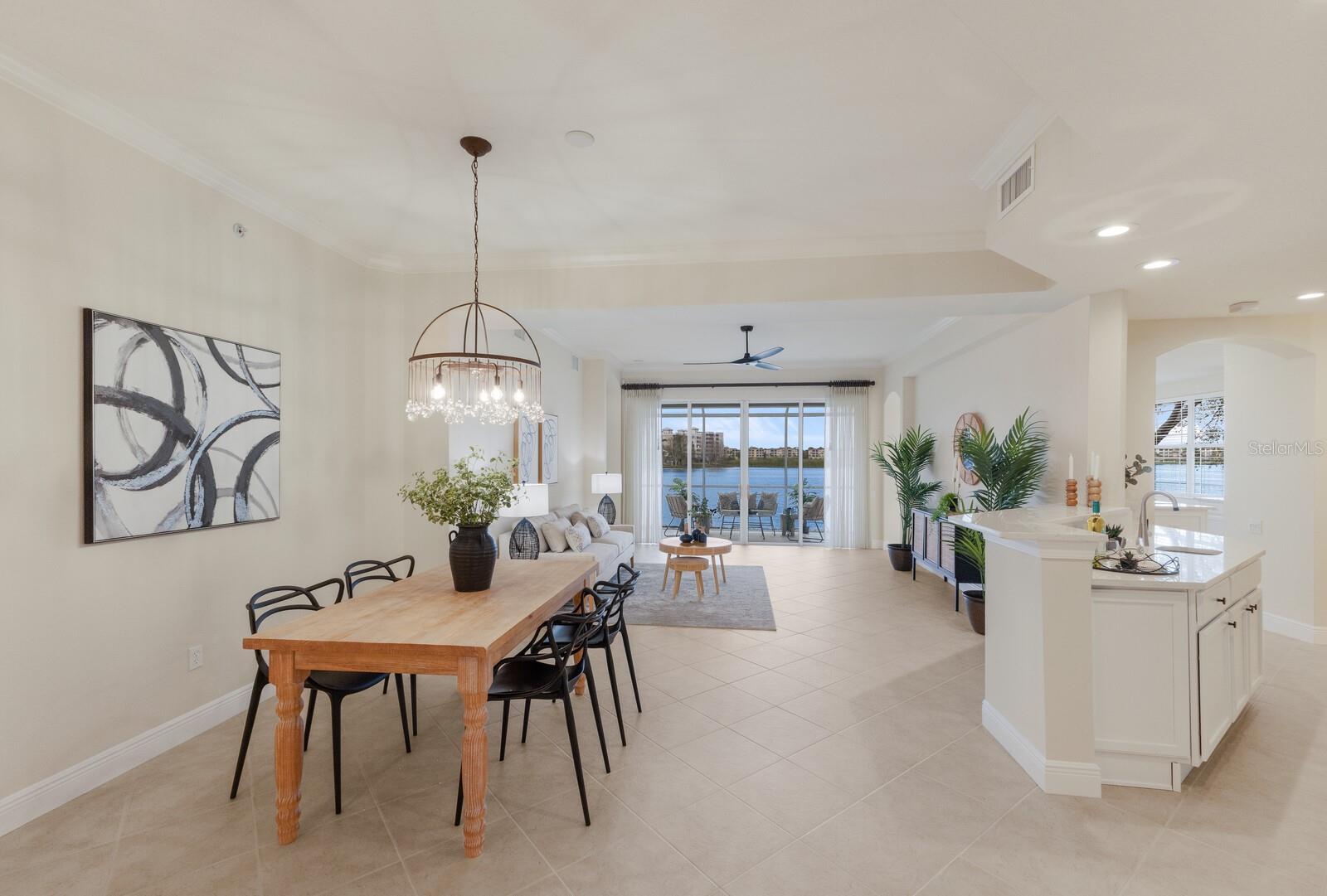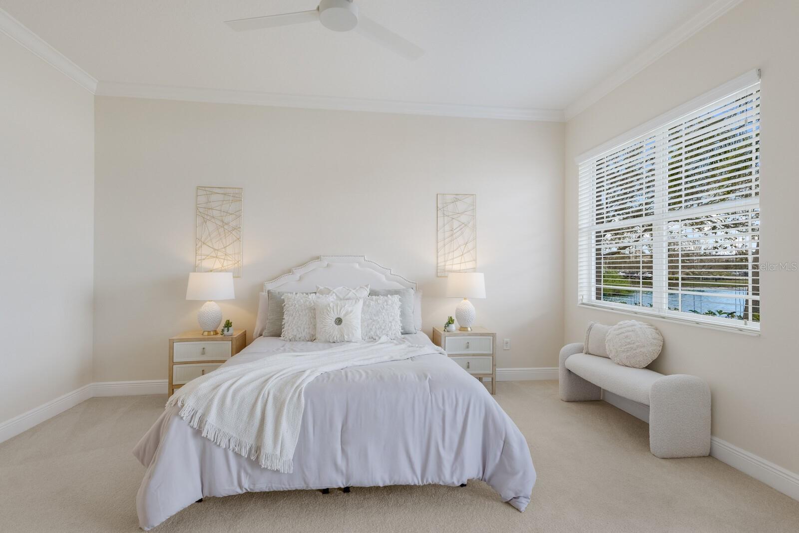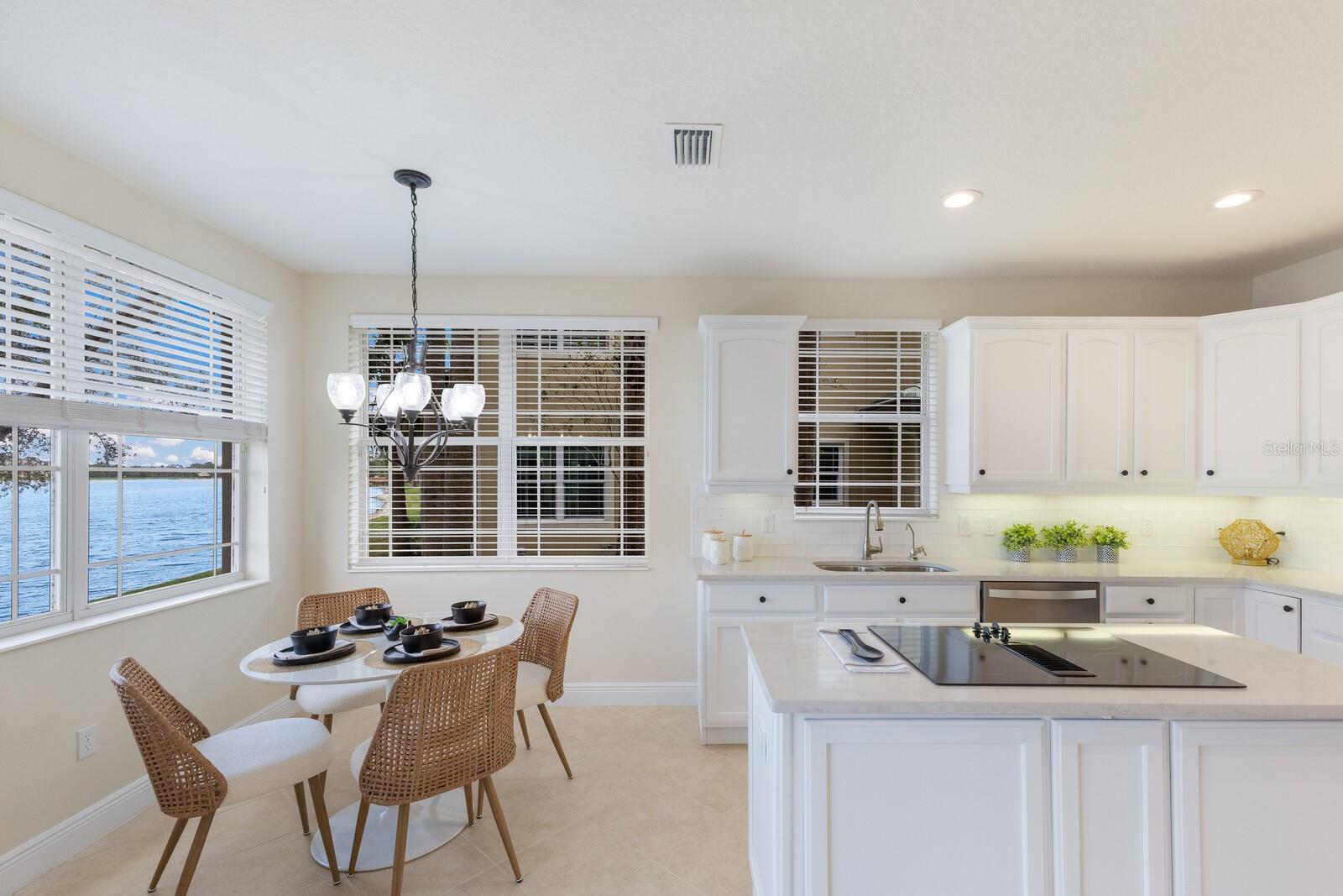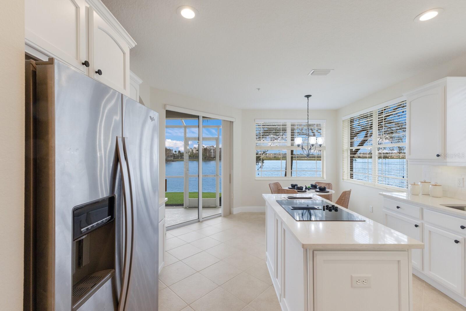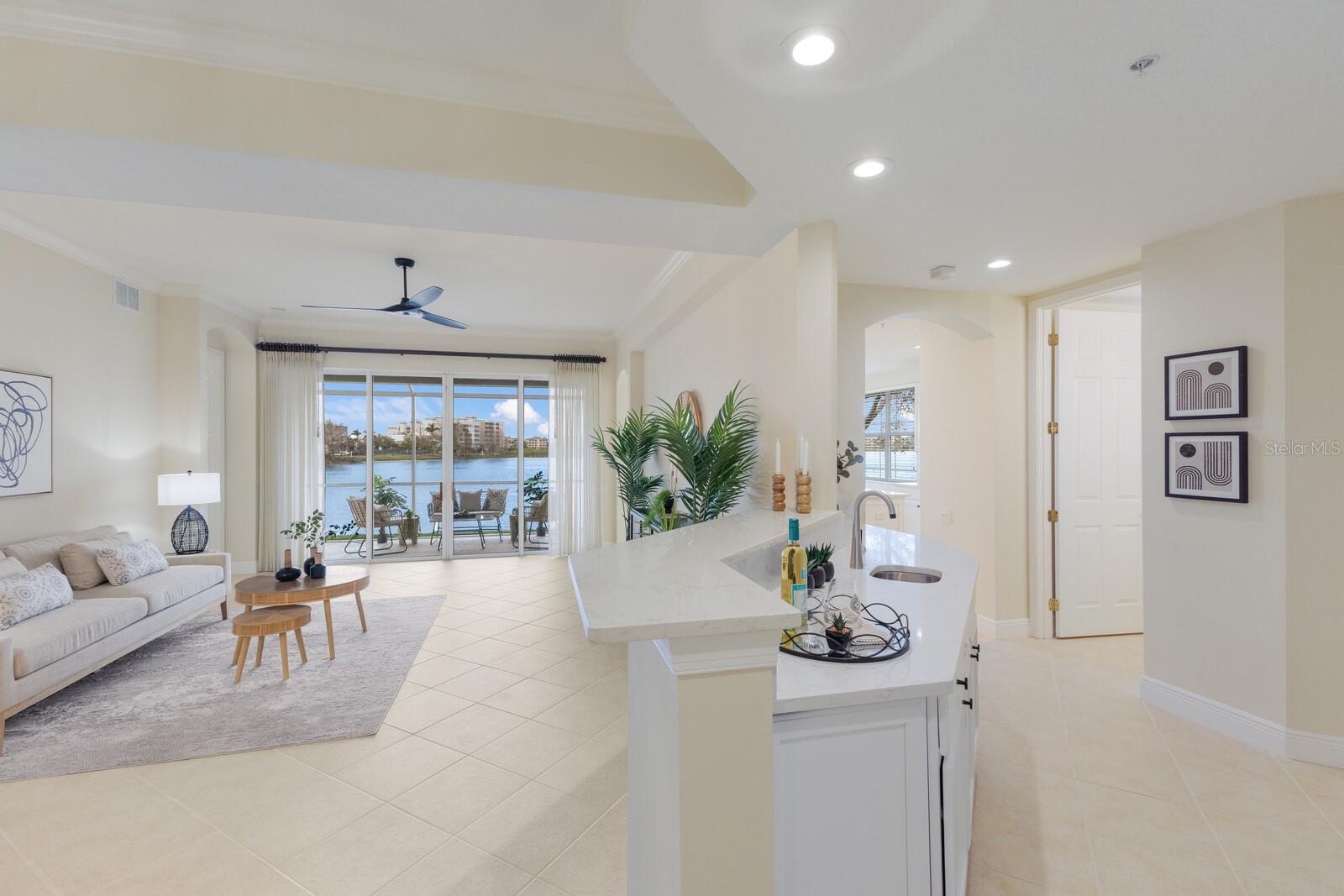 Welcome to The Moorings at Edgewater, a well-managed, gated waterfront community offering a maintenance-free lifestyle with amenities, just moments from Lakewood Main Street, Center Pointe, and University Town Center. This charming first-floor carriage home features breathtaking water views of Lake Uihlein from the kitchen, master bedroom, and living room. With a freshly painted interior, newly refreshed kitchen cabinets, and modern lighting and ceiling fans, this home is move-in ready. The thoughtfully designed floor plan includes two spacious bedrooms, each with its own private bath, plus an additional powder bath for guests. The kitchen is equipped with ample cabinet space, a center island with a cooktop, a cozy dinette area, and a wet bar with a beverage refrigerator--perfect for entertaining. There is a flex room perfect for an office, den, or even a third bedroom. Relax and enjoy the serene views of birds and wildlife from your screened lanai. The two-car garage has direct entry into the condo and a private side entrance, making it feel more like a single-family home than a condominium. The community amenities include a wonderful, heated pool and lounge area, grill, a fitness room, a library, a boardroom, and a social room with a catering kitchen. It is well-managed with an onsite property manager five days a week, all roofs replaced in the last four years, and landscape care included. Unique to The Moorings is a private island with a pier and an area to play Bocce Ball. Experience the perfect blend of convenience and leisure in this vibrant community. Residents of The Moorings enjoy a community atmosphere just around the corner from Lakewood Main Street's shopping, dining, movie theater, and scheduled events like car shows, Music on Main, holiday events, art shows, street markets, and more. Come see this lovely, easy-care home and learn why Lakewood Ranch has been heralded as the #1 multi-generational community in the USA for the last six years running!