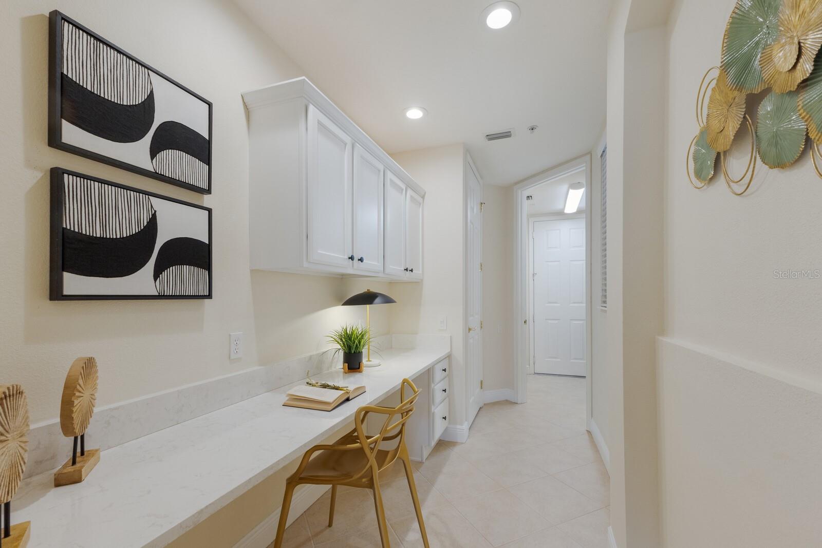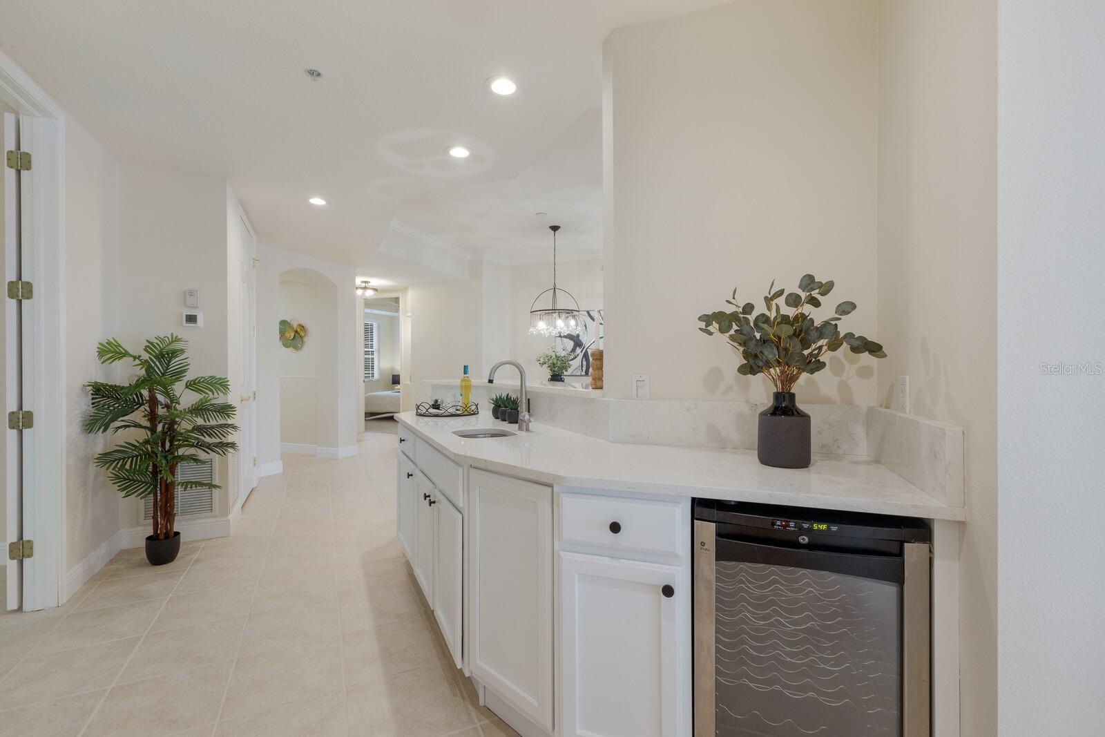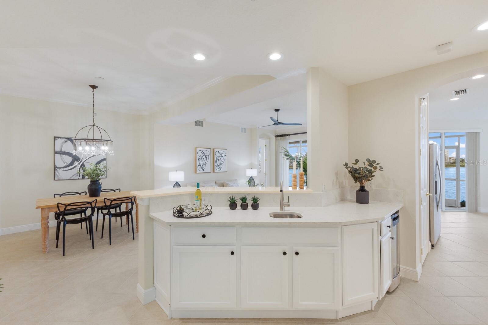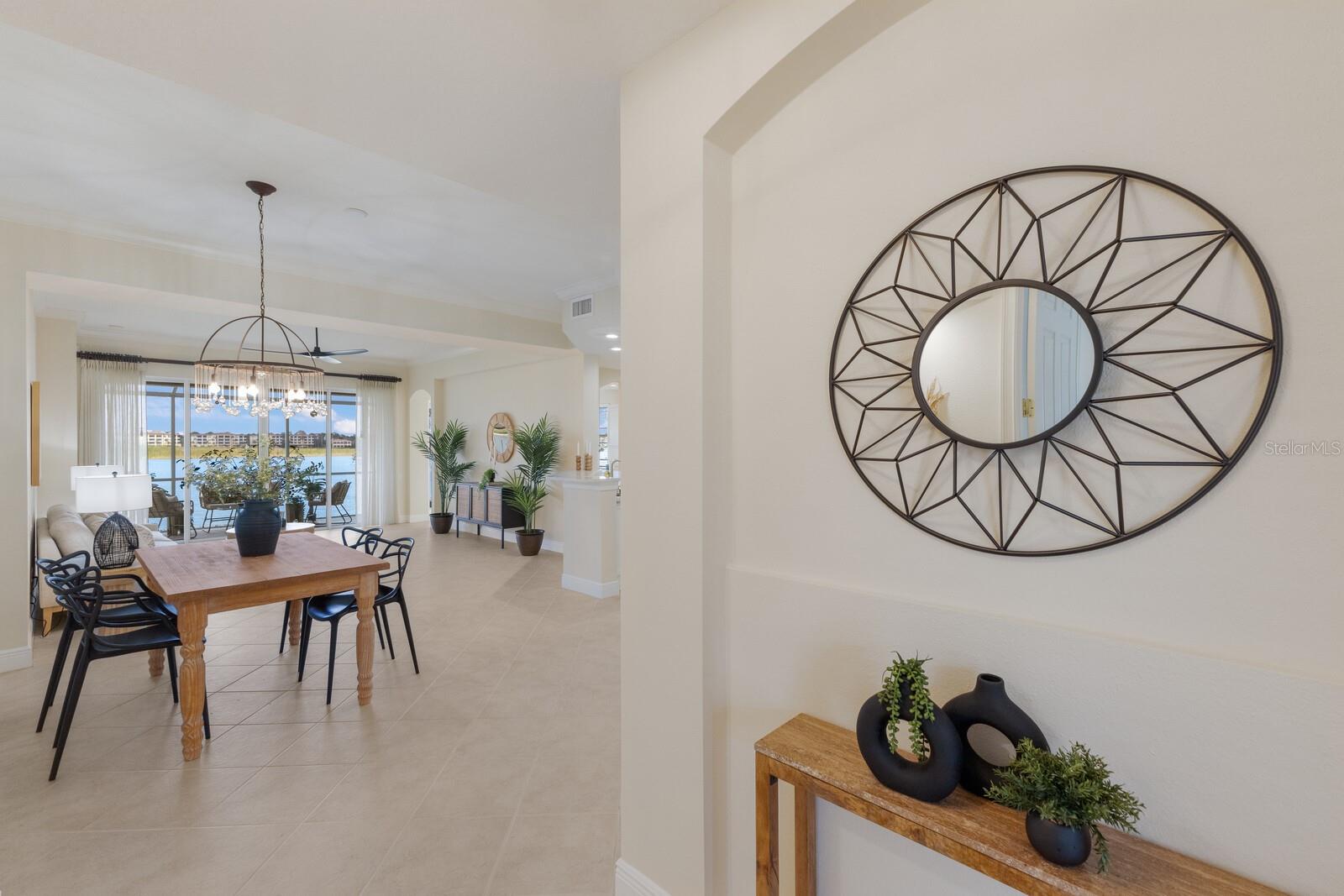 Welcome to The Moorings at Edgewater, a well-managed, gated waterfront community offering a maintenance-free lifestyle with amenities, just moments from Lakewood Main Street, Center Pointe, and University Town Center. This charming first-floor carriage home features breathtaking water views of Lake Uihlein from the kitchen, master bedroom, and living room. With a freshly painted interior, newly refreshed kitchen cabinets, and modern lighting and ceiling fans, this home is move-in ready. The thoughtfully designed floor plan includes two spacious bedrooms, each with its own private bath, plus an additional powder bath for guests. The kitchen is equipped with ample cabinet space, a center island with a cooktop, a cozy dinette area, and a wet bar with a beverage refrigerator--perfect for entertaining. There is a flex room perfect for an office, den, or even a third bedroom. Relax and enjoy the serene views of birds and wildlife from your screened lanai. The two-car garage has direct entry into the condo and a private side entrance, making it feel more like a single-family home than a condominium. The community amenities include a wonderful, heated pool and lounge area, grill, a fitness room, a library, a boardroom, and a social room with a catering kitchen. It is well-managed with an onsite property manager five days a week, all roofs replaced in the last four years, and landscape care included. Unique to The Moorings is a private island with a pier and an area to play Bocce Ball. Experience the perfect blend of convenience and leisure in this vibrant community. Residents of The Moorings enjoy a community atmosphere just around the corner from Lakewood Main Street's shopping, dining, movie theater, and scheduled events like car shows, Music on Main, holiday events, art shows, street markets, and more. Come see this lovely, easy-care home and learn why Lakewood Ranch has been heralded as the #1 multi-generational community in the USA for the last six years running!