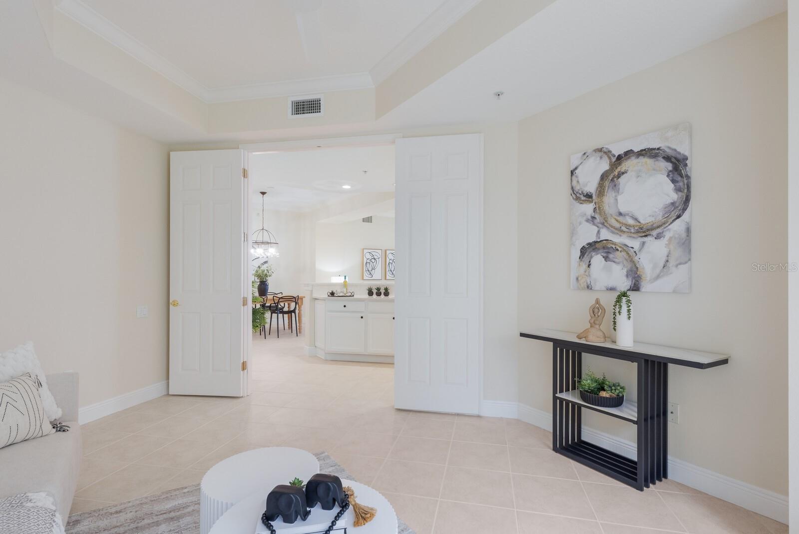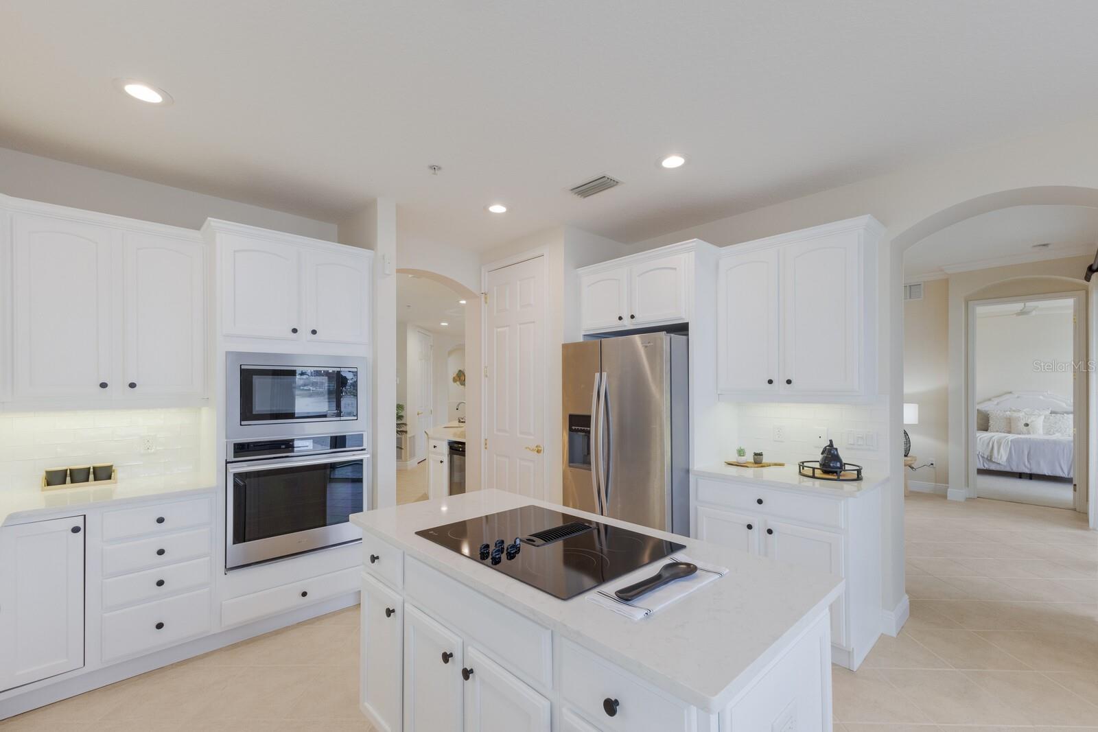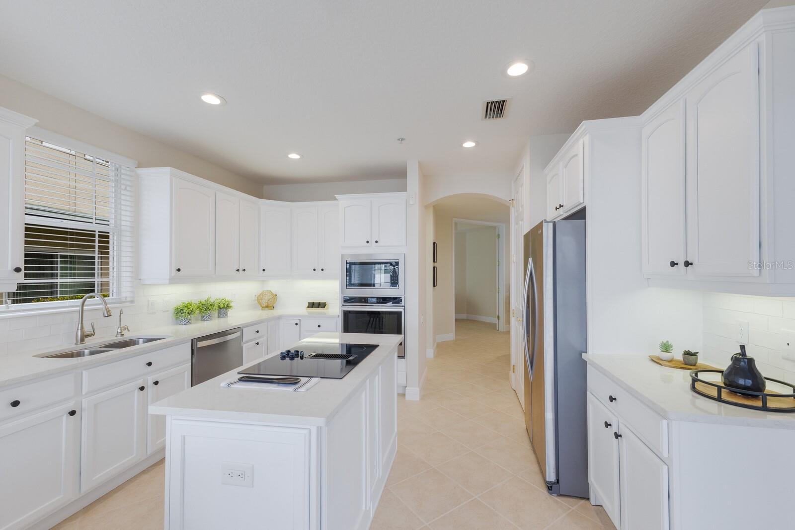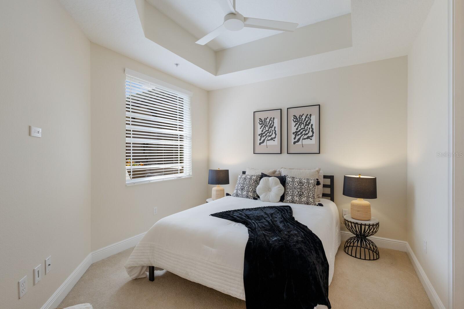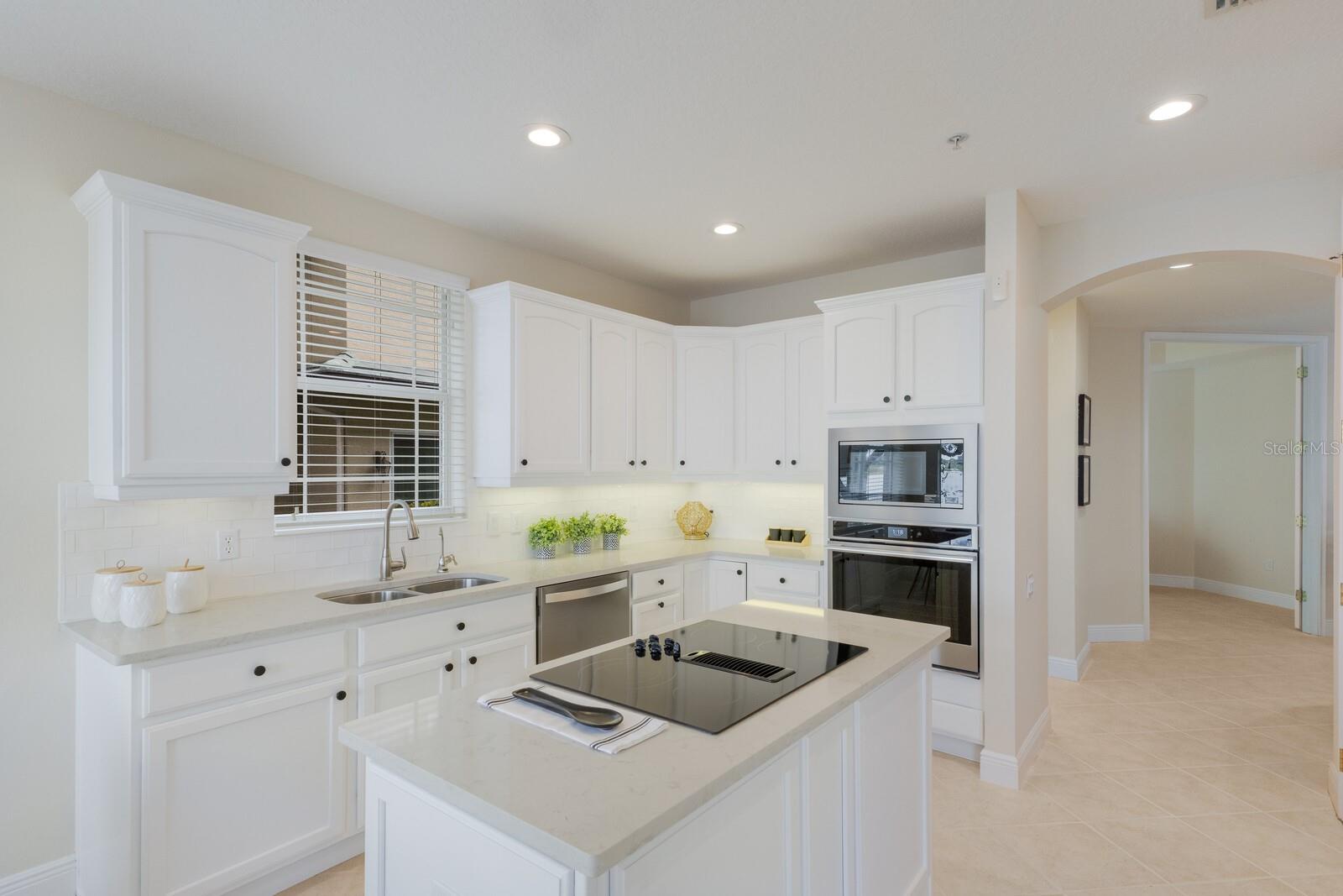 Welcome to The Moorings at Edgewater, a well-managed, gated waterfront community offering a maintenance-free lifestyle with amenities, just moments from Lakewood Main Street, Center Pointe, and University Town Center. This charming first-floor carriage home features breathtaking water views of Lake Uihlein from the kitchen, master bedroom, and living room. With a freshly painted interior, newly refreshed kitchen cabinets, and modern lighting and ceiling fans, this home is move-in ready. The thoughtfully designed floor plan includes two spacious bedrooms, each with its own private bath, plus an additional powder bath for guests. The kitchen is equipped with ample cabinet space, a center island with a cooktop, a cozy dinette area, and a wet bar with a beverage refrigerator--perfect for entertaining. There is a flex room perfect for an office, den, or even a third bedroom. Relax and enjoy the serene views of birds and wildlife from your screened lanai. The two-car garage has direct entry into the condo and a private side entrance, making it feel more like a single-family home than a condominium. The community amenities include a wonderful, heated pool and lounge area, grill, a fitness room, a library, a boardroom, and a social room with a catering kitchen. It is well-managed with an onsite property manager five days a week, all roofs replaced in the last four years, and landscape care included. Unique to The Moorings is a private island with a pier and an area to play Bocce Ball. Experience the perfect blend of convenience and leisure in this vibrant community. Residents of The Moorings enjoy a community atmosphere just around the corner from Lakewood Main Street's shopping, dining, movie theater, and scheduled events like car shows, Music on Main, holiday events, art shows, street markets, and more. Come see this lovely, easy-care home and learn why Lakewood Ranch has been heralded as the #1 multi-generational community in the USA for the last six years running!