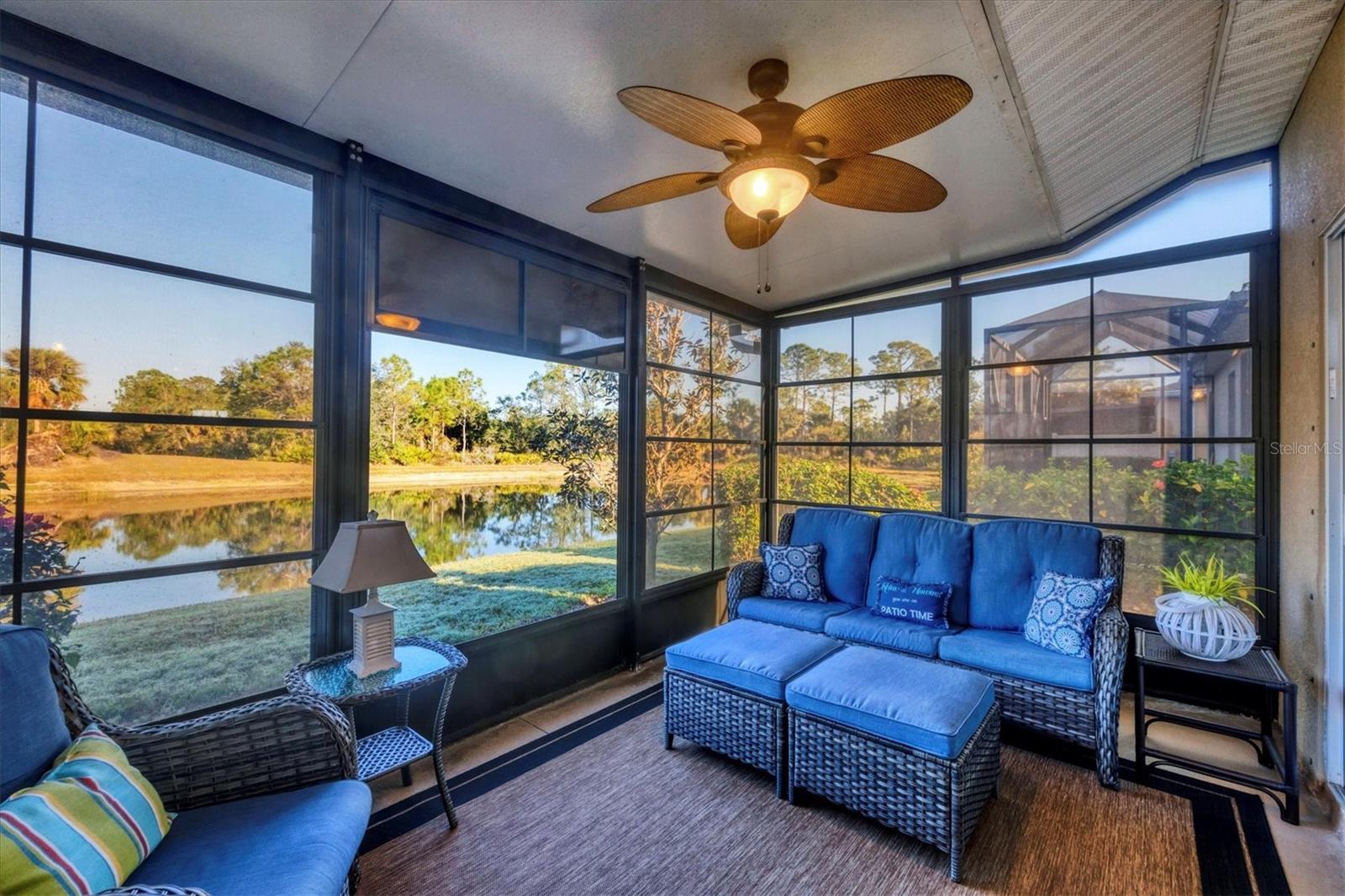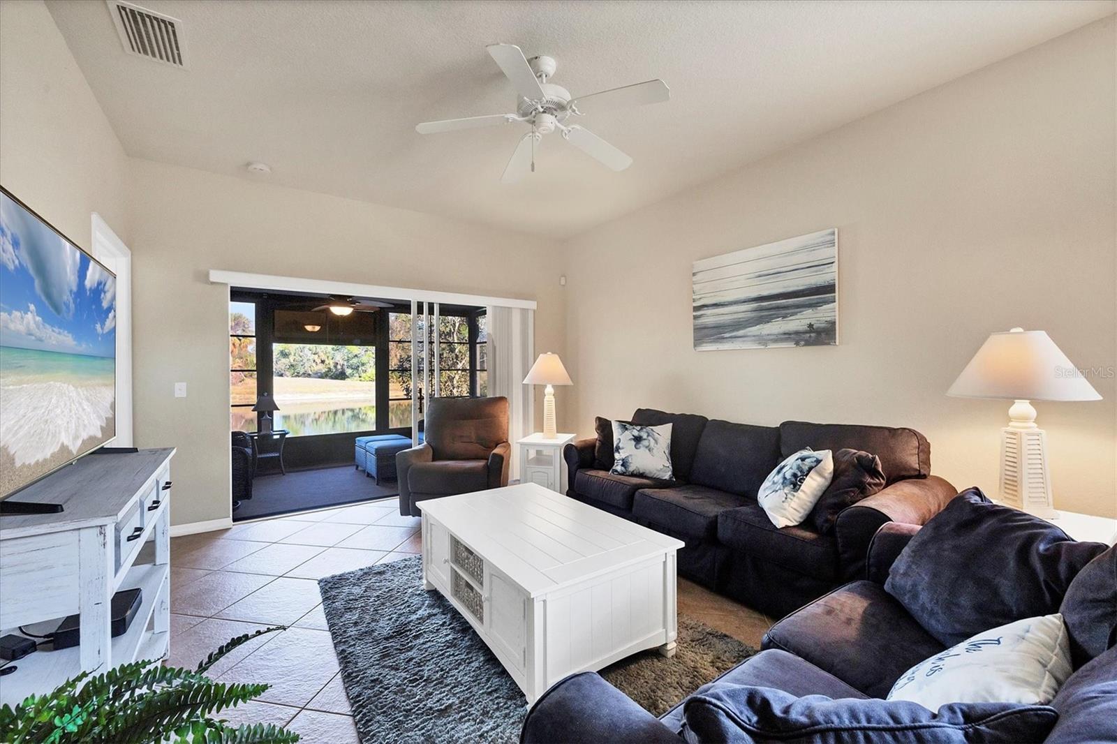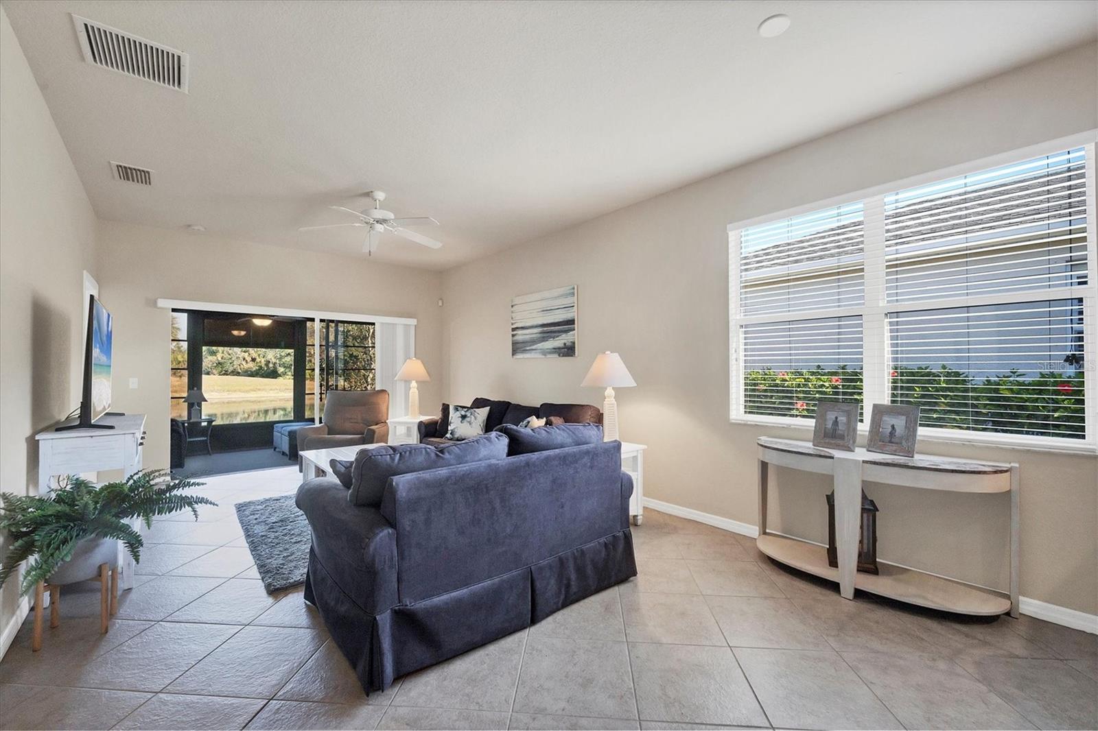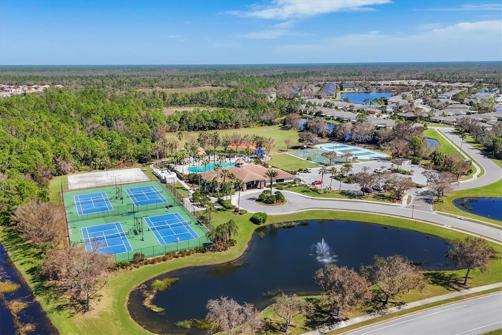 Move-in ready, water lot, 2-car garage, and turn-key furnished with a NEW ROOF in beautiful Stoneybrook at Venice. Owners have only occupied the home 5 months/year for the last 10 years! Beautiful landscaping leads to a screened entry and glass front door. It's sited on an ideal water lot, has a wonderful open floor plan, and it is a short walk to ALL the amenities Stoneybrook at Venice offers. Upon entering, your eyes are drawn to the fabulous water view in the back of the home! The dcor is neutral, there is an abundance of natural light, and the lanai/Florida room is spacious, comfortable, and a perfect spot to share a cocktail and enjoy the wildlife and view! The flooring throughout the common areas is done in a neutral ceramic tile, set on the diagonal, and the bedrooms are covered in a beige carpet. The kitchen is spacious and offers a separate, eat-in breakfast nook with a window, a nice pantry, and a breakfast bar. The cabinets are a warm, medium brown finish with slide-out drawers and the granite countertops compliment the tile flooring. The primary suite is spacious with a double window, a ceiling fan, and a beautiful water view. The en suite bath has a double vanity, granite counters, a large walk-in closet, ceiling fan, and a separate tiled shower. Two additional bedrooms with ceiling fans and roomy closets that share a second bath are perfect for guests and/or offices. Stoneybrook offers a fabulous, active clubhouse for both adult and family functions -- cards, meetings, library, parties, coffee, music, barbecues, holiday entertainment, etc. There's also a kitchen, media room, spa, pool, pool music, splash fountain, fitness center, tennis, pickleball, volleyball, basketball AND . . . just steps away! Additionally, Stoneybrook at Venice is conveniently located close to several beaches and historic, downtown Venice.