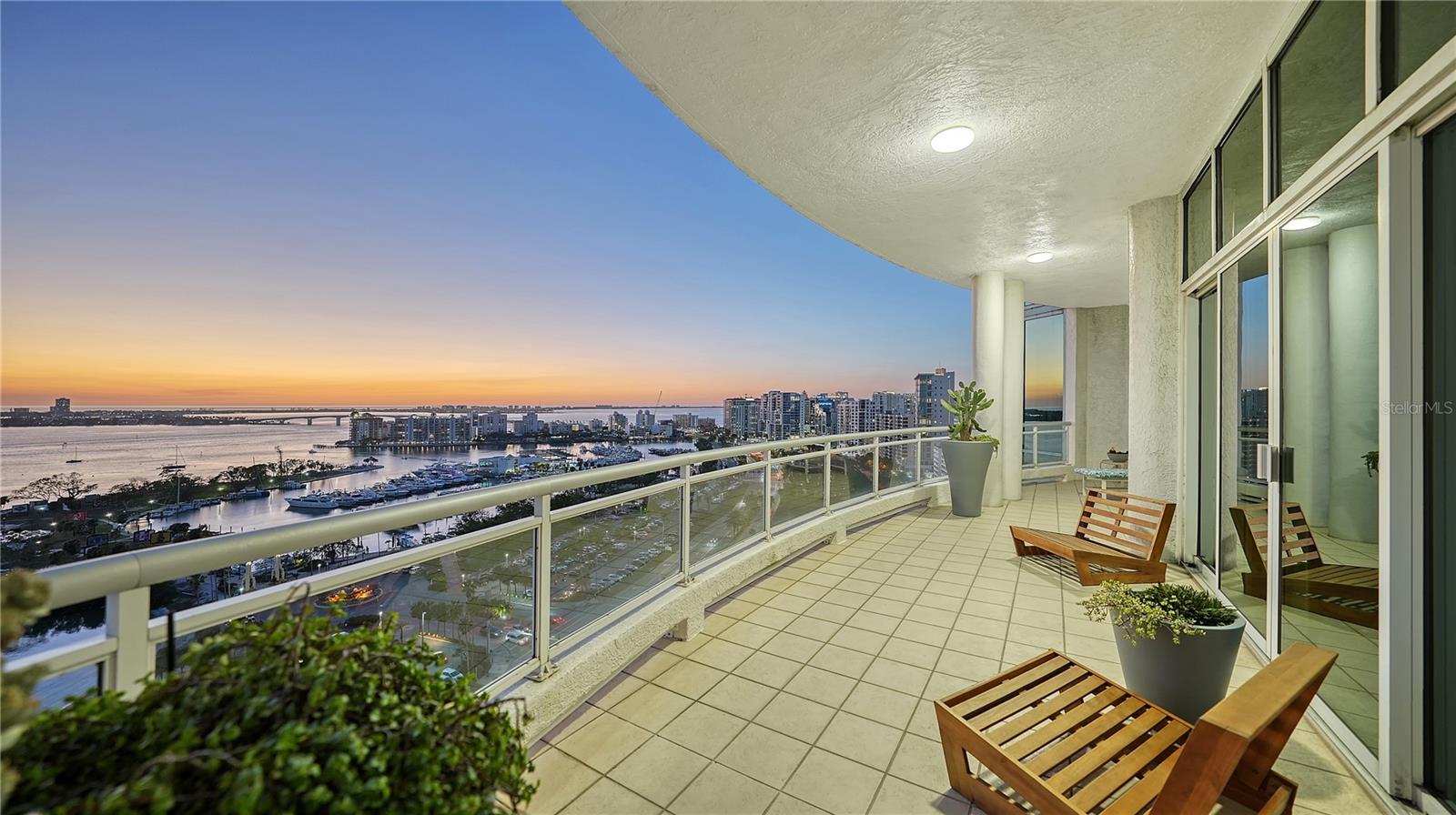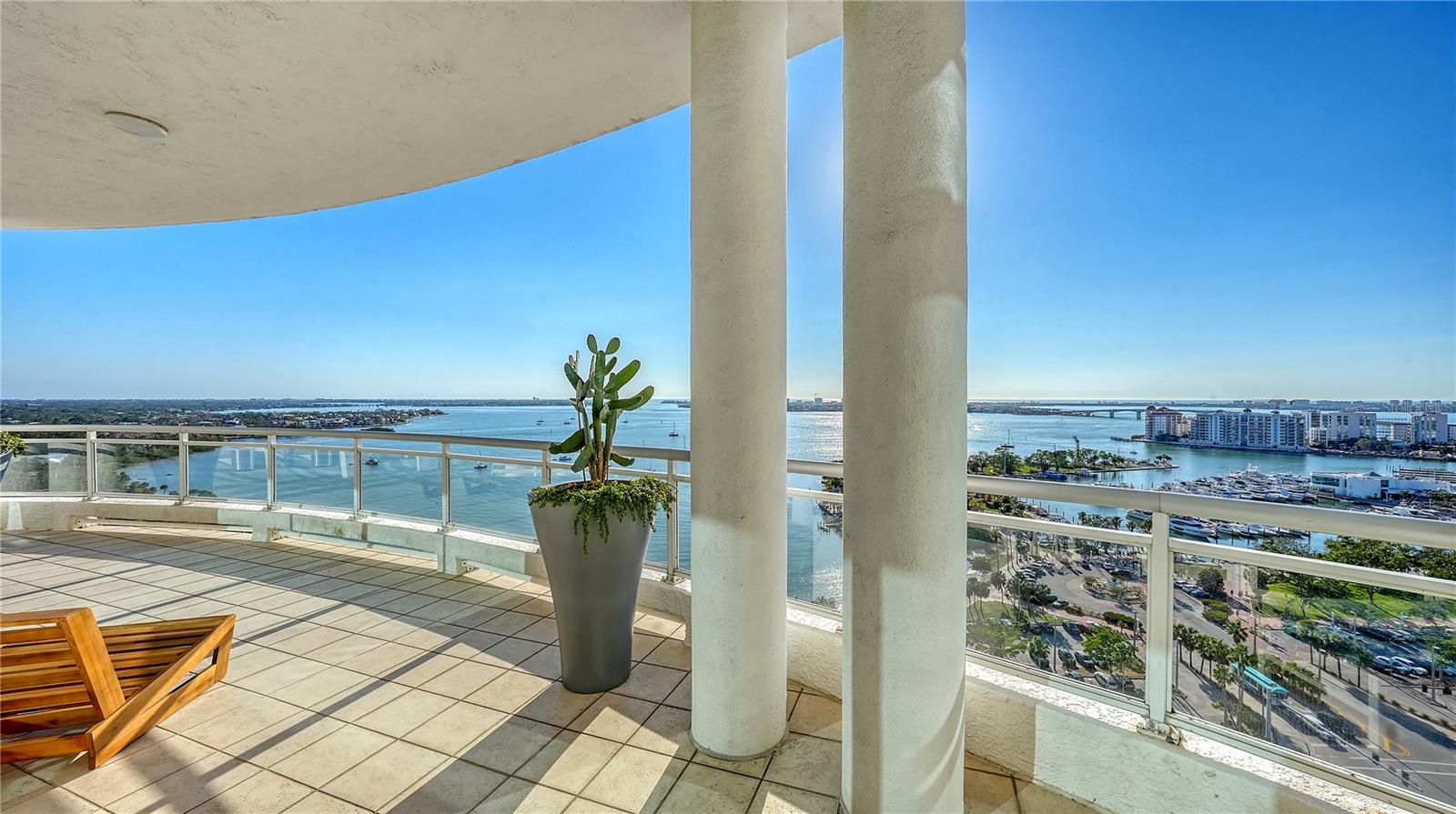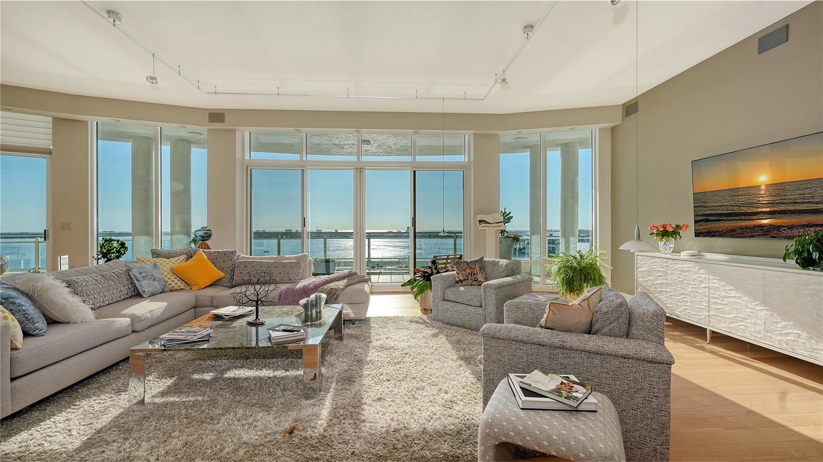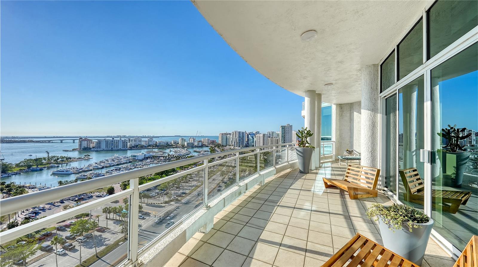 A gallery of luxury and good taste in this 16th-floor Sarabande penthouse. A privately keyed elevator takes you to the 16th floor. Enter and be inspired as you wander through the space that brings you the living room and a breathtaking view of Sarasota Bay, the newly reopened Midnight Pass, and the Gulf of Mexico. This 3,200-square-foot high-ceilinged penthouse was designed to create a sense of comfort and an invitation to congregate with family and friends. Solid-core doors, hardwood floors throughout, custom built-ins, designer lighting, and architectural details enhance the ambiance. And everywhere, there is light and an ever-changing, unobstructed view of the beautiful bay and marina. The chef's kitchen was designed for entertainment and equipped with high-end appliances. The bathrooms are in keeping with the condo's quality and style. The Penthouse is graced with an oversized terrace extending the entire length on the Bay Side, with access from the guest bedroom. There is a second private terrace off the Master Suite with a small adjacent room suited for an office. The Penthouse has three bedrooms (one bedroom is currently used as an office), 2.5 baths. Sarabande residents enjoy the convenience of full-time concierge and security services. They are steps away from cultural events and downtown restaurants.