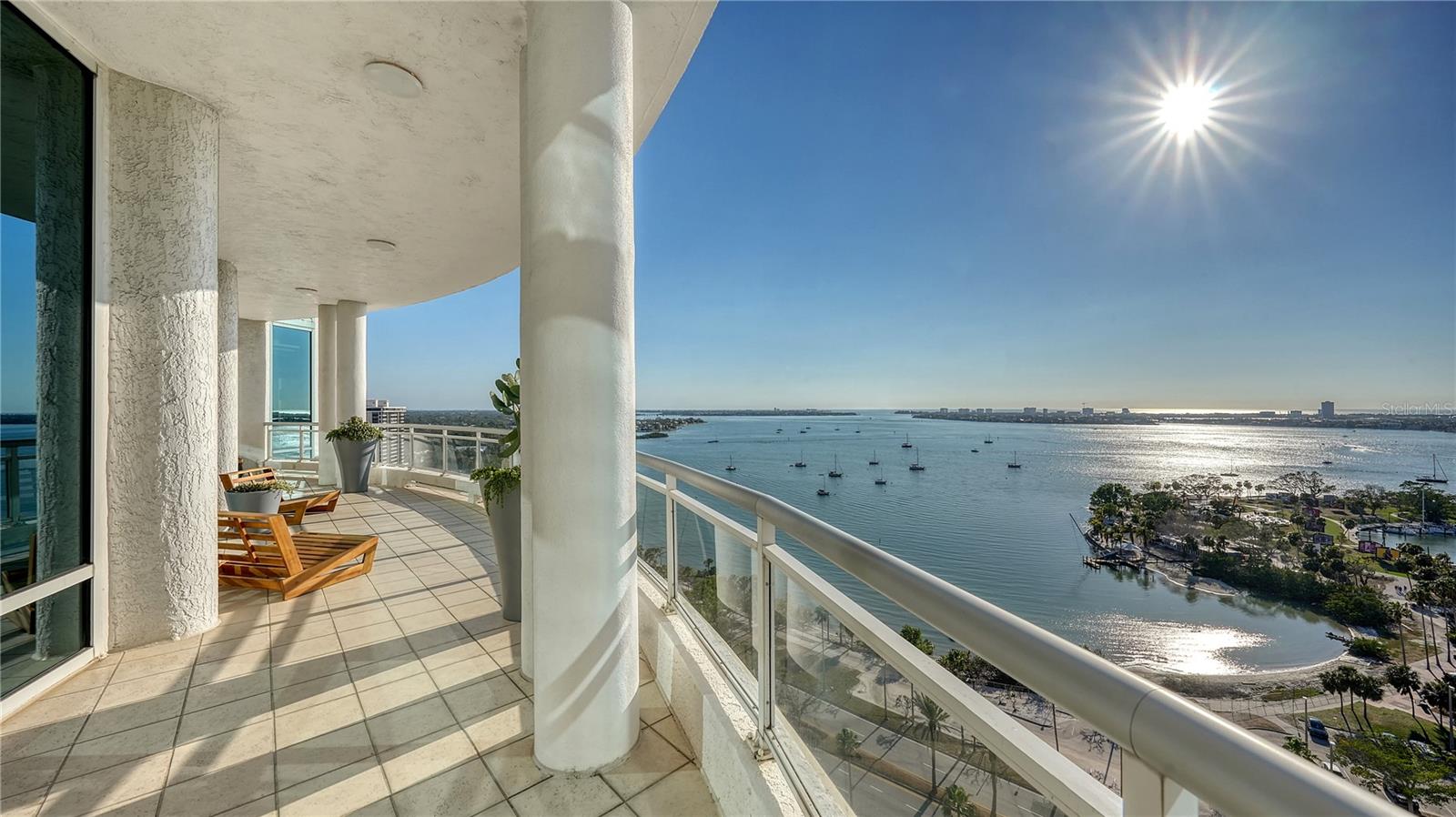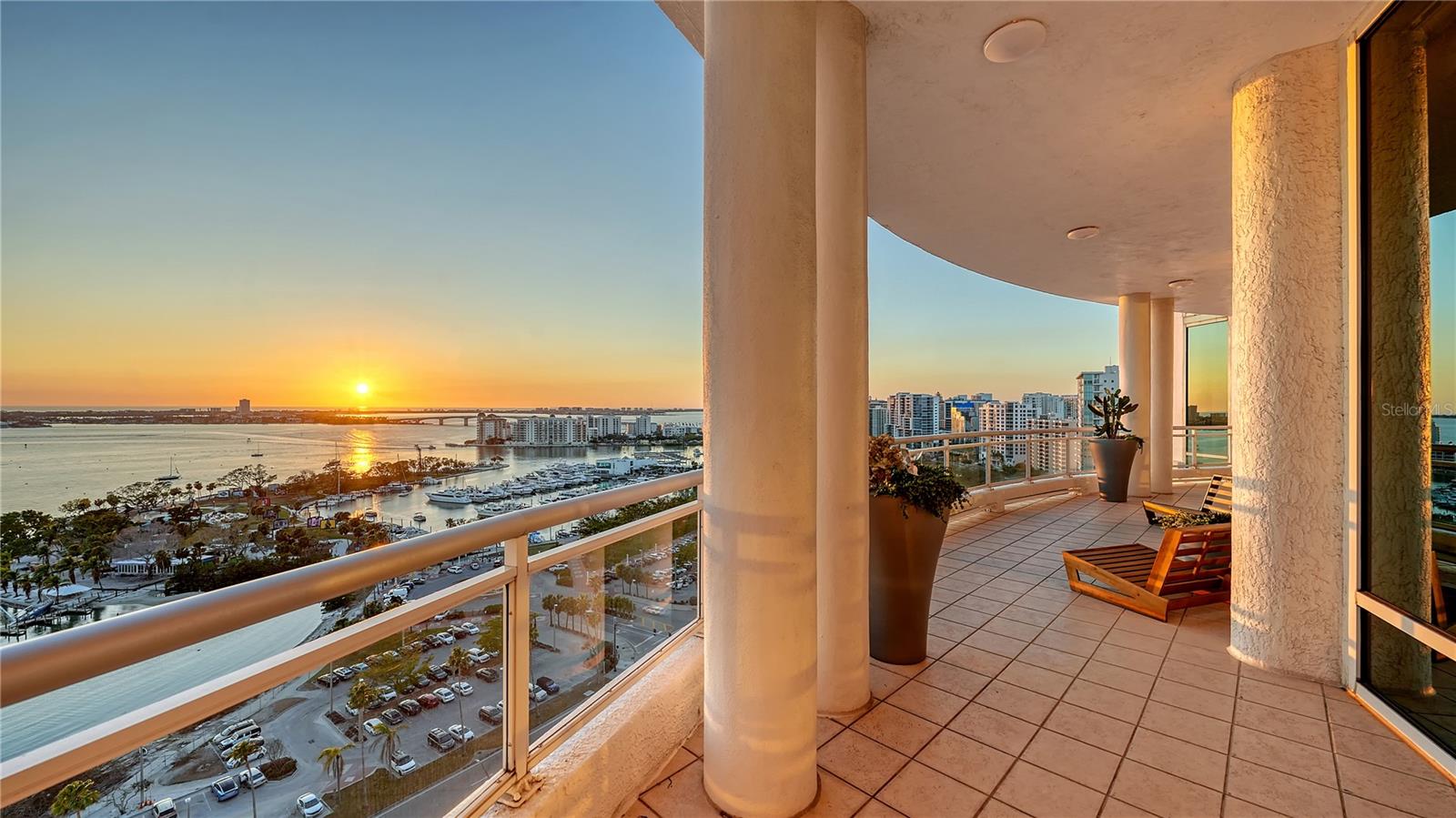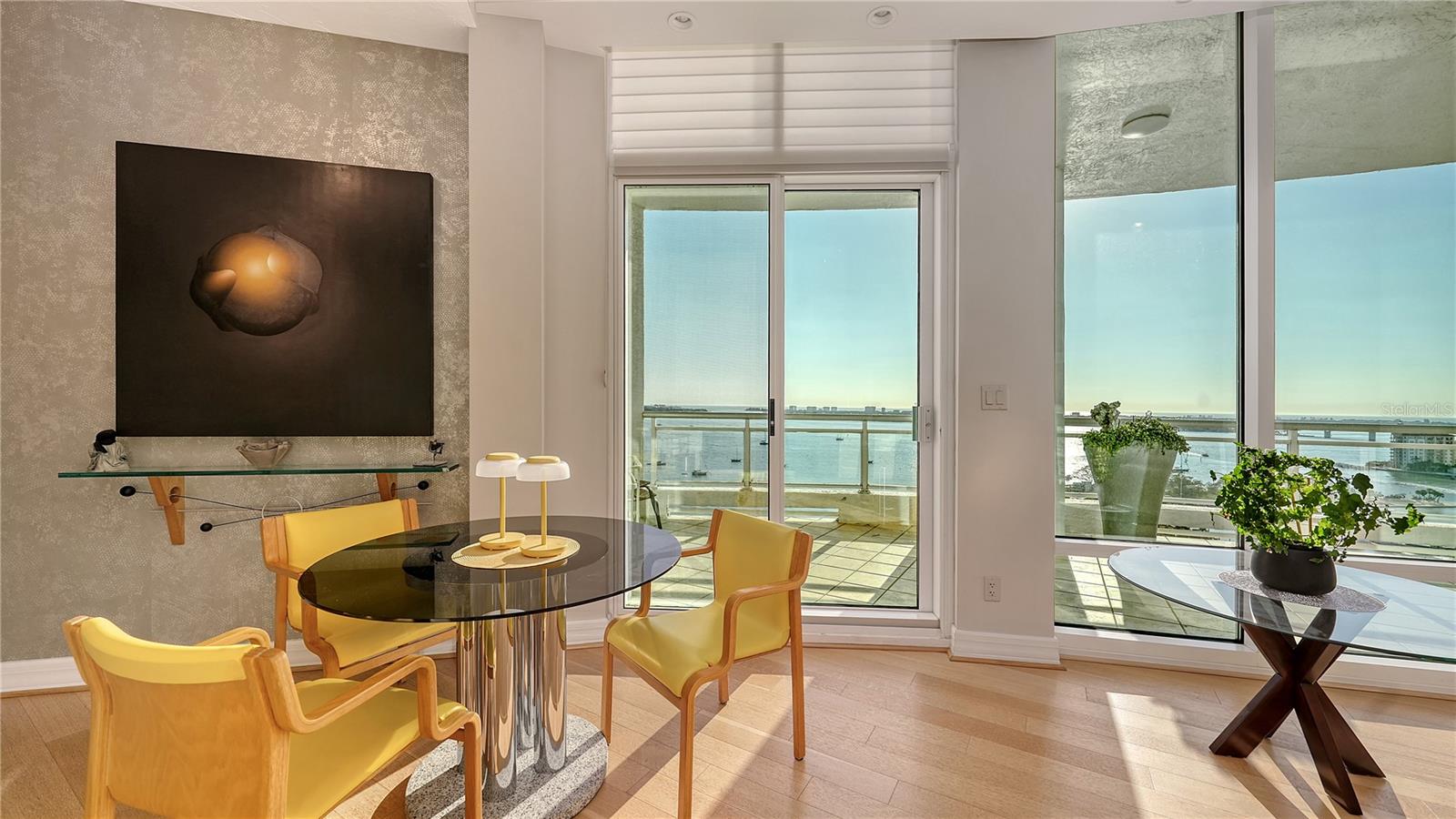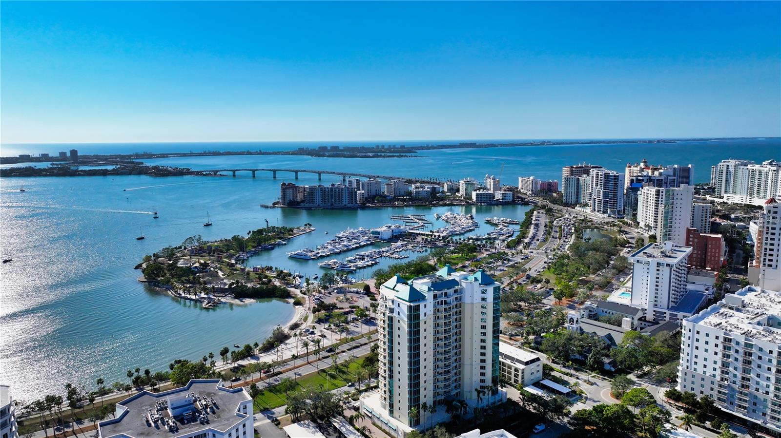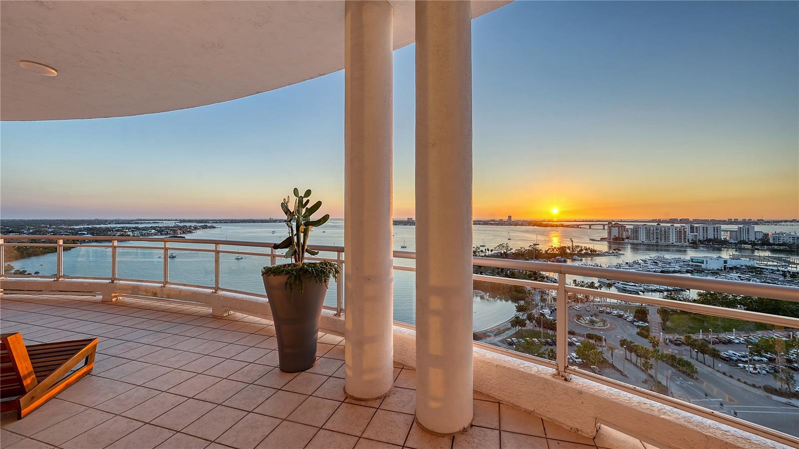 A gallery of luxury and good taste in this 16th-floor Sarabande penthouse. A privately keyed elevator takes you to the 16th floor. Enter and be inspired as you wander through the space that brings you the living room and a breathtaking view of Sarasota Bay, the newly reopened Midnight Pass, and the Gulf of Mexico. This 3,200-square-foot high-ceilinged penthouse was designed to create a sense of comfort and an invitation to congregate with family and friends. Solid-core doors, hardwood floors throughout, custom built-ins, designer lighting, and architectural details enhance the ambiance. And everywhere, there is light and an ever-changing, unobstructed view of the beautiful bay and marina. The chef's kitchen was designed for entertainment and equipped with high-end appliances. The bathrooms are in keeping with the condo's quality and style. The Penthouse is graced with an oversized terrace extending the entire length on the Bay Side, with access from the guest bedroom. There is a second private terrace off the Master Suite with a small adjacent room suited for an office. The Penthouse has three bedrooms (one bedroom is currently used as an office), 2.5 baths. Sarabande residents enjoy the convenience of full-time concierge and security services. They are steps away from cultural events and downtown restaurants.