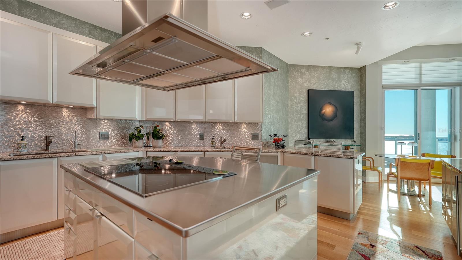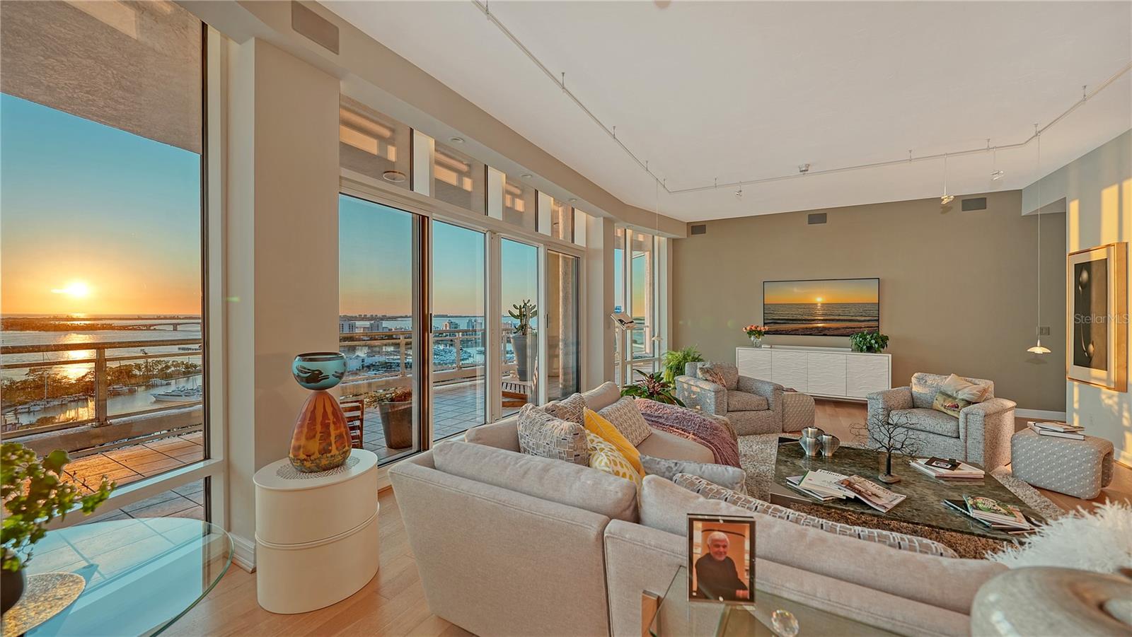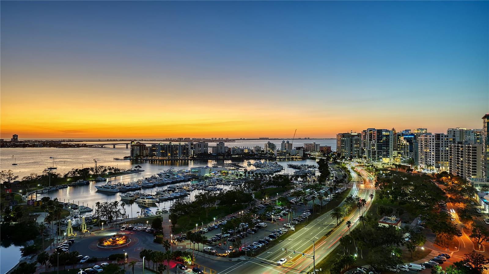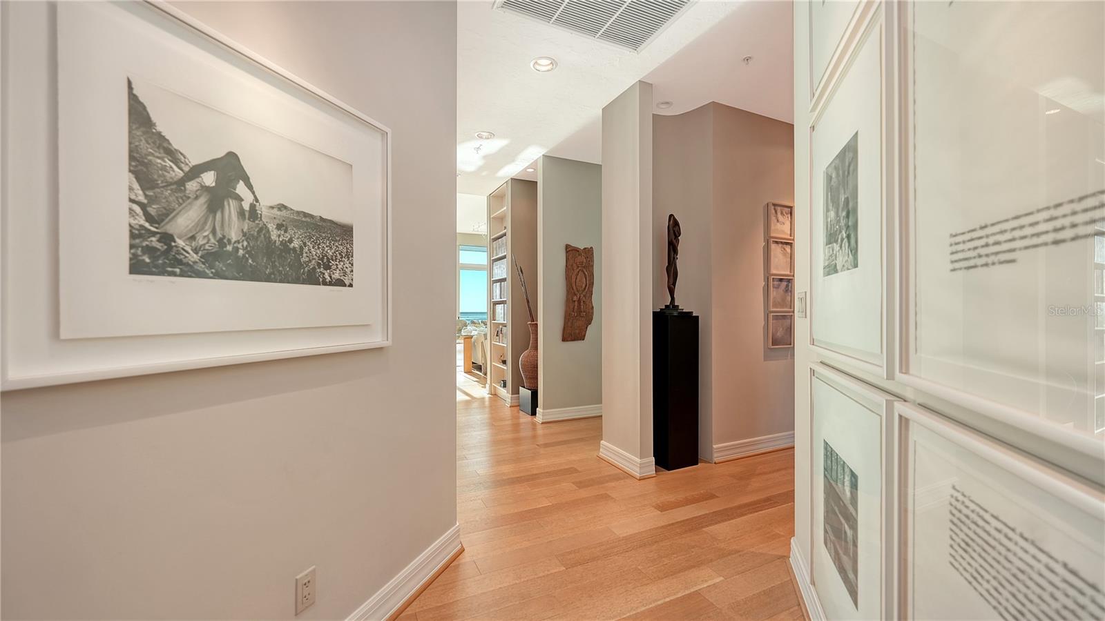 A gallery of luxury and good taste in this 16th-floor Sarabande penthouse. A privately keyed elevator takes you to the 16th floor. Enter and be inspired as you wander through the space that brings you the living room and a breathtaking view of Sarasota Bay, the newly reopened Midnight Pass, and the Gulf of Mexico. This 3,200-square-foot high-ceilinged penthouse was designed to create a sense of comfort and an invitation to congregate with family and friends. Solid-core doors, hardwood floors throughout, custom built-ins, designer lighting, and architectural details enhance the ambiance. And everywhere, there is light and an ever-changing, unobstructed view of the beautiful bay and marina. The chef's kitchen was designed for entertainment and equipped with high-end appliances. The bathrooms are in keeping with the condo's quality and style. The Penthouse is graced with an oversized terrace extending the entire length on the Bay Side, with access from the guest bedroom. There is a second private terrace off the Master Suite with a small adjacent room suited for an office. The Penthouse has three bedrooms (one bedroom is currently used as an office), 2.5 baths. Sarabande residents enjoy the convenience of full-time concierge and security services. They are steps away from cultural events and downtown restaurants.