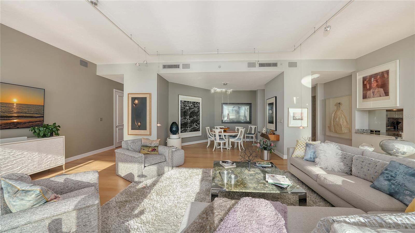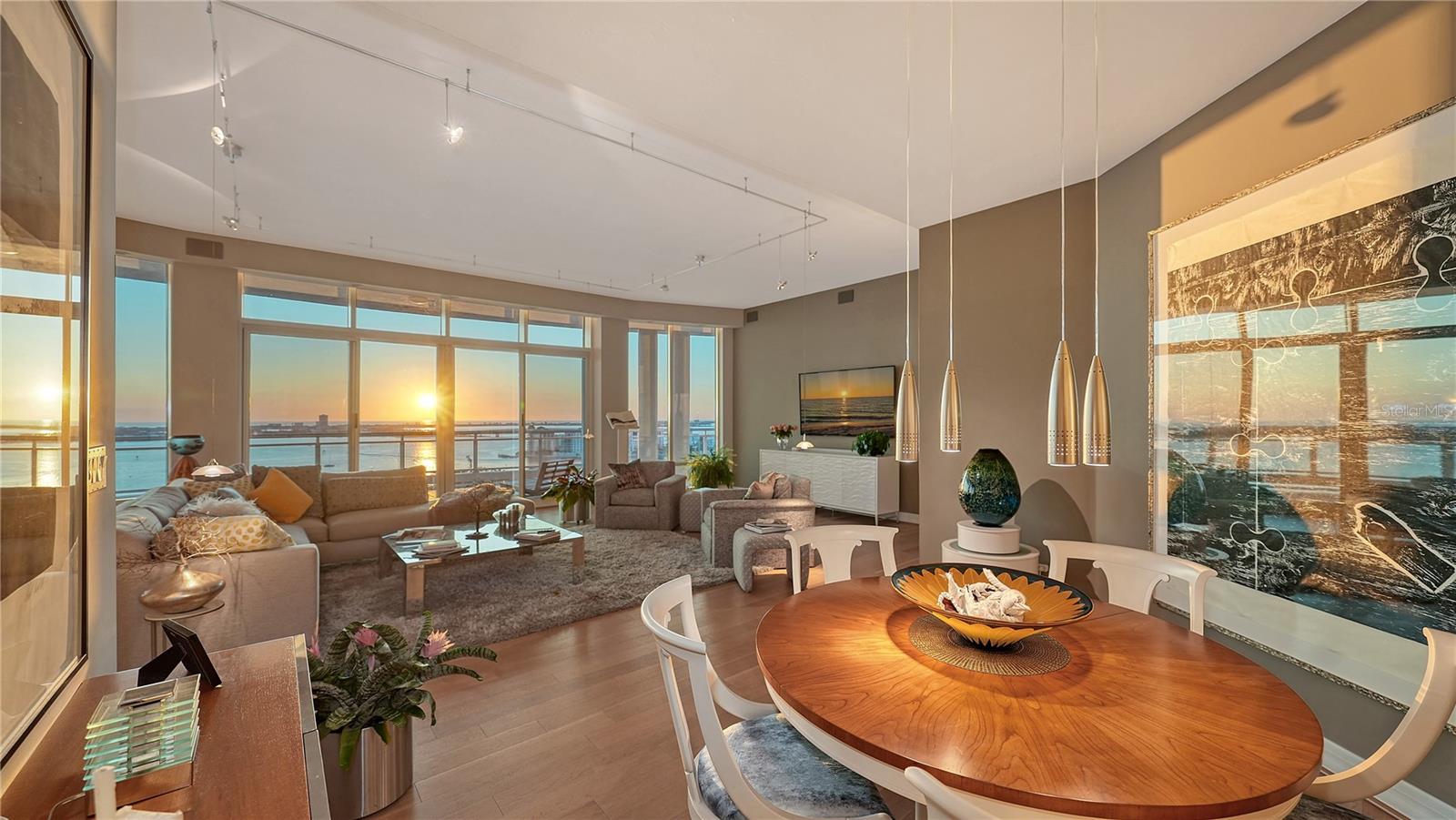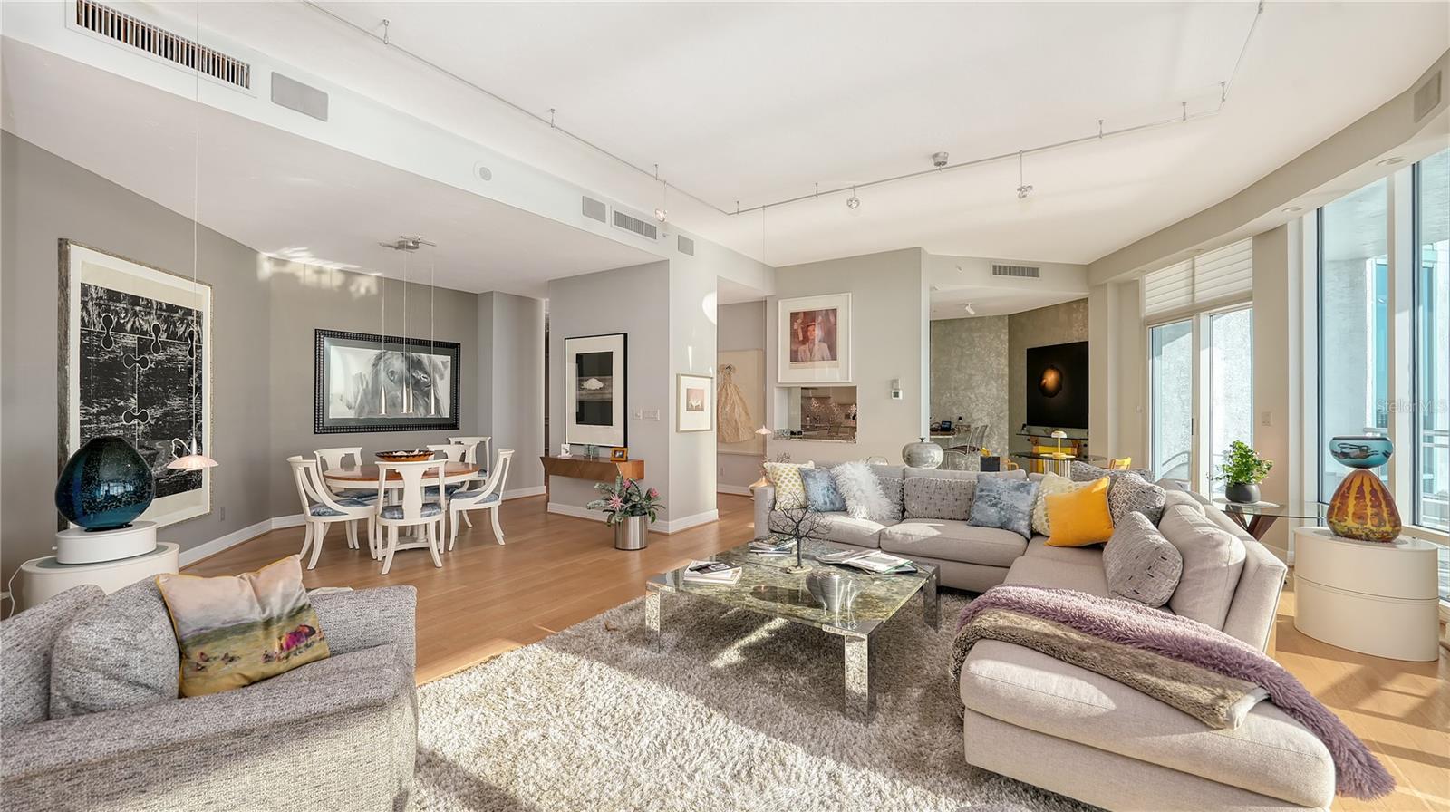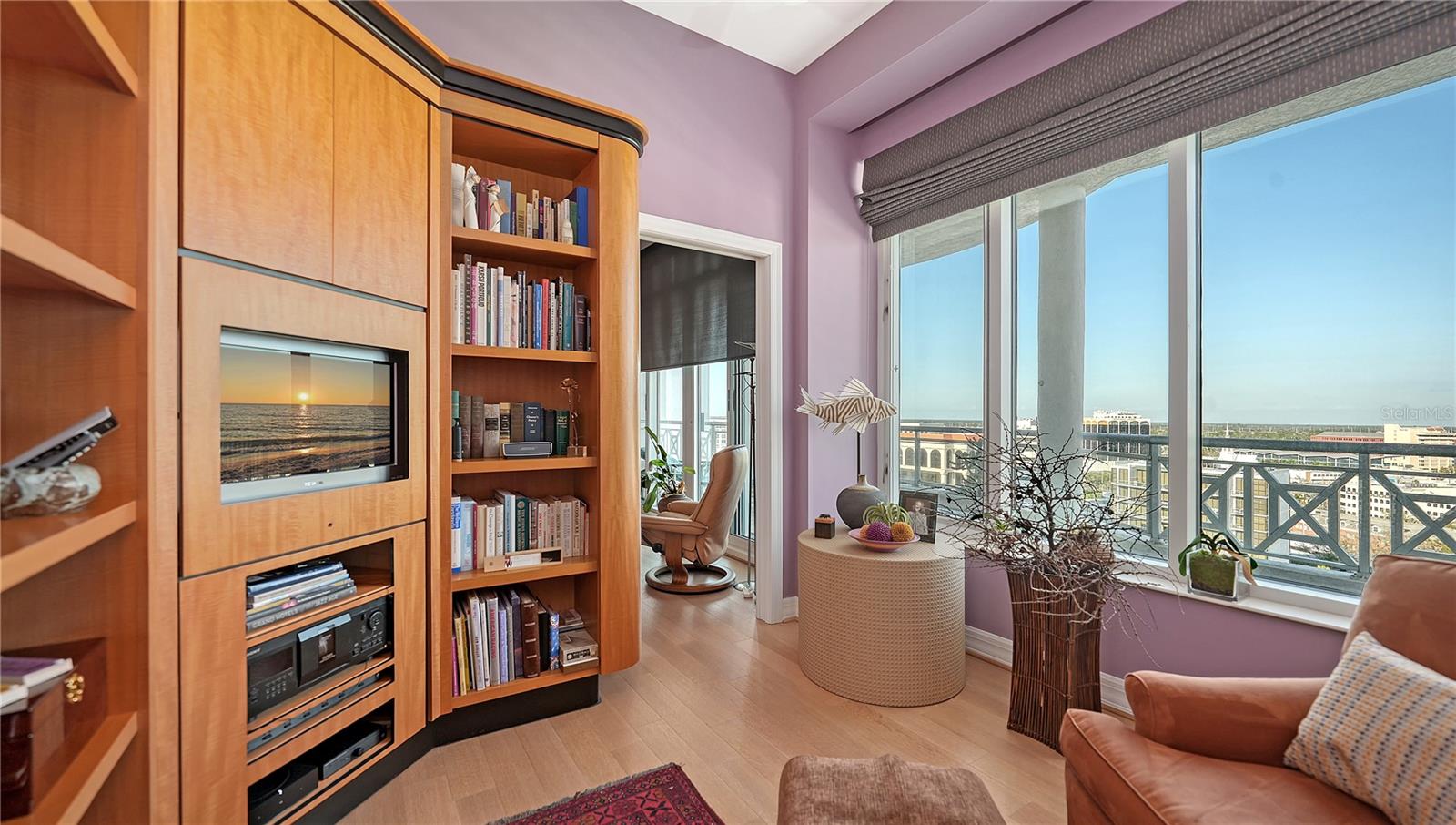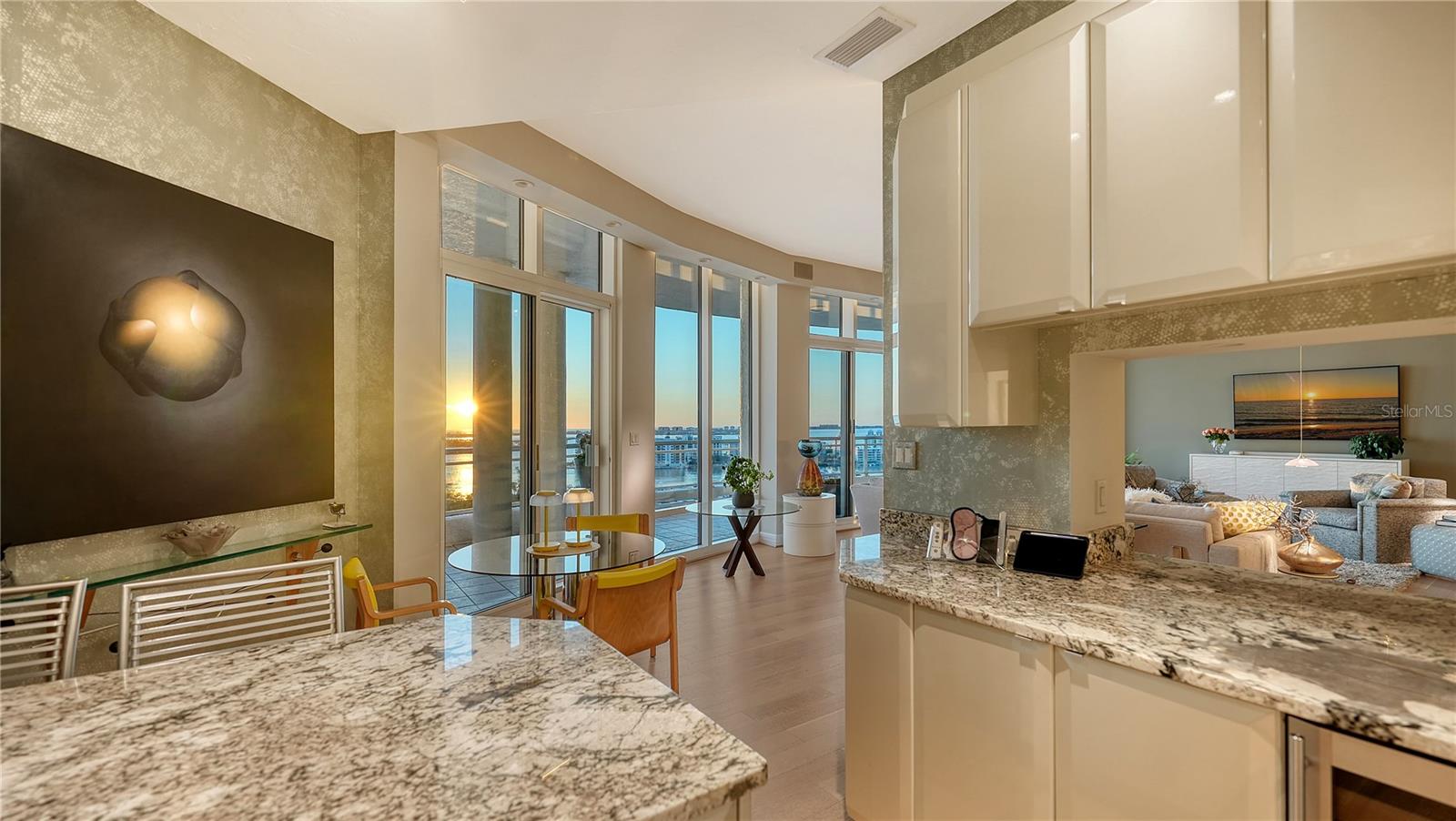 A gallery of luxury and good taste in this 16th-floor Sarabande penthouse. A privately keyed elevator takes you to the 16th floor. Enter and be inspired as you wander through the space that brings you the living room and a breathtaking view of Sarasota Bay, the newly reopened Midnight Pass, and the Gulf of Mexico. This 3,200-square-foot high-ceilinged penthouse was designed to create a sense of comfort and an invitation to congregate with family and friends. Solid-core doors, hardwood floors throughout, custom built-ins, designer lighting, and architectural details enhance the ambiance. And everywhere, there is light and an ever-changing, unobstructed view of the beautiful bay and marina. The chef's kitchen was designed for entertainment and equipped with high-end appliances. The bathrooms are in keeping with the condo's quality and style. The Penthouse is graced with an oversized terrace extending the entire length on the Bay Side, with access from the guest bedroom. There is a second private terrace off the Master Suite with a small adjacent room suited for an office. The Penthouse has three bedrooms (one bedroom is currently used as an office), 2.5 baths. Sarabande residents enjoy the convenience of full-time concierge and security services. They are steps away from cultural events and downtown restaurants.
