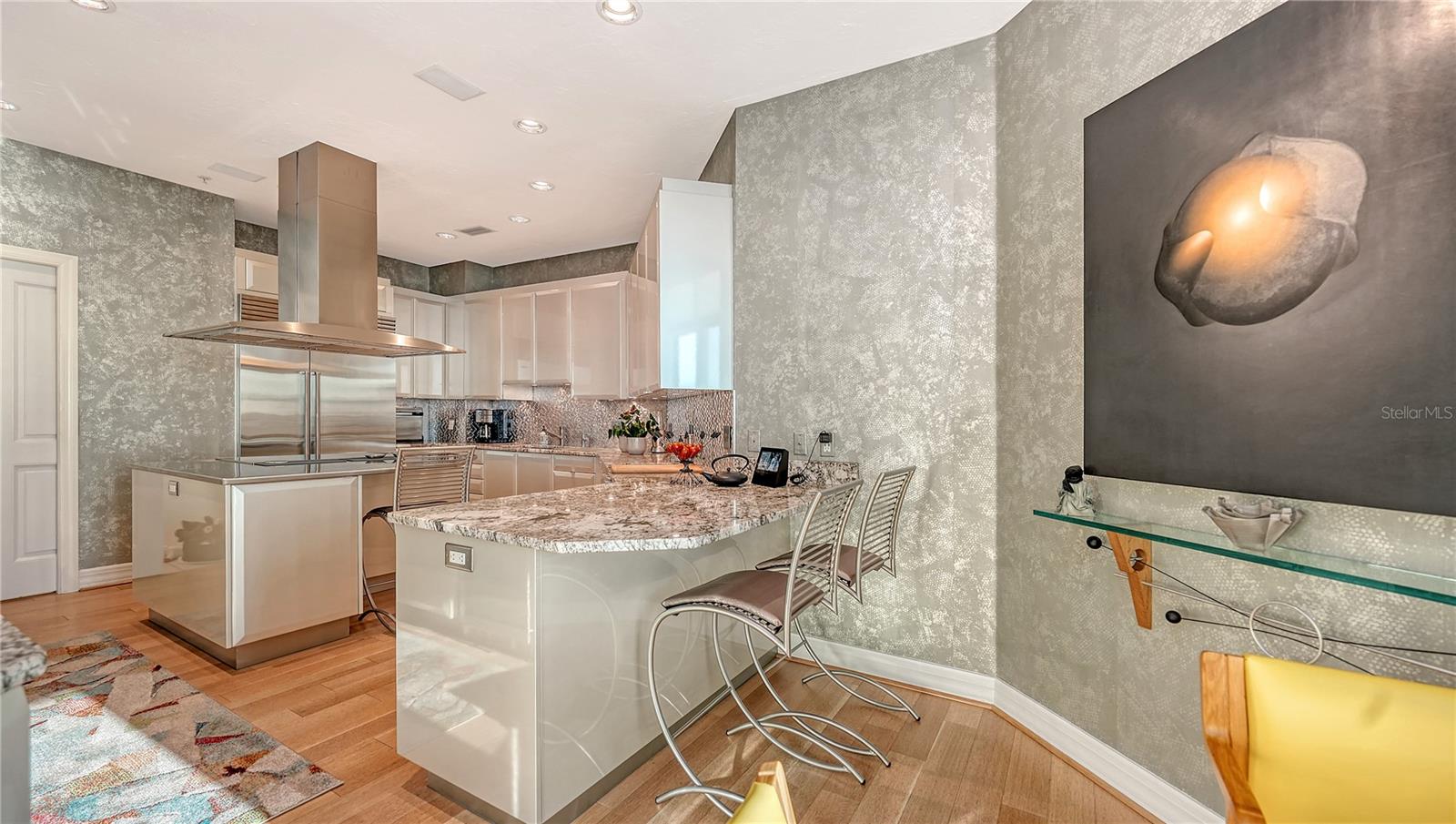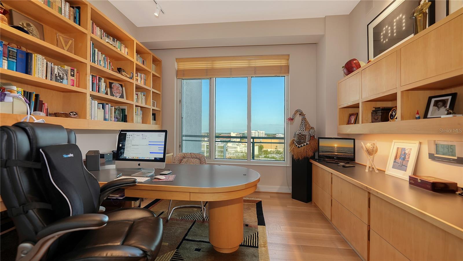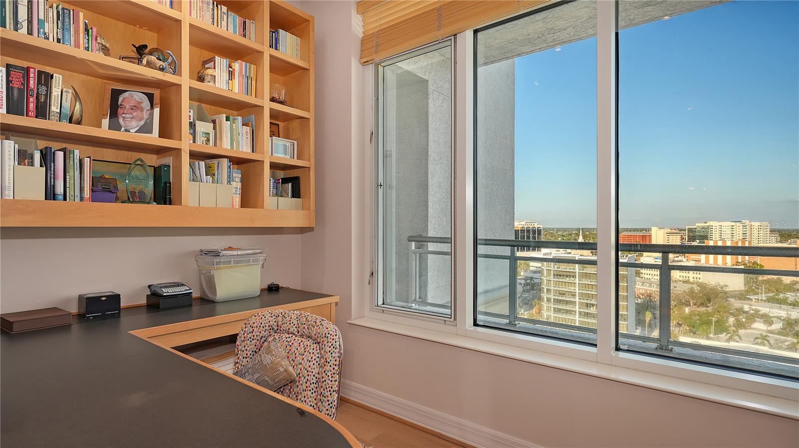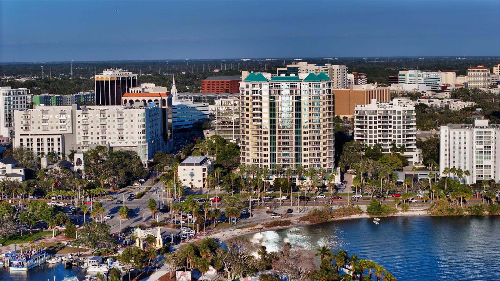A gallery of luxury and good taste in this 16th-floor Sarabande penthouse. A privately keyed elevator takes you to the 16th floor. Enter and be inspired as you wander through the space that brings you the living room and a breathtaking view of Sarasota Bay, the newly reopened Midnight Pass, and the Gulf of Mexico. This 3,200-square-foot high-ceilinged penthouse was designed to create a sense of comfort and an invitation to congregate with family and friends. Solid-core doors, hardwood floors throughout, custom built-ins, designer lighting, and architectural details enhance the ambiance. And everywhere, there is light and an ever-changing, unobstructed view of the beautiful bay and marina. The chef's kitchen was designed for entertainment and equipped with high-end appliances. The bathrooms are in keeping with the condo's quality and style. The Penthouse is graced with an oversized terrace extending the entire length on the Bay Side, with access from the guest bedroom. There is a second private terrace off the Master Suite with a small adjacent room suited for an office. The Penthouse has three bedrooms (one bedroom is currently used as an office), 2.5 baths. Sarabande residents enjoy the convenience of full-time concierge and security services. They are steps away from cultural events and downtown restaurants.