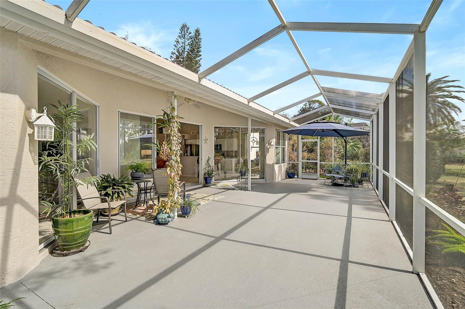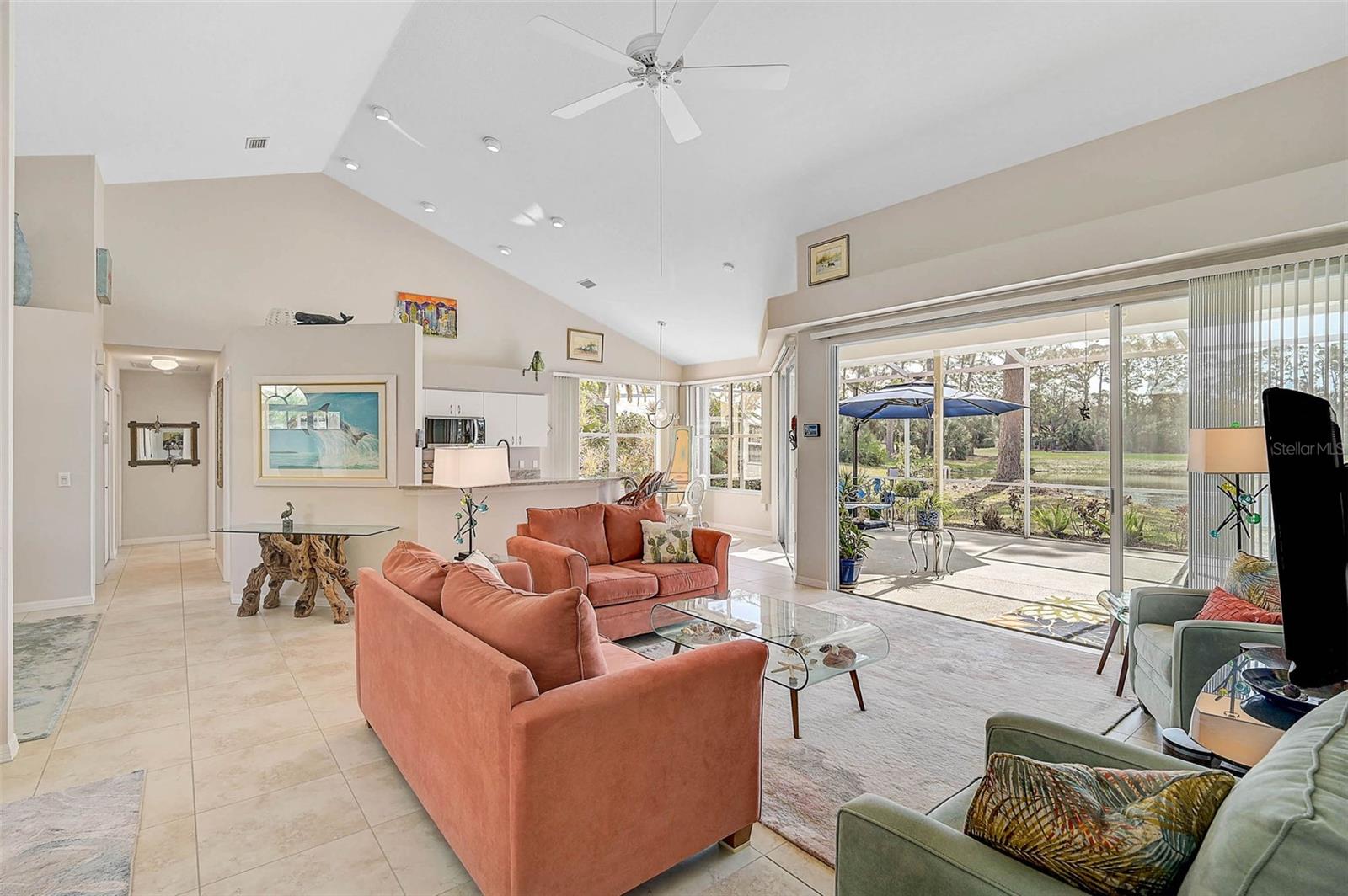 Indulge in unparalleled expansive VIEW of the TRANQUIL LAKE coupled being just steps away from the heated, COMMUNITY POOL. This verdant golf course within the maintenance-free Woodland Trails enclave of Calusa Lakes is just tucked down a quiet, tree-lined street. This nearly 1,900 sq. ft. residence radiates a sense of openness and luminosity, featuring an impeccably designed open-concept layout, three generously proportioned bedrooms and soaring vaulted ceilings. A newly installed ROOF (2022) and electrical panel (2025) provides peace of mind coupled with exquisite QUARTZ countertops in the kitchen complemented by new stainless steel appliance package (2025). The two bathrooms have been thoughtfully upgraded with new quartz surfaces, and the soaking tub provides an ideal space for relaxation.Expansive sliding glass doors and an abundance of windows grace the rear of the property, framing uninterrupted vistas of the serene lake, the 5th hole tee box, and the lush woodlands beyond--a view that will enchant you daily. Majestic oaks and pines provide a natural canopy, offering shade and privacy from all sides, creating an idyllic retreat. The generous lanai, surrounded by meticulous landscaping, ensures complete seclusion from neighbors, while the thoughtfully designed turn-around space in the driveway eliminates the need to reverse onto the street. Elegant, modern furnishings are available for purchase, ensuring an effortless, move-in ready transition. Calusa Lakes is one of the most sought-after communities in Nokomis, ideally situated with convenient access to the Gulf of Mexico, exquisite dining, boutique shopping, cultural venues, and the newly opened Sarasota Memorial Hospital. This exceptional neighborhood is defined by its towering shade trees, picturesque lakes, well-maintained homes, a semi-private golf course and clay tennis courts. Whether you are seeking a full-time residence or a seasonal sanctuary, this distinguished property in Calusa Lakes provides the ideal setting for your Florida haven.