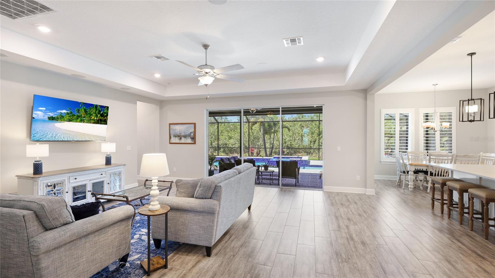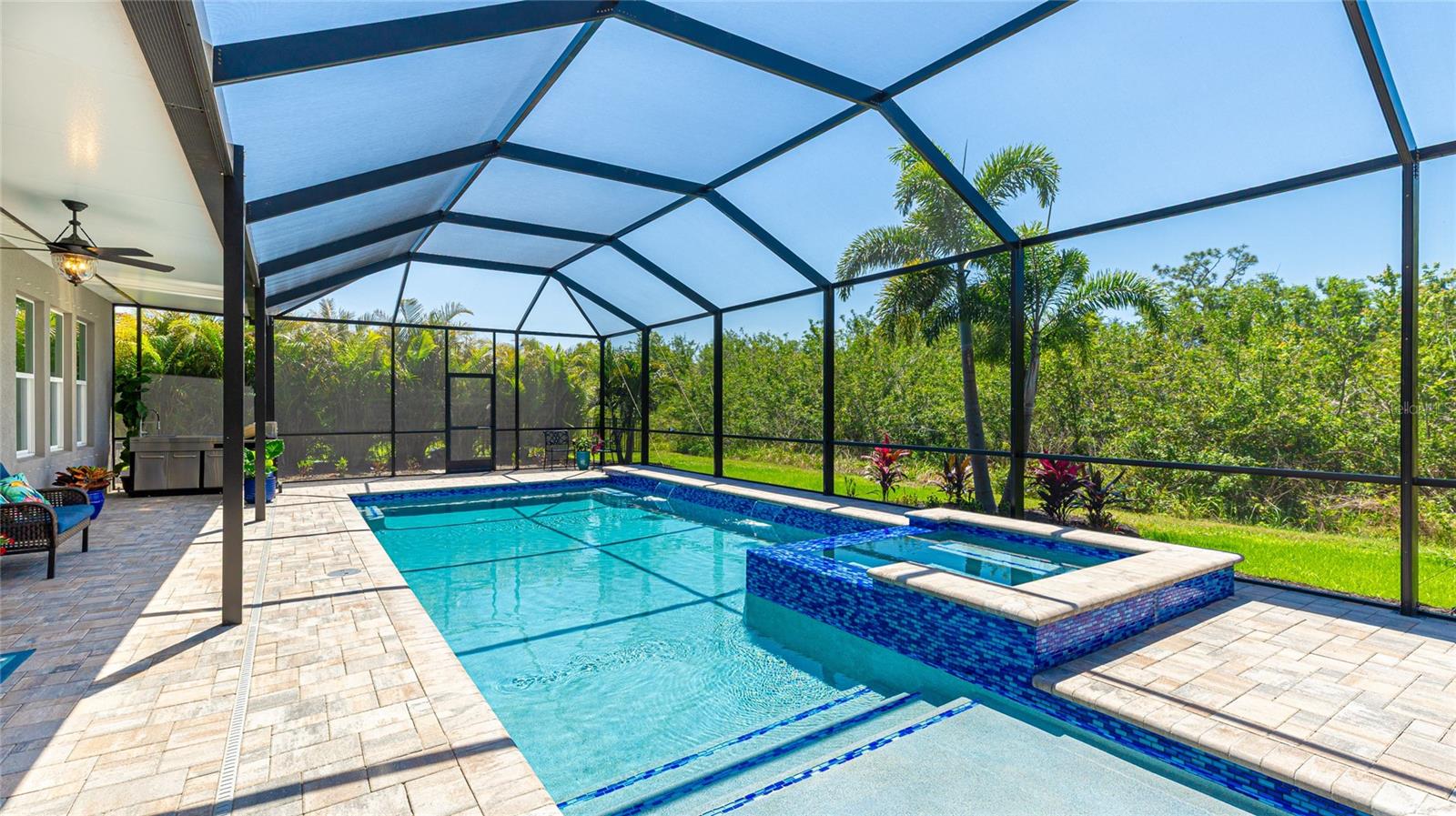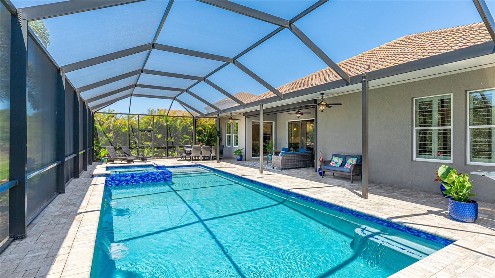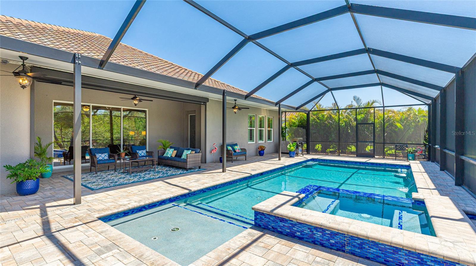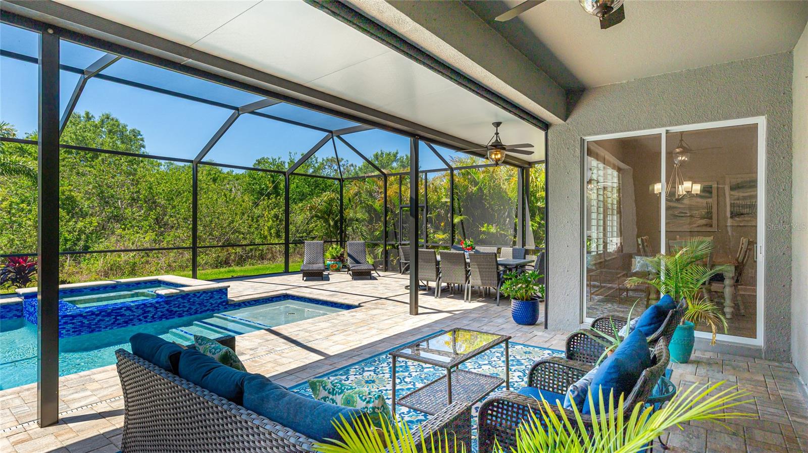 Coastal living at its finest in this meticulously kept Ashwood II model home conveniently located in the #1 award winning master planned community in the US, Lakewood Ranch. This exquisite, well laid out single-story residence offers 4 bedrooms with walk-in closets and 3.5 bathrooms plus a large den with solid double doors, perfectly situated on a spacious quarter-acre private lot. Once inside you'll see the amazing upgrades including tall ceilings with 10 foot tray ceilings, ceramic tile floors, plantation shutters, ceiling fans, and in-ceiling speakers in the great room. Entertain guests in this open floor plan featuring a gourmet kitchen with double oven and quartz countertops that overlooks a spectacular pool view. Wake up to paradise in the spacious owner's retreat with private lush preserve views and quick access to the pool. The owner's bathroom includes dual vanities, expansive shower, freestanding soaking tub, and a large walk-in closet. Step outside to your private oasis and take a dip in the large salt water custom pool and spa with elegant water features and colored lights. Sit back and enjoy both beauty and exceptional privacy or entertain from the expansive patio space while cooking dinner outside. This home features an outdoor pool bath, lots of storage available with multiple linen closets, water softener, included washer and dryer, a separate mud room, Storm Shield in the lanai, a full 3 car garage with epoxy floors and overhead storage, and lush, tropical landscaping with lighting that enhances the tranquil atmosphere. Located in the highly sought after Savanna community, this home offers access to a host of amenities, including a clubhouse, fitness center, resort-style pool, playground, dog park, and basketball court. An amazing location that is just minutes to A-rated schools, golf courses, and lots of upscale shopping and restaurants. Lakewood Ranch offers the convenience of being centrally located to both Anna Maria Island and Siesta Key with each of their award-winning beaches!