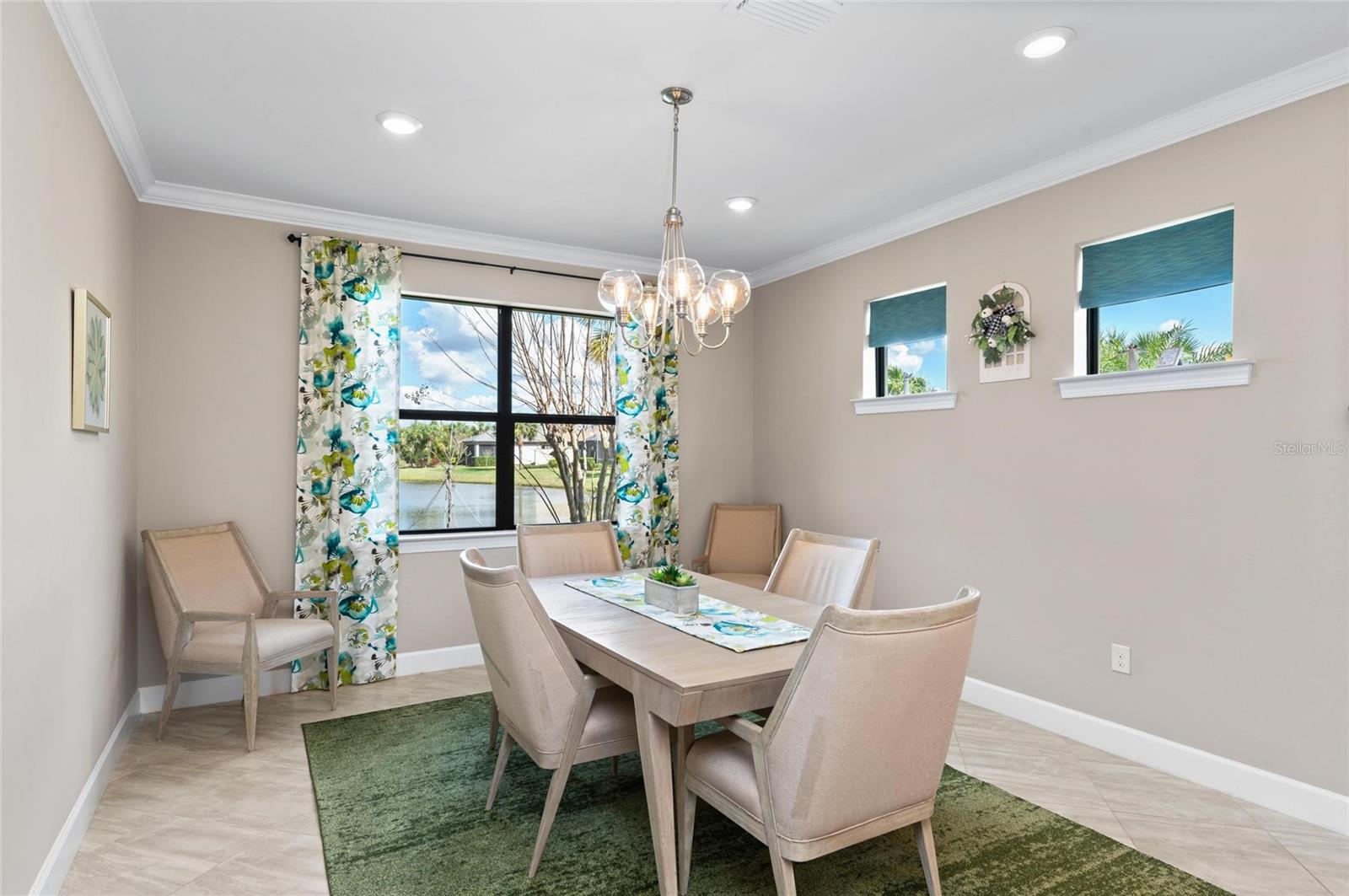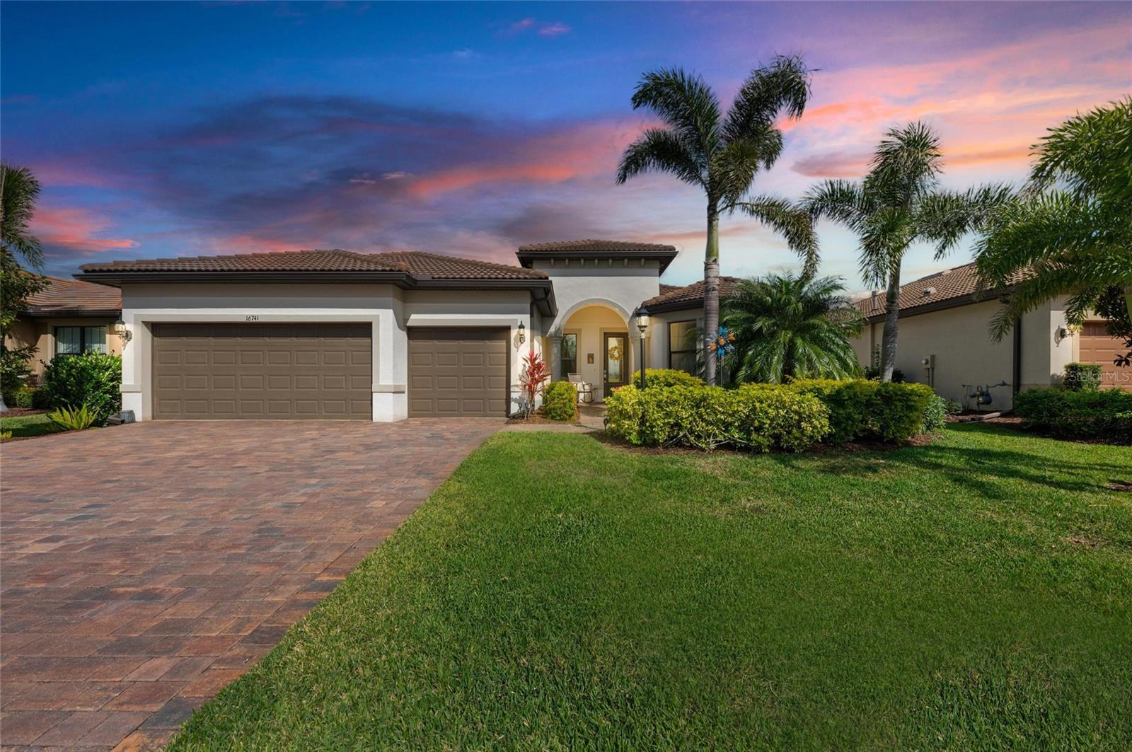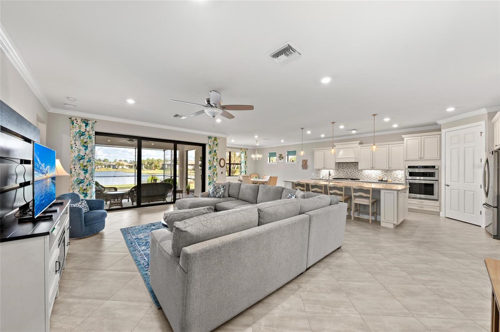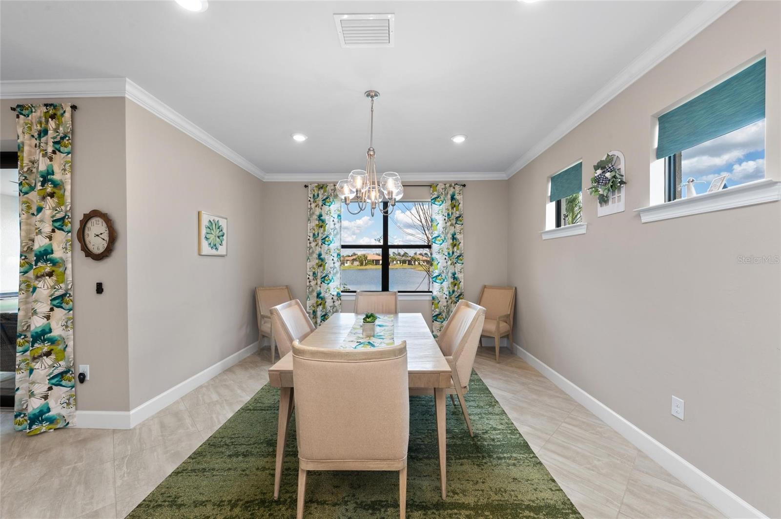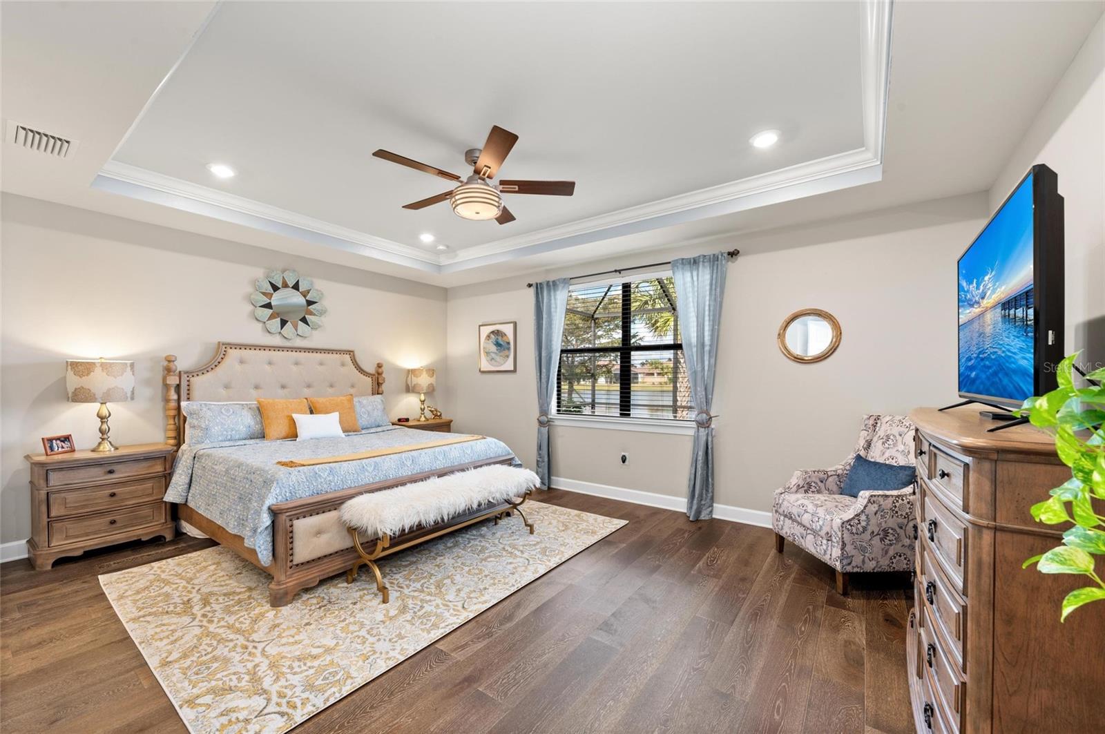 One or more photo(s) has been virtually staged. INTRODUCING THE PERFECT PINNACLE! Prepare to be captivated by this exceptional Estate Series PINNACLE MODEL, offering breathtaking water views and situated in the highly sought-after 55+ Del Webb community of Lakewood Ranch--the nation's #1 multi-generational expert-planned development. This exquisite residence delivers the ultimate in luxurious Florida living, blending timeless elegance with modern upgrades and everyday functionality. With 3 bedrooms, a versatile den, and a spacious open layout, this home is ideal for both entertaining and daily comfort. Designer touches are found throughout, including crown molding, 5 baseboards, tray ceiling in the owner's suite, gorgeous coffered ceiling in the den, designer fans, upgraded lighting fixtures, and hurricane impact glass for peace of mind. At the heart of the home, the gourmet kitchen inspires culinary creativity, featuring a massive island with seating for four, modern pendant lighting, 42" solid wood cabinetry, elegant quartz countertops, stylish backsplash, gas cooktop with upgraded hood, generous storage and prep space, and a custom pantry with built-ins. The home is finished with hard surface flooring throughout that includes a mix of light ceramic tile in the main living areas and rich wood plank flooring in the bedrooms and den, creating a sophisticated yet warm ambiance. For seamless entertaining, open the zero- corner sliding doors to the extended, covered lanai where you will find ample space for dining, lounging, and tranquil water views--the perfect backdrop for Florida evenings. The expansive owner's suite offers room for a cozy sitting area and a spa-inspired ensuite with dual vanities, large walk-in shower with a grab bar for safety, and an oversized custom walk-in closet with built-ins and abundant storage. Two additional guest bedrooms, including one with its own ensuite, custom closet, a versatile den with a coffered ceiling--ideal as a home office, gym, craft room, or library. Additional highlights include a 3-car garage built-in storage cabinets, upgraded laundry room with solid wood cabinetry, utility sink, extended screened lanai for ultimate outdoor living. Act quickly. Don't miss the chance to call this Pinnacle Model showpiece your own and experience luxury living at its finest. Schedule your private tour today!