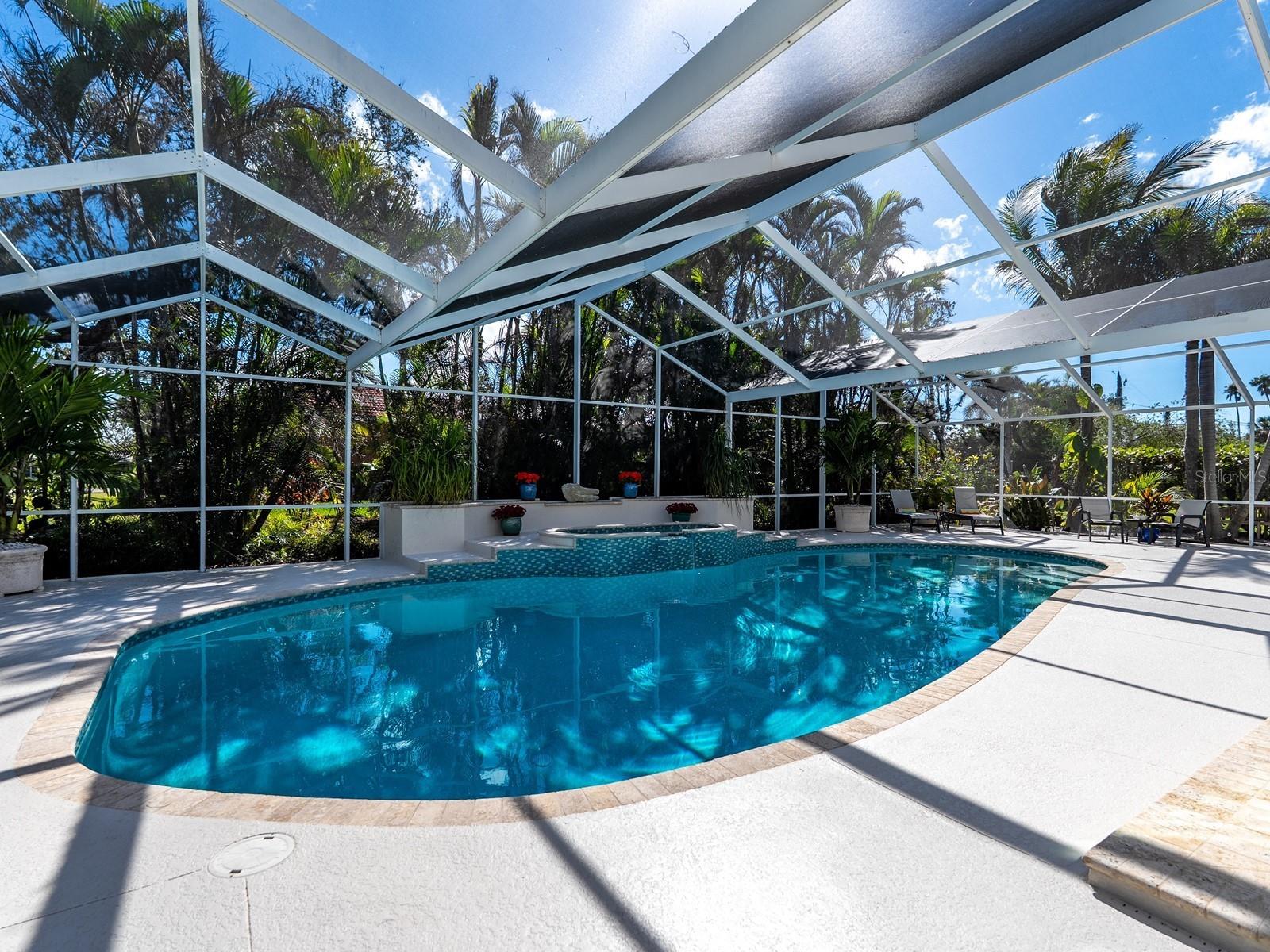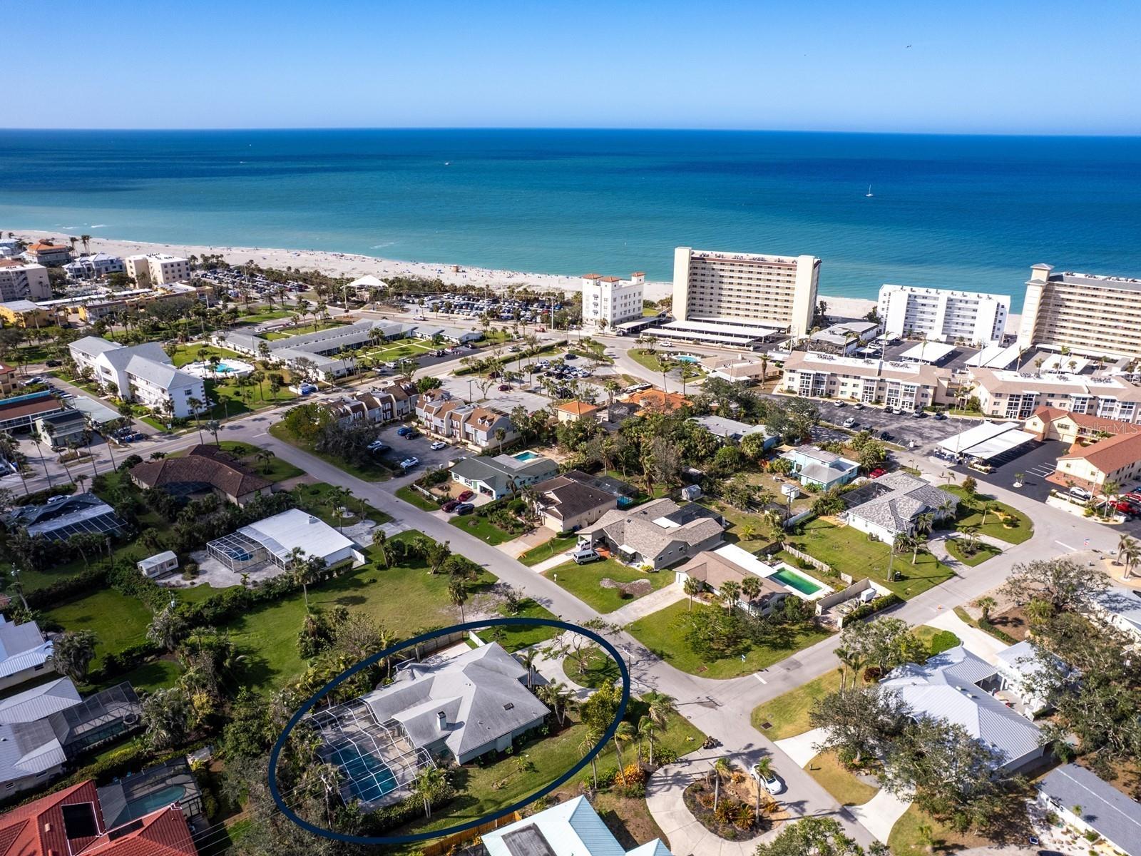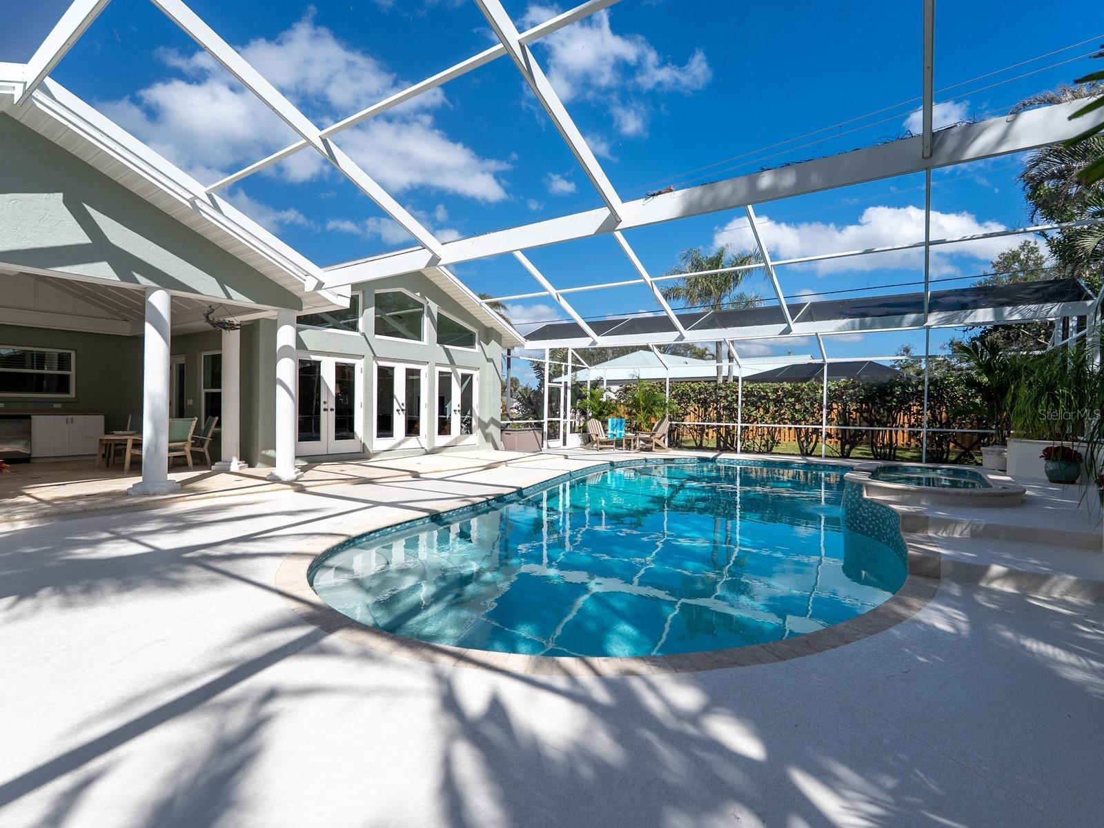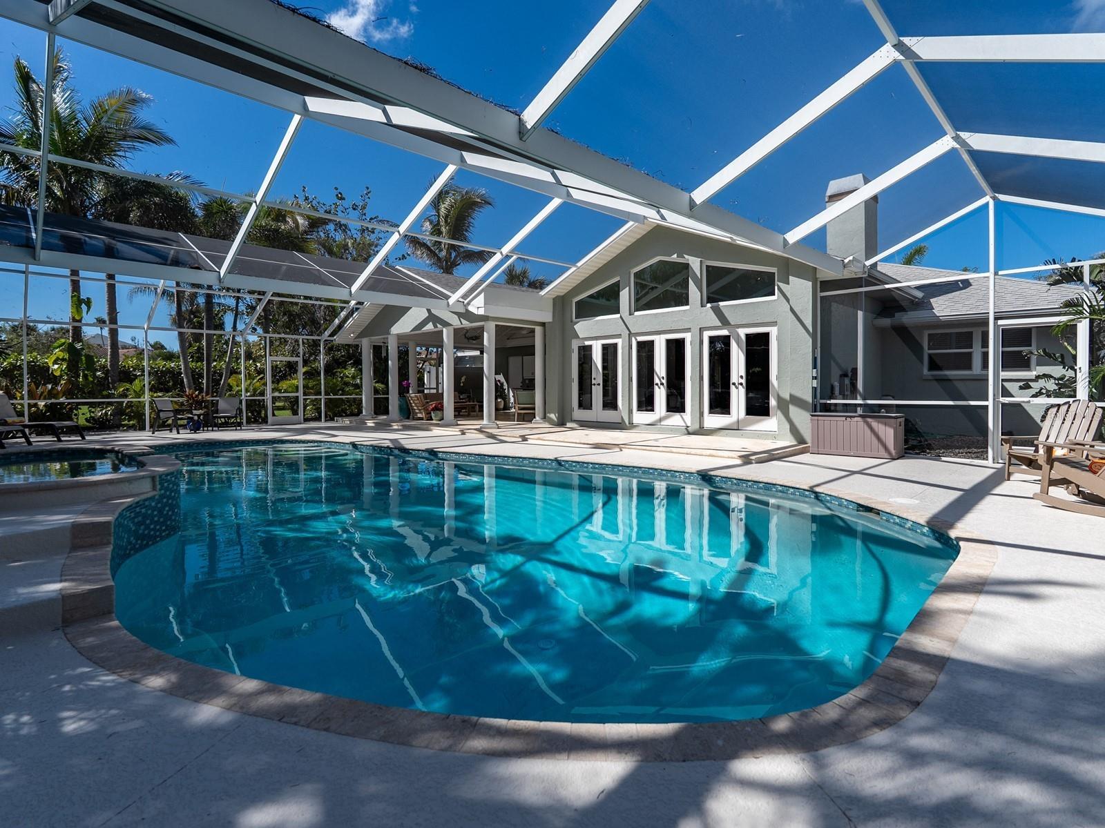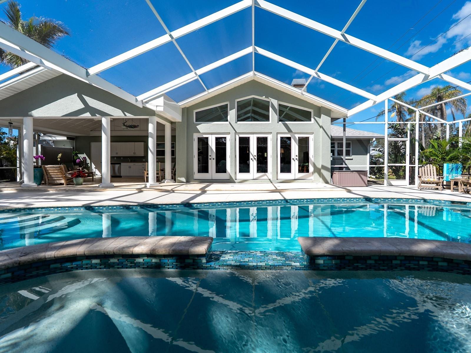 This stunning and spacious four-bedroom home has a den and features a captivating backyard oasis, ideal for relaxation and entertaining. It's just a short stroll away from the beach! Let the ocean breeze guide you to the shore, and you'll feel the warm sand beneath your toes in no time. After taking a moment to appreciate the curb appeal, you enter through the glass door into the foyer, which sets the tone for this remarkable home. The main living areas boast elegant, long-lasting, easy-care French Limestone flooring. While most of the bedrooms provide a warm, cozy ambiance with rich hardwood flooring. Numerous French doors throughout highlight the open and bright ambiance. A modern kitchen that impresses with its striking floor-to-ceiling cabinetry, exuding style. The lengthy Corian countertops create a culinary prep space that would make any chef envious. Additionally, there is a buffet area featuring built-in shelving and a planning center. The newer Bosch and GE stainless steel appliances remain. Nearby a remarkably large walk-in pantry awaits--a dream come true with its ingenious storage solutions. A trendy basin sink is beautifully oriented toward the breakfast bar, seamlessly connecting to the great room and enhancing the flow of the layout. In the dining and living areas, you are enveloped by spaciousness created by the soaring vaulted ceilings, a dramatic French Limestone fireplace, and clerestory windows. Three sets of French doors crowned by three clerestory windows overlook the impressive outdoor entertainment area. Experience a dream sanctuary, complete with an expansive vaulted cage pool that beckons you to unwind in the luxurious spa with a soothing spillover feature. Imagine entertaining in the nearly 600 square foot covered area, where laughter and joy flow as freely as the drinks from your nicely equipped summer kitchen. This is the ultimate haven for leisure and celebration, a paradise you won't want to leave! When it's time to recharge, the Primary Suite offers the privacy you desire. A sliding barn-style door opens to the renovated en suite bath with double walk-in closets, luxurious granite, elegant dual sinks, a French Limestone shower surround, and a private water closet. Adjacent is a den/study with stylish built-in cabinetry that enhances functionality and aesthetics. There is a guest wing with a bathroom and a bedroom featuring a Murphy bed, allowing flexible use. Two full bedrooms are located near a dual-function bathroom with a full and half bath with direct pool access. It is poised perfectly in a desirable area without association restrictions, with a side-yard patio, outbuilding storage, a 2-car garage, and a circular drive.